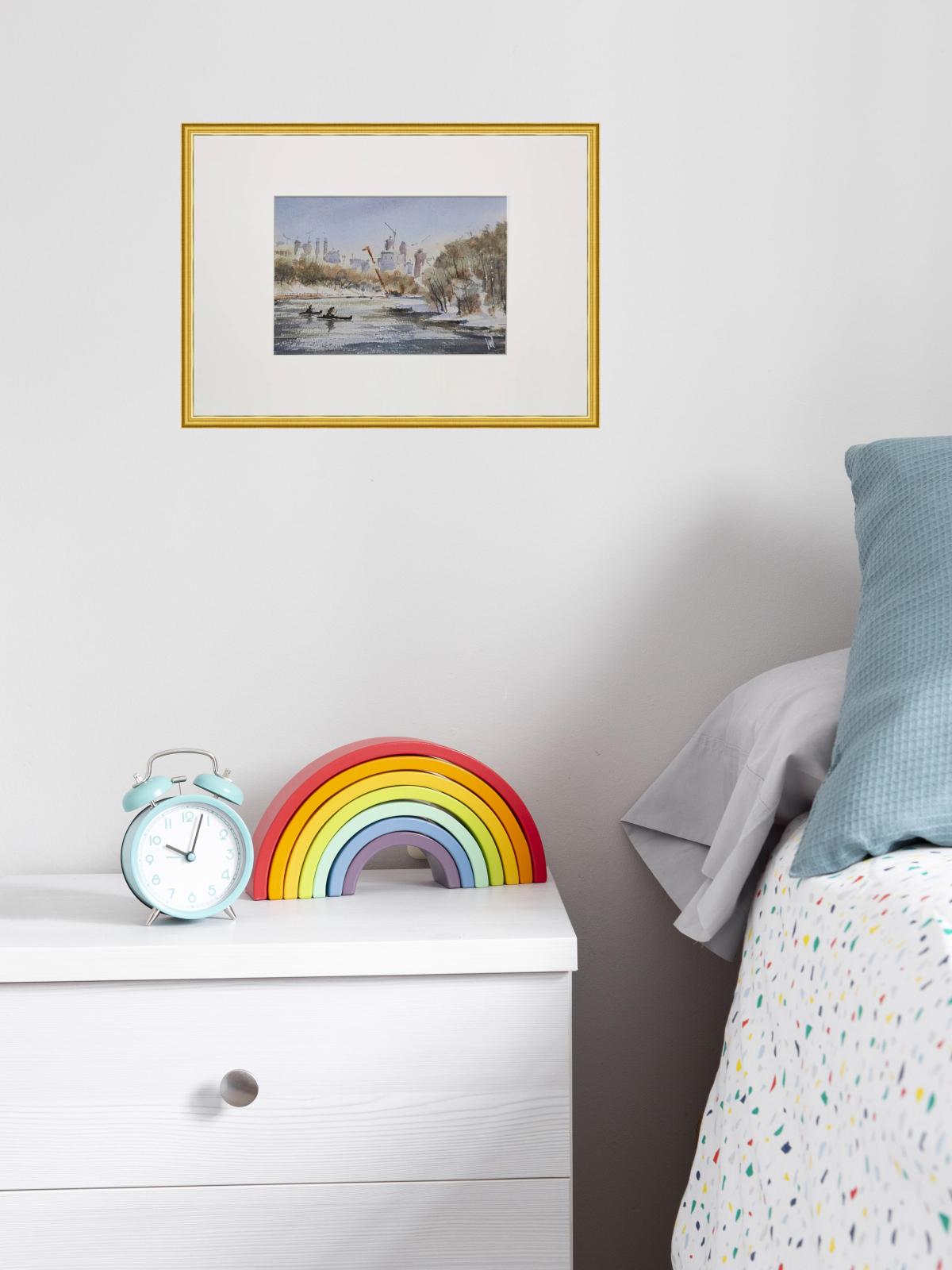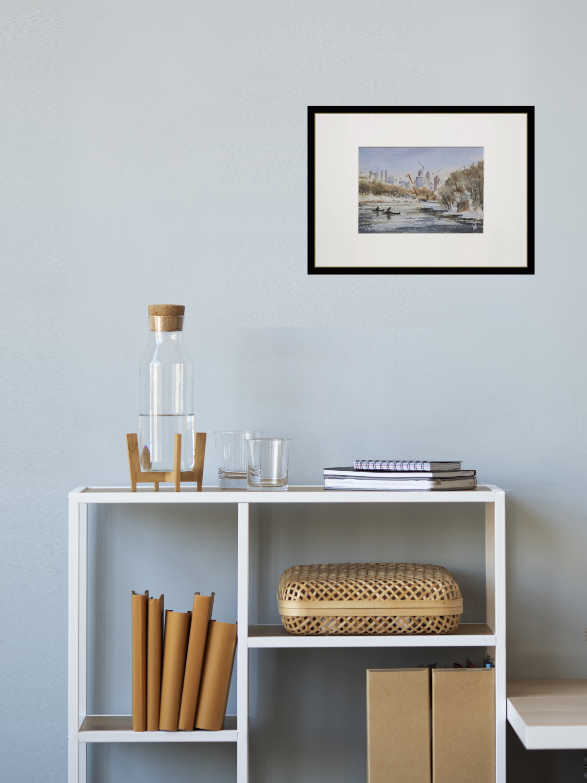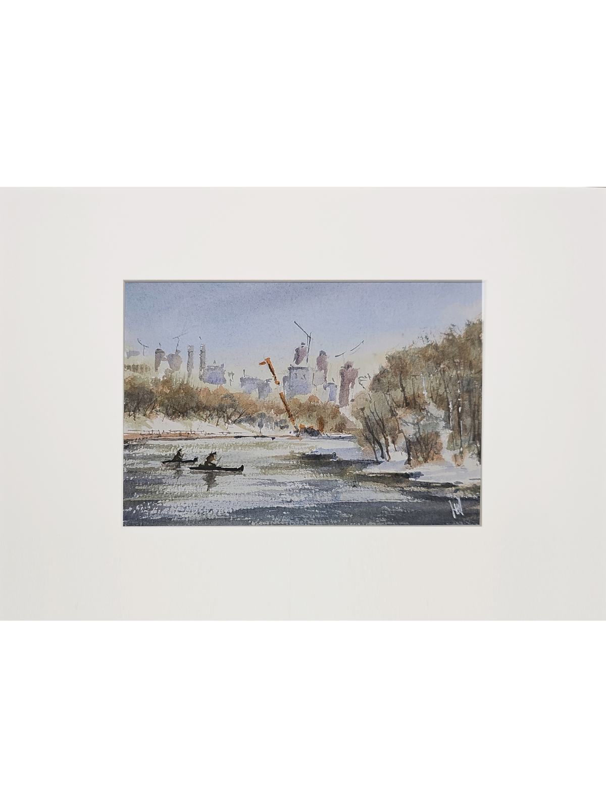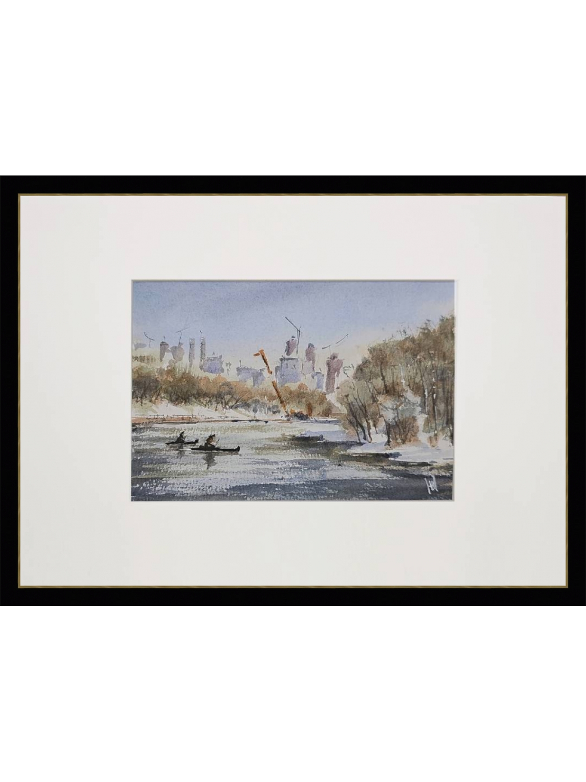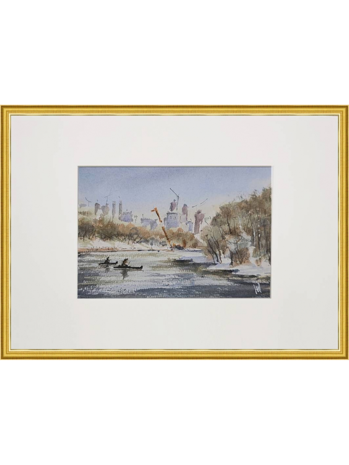 Нам представлена акварельная картина, изображающая городской пейзаж. На переднем плане видны два человека, плывущих на лодках по реке. Вдали, на заднем плане, виднеется городской силуэт с высокими зданиями и строительными кранами. По берегам растут деревья, окрашенные в еще зимние тона. Картина выполнена в мягких, приглушенных цветах и передает спокойную атмосферу. Работа оформлена в светлое паспарту и готова к размещению в раме 21*30 см.