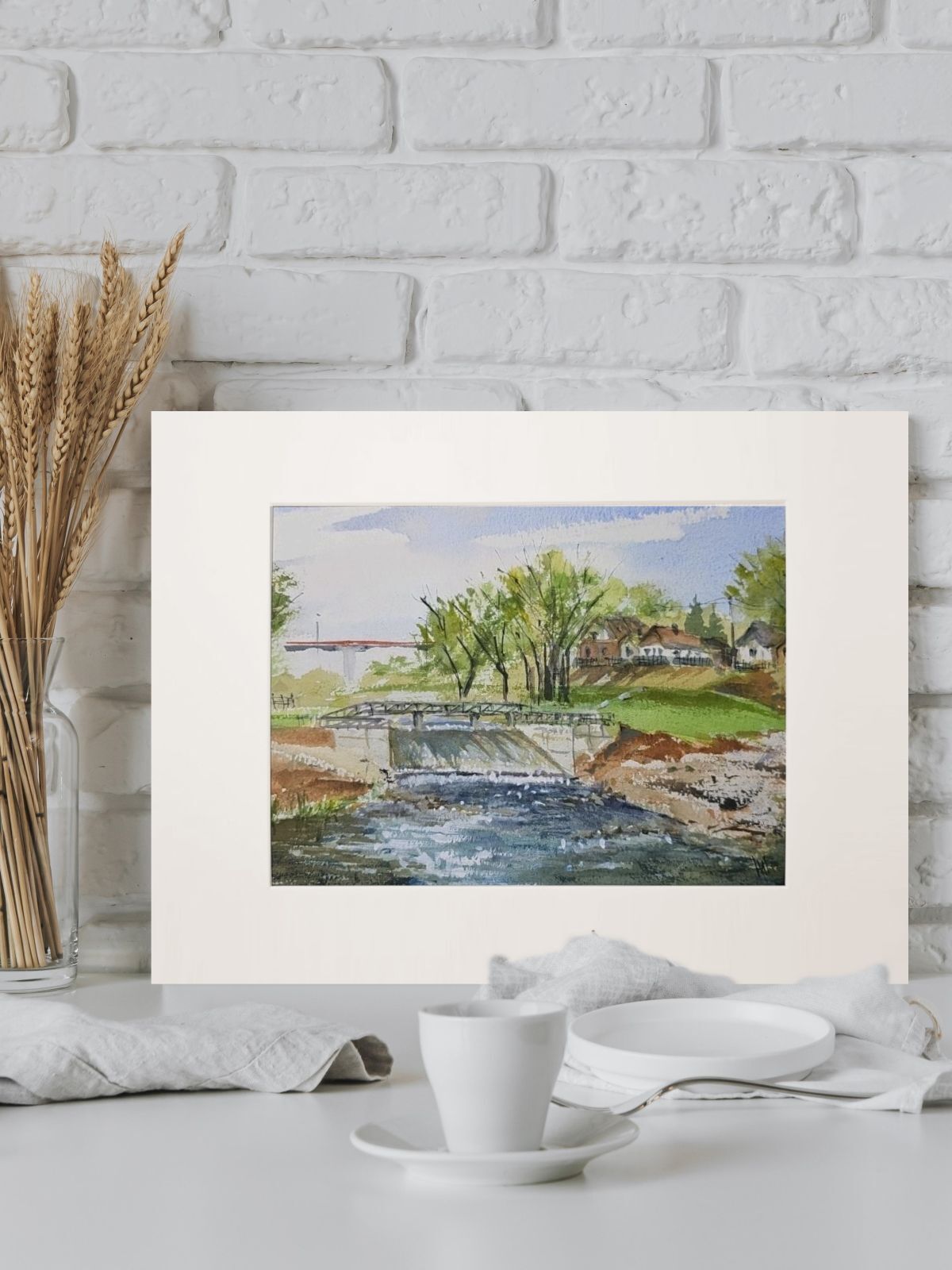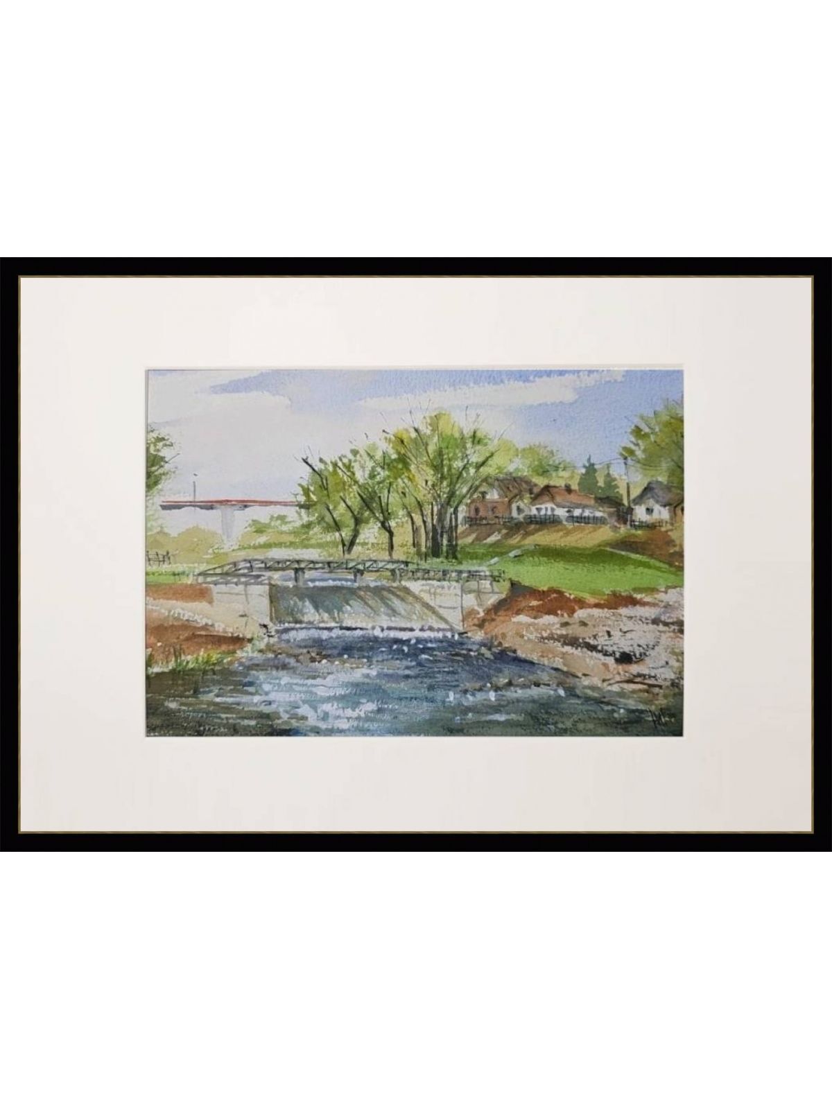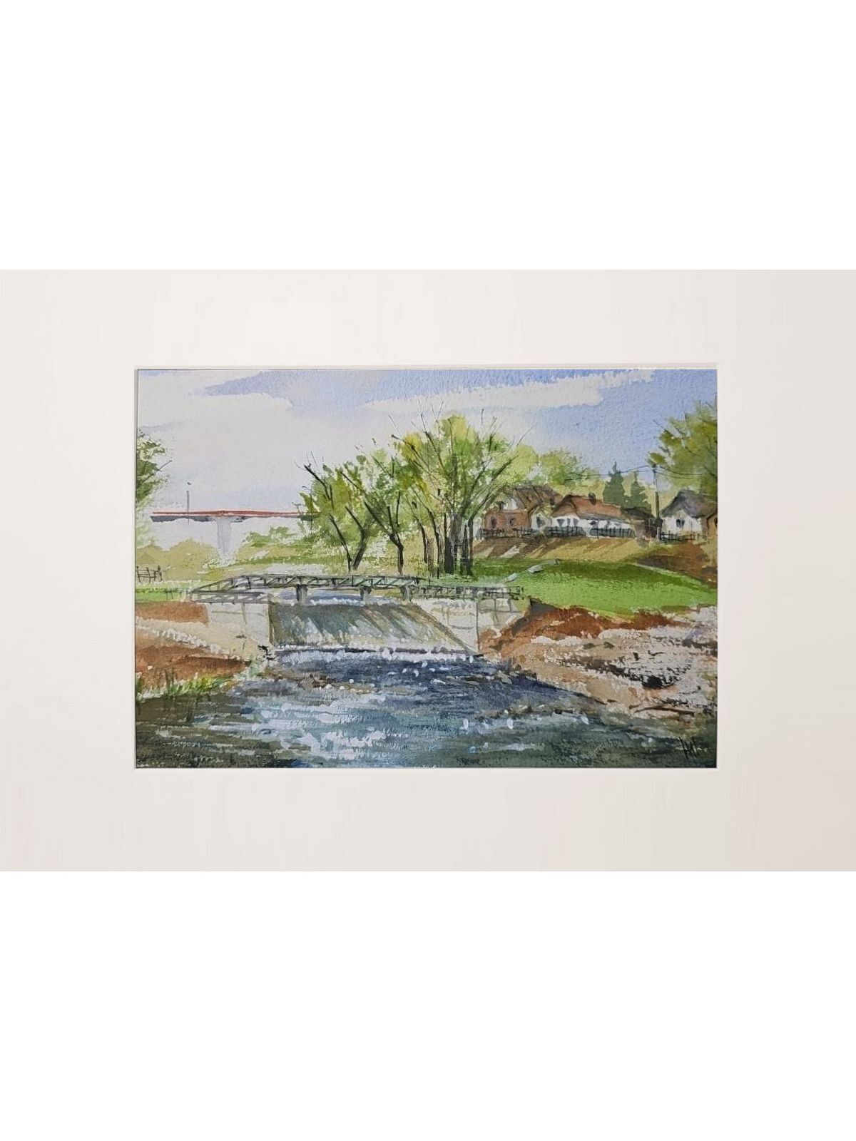 Нам представлена акварельная картина с пейзажем. В центре находится водопад с мостиком через него. Вода весело спадает по небольшому уклону образуя внизу бурлящую полоску. На заднем плане слева деревья и дома, расположенные на фоне голубого неба. Растительность на берегах и деревья вверху картины создают атмосферу спокойствия и умиротворения и ранней весны. Картина выполнена в светлых и нежных тонах, передающих естественную красоту природы.