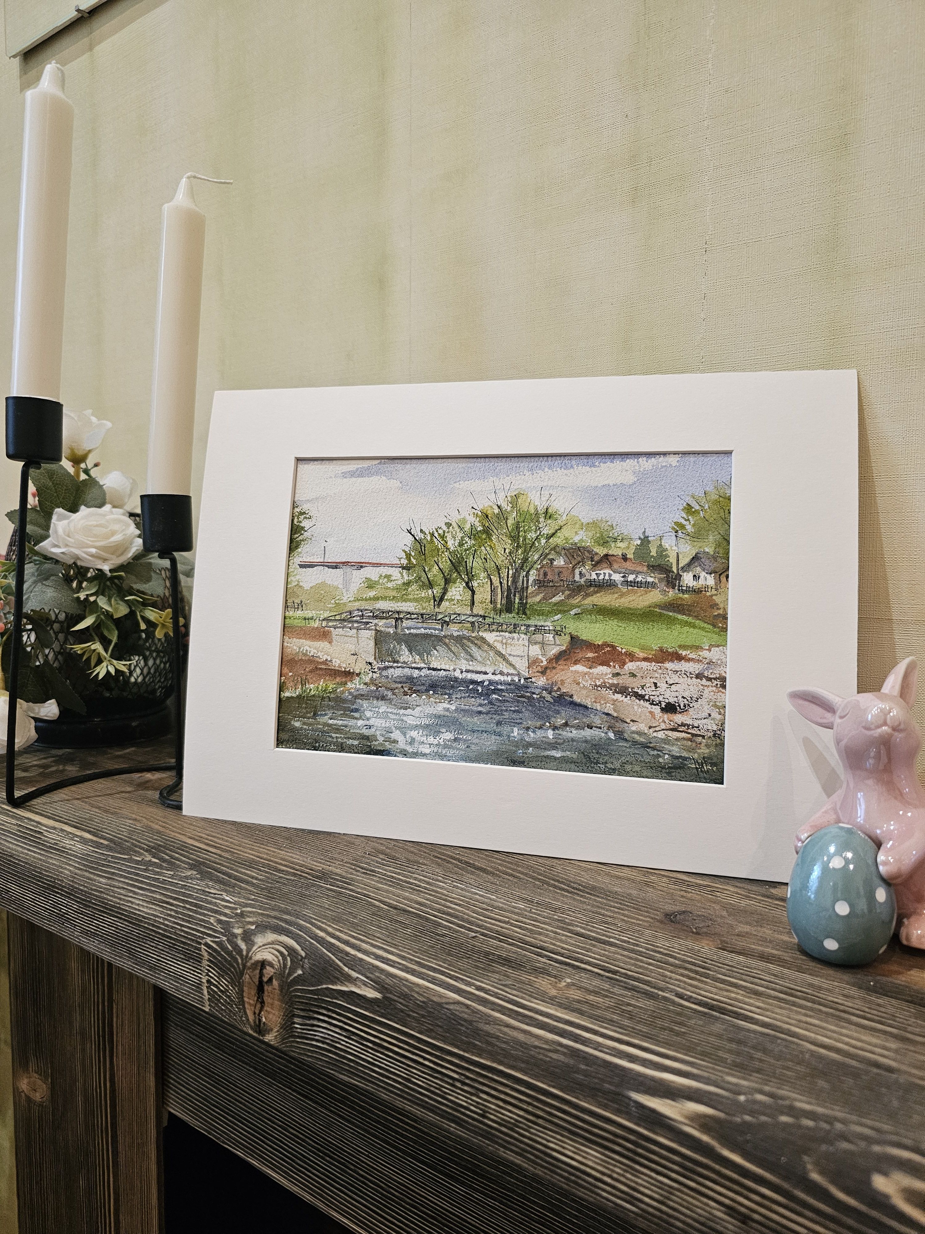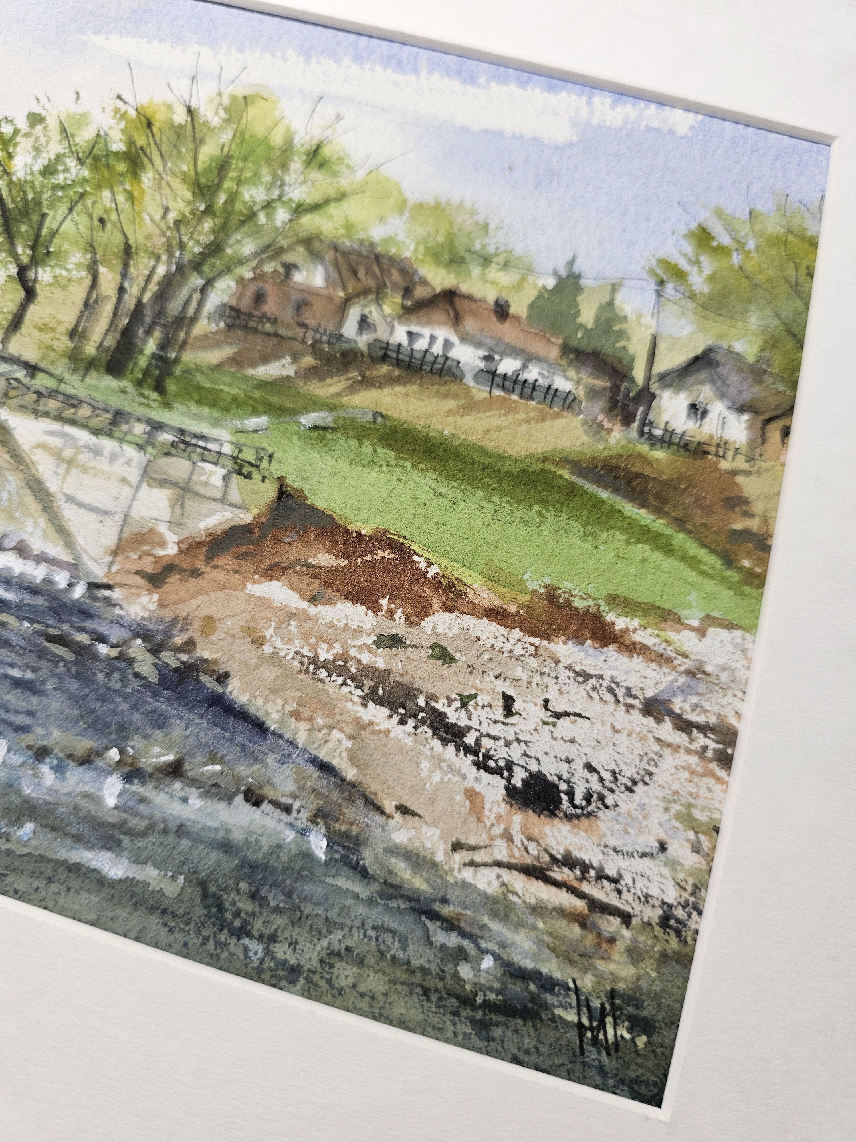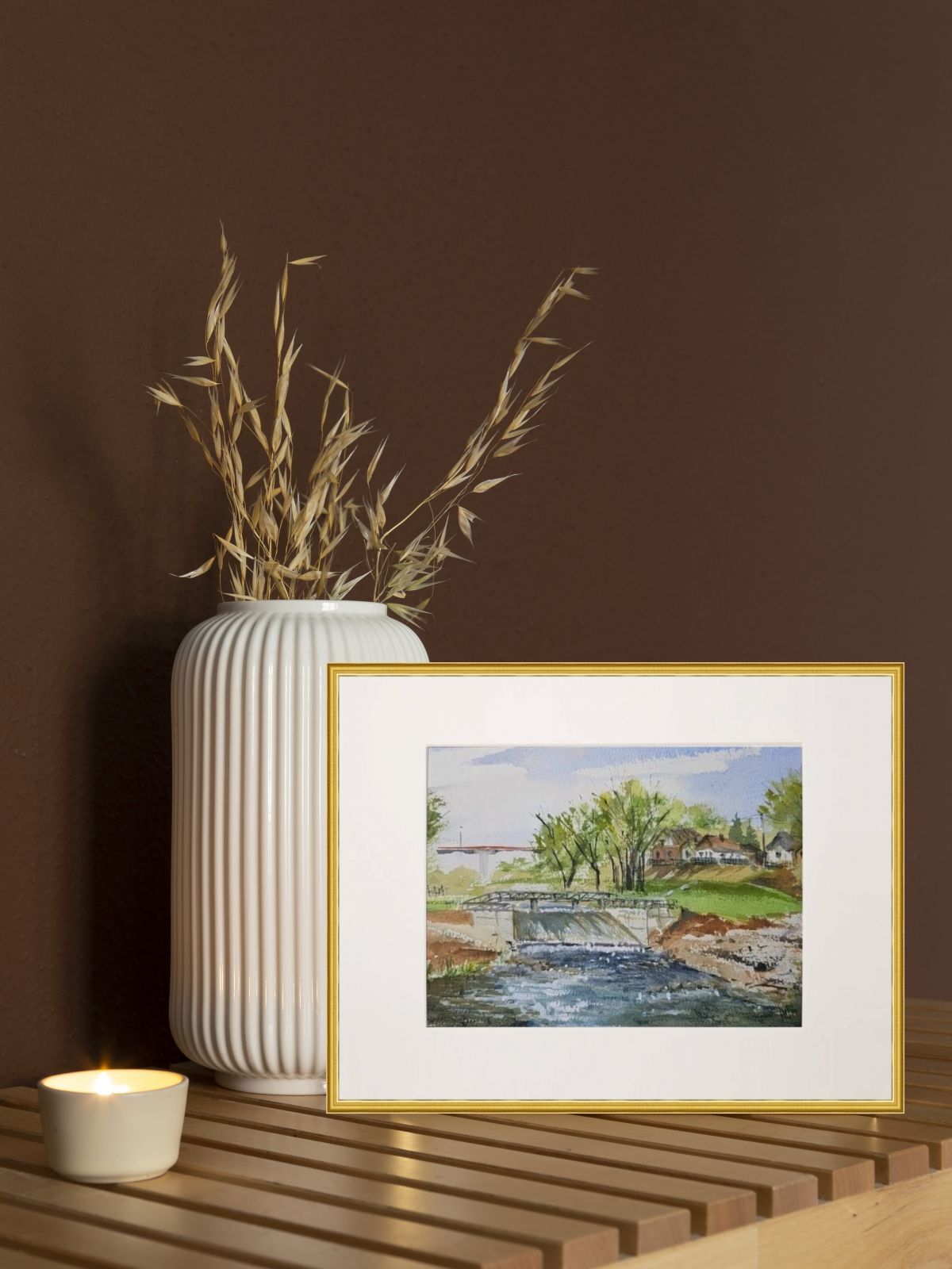 Нам представлена акварельная картина с пейзажем. В центре находится водопад с мостиком через него. Вода весело спадает по небольшому уклону образуя внизу бурлящую полоску. На заднем плане слева деревья и дома, расположенные на фоне голубого неба. Растительность на берегах и деревья вверху картины создают атмосферу спокойствия и умиротворения и ранней весны. Картина выполнена в светлых и нежных тонах, передающих естественную красоту природы.