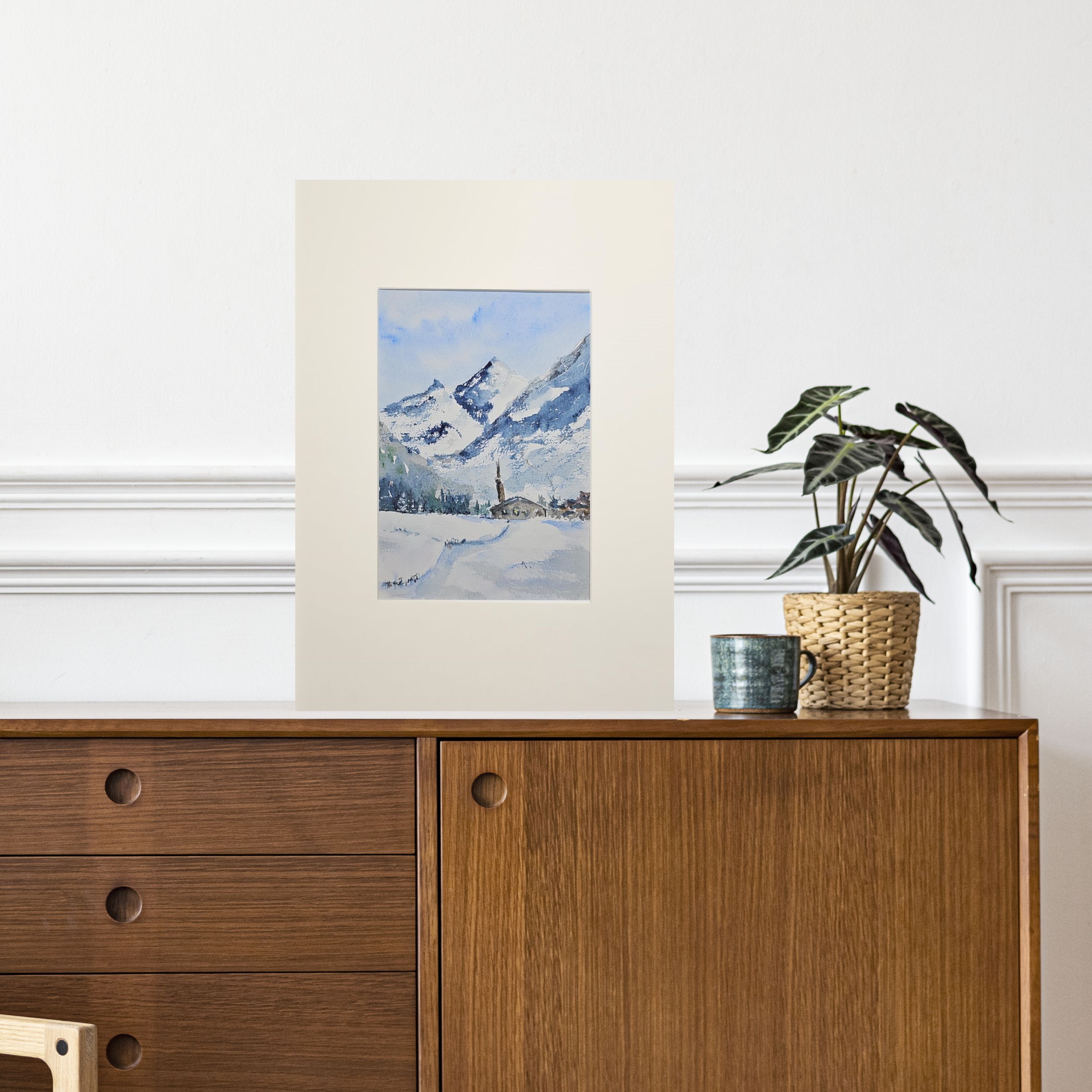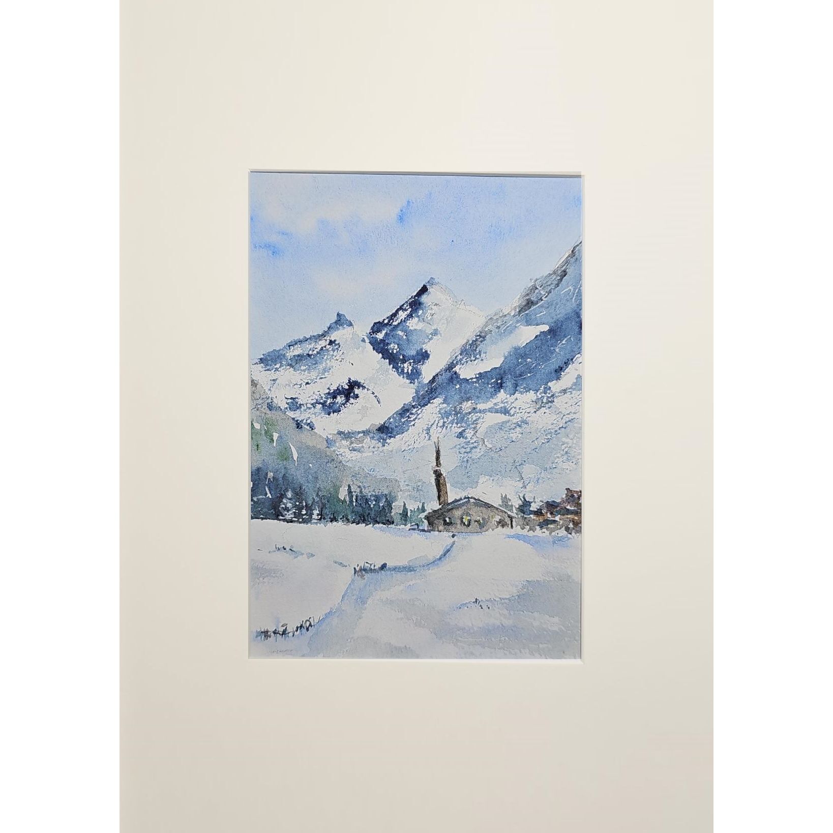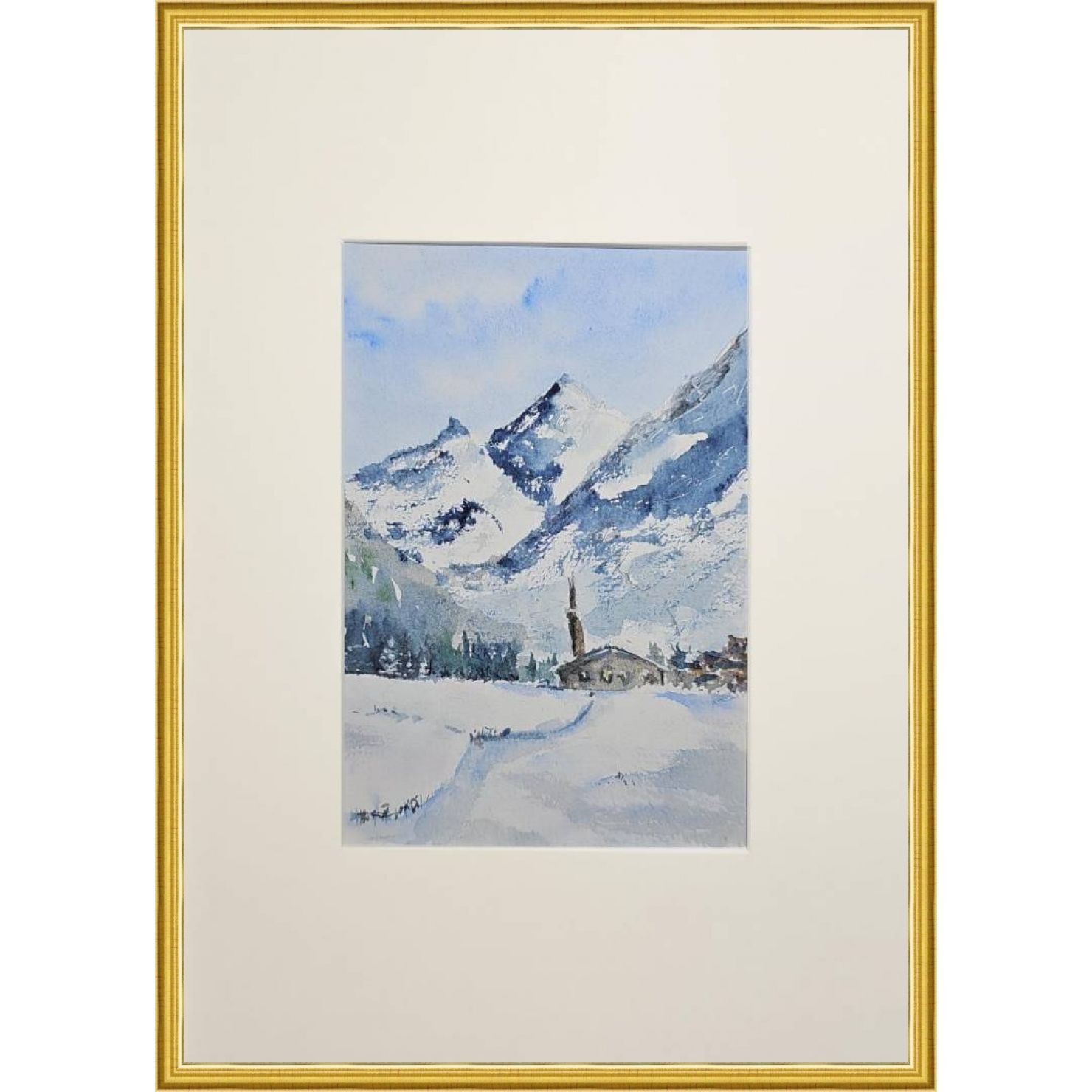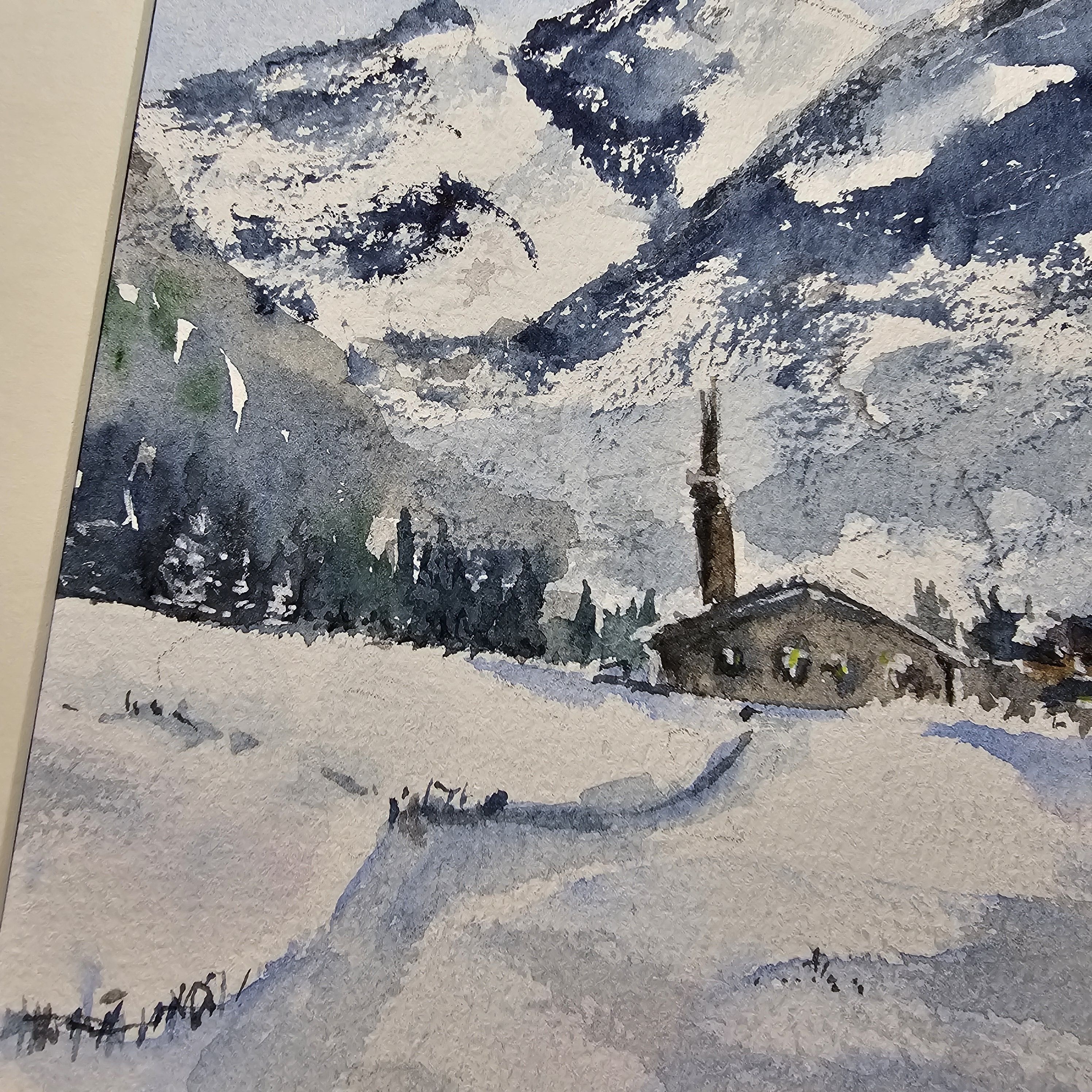 Нам представлена акварельная, зимняя горная сцена. В центре расположены величественные заснеженные горы с ясным голубым небом. У подножия раскинулась деревенька с небольшими домами и церковью с высокой колокольней. Перед деревней простирается заснеженное поле, на котором видна протоптанная тропинка. Художественная работа выполнена в холодной цветовой гамме, преобладают оттенки белого и синего.. Картина оформлена в светлое паспарту, что подчеркивает яркость пейзажа и готова к размещению в раме 21*30 см.