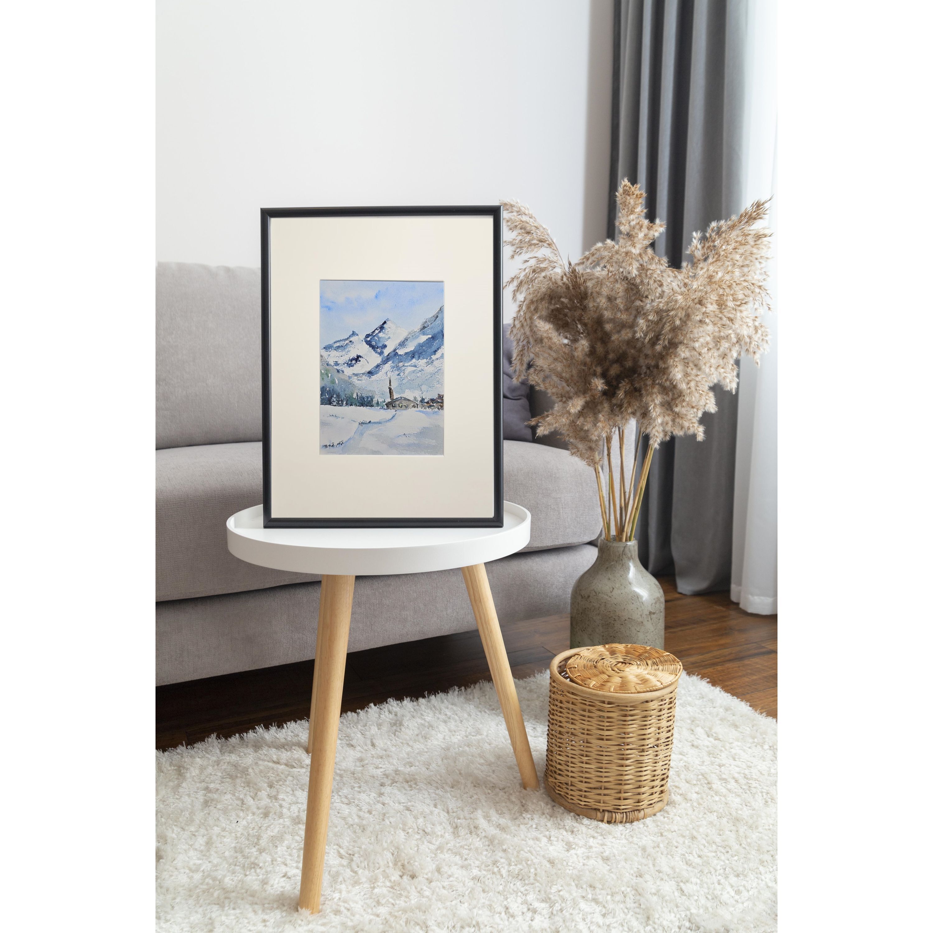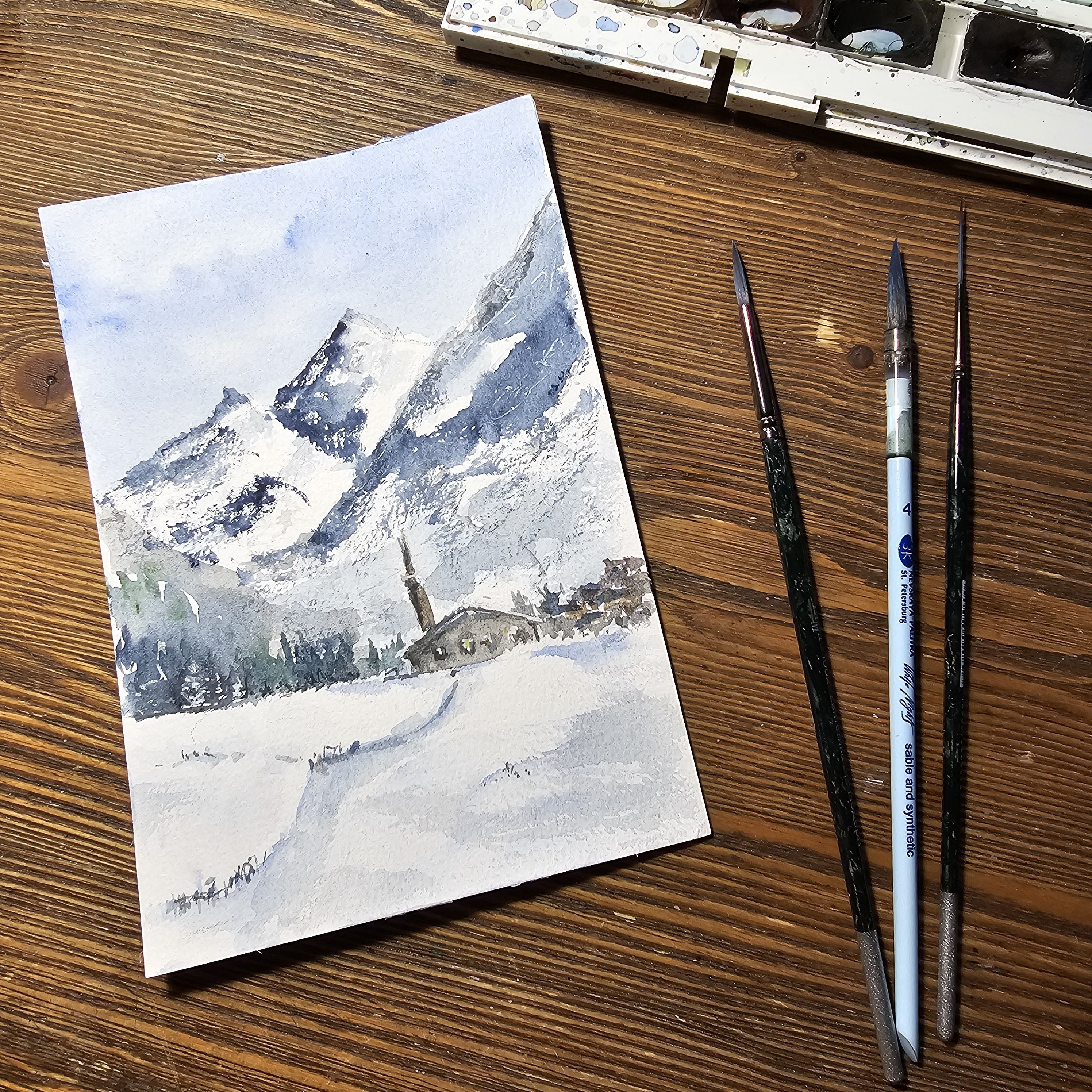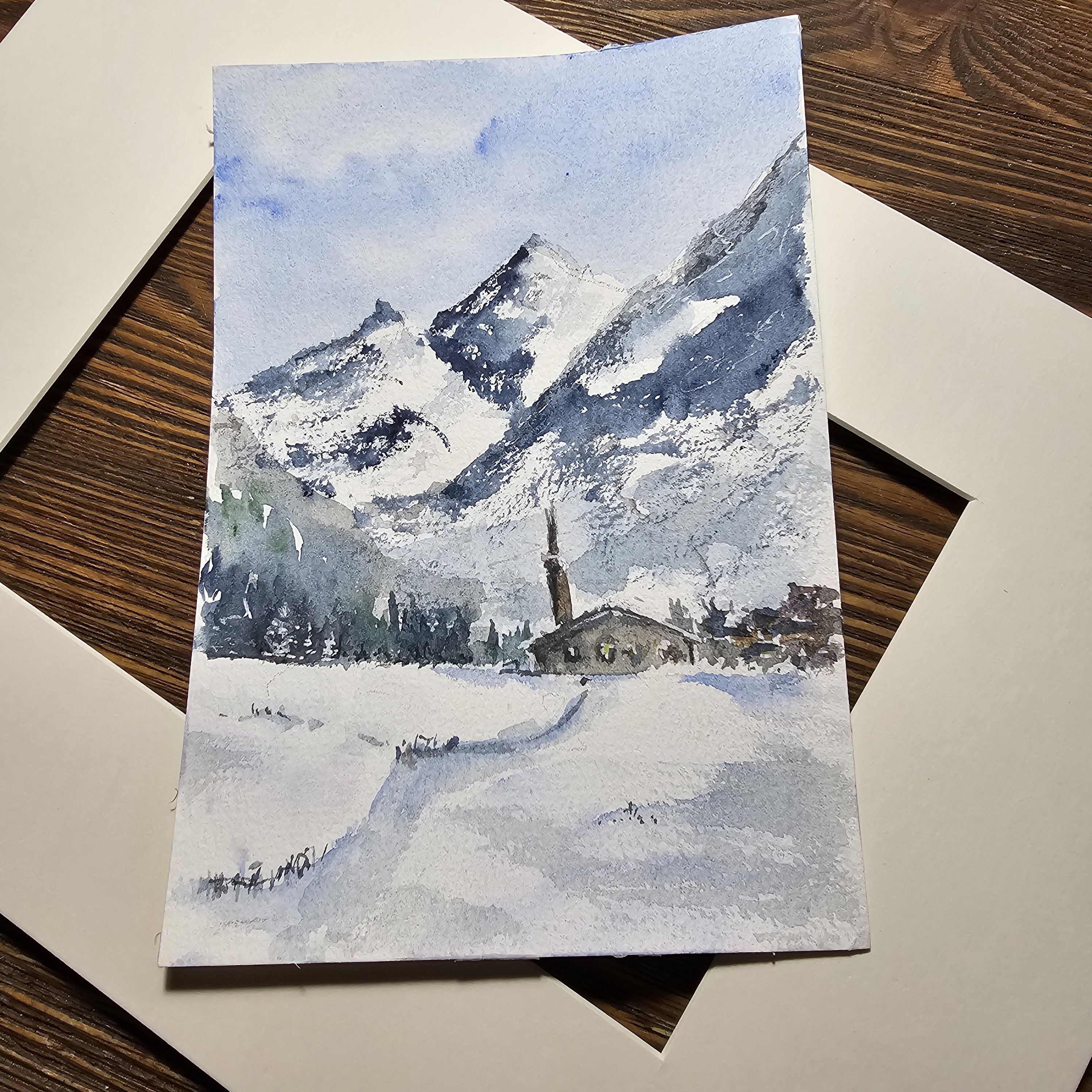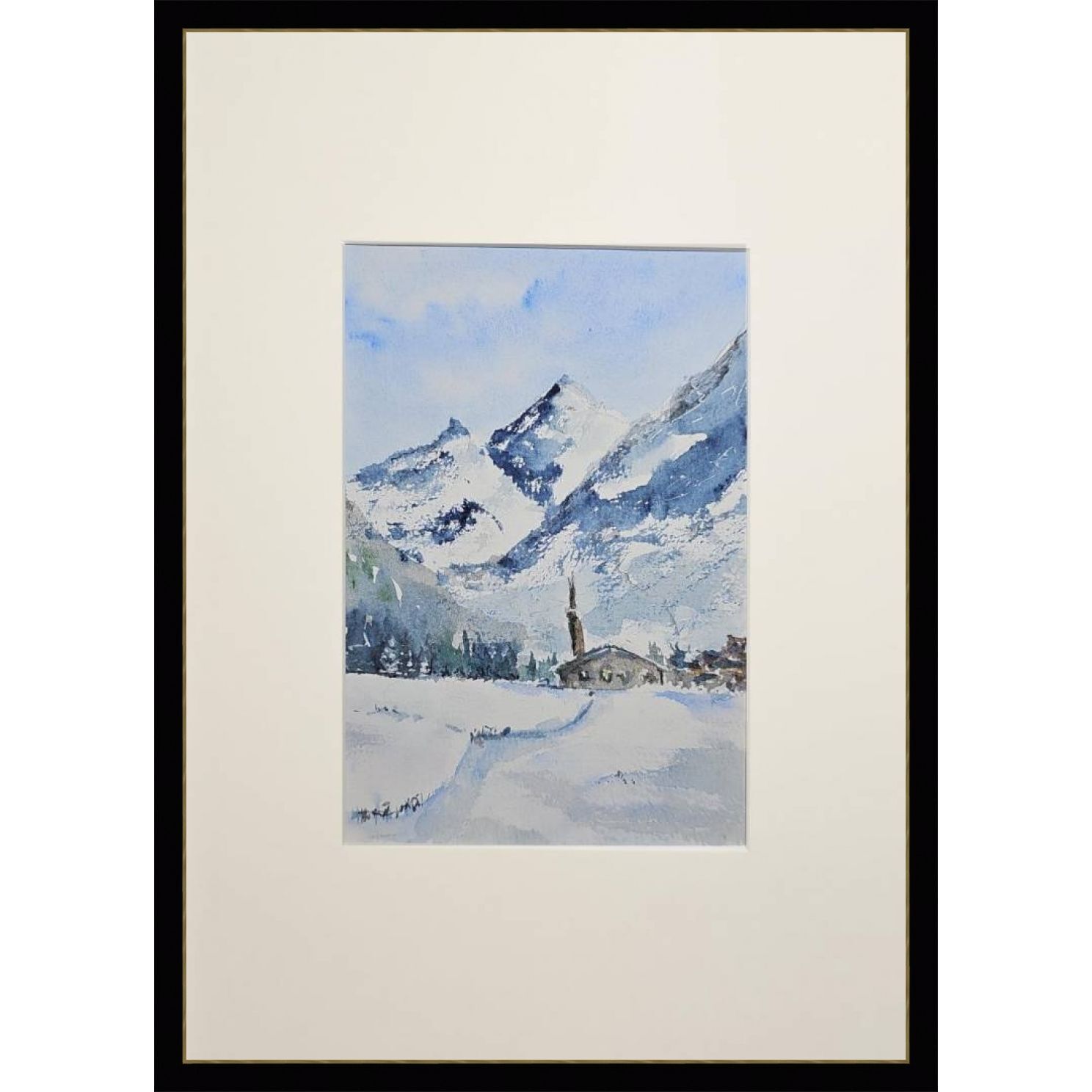 Нам представлена акварельная, зимняя горная сцена. В центре расположены величественные заснеженные горы с ясным голубым небом. У подножия раскинулась деревенька с небольшими домами и церковью с высокой колокольней. Перед деревней простирается заснеженное поле, на котором видна протоптанная тропинка. Художественная работа выполнена в холодной цветовой гамме, преобладают оттенки белого и синего.. Картина оформлена в светлое паспарту, что подчеркивает яркость пейзажа и готова к размещению в раме 21*30 см.