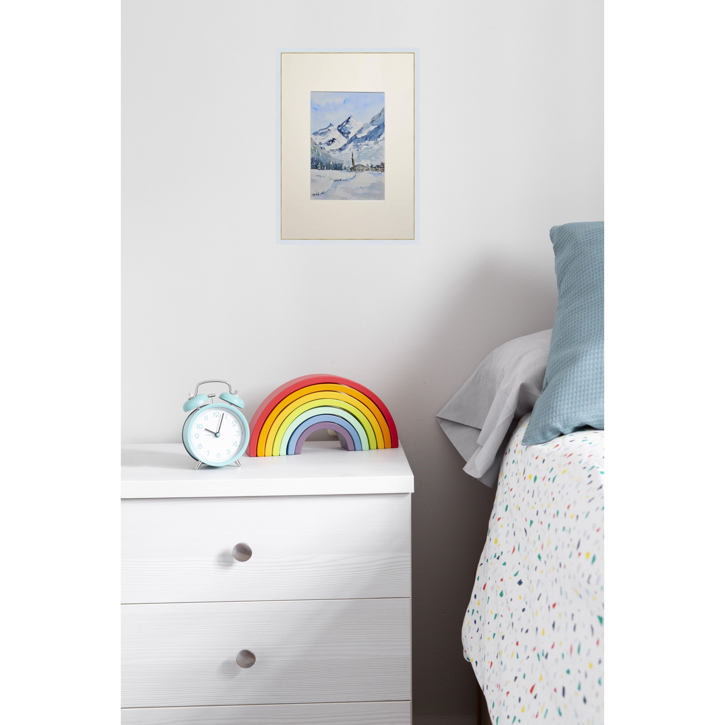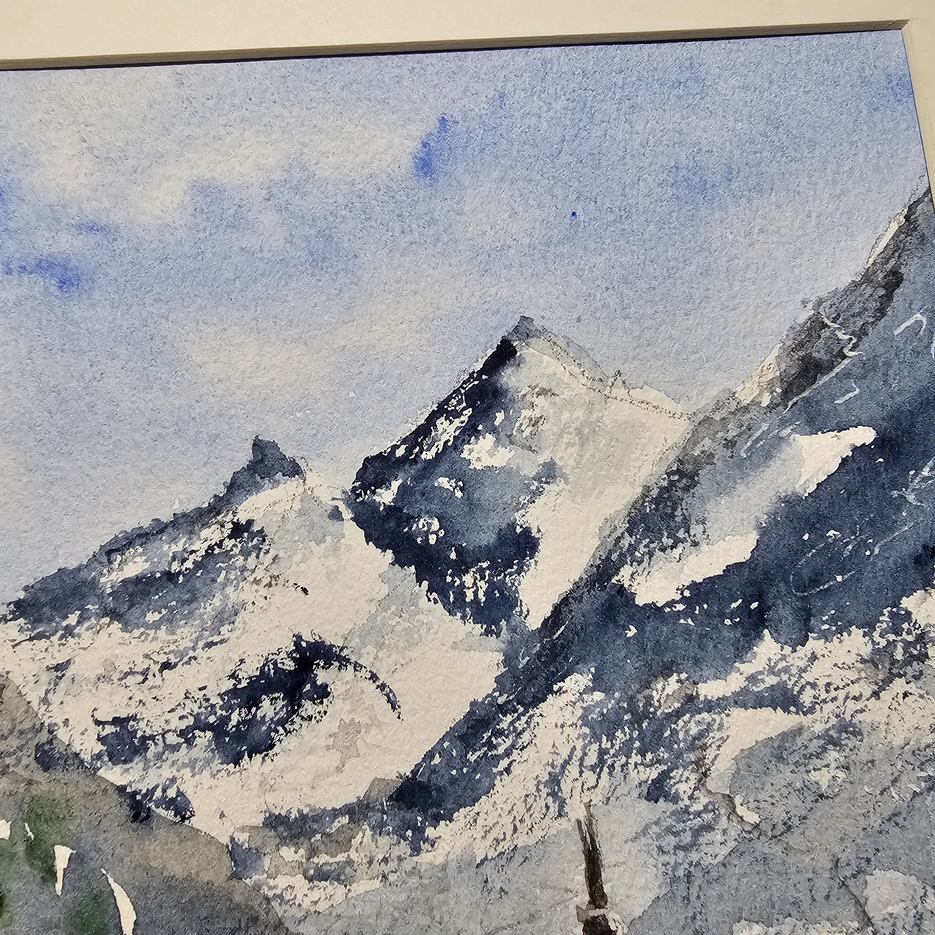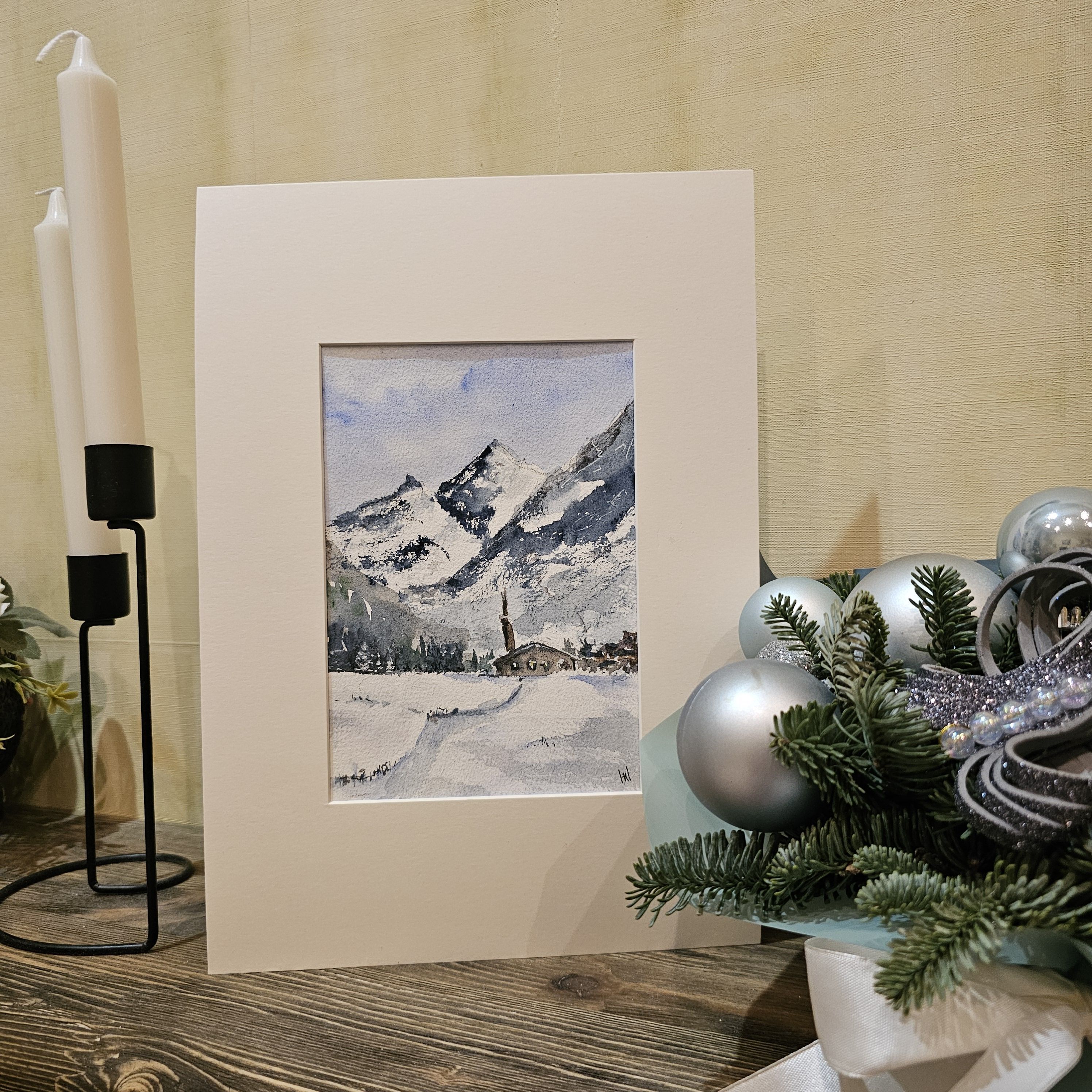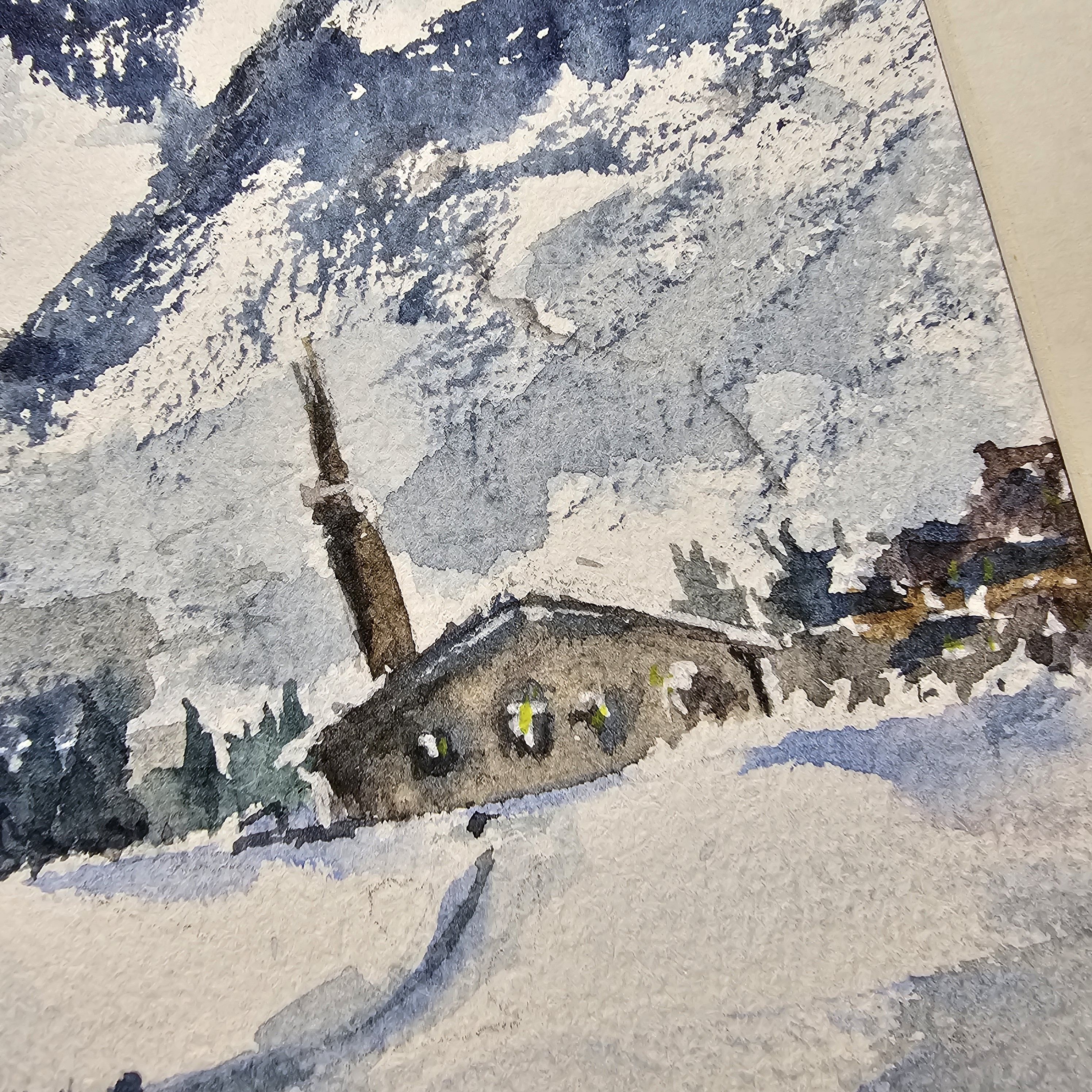 Нам представлена акварельная, зимняя горная сцена. В центре расположены величественные заснеженные горы с ясным голубым небом. У подножия раскинулась деревенька с небольшими домами и церковью с высокой колокольней. Перед деревней простирается заснеженное поле, на котором видна протоптанная тропинка. Художественная работа выполнена в холодной цветовой гамме, преобладают оттенки белого и синего.. Картина оформлена в светлое паспарту, что подчеркивает яркость пейзажа и готова к размещению в раме 21*30 см.