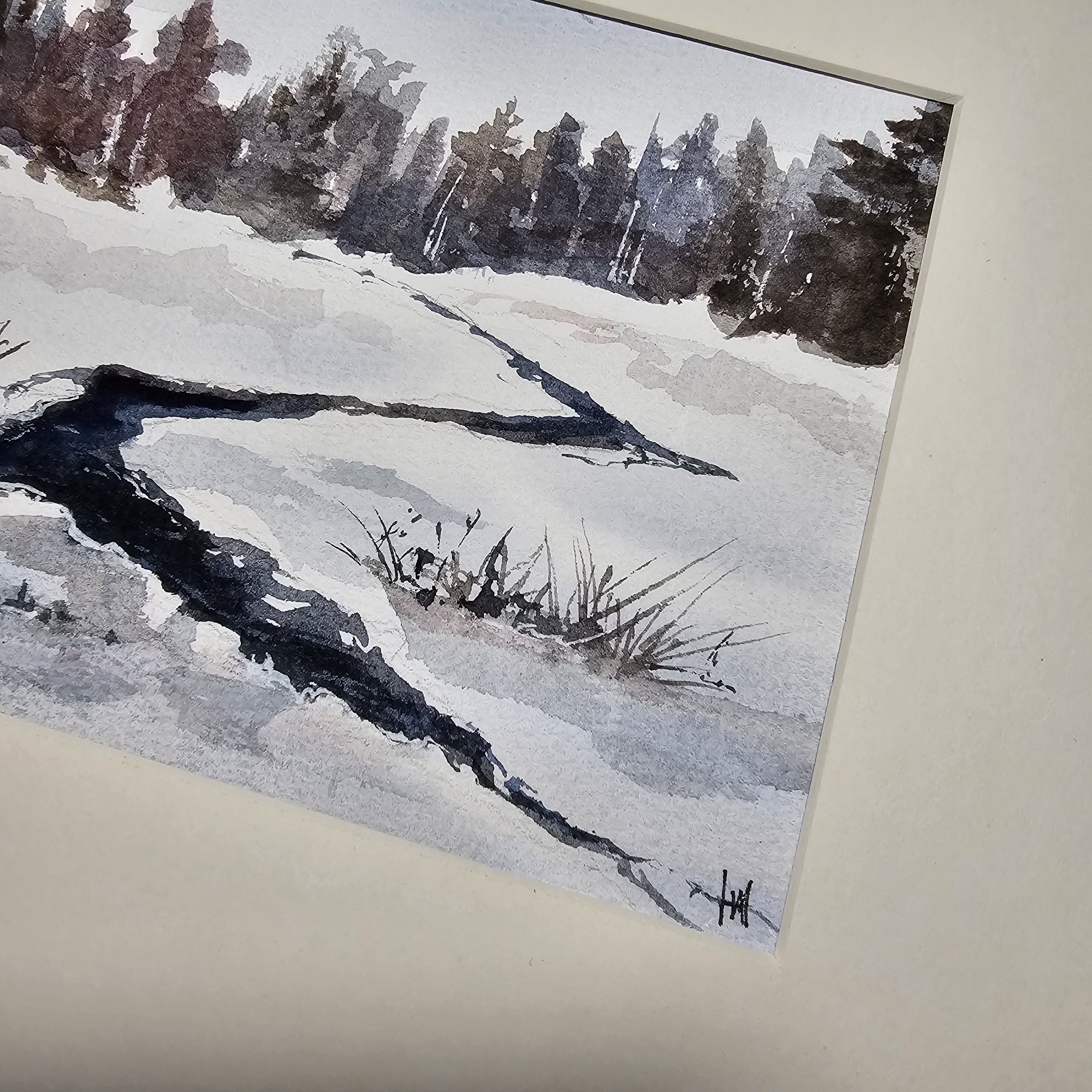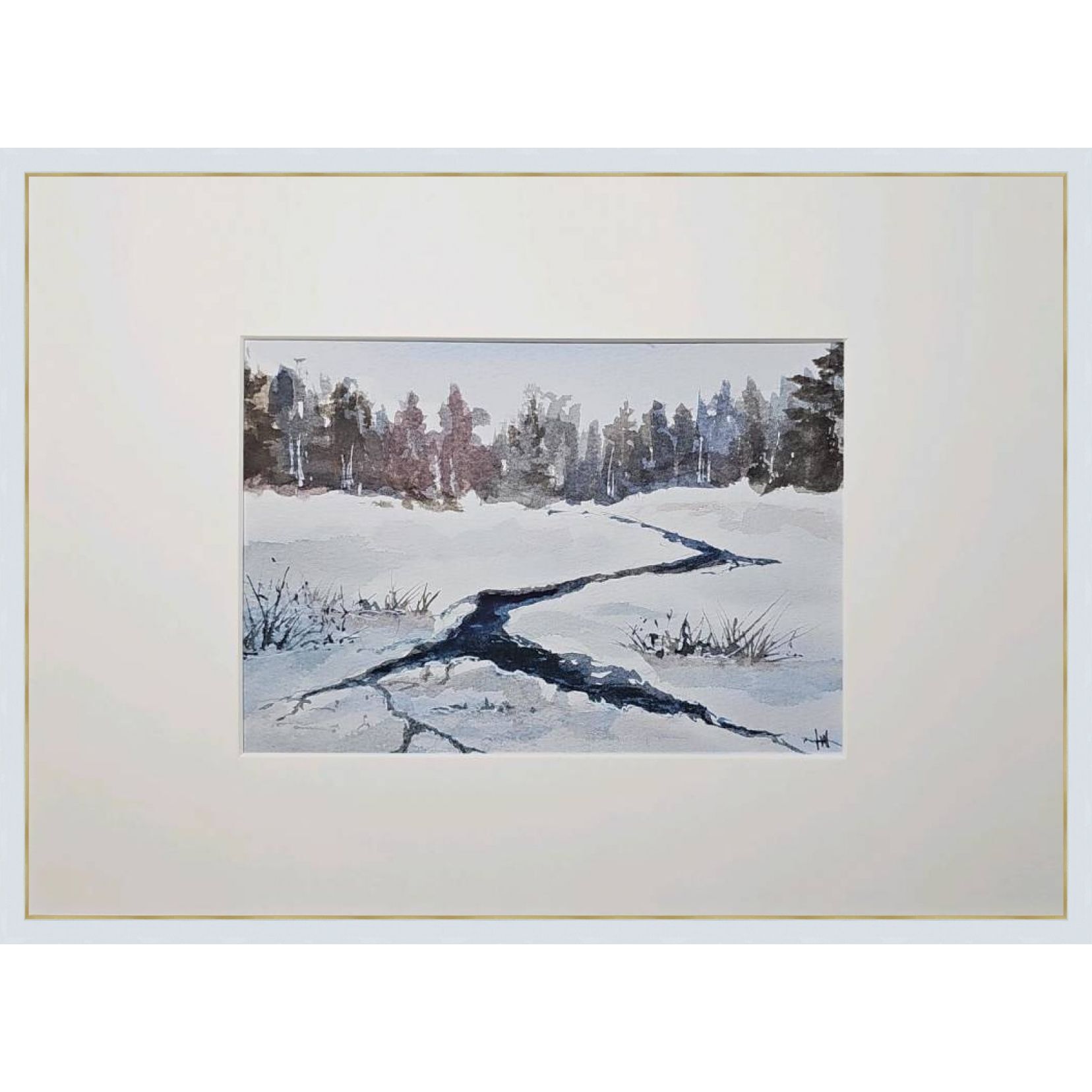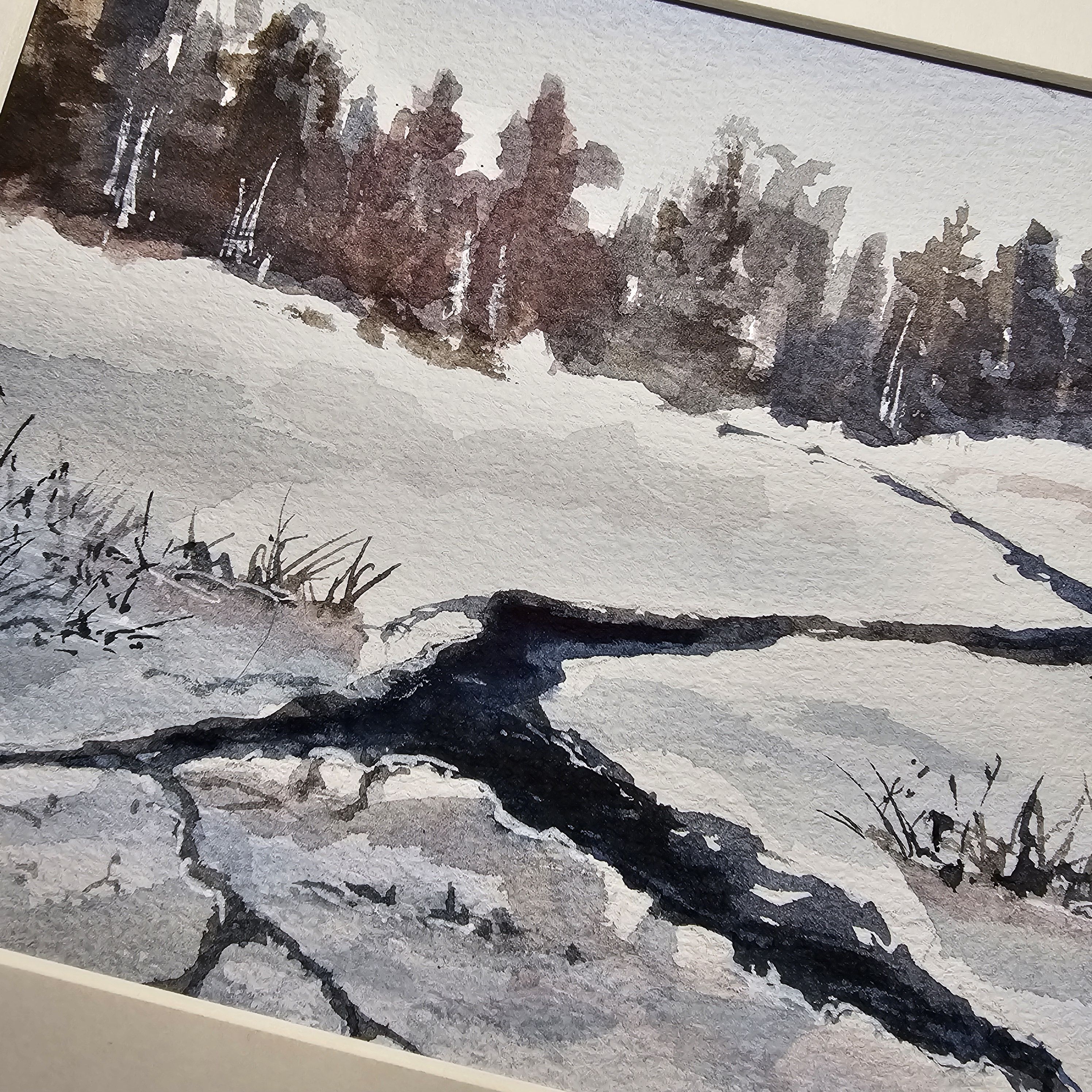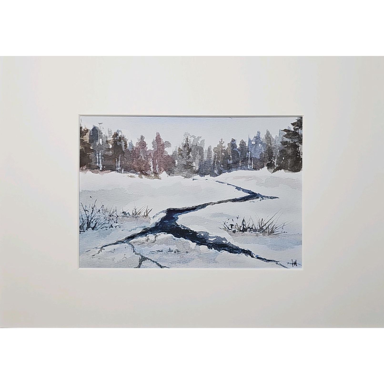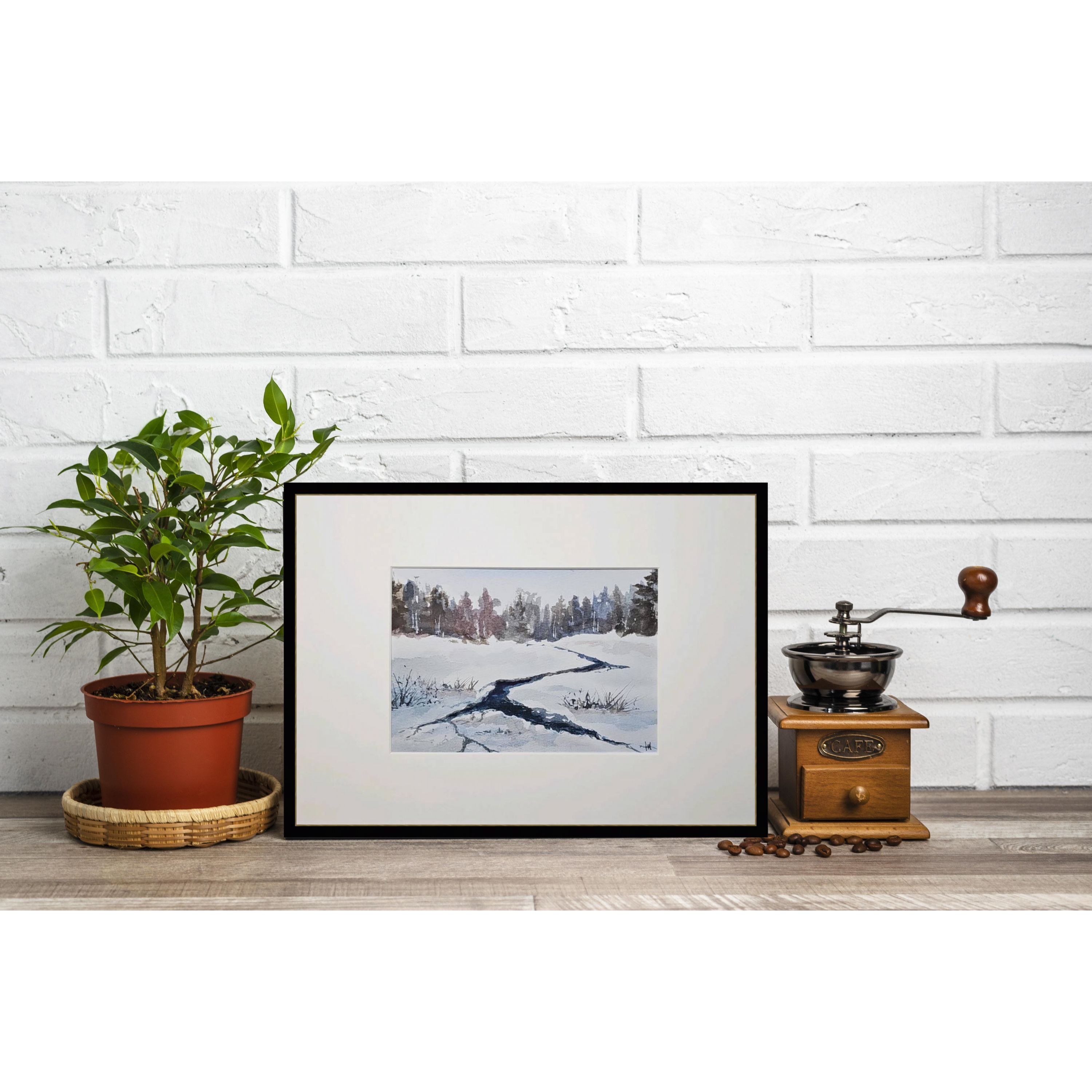 Нам представлена зимняя пейзажная акварель. В центре виден узкий ручей, протекающий через заснеженное поле. По краям ручья встречаются кусты и сухая трава, частично покрытая снегом. На заднем плане видим ряд деревьев, создающих лесной массив. Картина выполнена в холодных тонах, передавая чувство тишины и покоя зимнего дня. Картина оформлена в светлое паспарту, что подчеркивает яркость пейзажа и готова к размещению в раме 21*30 см.