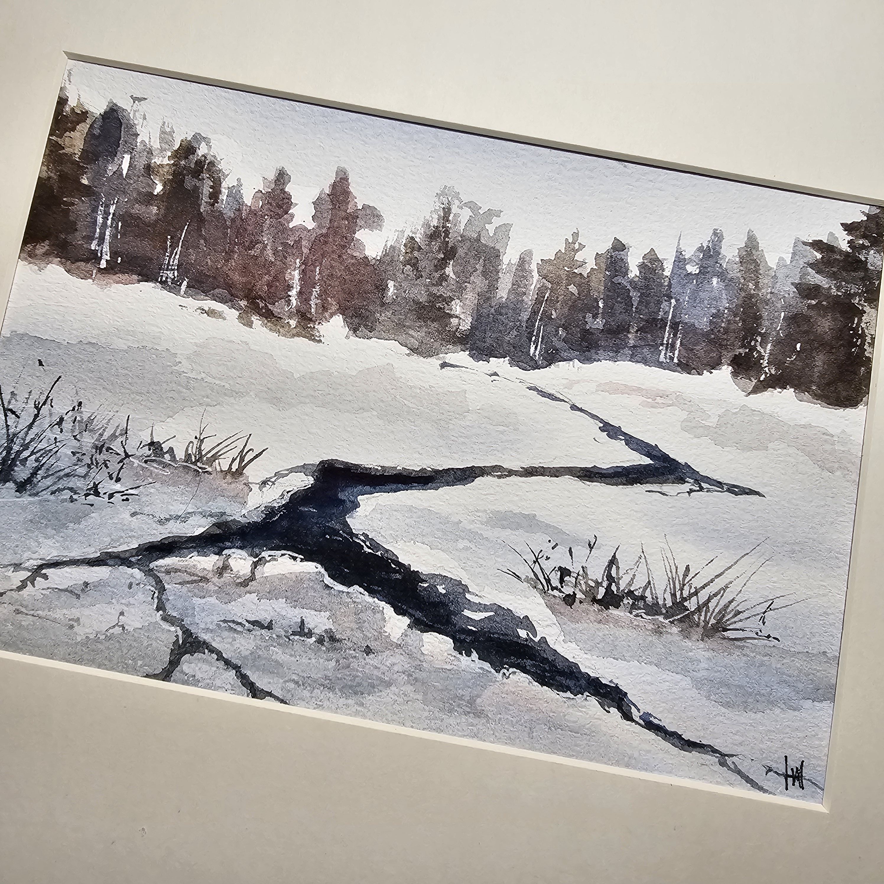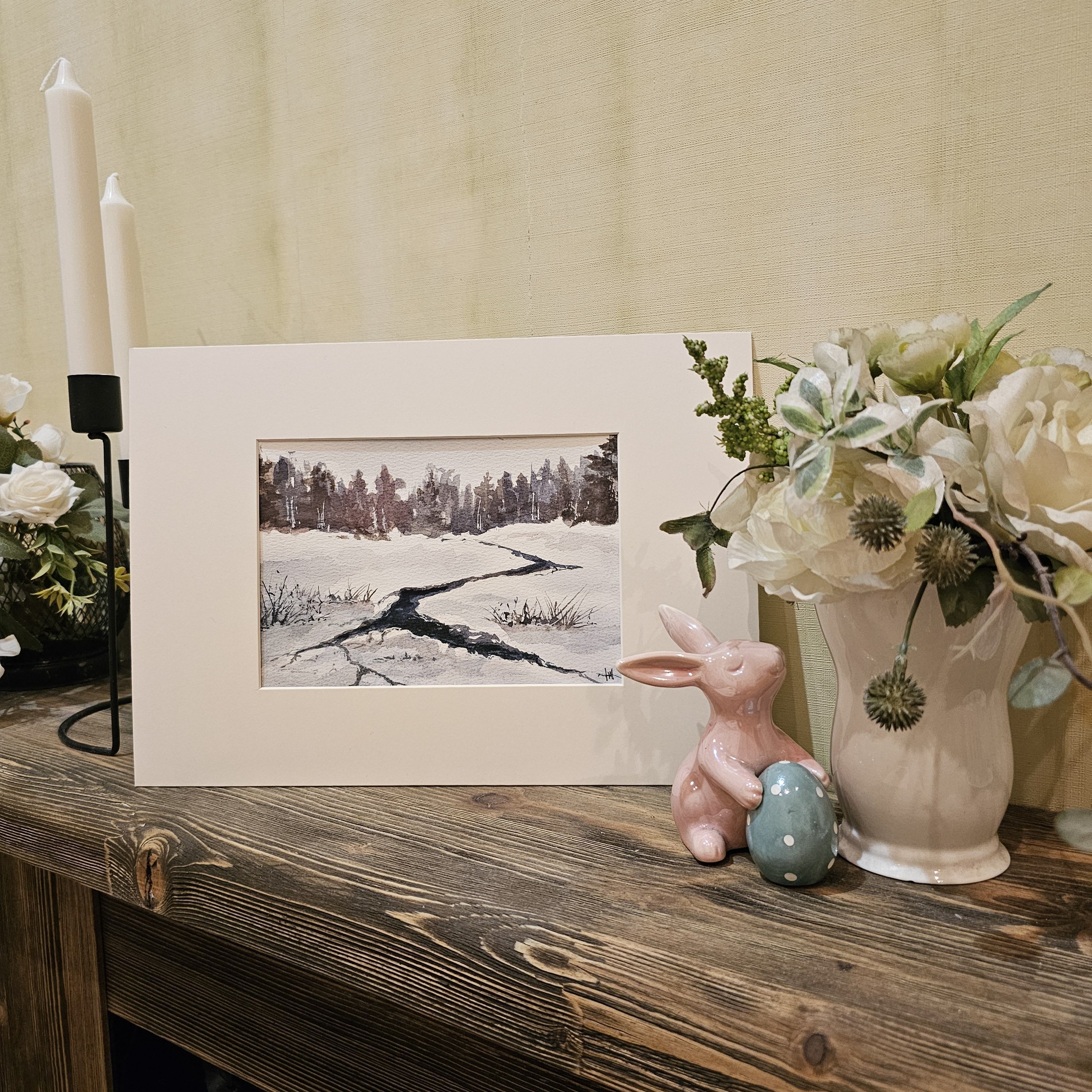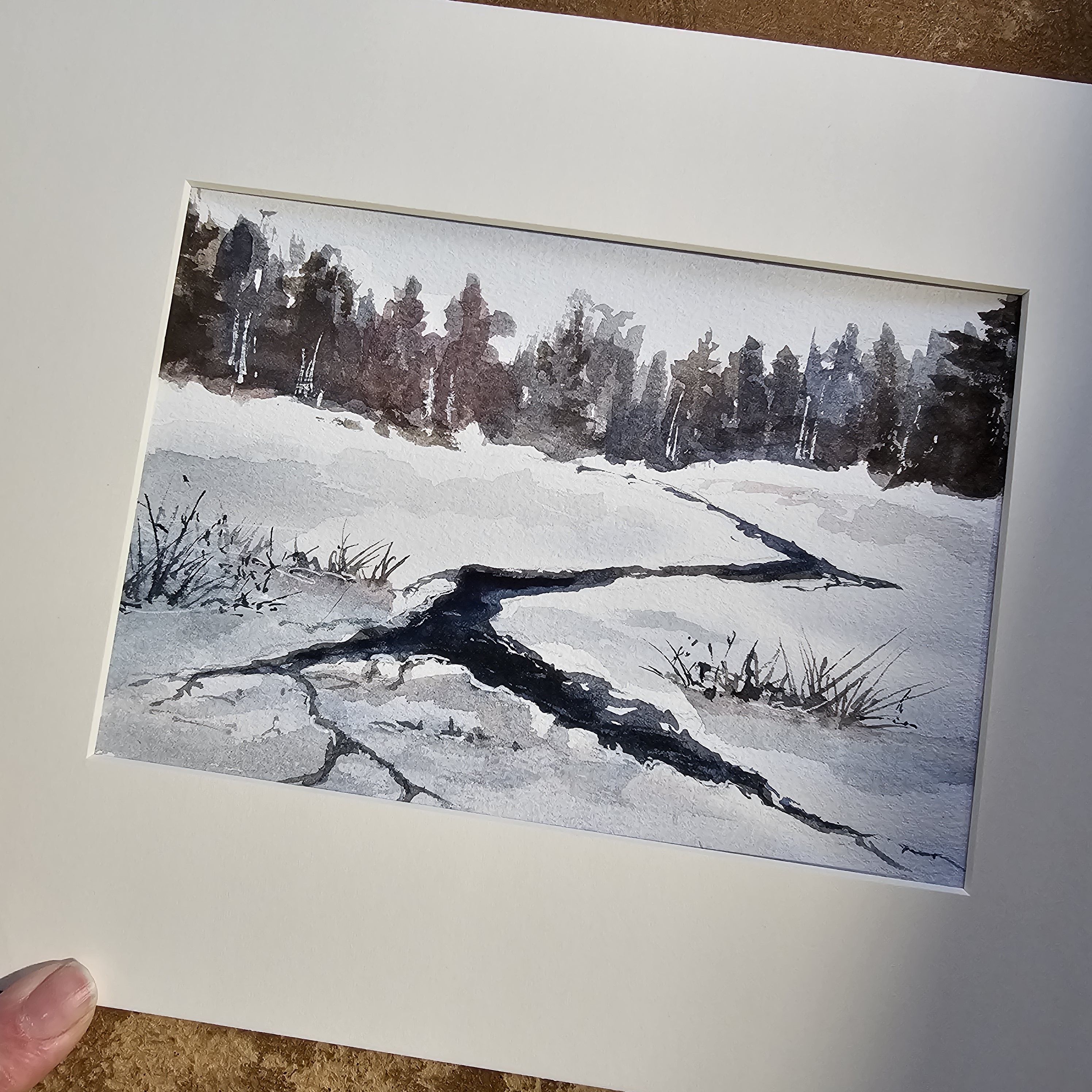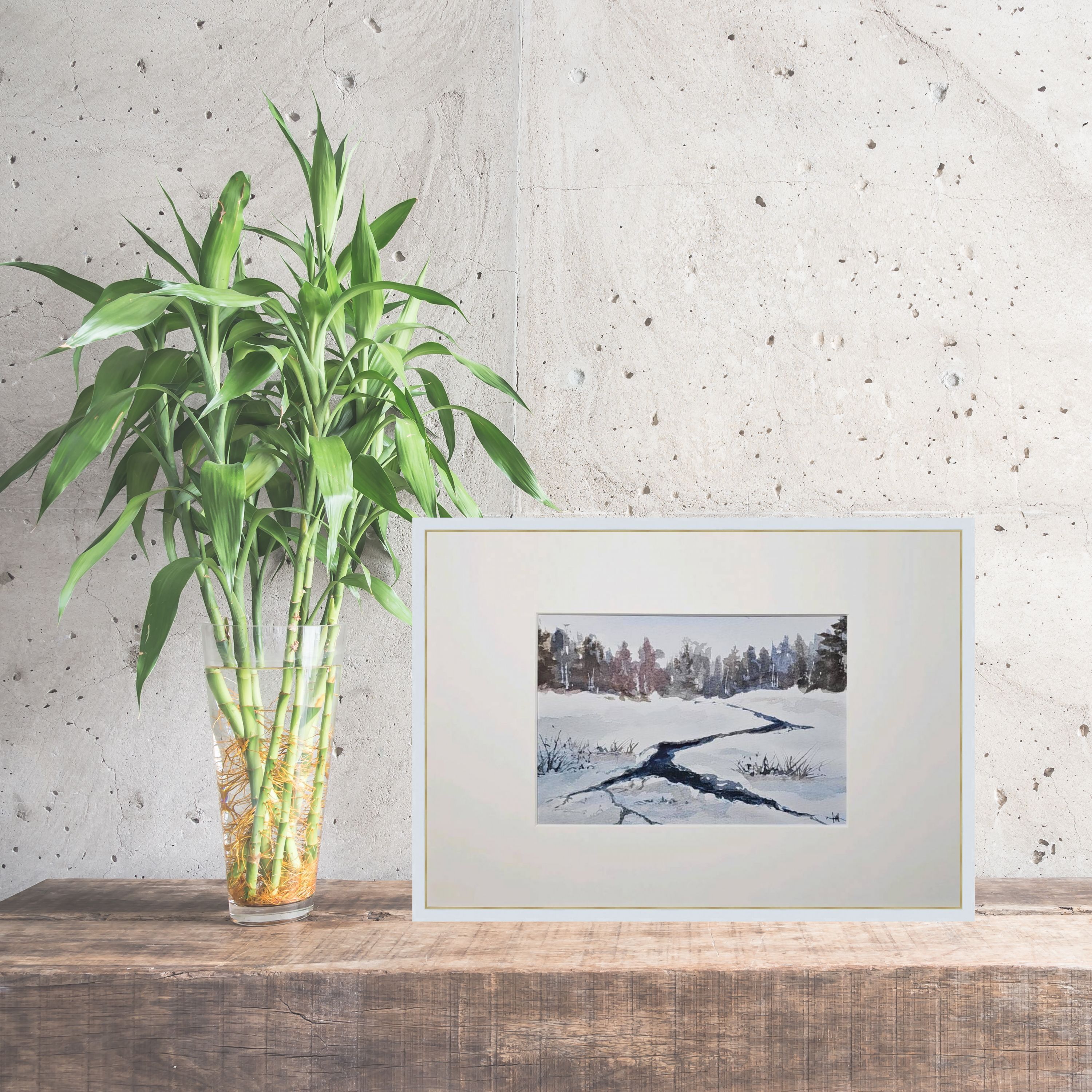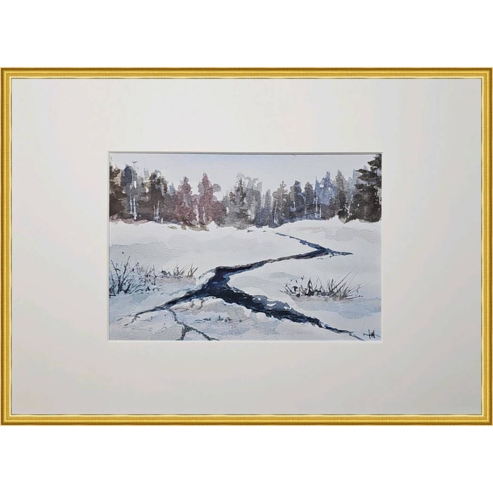 Нам представлена зимняя пейзажная акварель. В центре виден узкий ручей, протекающий через заснеженное поле. По краям ручья встречаются кусты и сухая трава, частично покрытая снегом. На заднем плане видим ряд деревьев, создающих лесной массив. Картина выполнена в холодных тонах, передавая чувство тишины и покоя зимнего дня. Картина оформлена в светлое паспарту, что подчеркивает яркость пейзажа и готова к размещению в раме 21*30 см.