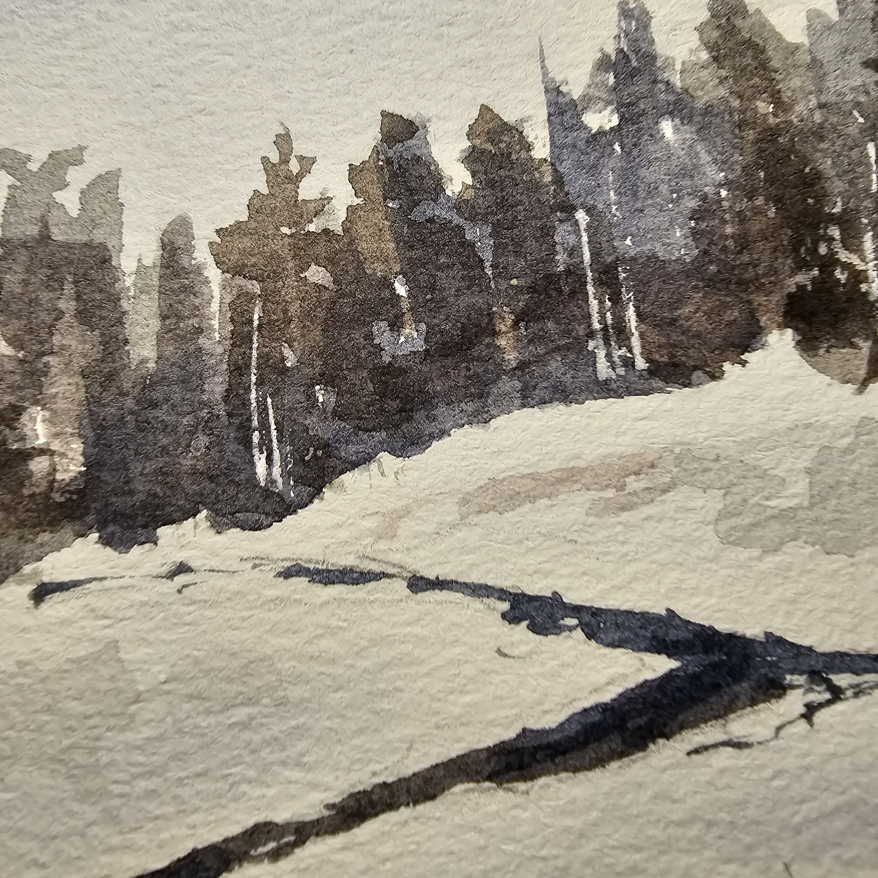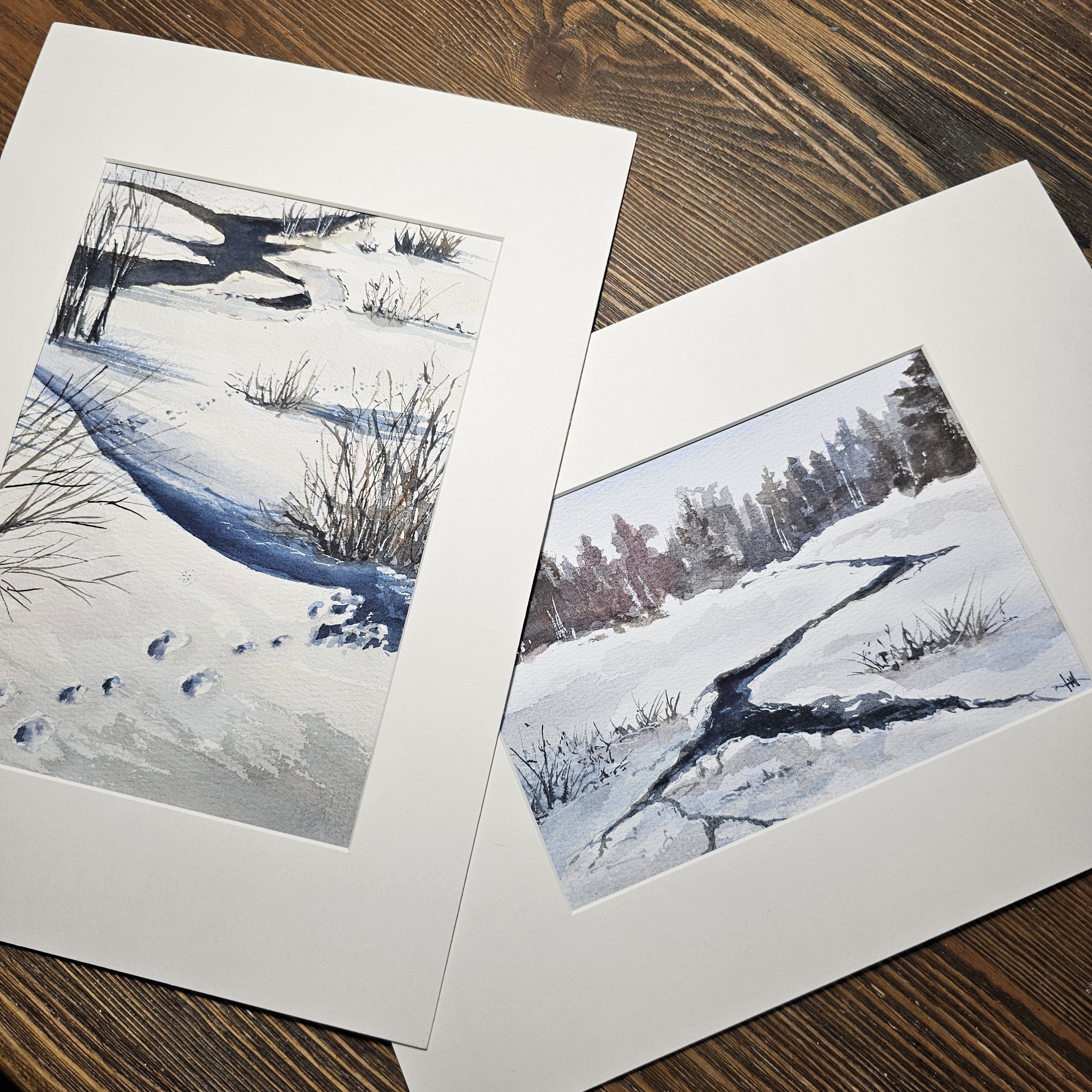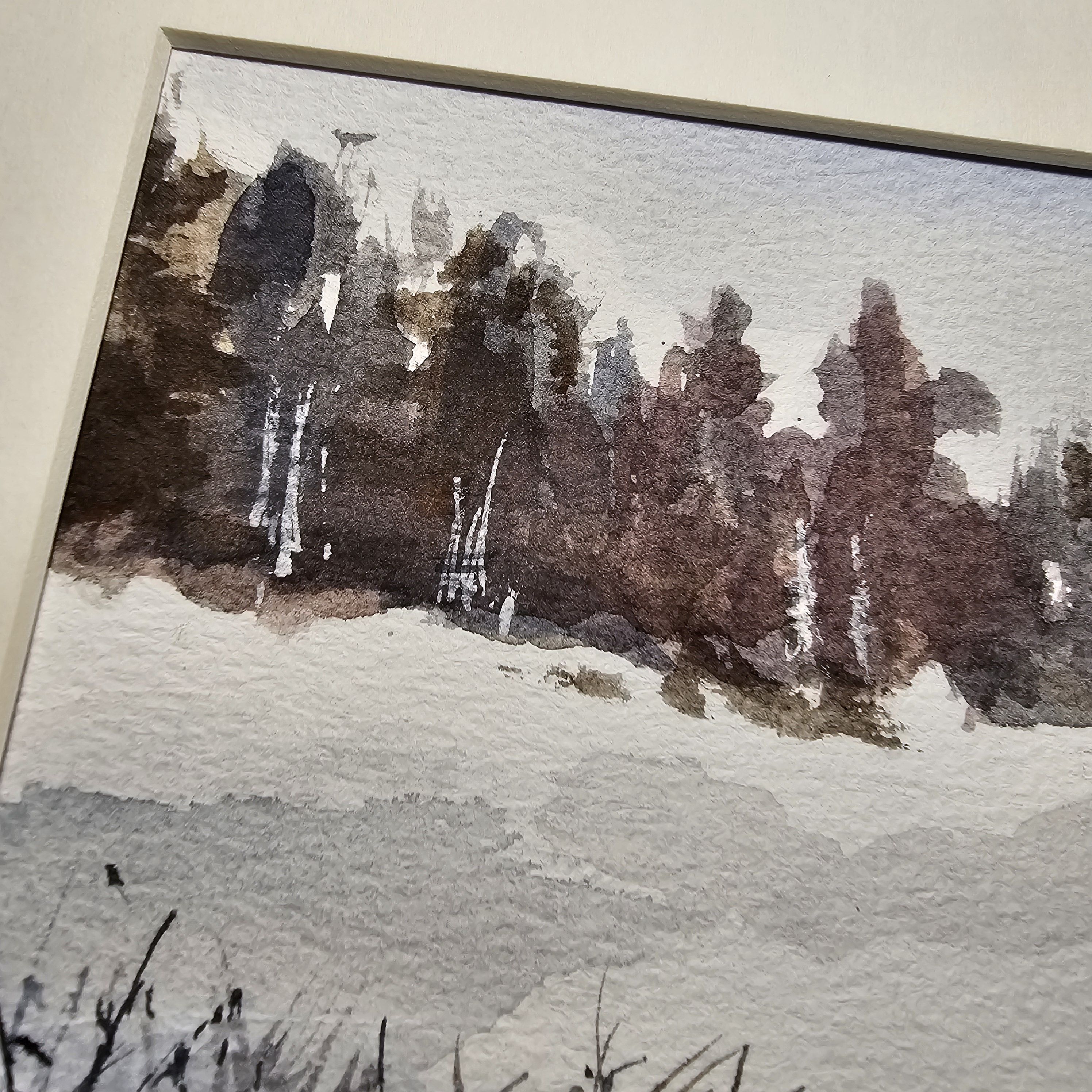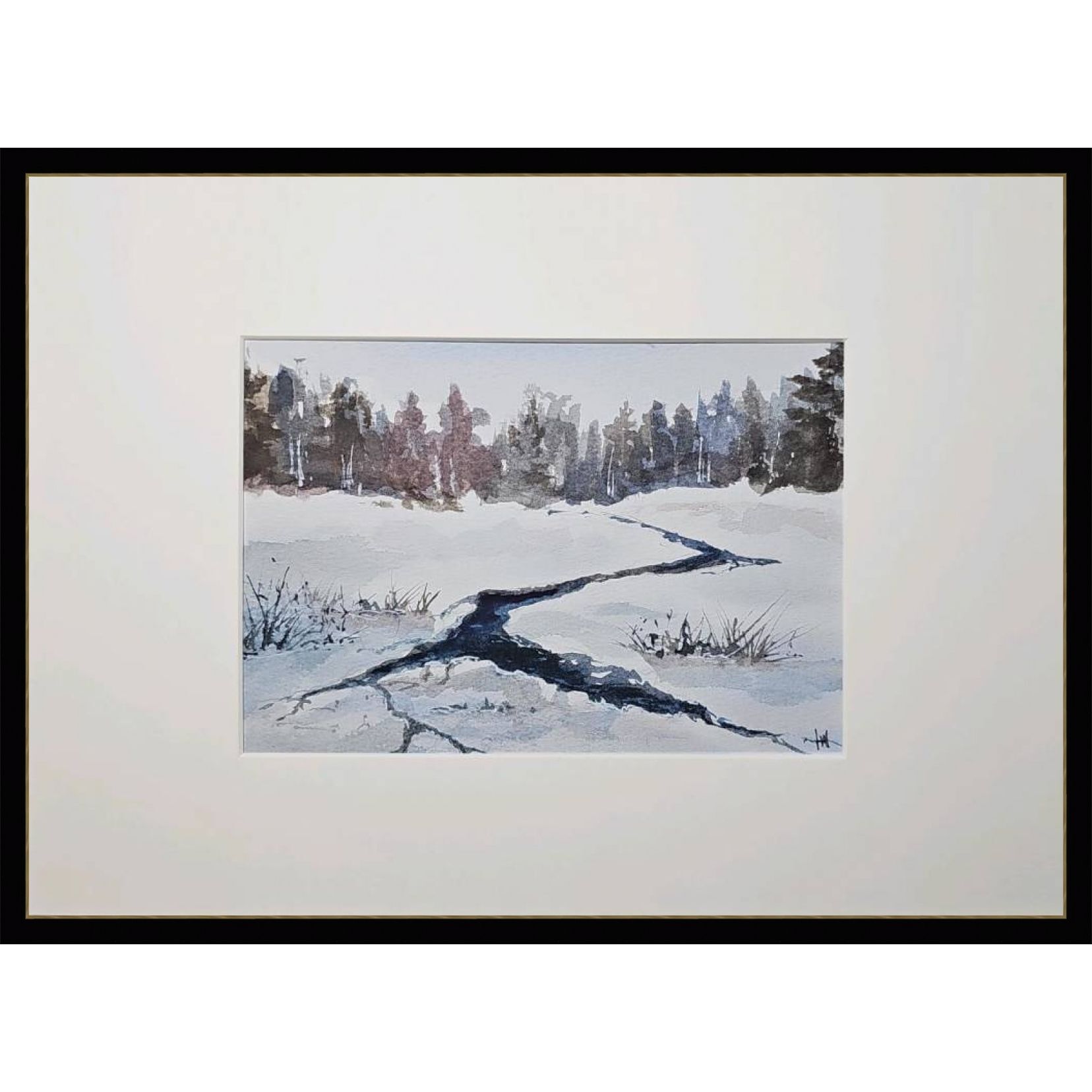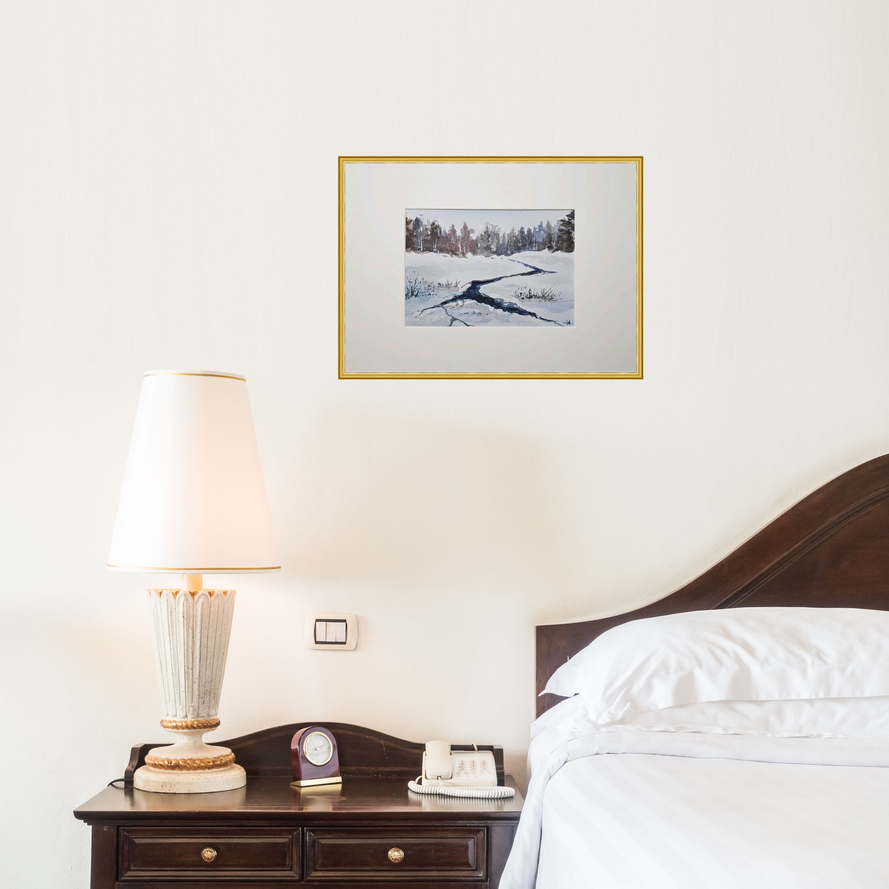 Нам представлена зимняя пейзажная акварель. В центре виден узкий ручей, протекающий через заснеженное поле. По краям ручья встречаются кусты и сухая трава, частично покрытая снегом. На заднем плане видим ряд деревьев, создающих лесной массив. Картина выполнена в холодных тонах, передавая чувство тишины и покоя зимнего дня. Картина оформлена в светлое паспарту, что подчеркивает яркость пейзажа и готова к размещению в раме 21*30 см.