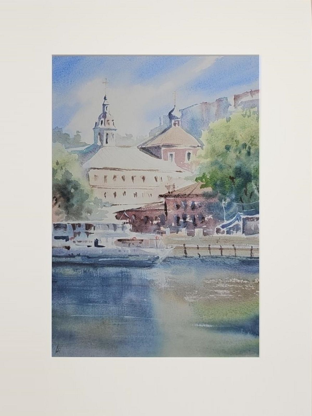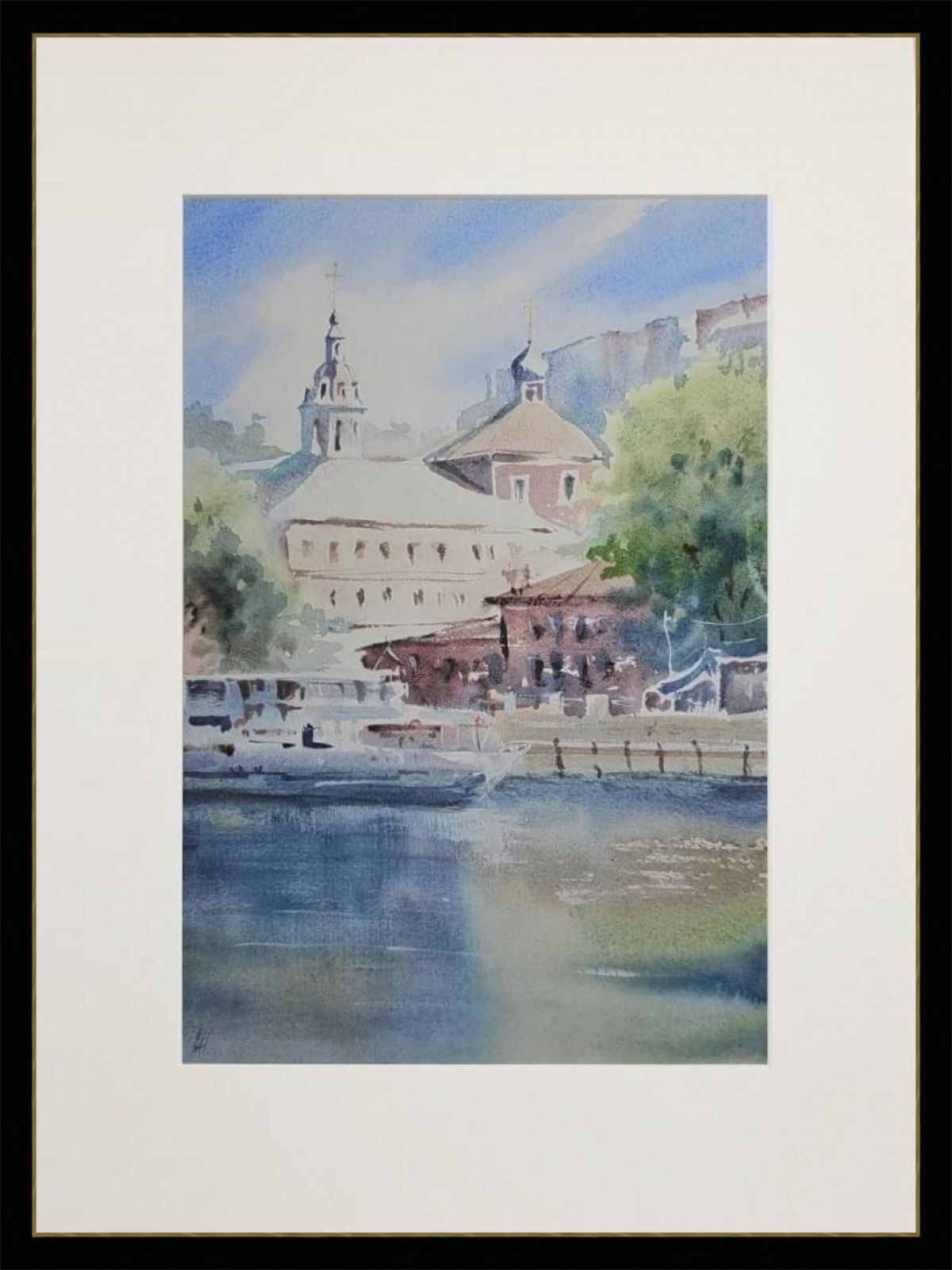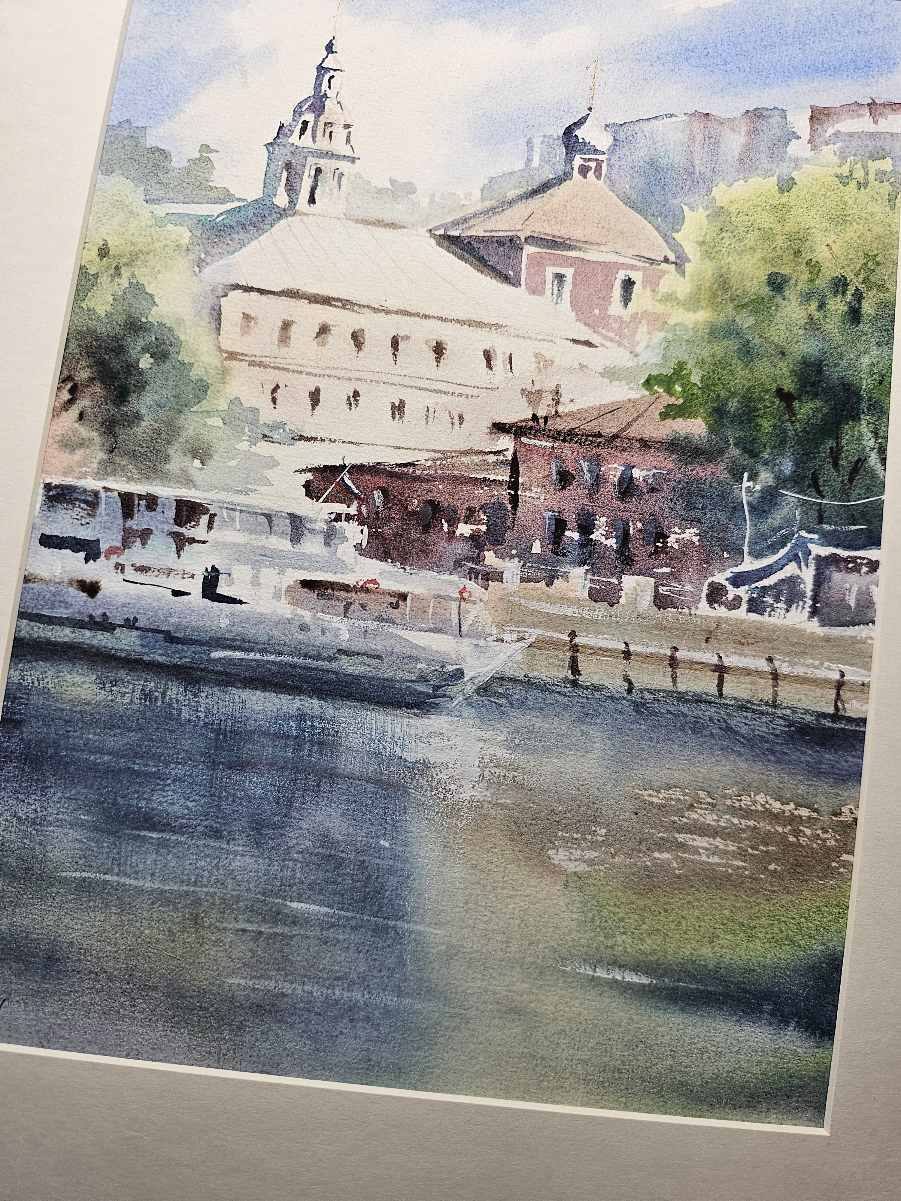 Нам представлена акварельная картина, изображающая вид на архитектурные строения на Андреевской набережной г. Москве. Здания окружены зеленью, а перед ним видна водная поверхность реки. У причала стоит прогулочное судно и ждет своих посетителей. Картина выполнена в мягких пастельных тонах, с преобладанием голубых и зелёных оттенков. Атмосфера на изображении спокойная и умиротворяющая, передающая чувство летнего дня.Работа оформлена в светлое паспарту и готова для размещения в раме стандартного размера.