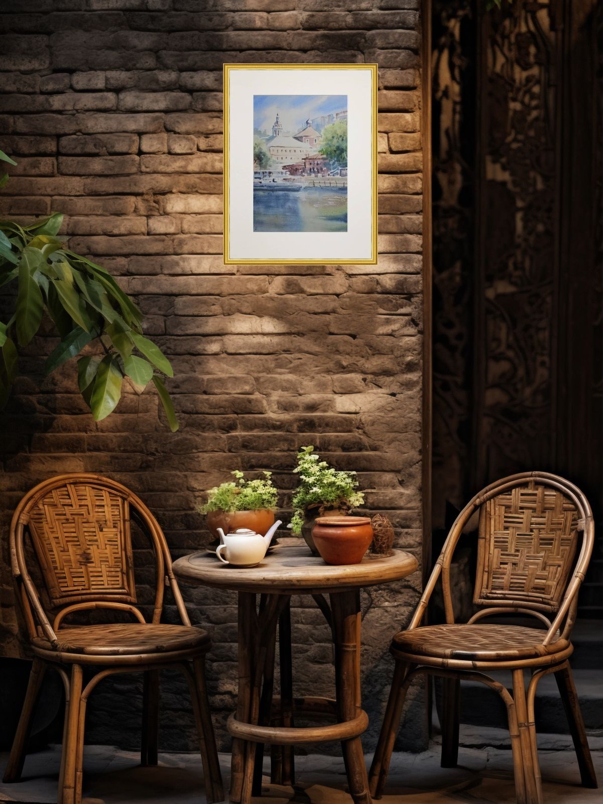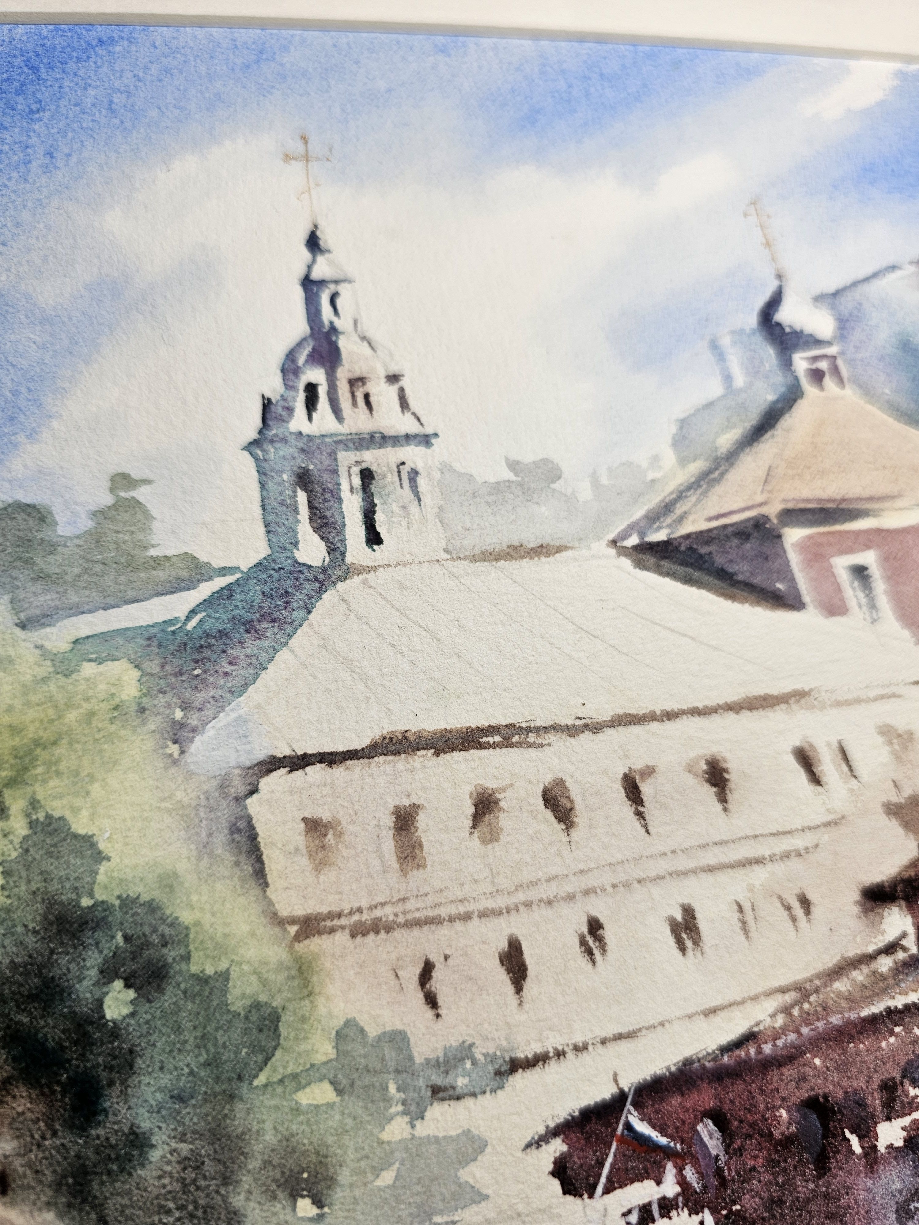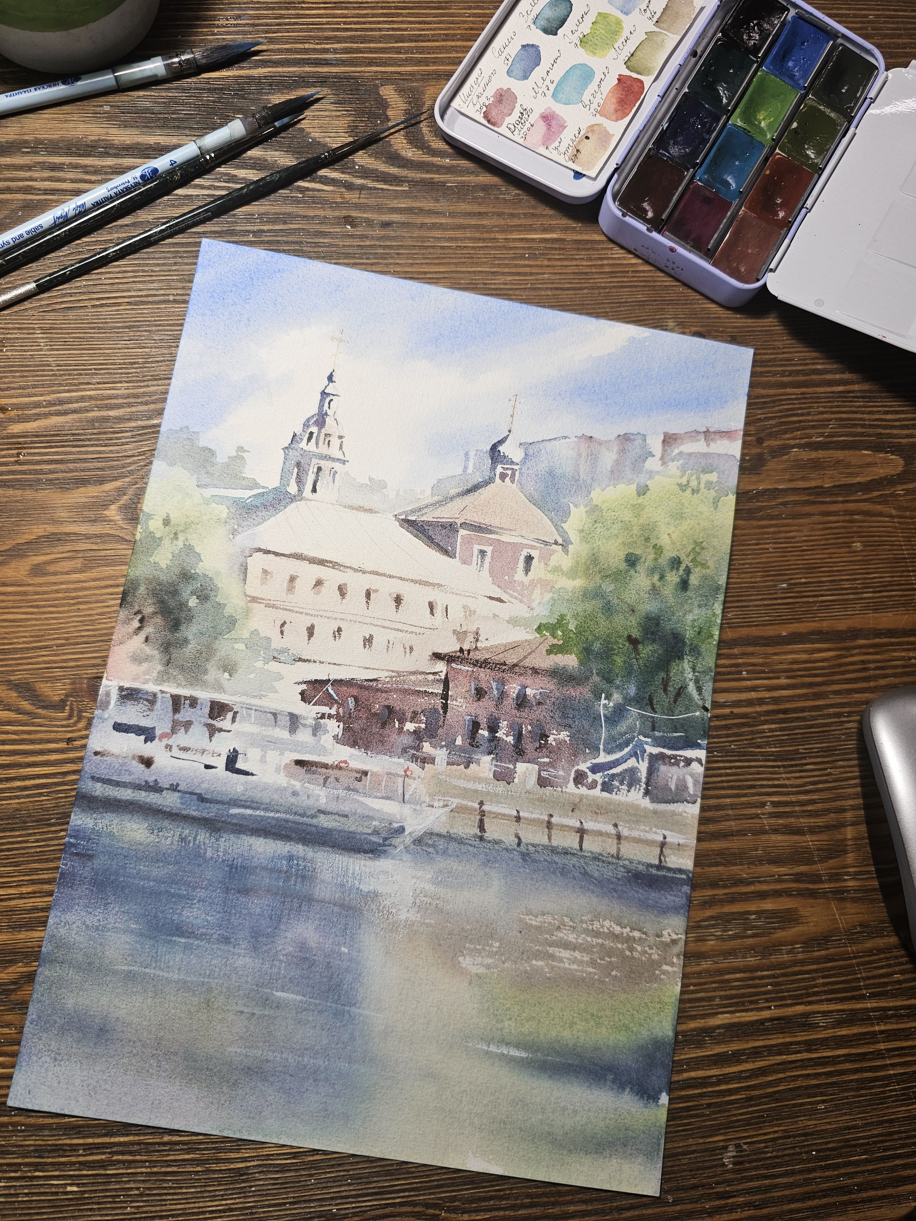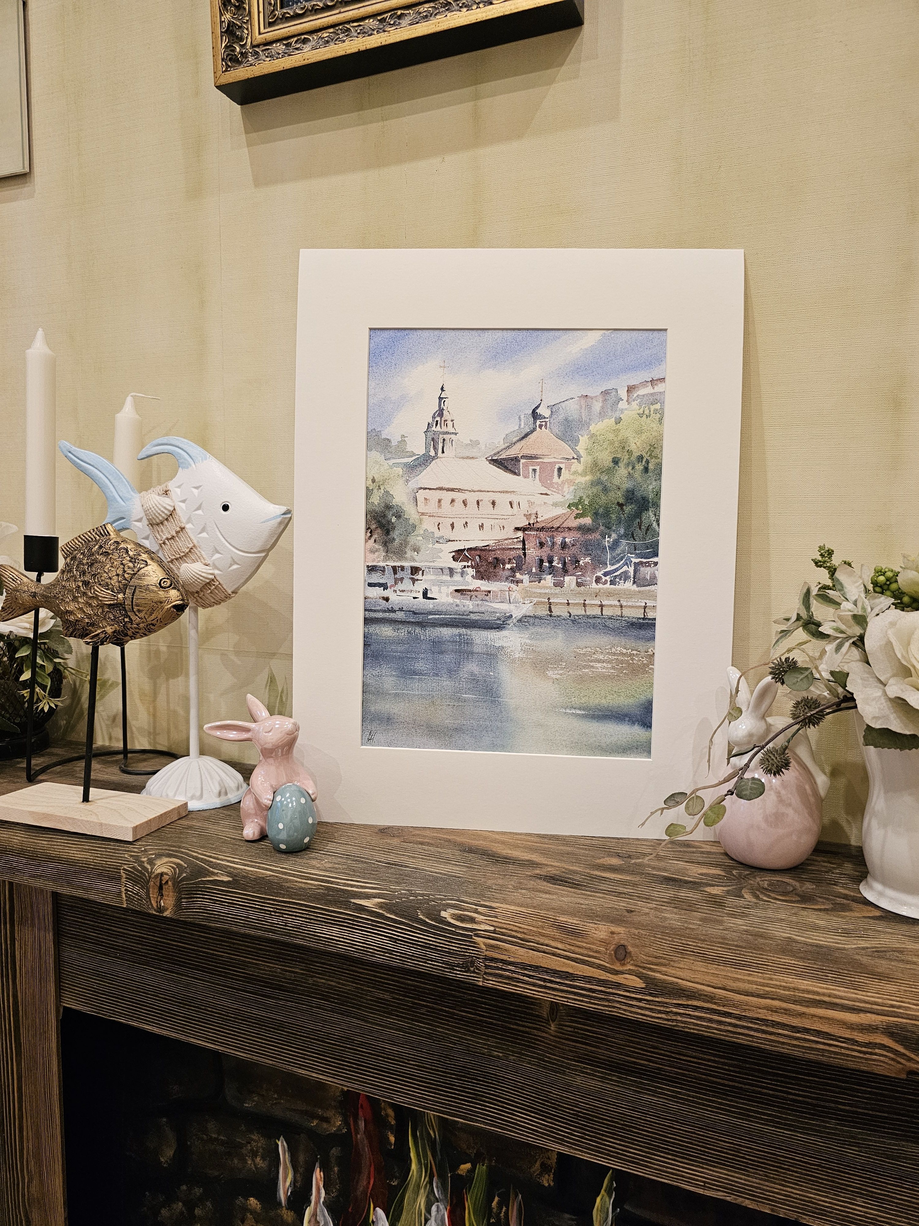 Нам представлена акварельная картина, изображающая вид на архитектурные строения на Андреевской набережной г. Москве. Здания окружены зеленью, а перед ним видна водная поверхность реки. У причала стоит прогулочное судно и ждет своих посетителей. Картина выполнена в мягких пастельных тонах, с преобладанием голубых и зелёных оттенков. Атмосфера на изображении спокойная и умиротворяющая, передающая чувство летнего дня.Работа оформлена в светлое паспарту и готова для размещения в раме стандартного размера.