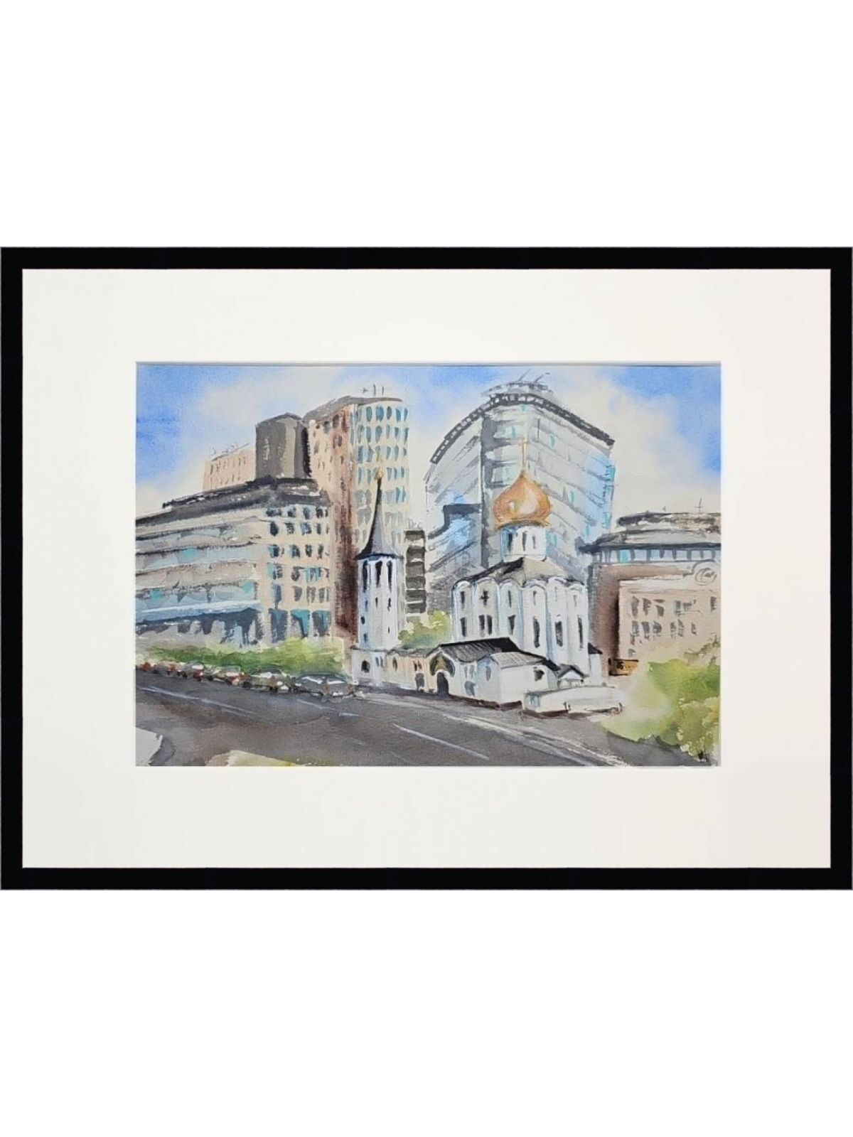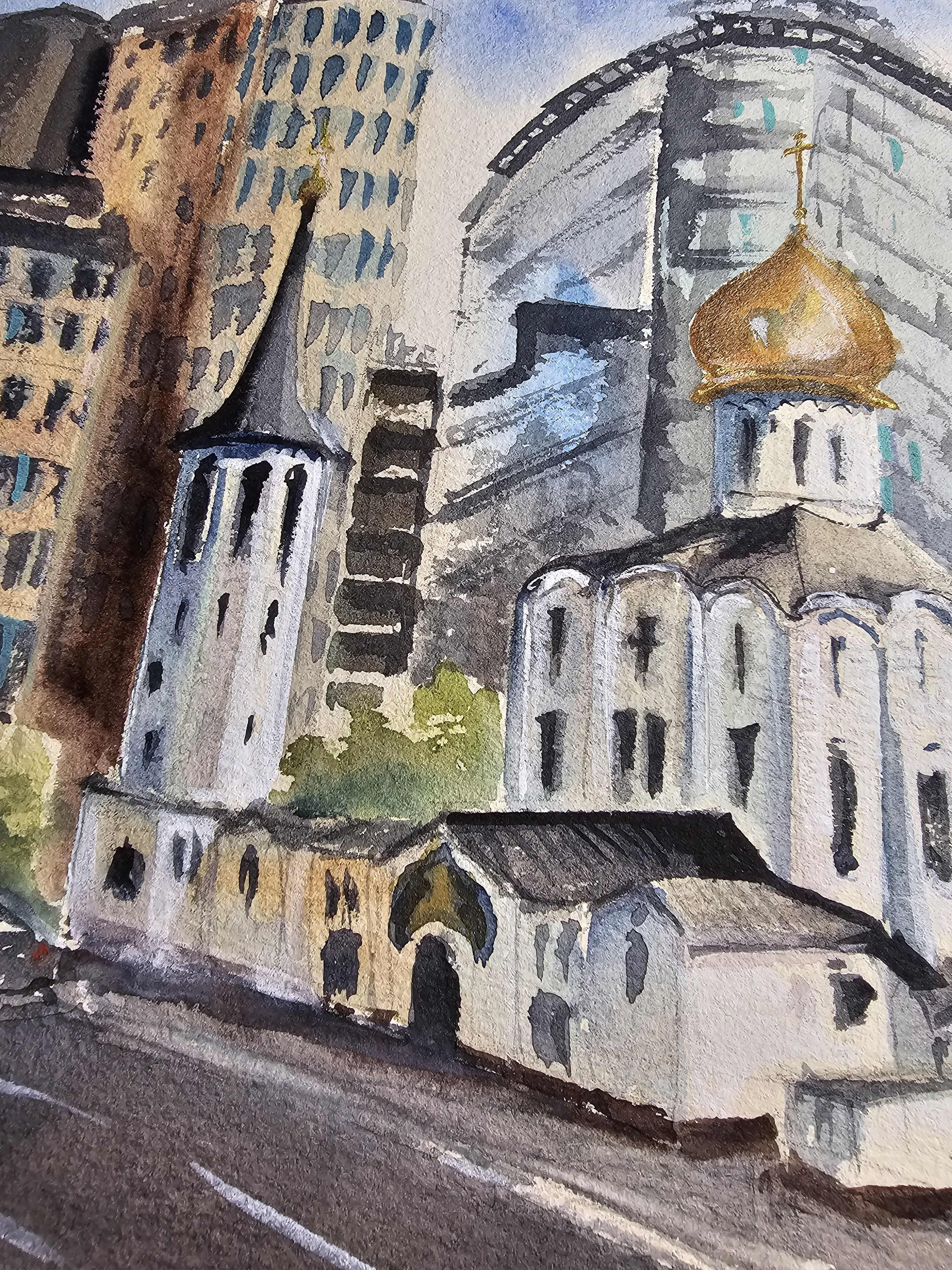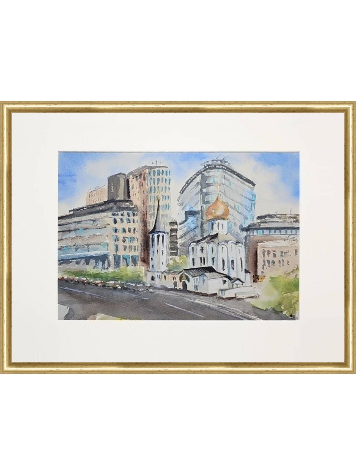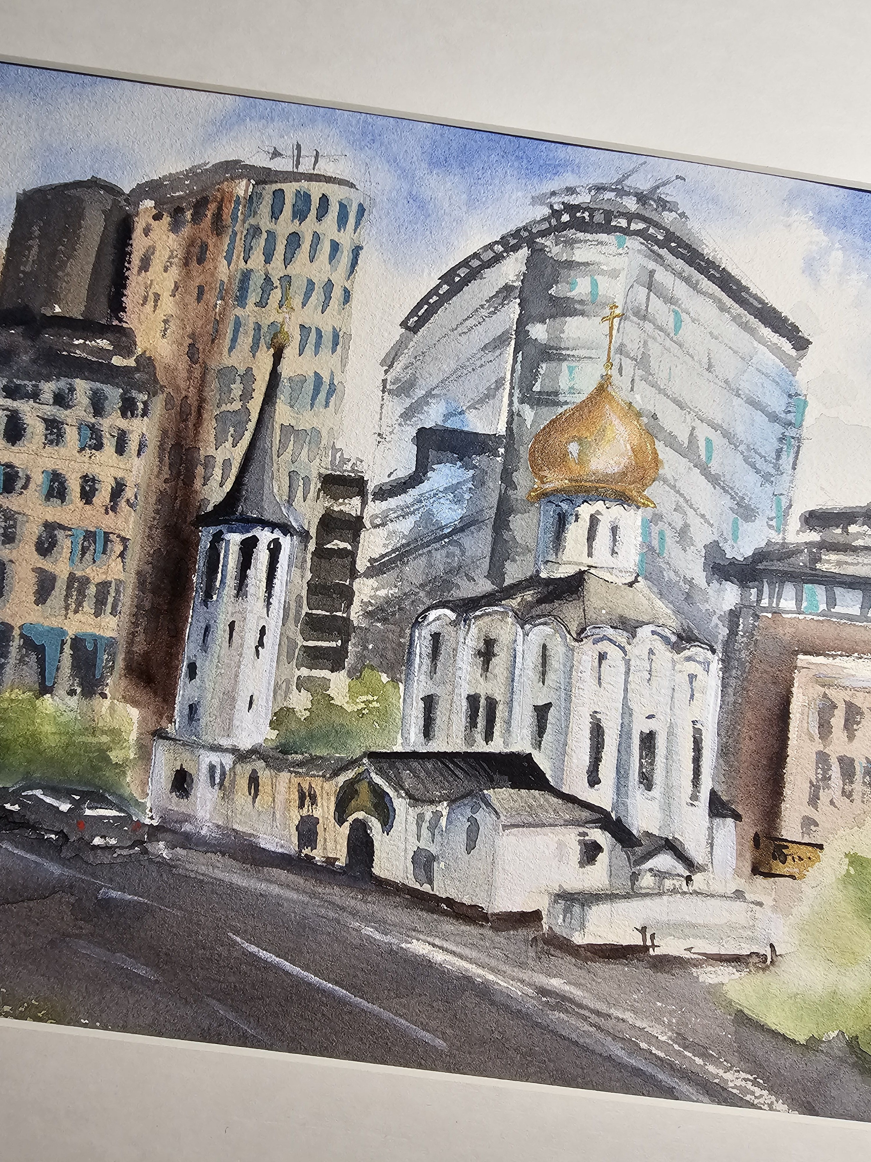 Нам представлена акварельная иллюстрация городского пейзажа. На переднем плане заметна дорога с движущимся транспортом. В центре картины изображён белый храм с золотым куполом, который выделяется на фоне современных многоэтажных зданий с остеклёнными фасадами. На заднем плане видны высокие офисные здания. Небо светлое, с лёгкими облаками. Атмосфера картины сочетает в себе элементы старинной архитектуры и современного городского пейзажа Белой площади в Москве.Работа оформлена в светлое паспарту и готова для размещения в раме стандартного размера.