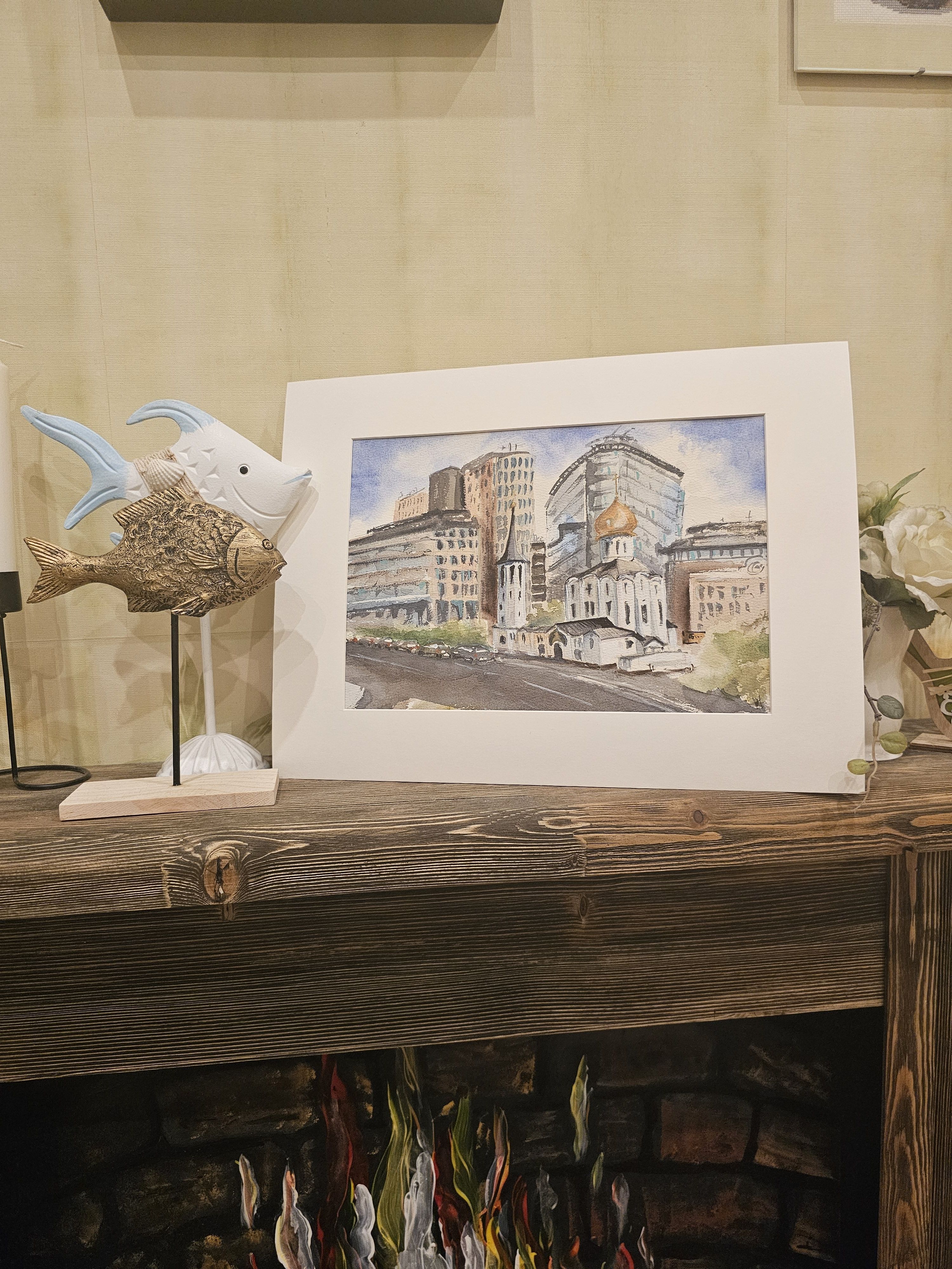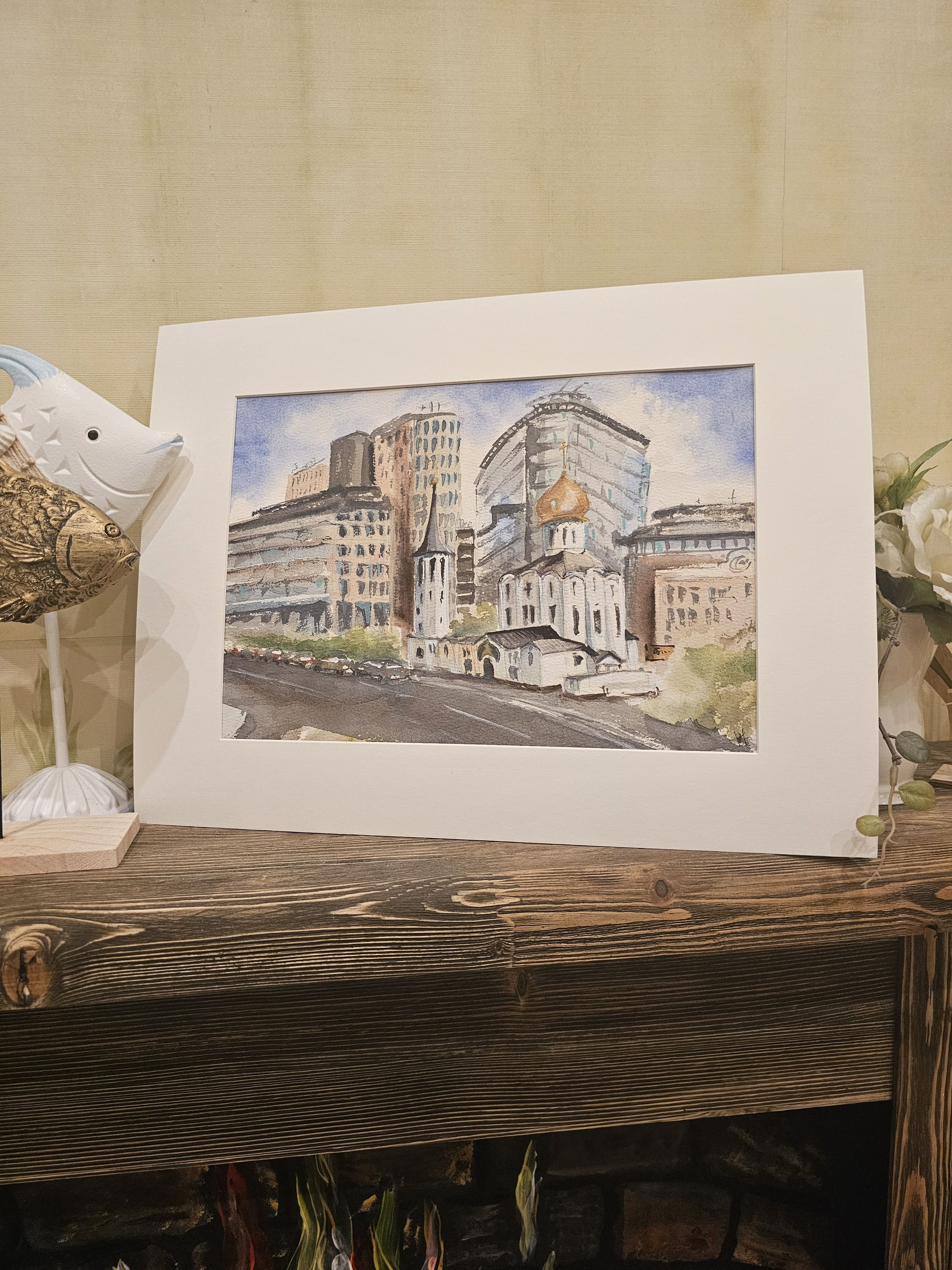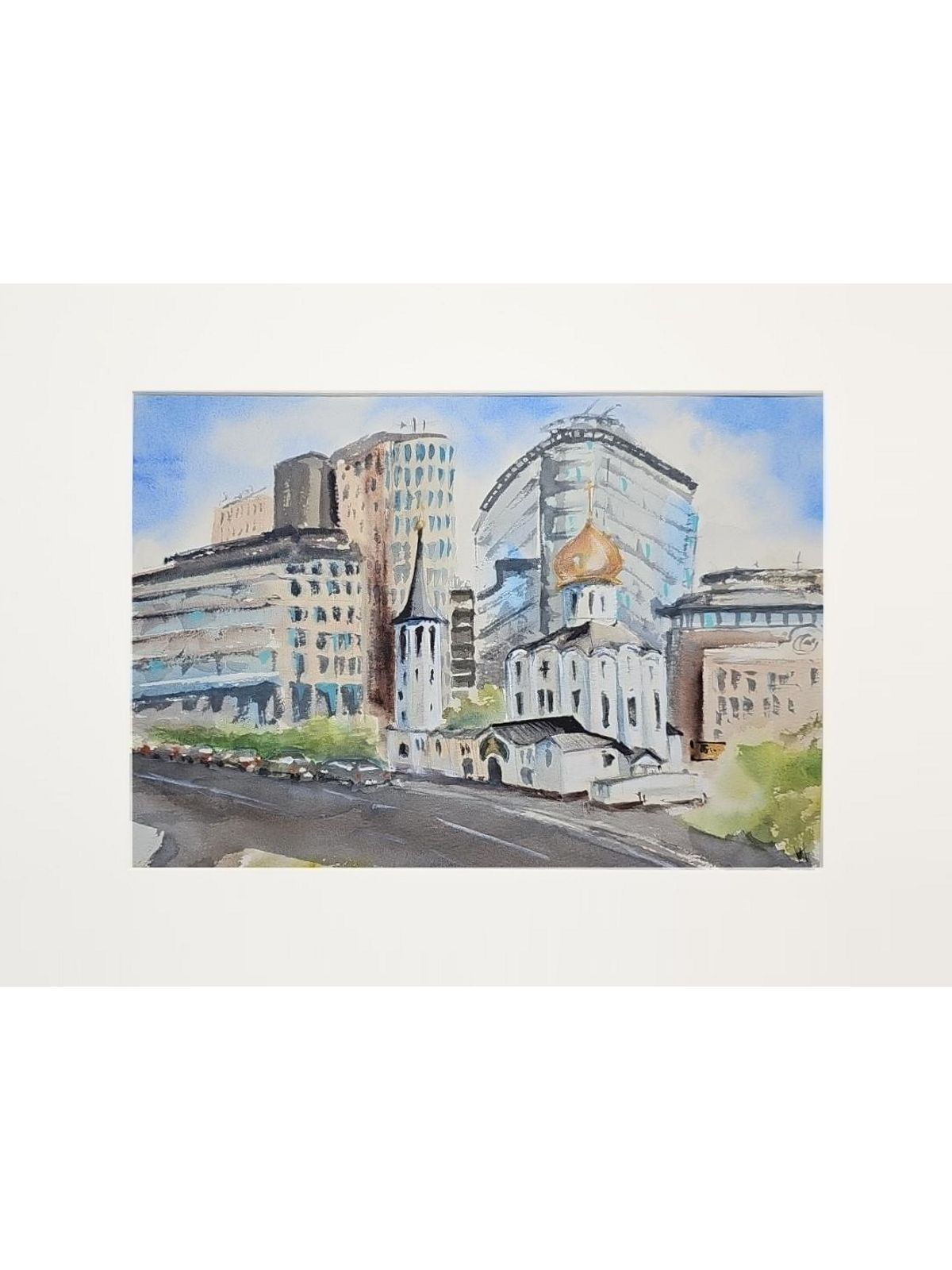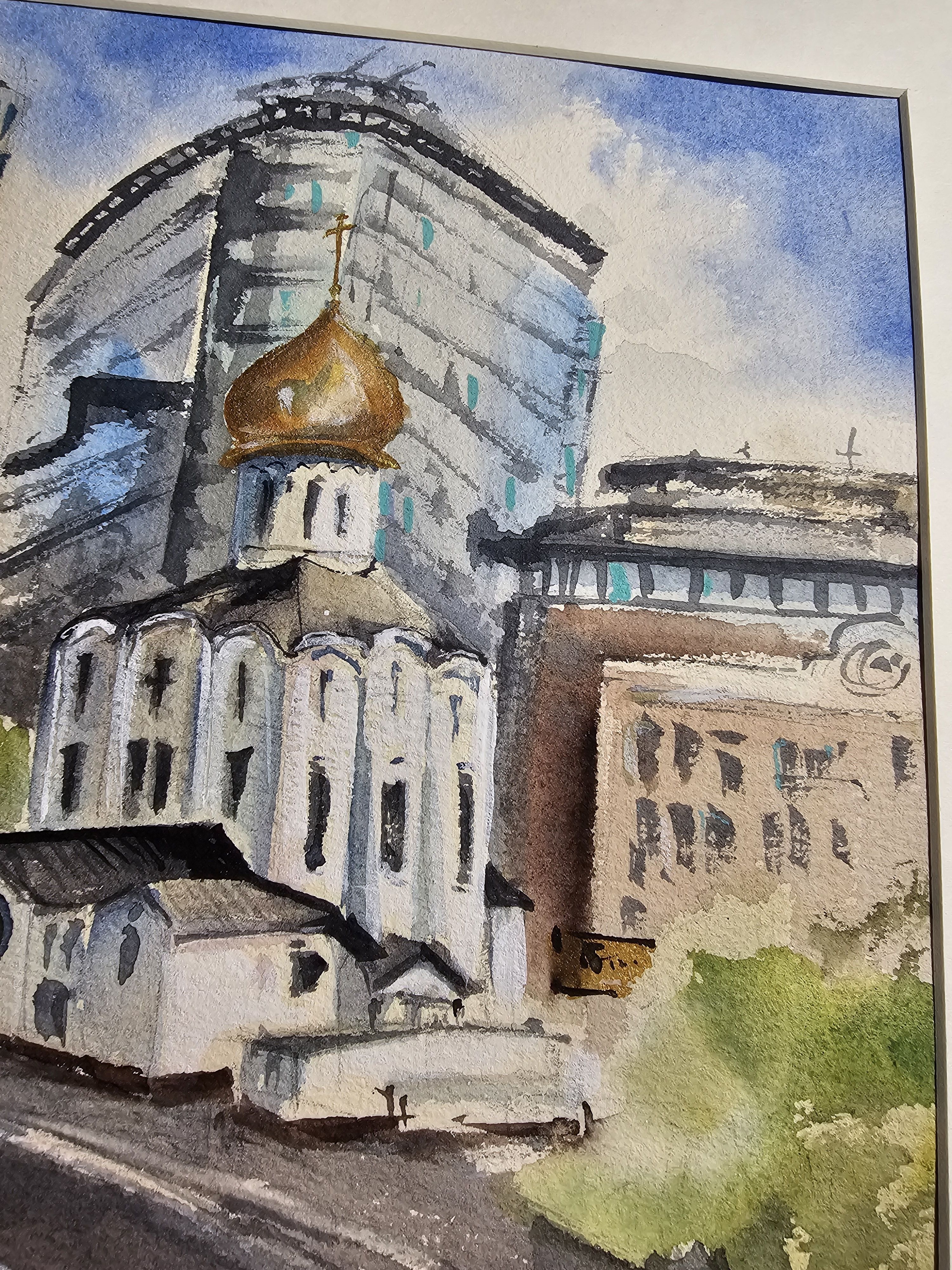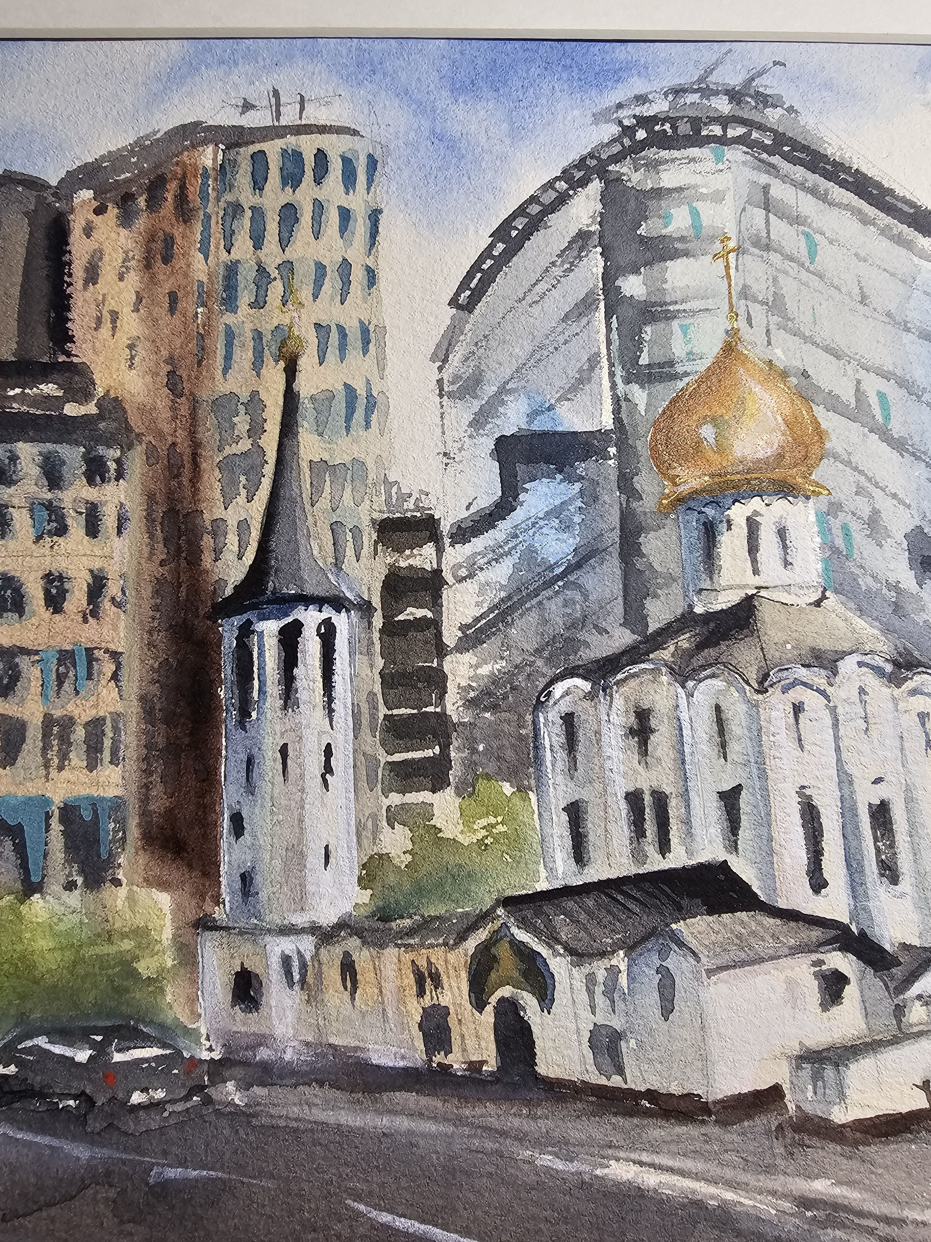 Нам представлена акварельная иллюстрация городского пейзажа. На переднем плане заметна дорога с движущимся транспортом. В центре картины изображён белый храм с золотым куполом, который выделяется на фоне современных многоэтажных зданий с остеклёнными фасадами. На заднем плане видны высокие офисные здания. Небо светлое, с лёгкими облаками. Атмосфера картины сочетает в себе элементы старинной архитектуры и современного городского пейзажа Белой площади в Москве.Работа оформлена в светлое паспарту и готова для размещения в раме стандартного размера.