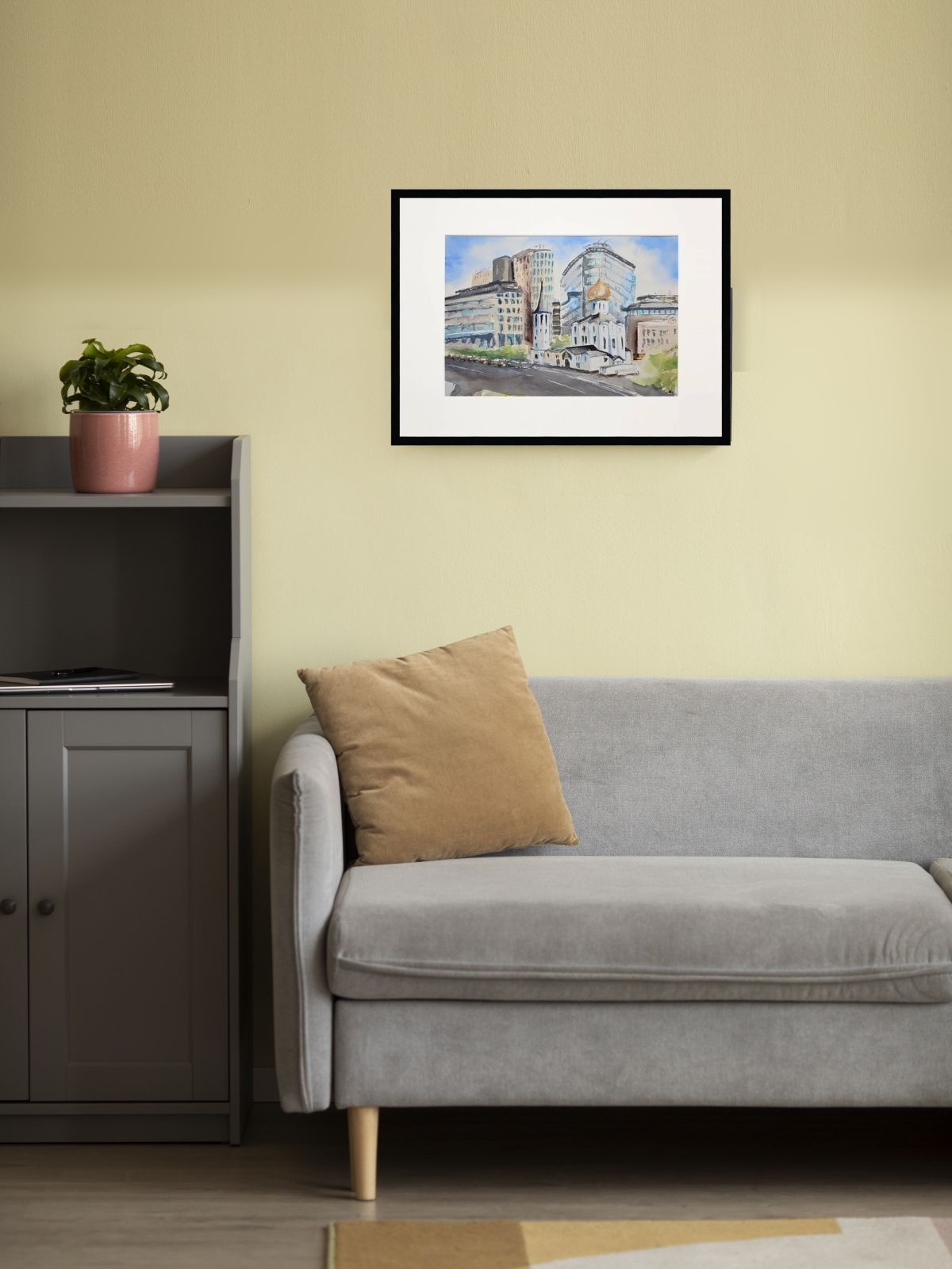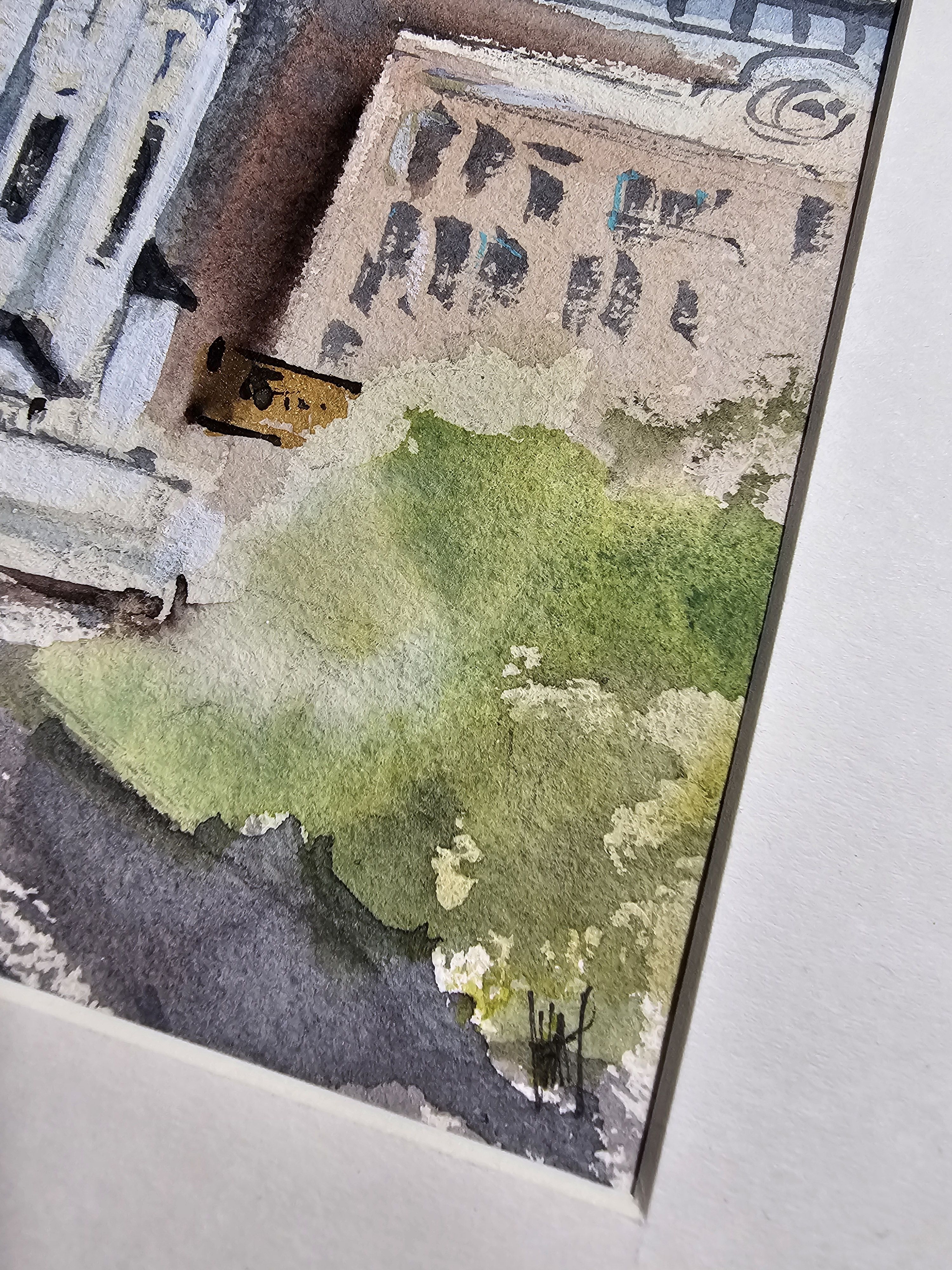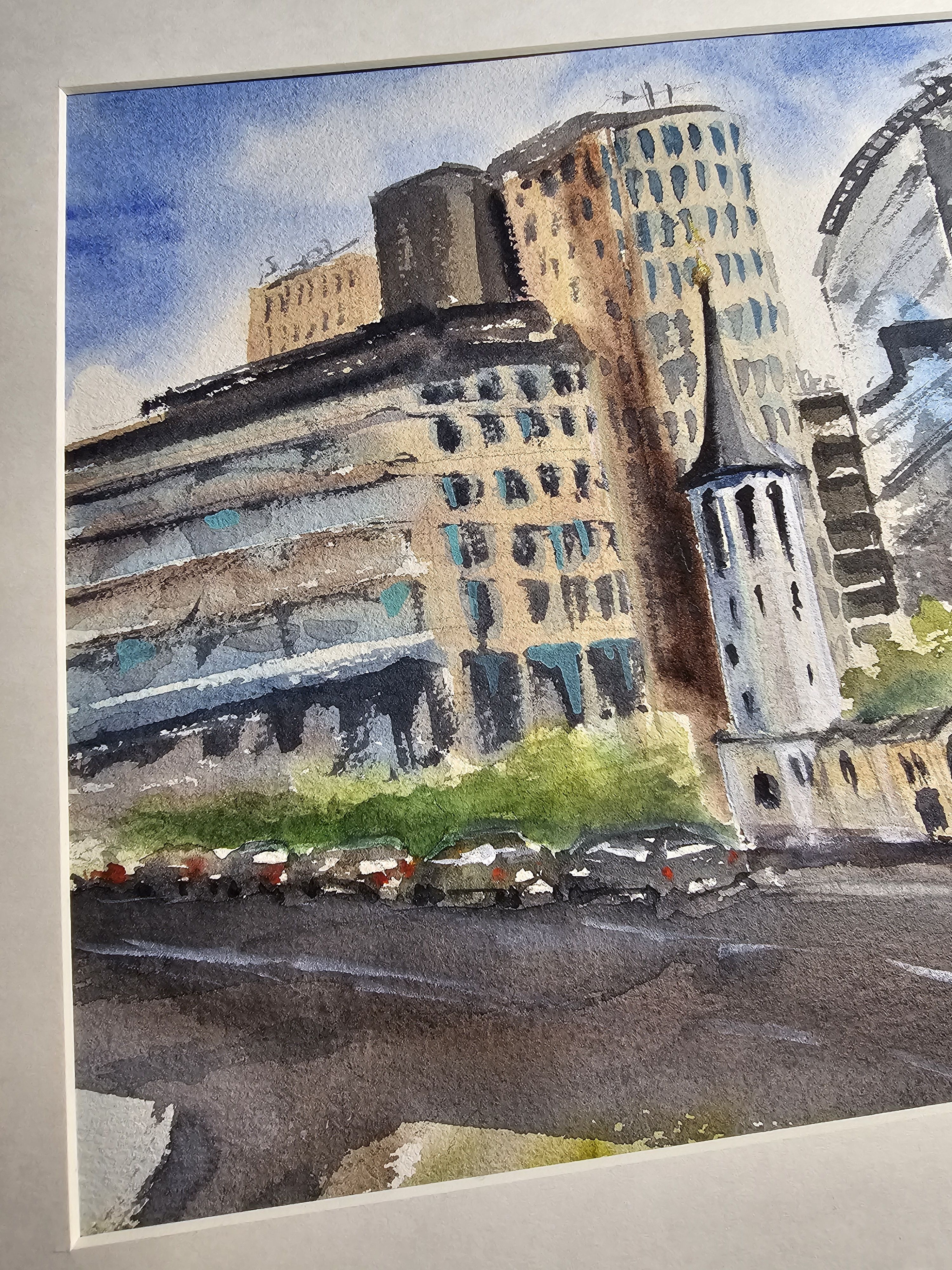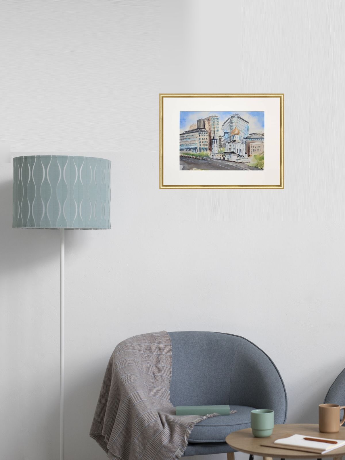 Нам представлена акварельная иллюстрация городского пейзажа. На переднем плане заметна дорога с движущимся транспортом. В центре картины изображён белый храм с золотым куполом, который выделяется на фоне современных многоэтажных зданий с остеклёнными фасадами. На заднем плане видны высокие офисные здания. Небо светлое, с лёгкими облаками. Атмосфера картины сочетает в себе элементы старинной архитектуры и современного городского пейзажа Белой площади в Москве.Работа оформлена в светлое паспарту и готова для размещения в раме стандартного размера.