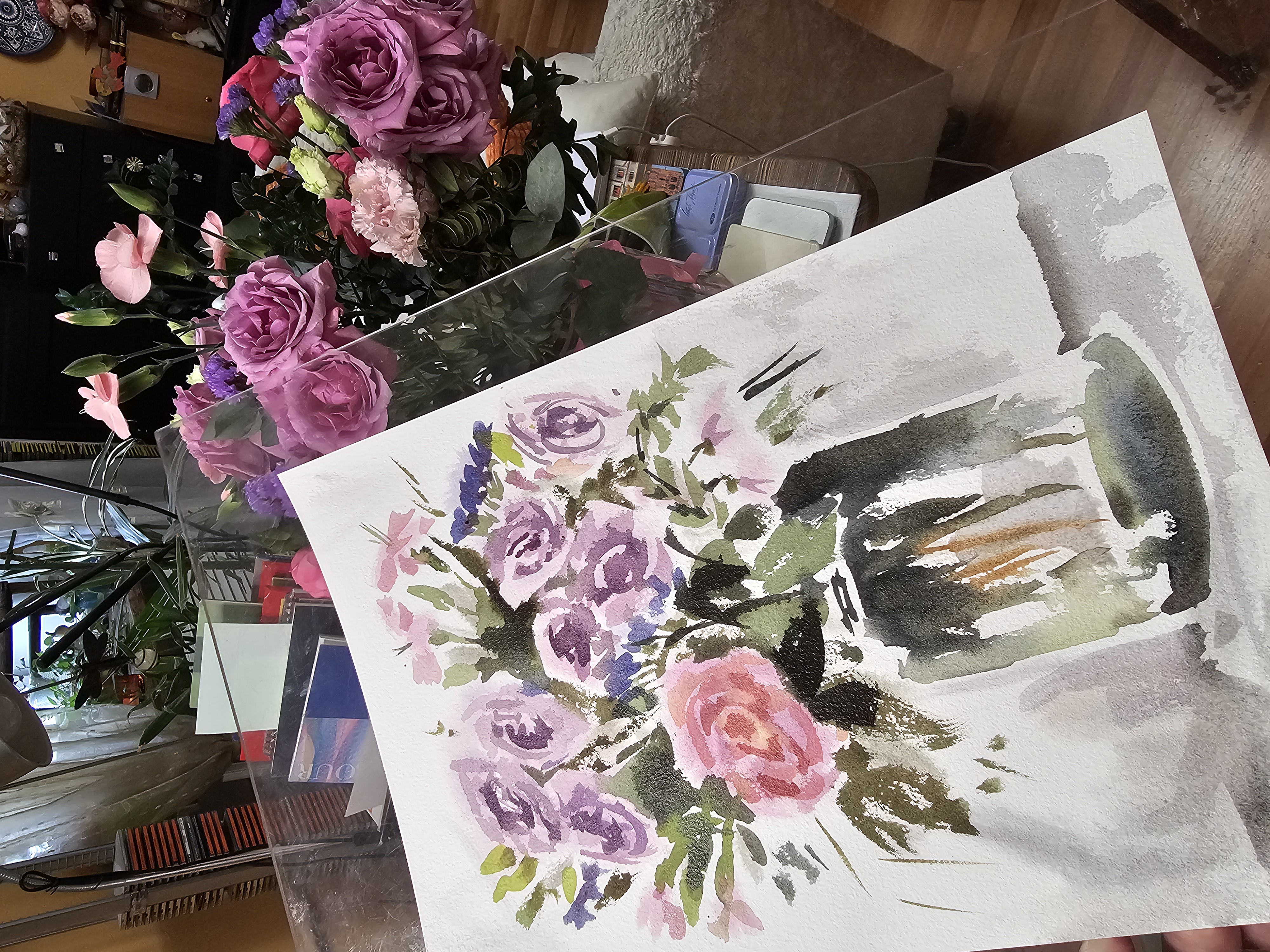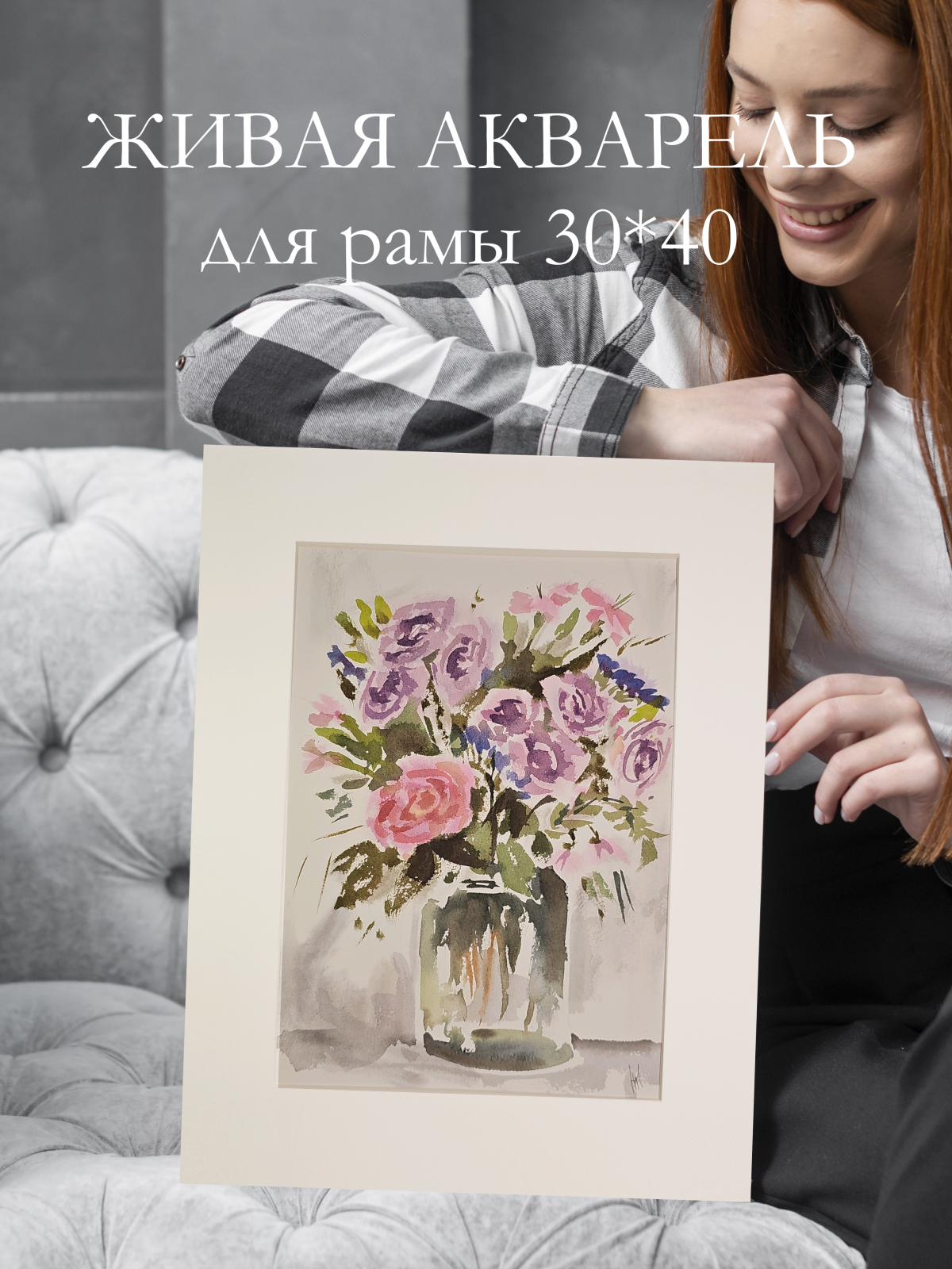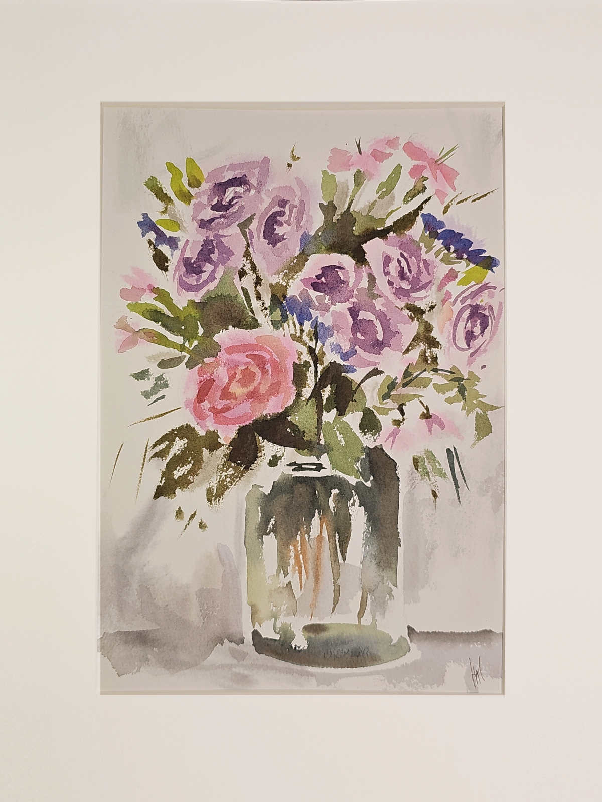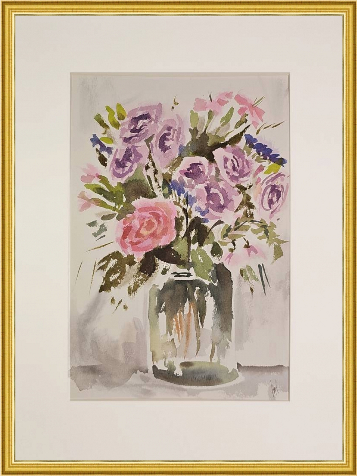 Нам представлена акварельная картина в технике А-ля прима, на которой изображен букет цветов в стеклянной вазе. В букете преобладают розовые и фиолетовые розы, гвоздики и другие цветы, окруженные зелеными листьями. Фон картины выполнен в светлых, нейтральных тонах, что подчеркивает яркость цветов. Работа оформлена в светлое паспарту и готова к размещению в стандартной раме 30*40 см.