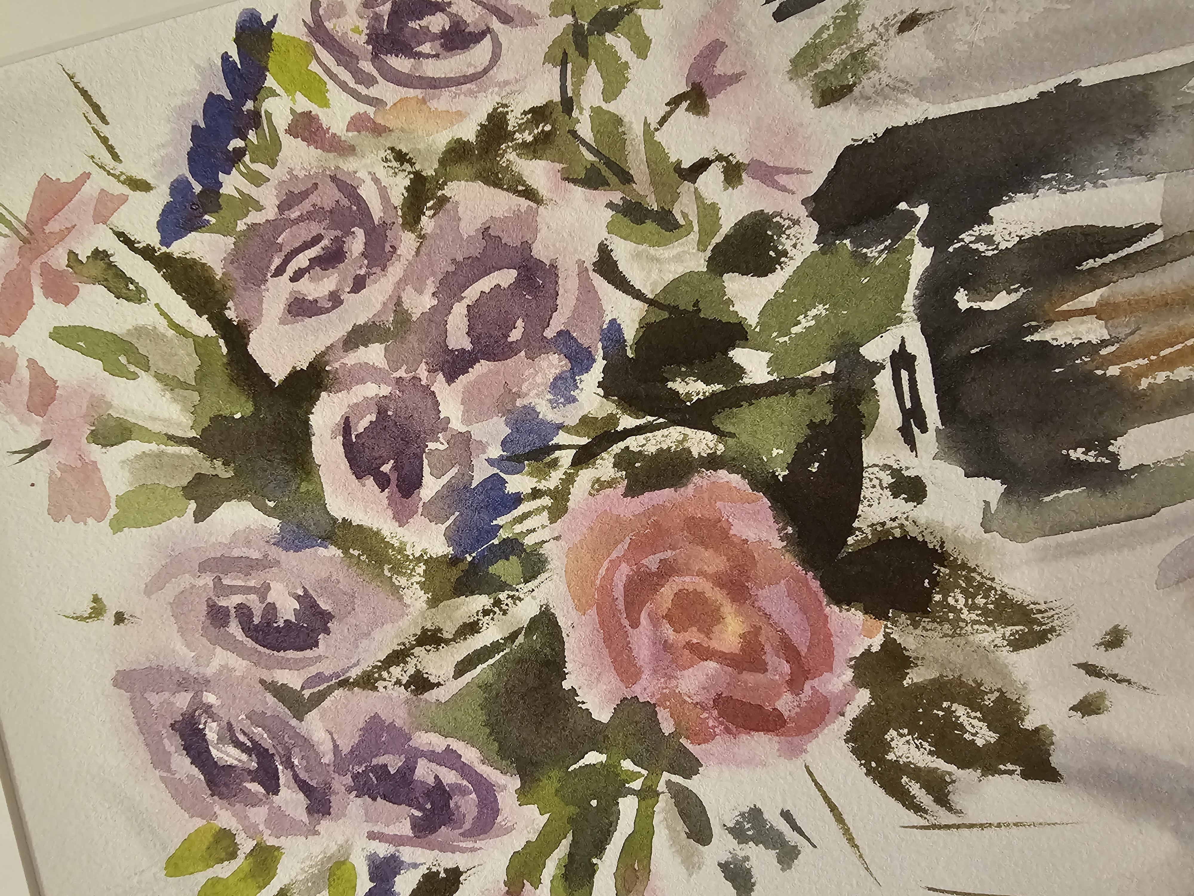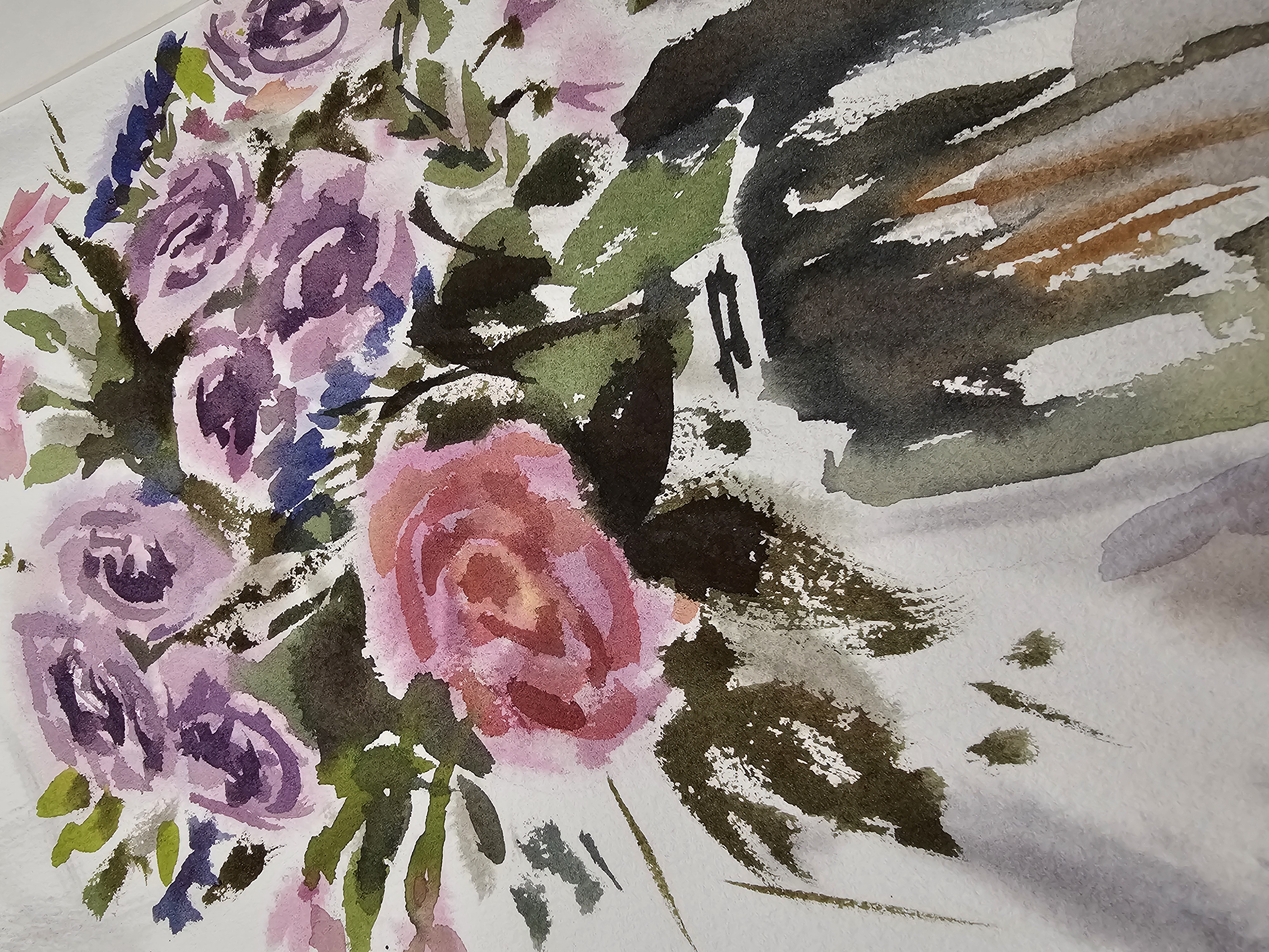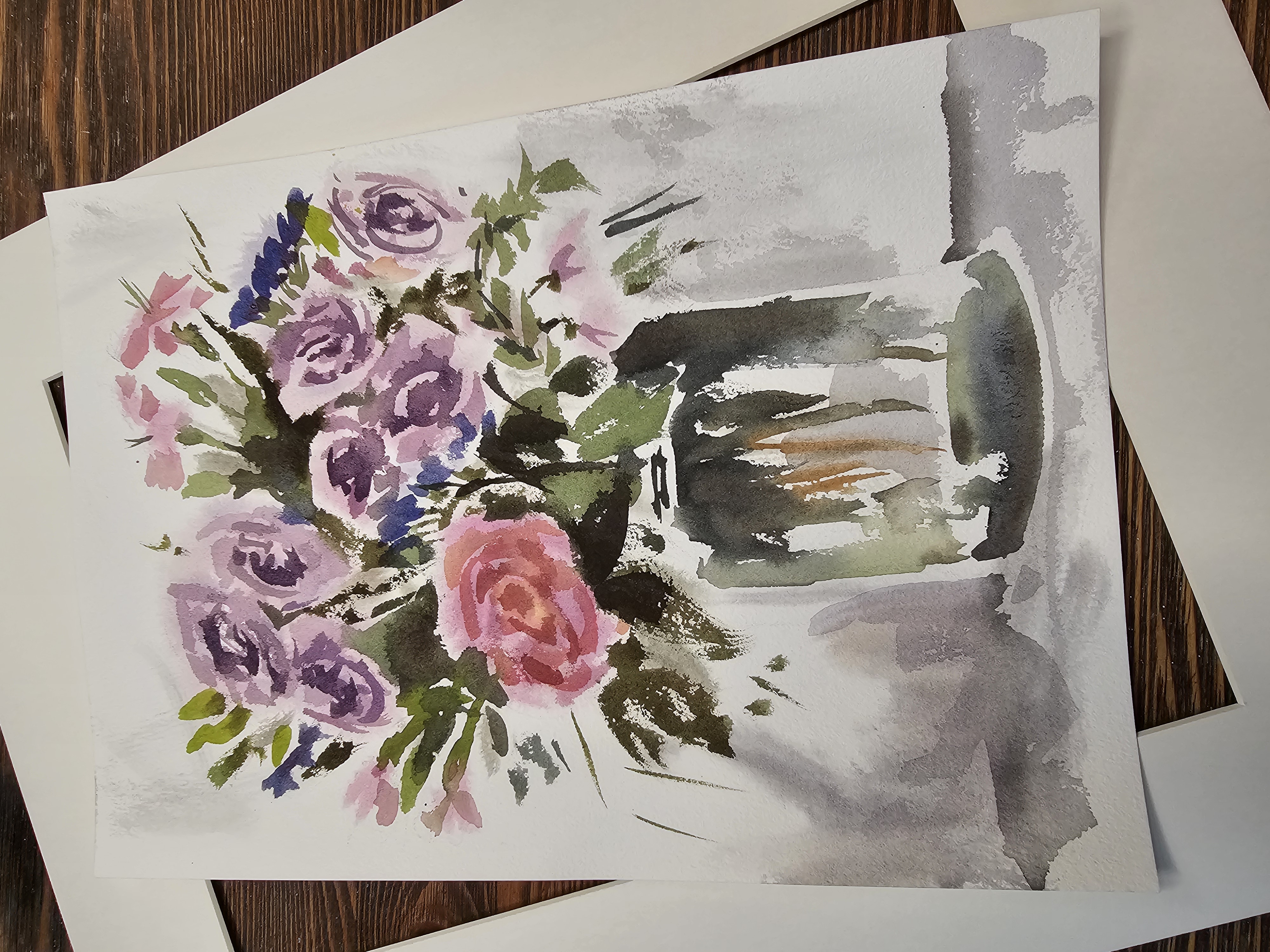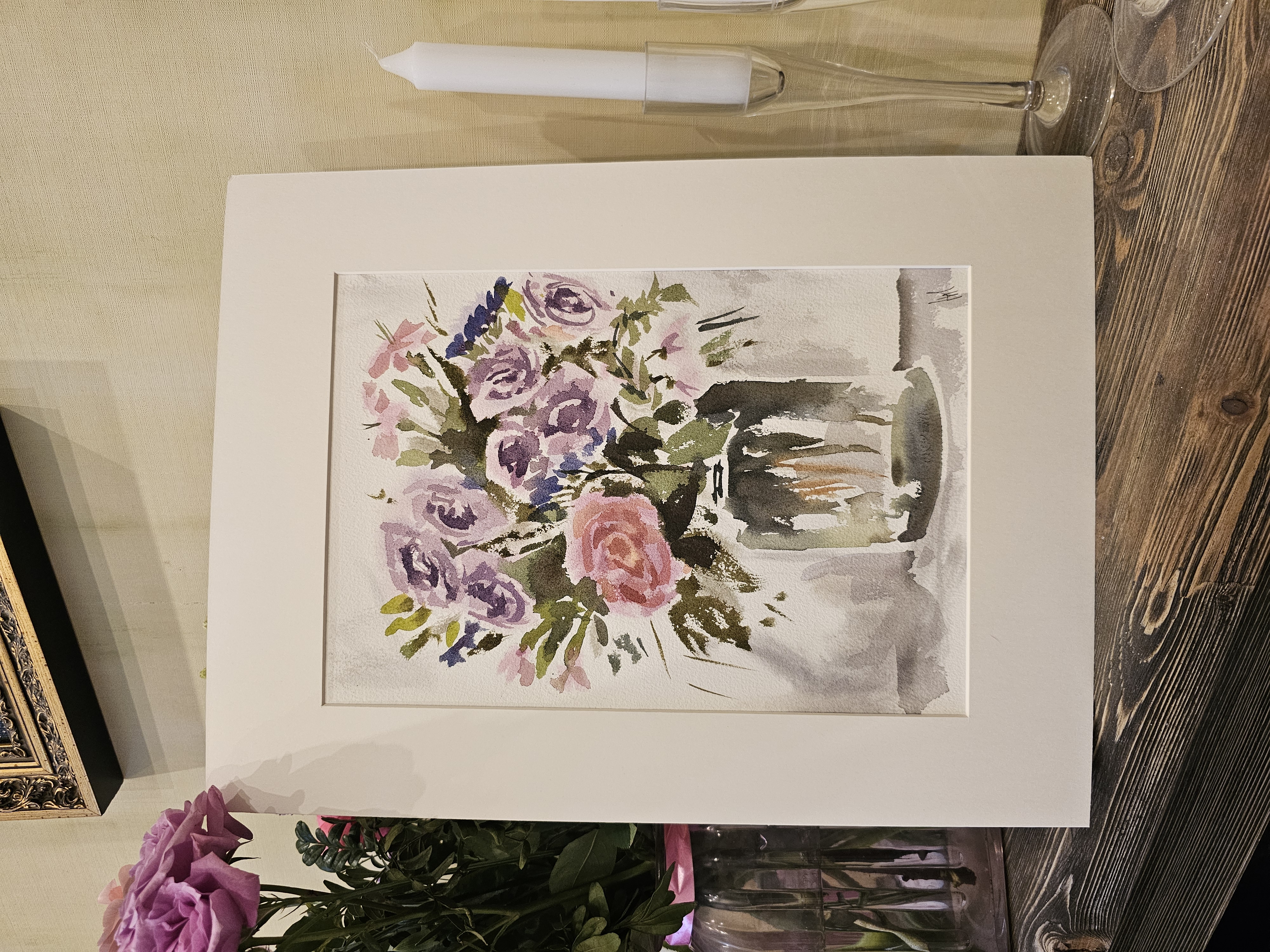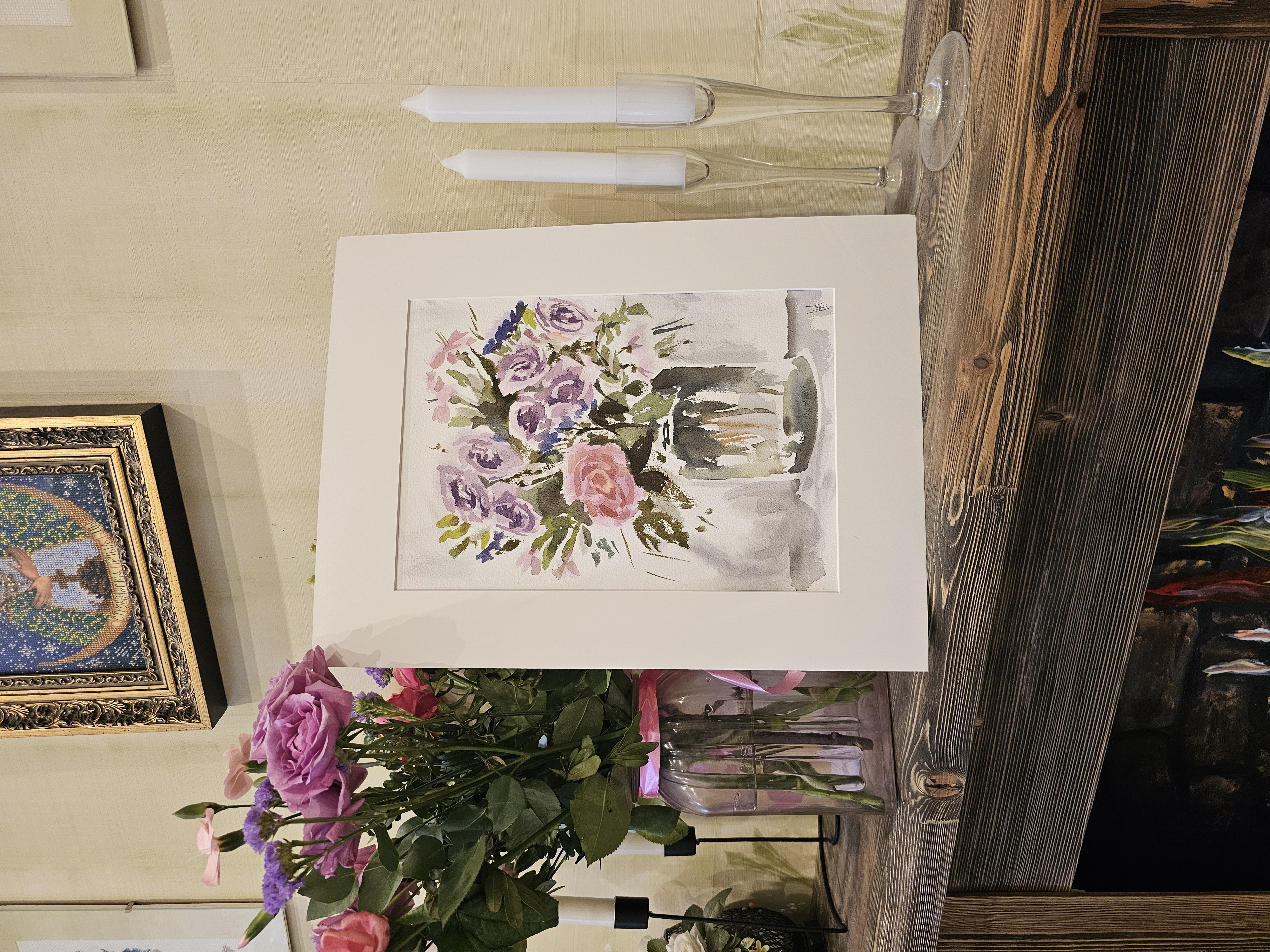 Нам представлена акварельная картина в технике А-ля прима, на которой изображен букет цветов в стеклянной вазе. В букете преобладают розовые и фиолетовые розы, гвоздики и другие цветы, окруженные зелеными листьями. Фон картины выполнен в светлых, нейтральных тонах, что подчеркивает яркость цветов. Работа оформлена в светлое паспарту и готова к размещению в стандартной раме 30*40 см.