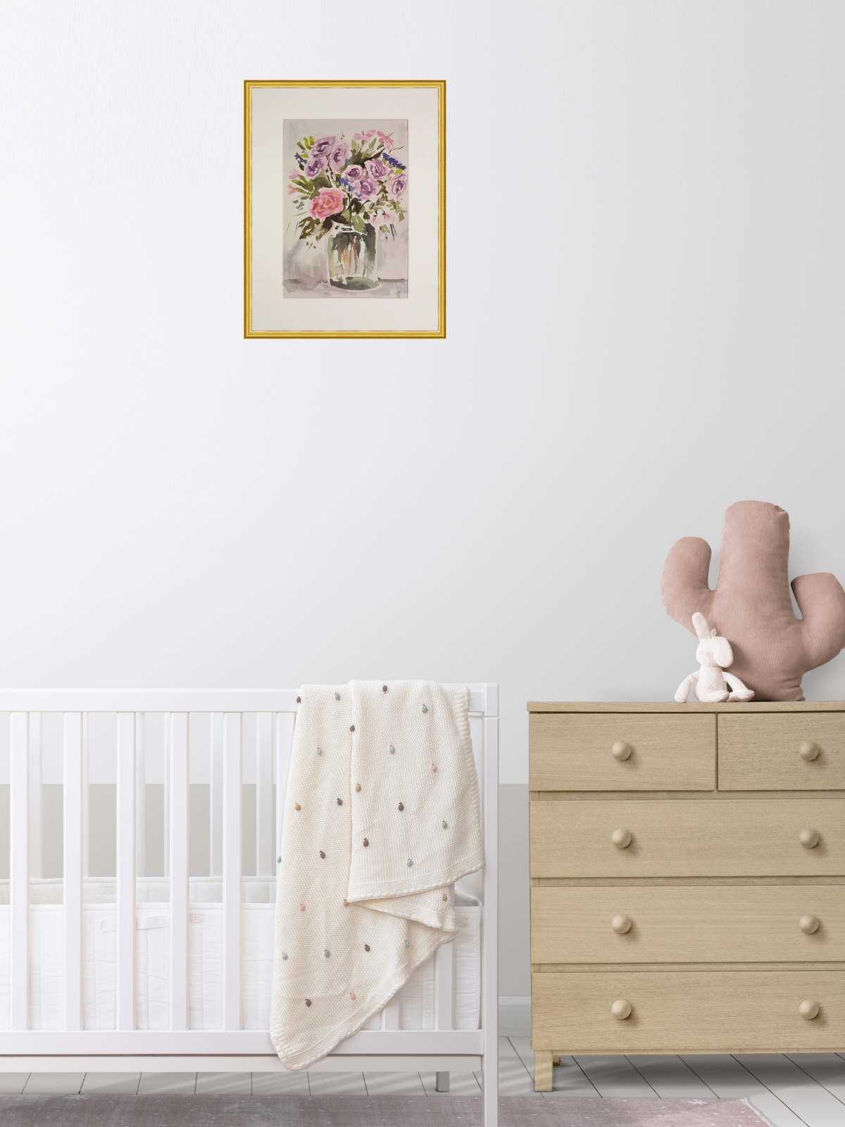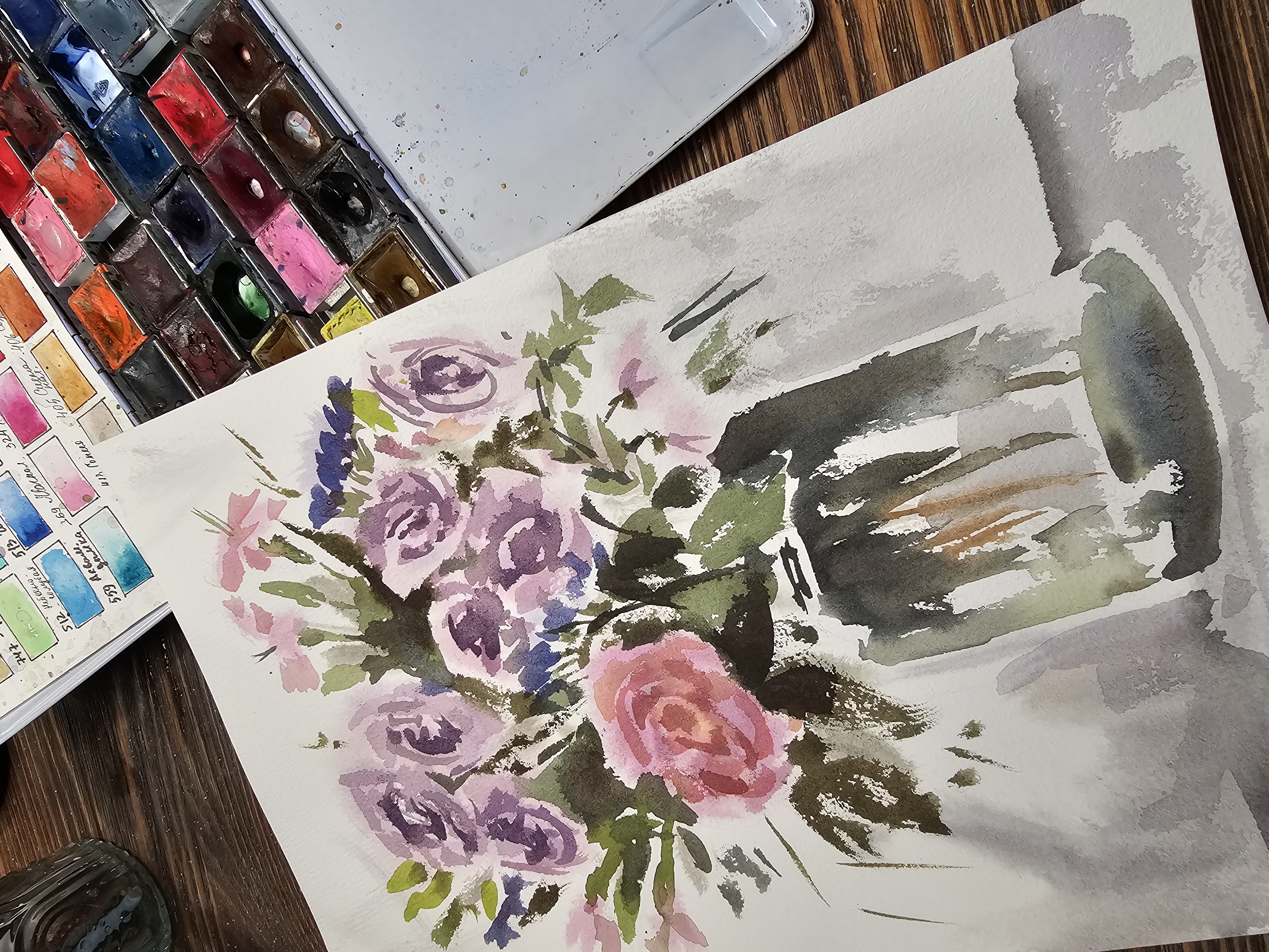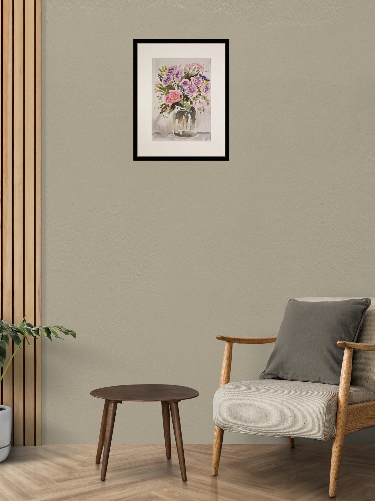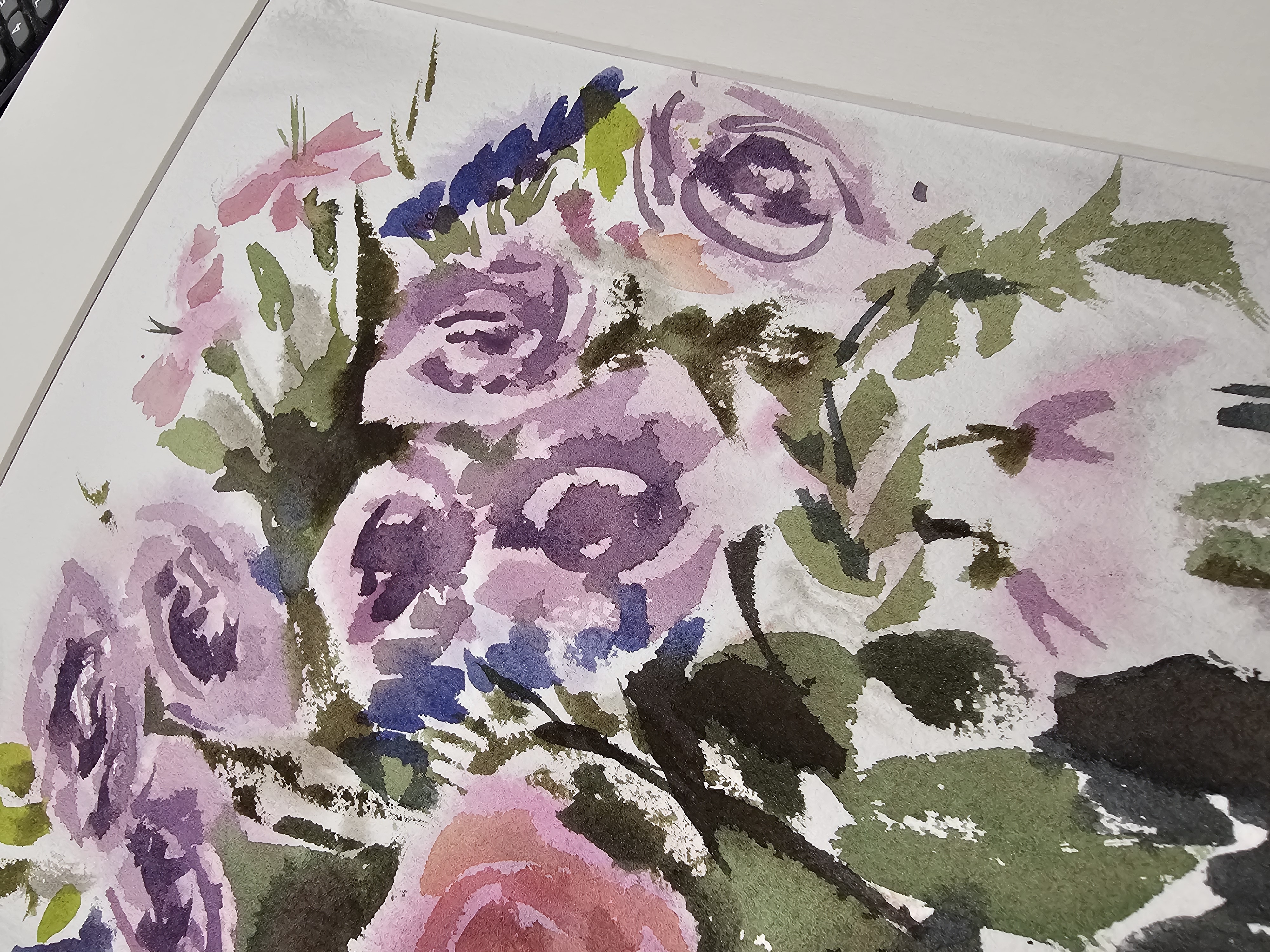 Нам представлена акварельная картина в технике А-ля прима, на которой изображен букет цветов в стеклянной вазе. В букете преобладают розовые и фиолетовые розы, гвоздики и другие цветы, окруженные зелеными листьями. Фон картины выполнен в светлых, нейтральных тонах, что подчеркивает яркость цветов. Работа оформлена в светлое паспарту и готова к размещению в стандартной раме 30*40 см.
