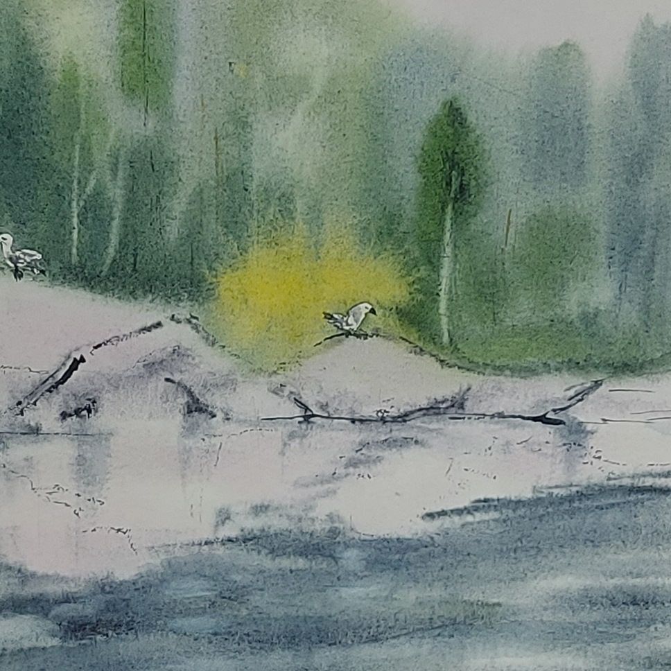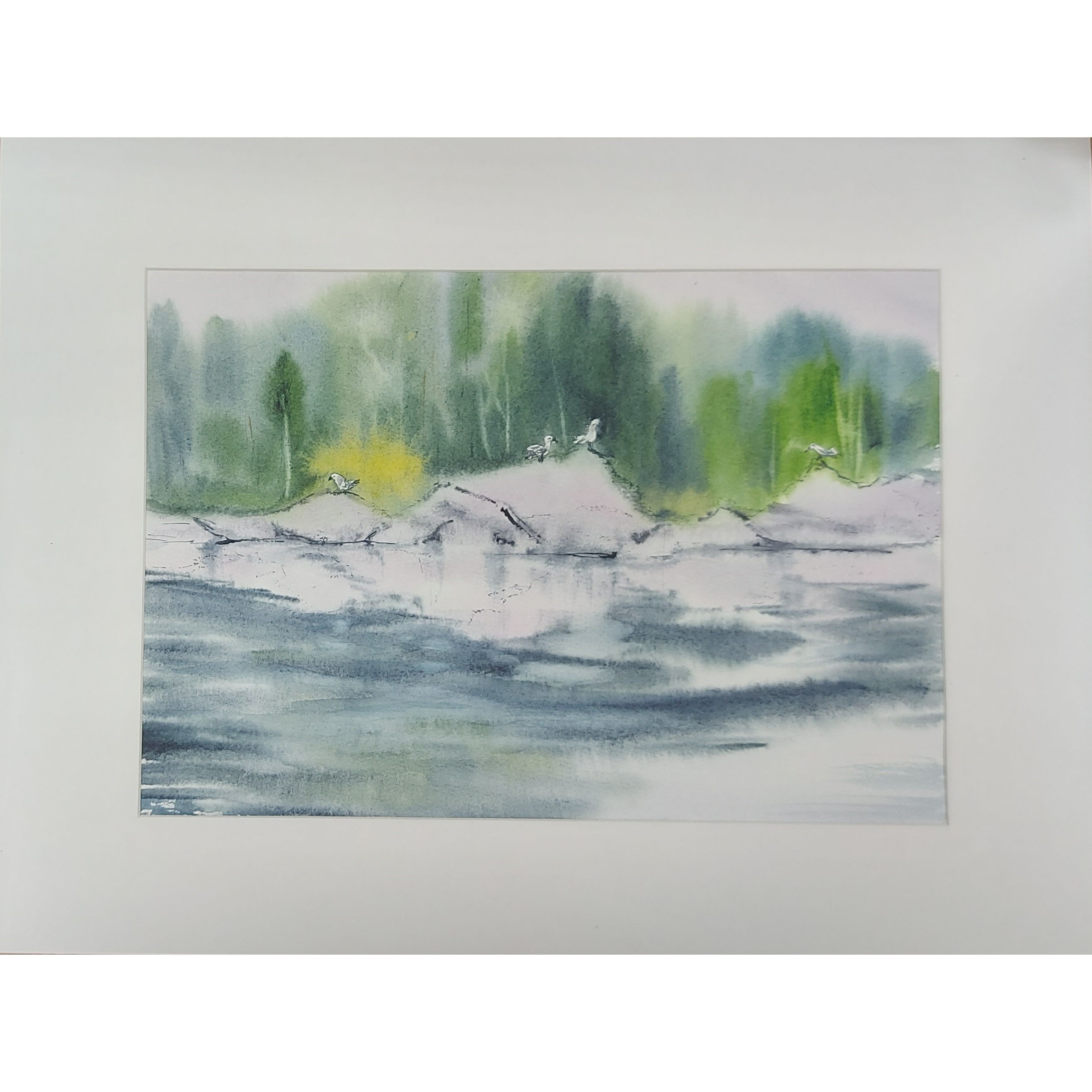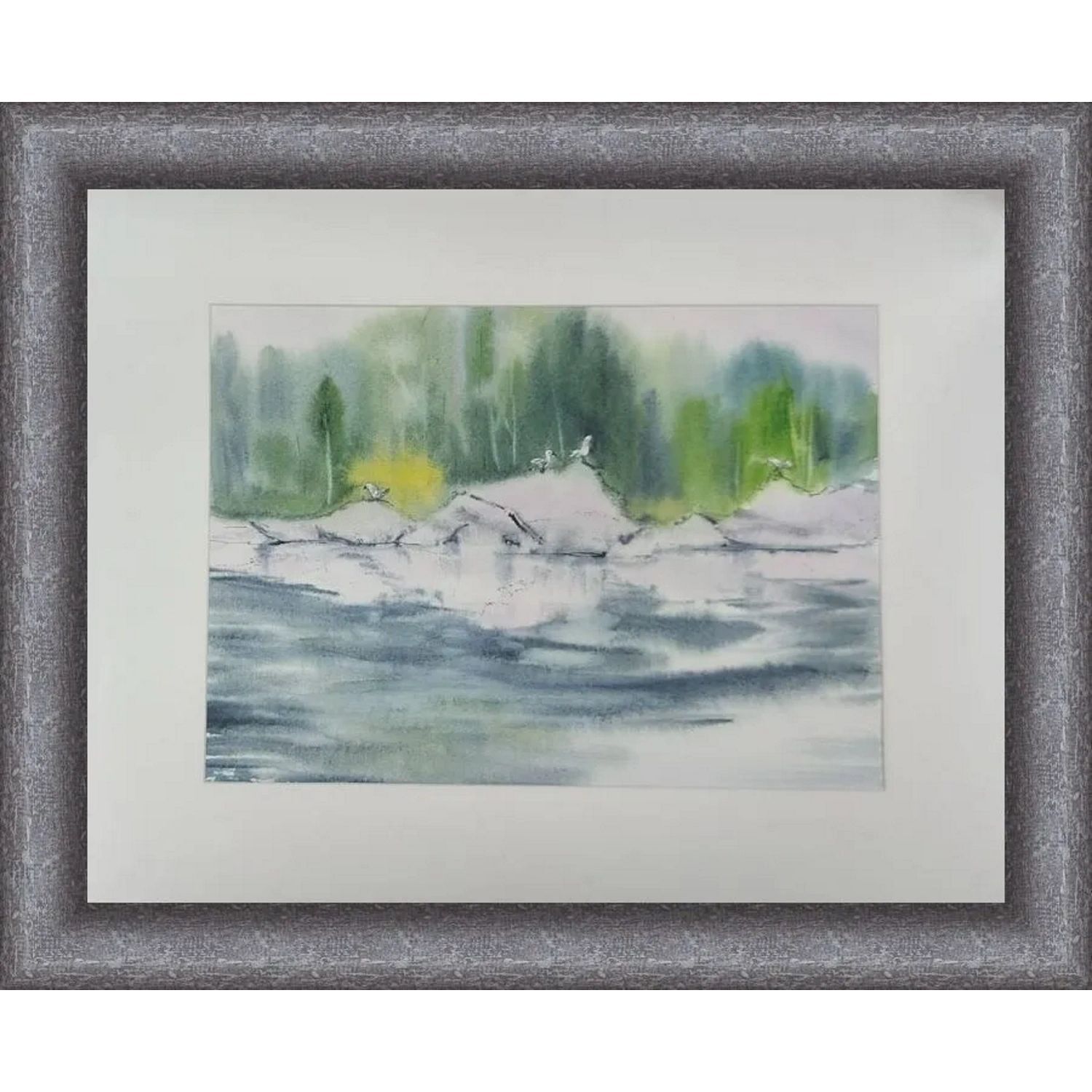 В центре картины находится темно-синяя водная поверхность, возможно озеро или река, с мягкими отражениями и бликами. На переднем плане грубые очертания каменистого берега, выполненного серыми и белыми цветами. На валунах отдыхаю чайки. На ними полоса земли с зеленой растительностью. Желтые вкрапления могут быть кустарниками или мелкими деревьями.