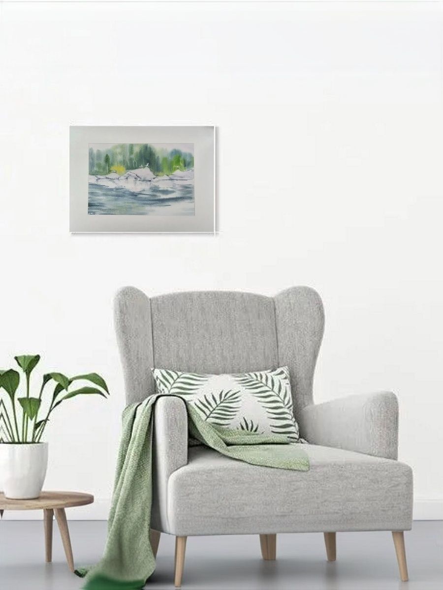 На заднем плане изображены высокие, стройные деревья в различных оттенках зеленого, создающие глубину и перспективу сцены. Мягкий переход оттенков зеленого указывает на то, что автор работы стремился передать обилие зелени и пышность растительности. Стиль изображения немного абстрактен и импрессионистски волшебен, линии и формы нечеткие, что создает мечтательное и немного туманное настроение.