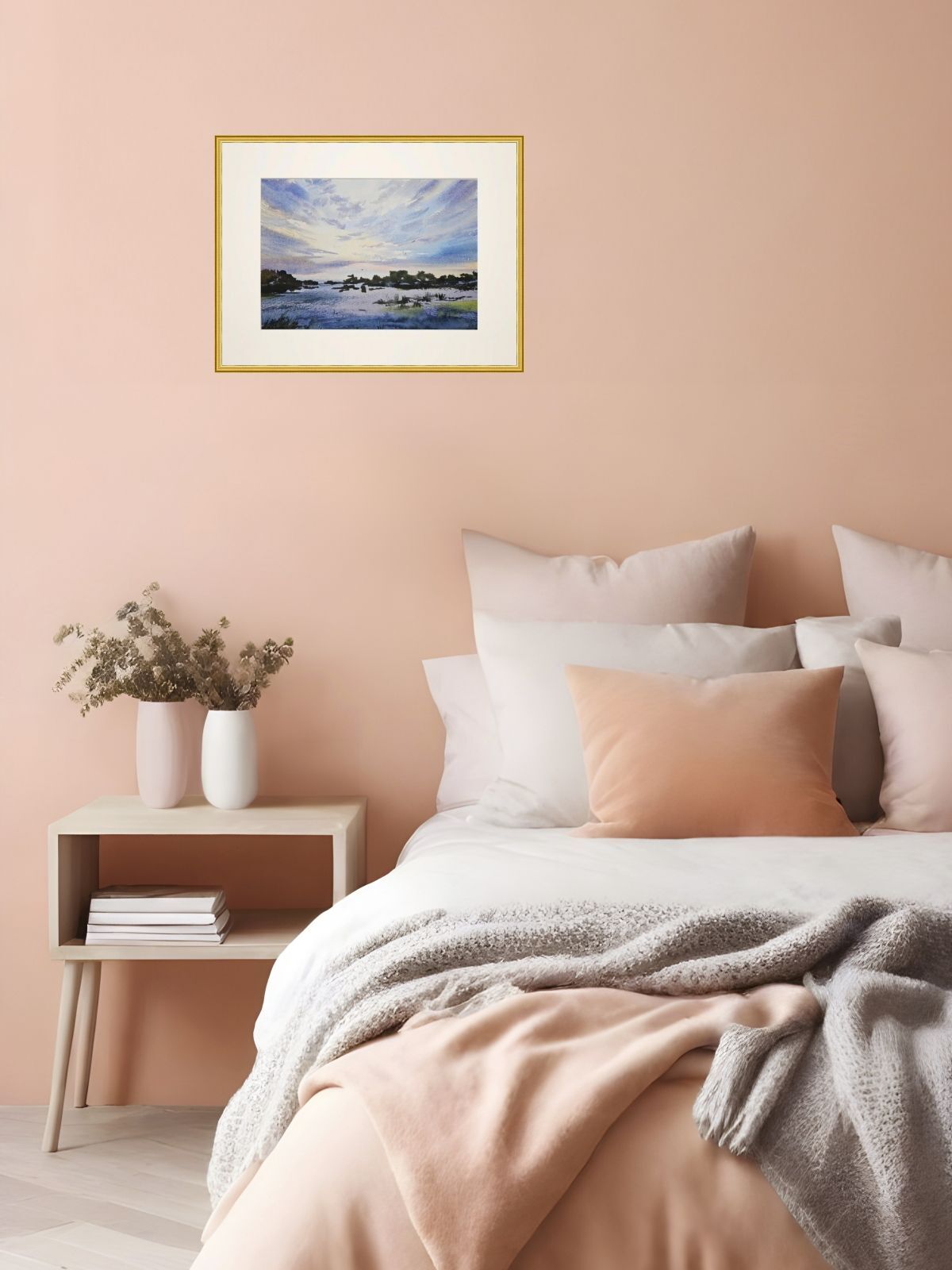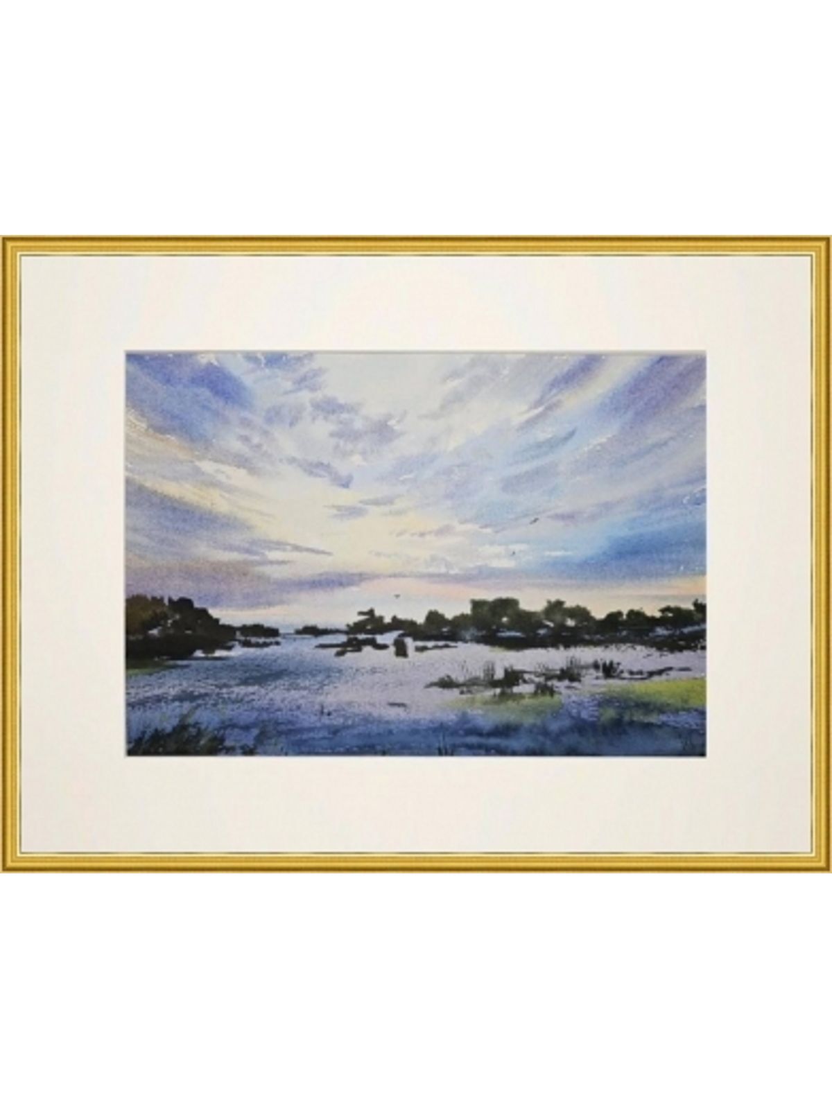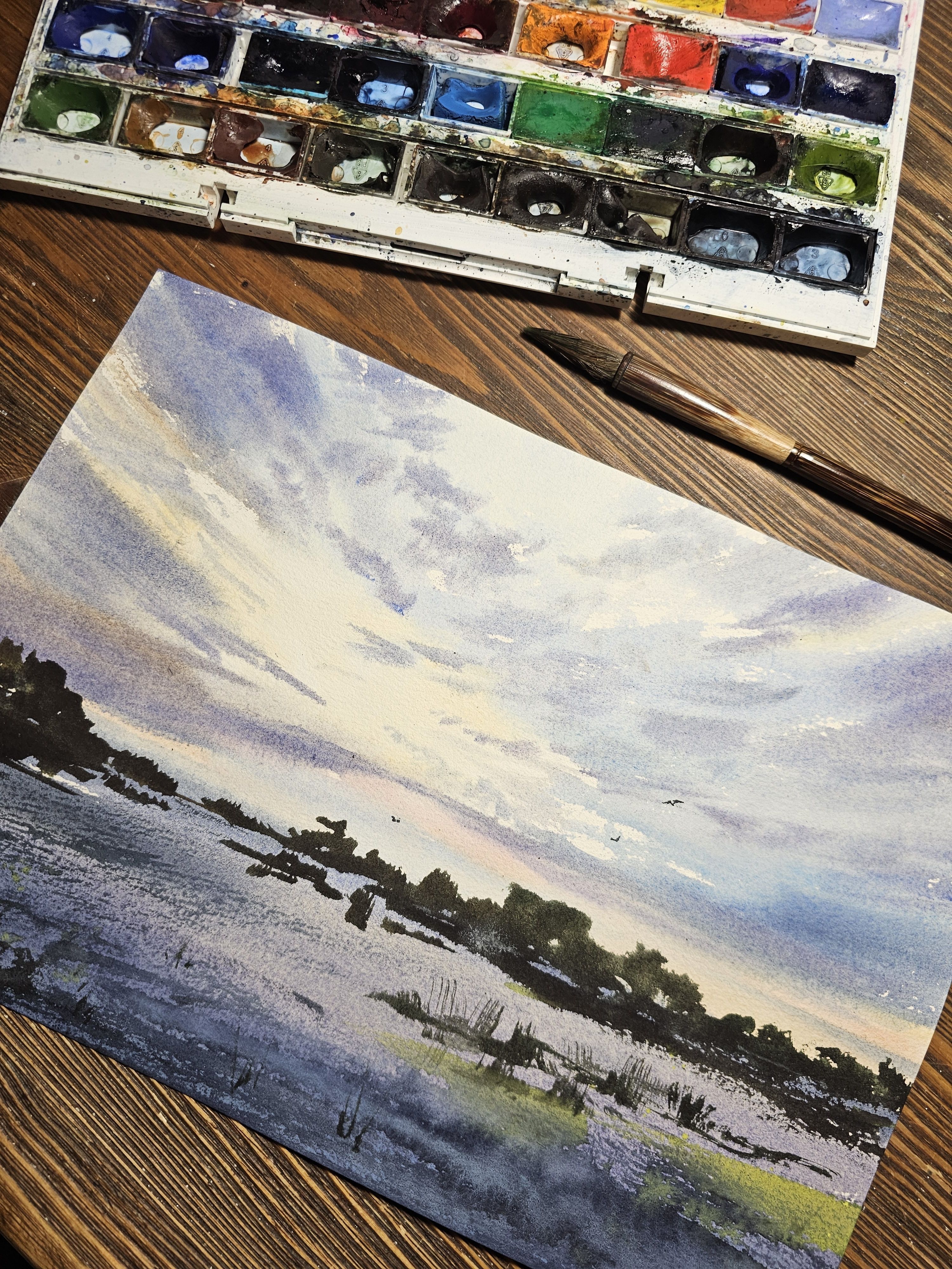 Нам представлена акварельная картина с пейзажем. На переднем плане видно водоем, возможно, реку или озеро, с отражениями в воде. По сторонам расположена растительность, такая как кусты или небольшие деревья. На заднем плане виден небо с облаками, окрашенное в нежные голубые и светлые оттенки. Вся картина выполнена в спокойных тонах, создавая атмосферу умиротворения и гармонии.