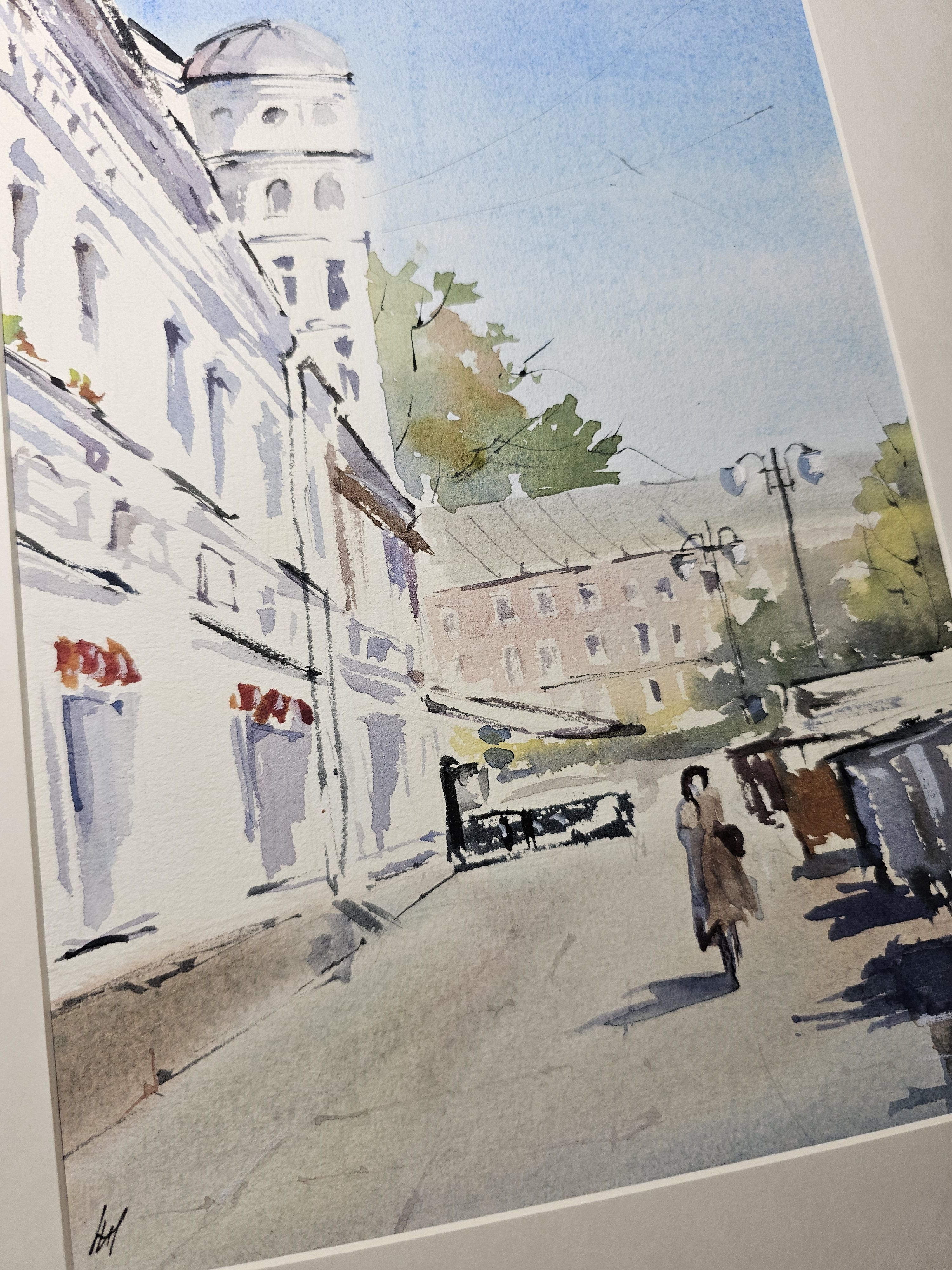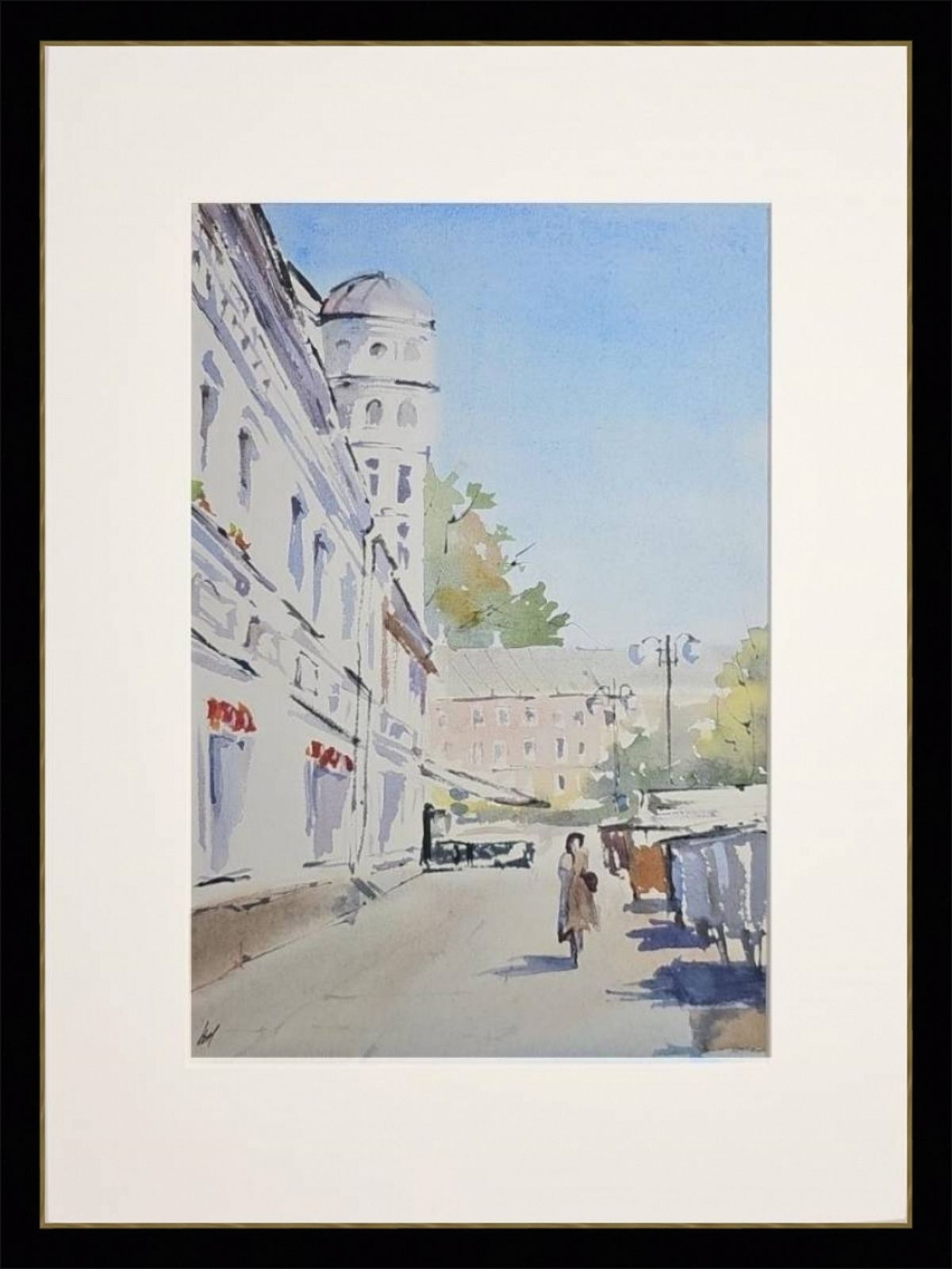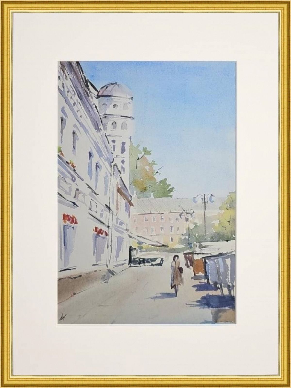 Нам представлен акварельный городской пейзаж. На переднем плане нарисована улица с тротуаром, по которой идут люди. Слева изображено здание с декоративной архитектурой и башенкой. Справа виден ряд торговых палаток или киосков. На заднем плане просматривается другое здание и небо, окрашенное в голубые оттенки. Картина передает атмосферу солнечного дня, подчеркнутую светлыми и мягкими цветами акварели. Работа оформлена в светлое паспарту и готова для размещения в раме стандартного размера.