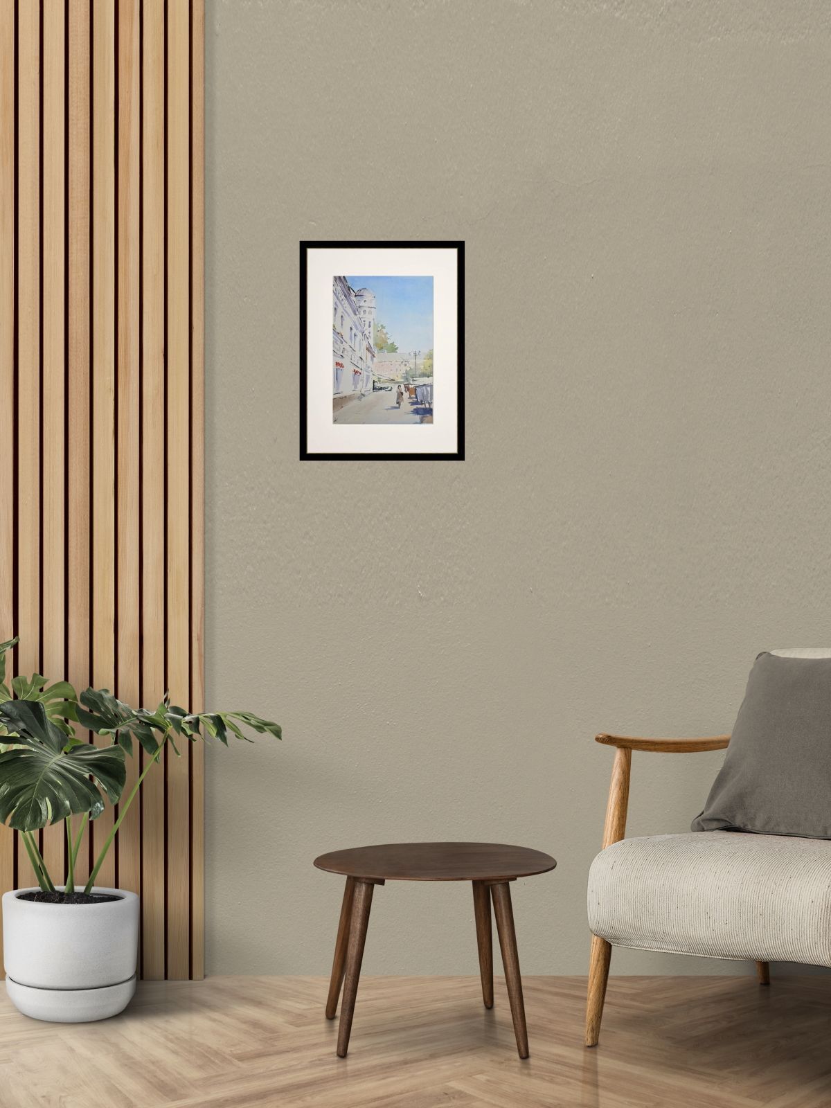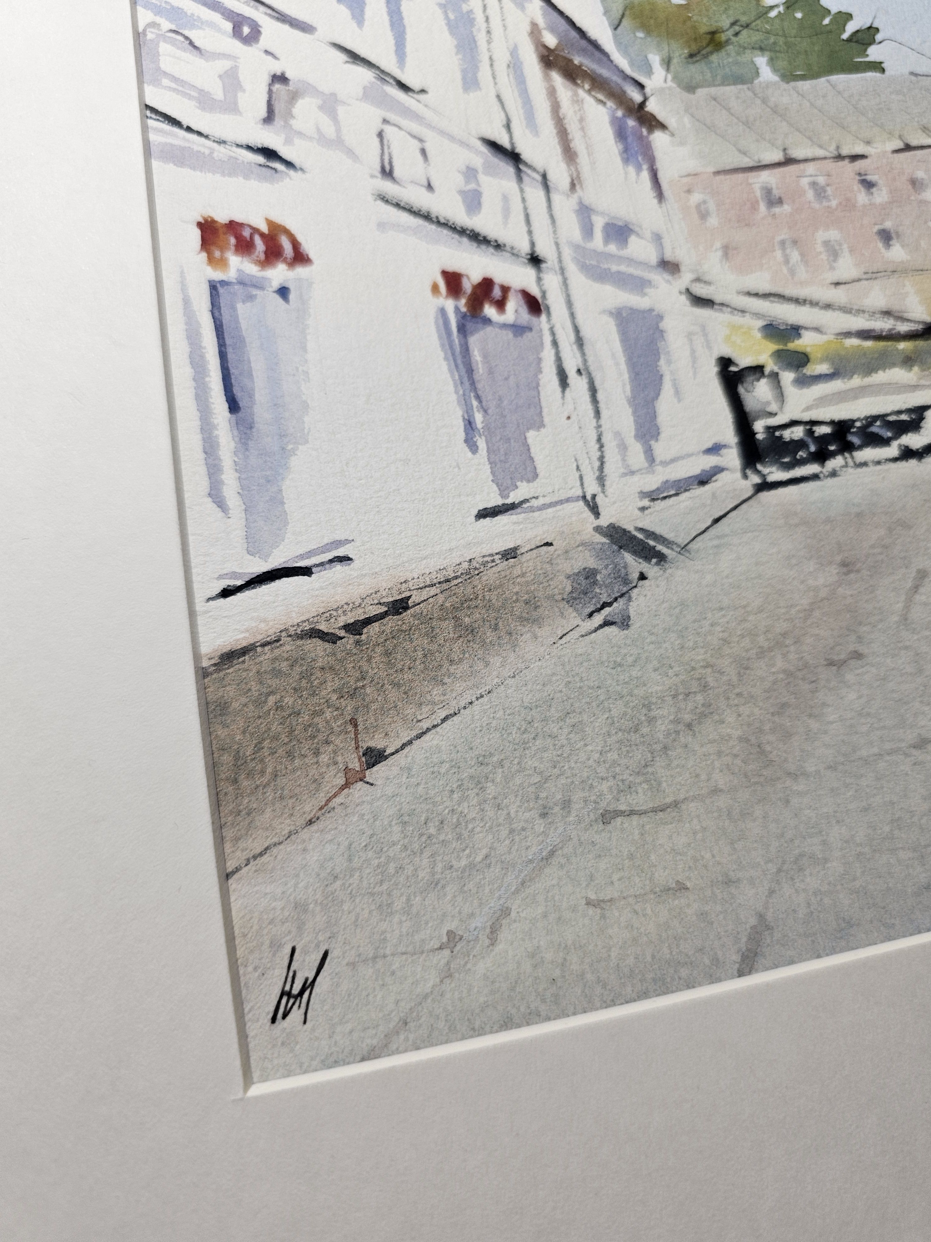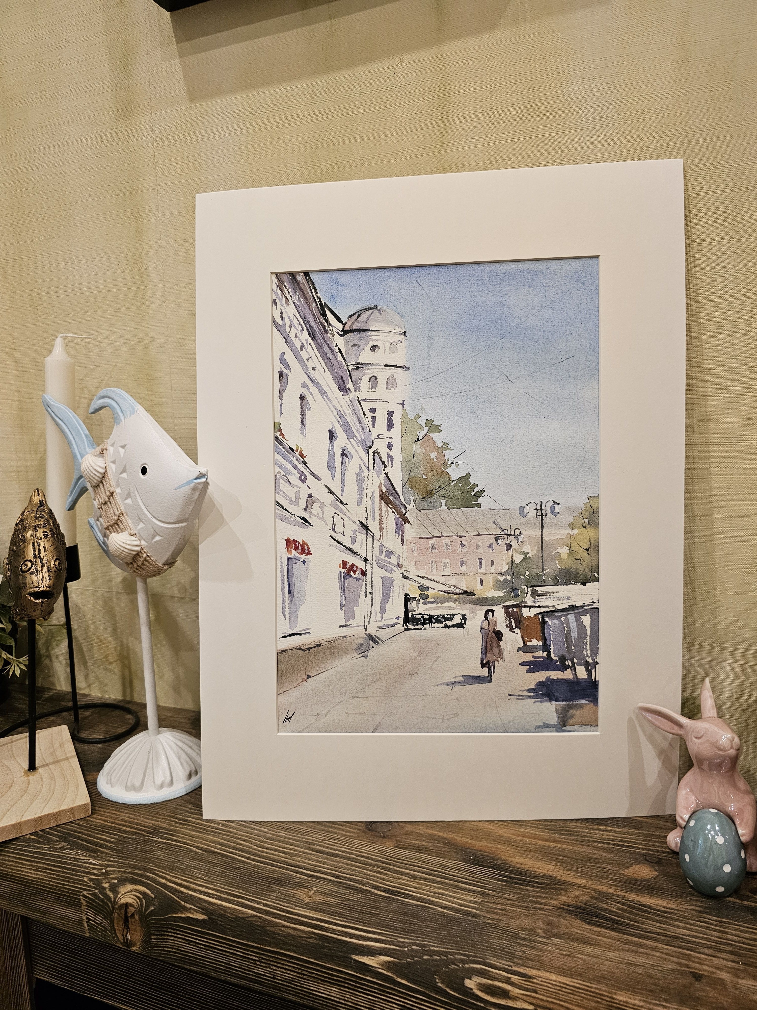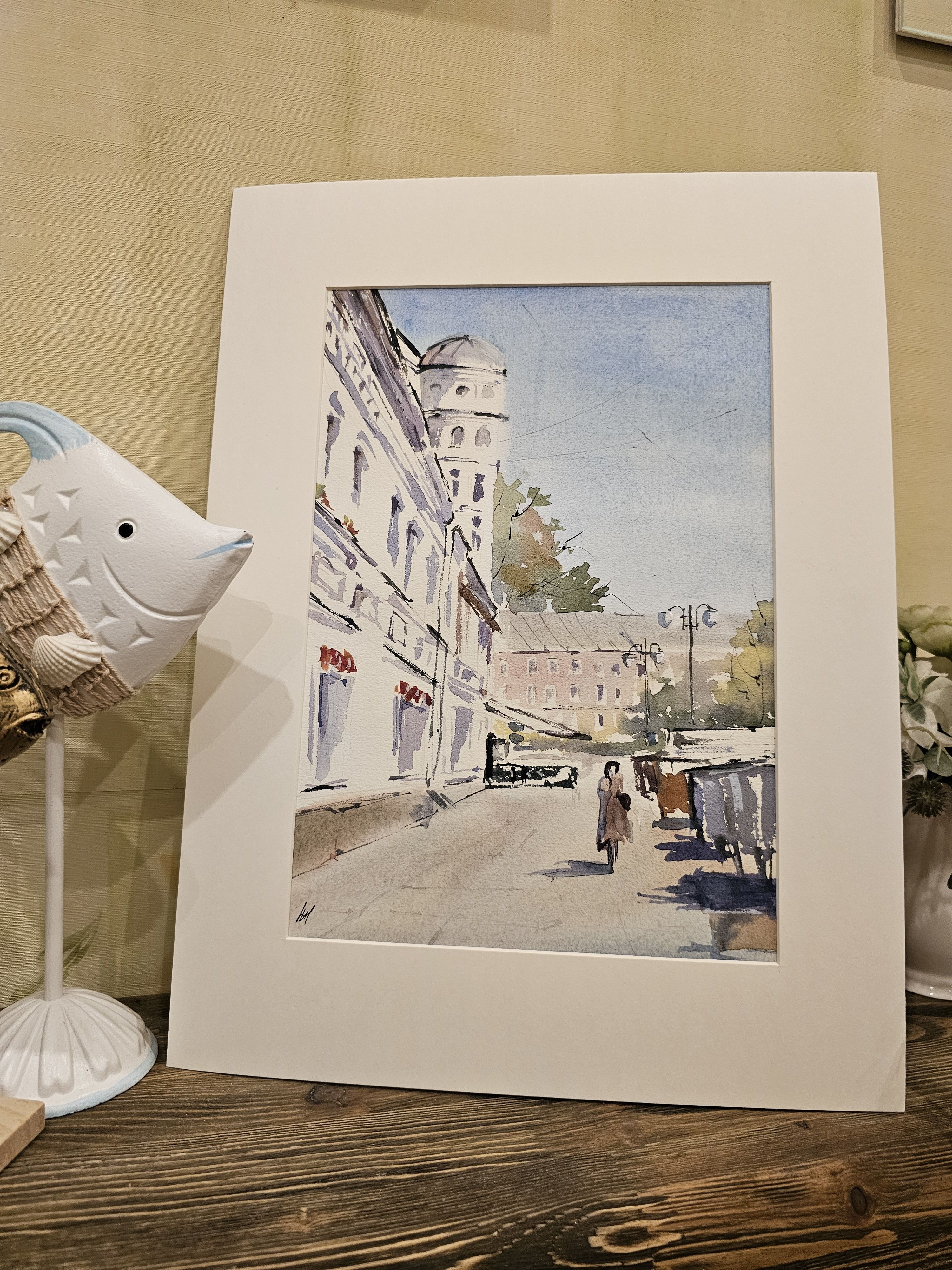 Нам представлен акварельный городской пейзаж. На переднем плане нарисована улица с тротуаром, по которой идут люди. Слева изображено здание с декоративной архитектурой и башенкой. Справа виден ряд торговых палаток или киосков. На заднем плане просматривается другое здание и небо, окрашенное в голубые оттенки. Картина передает атмосферу солнечного дня, подчеркнутую светлыми и мягкими цветами акварели. Работа оформлена в светлое паспарту и готова для размещения в раме стандартного размера.