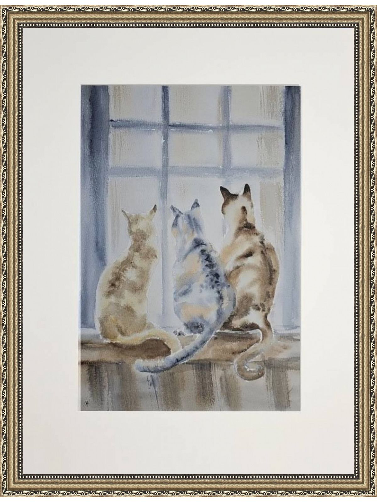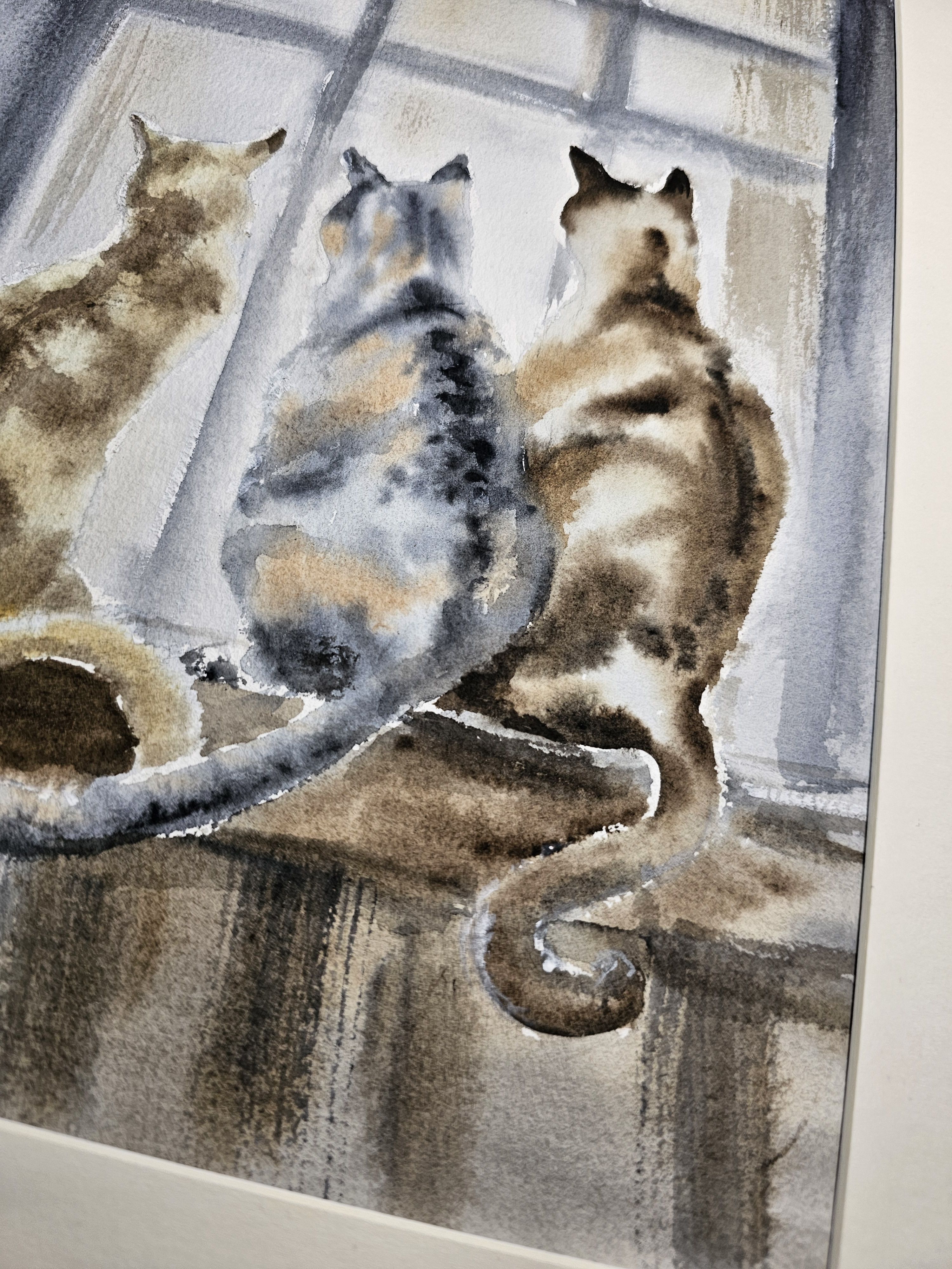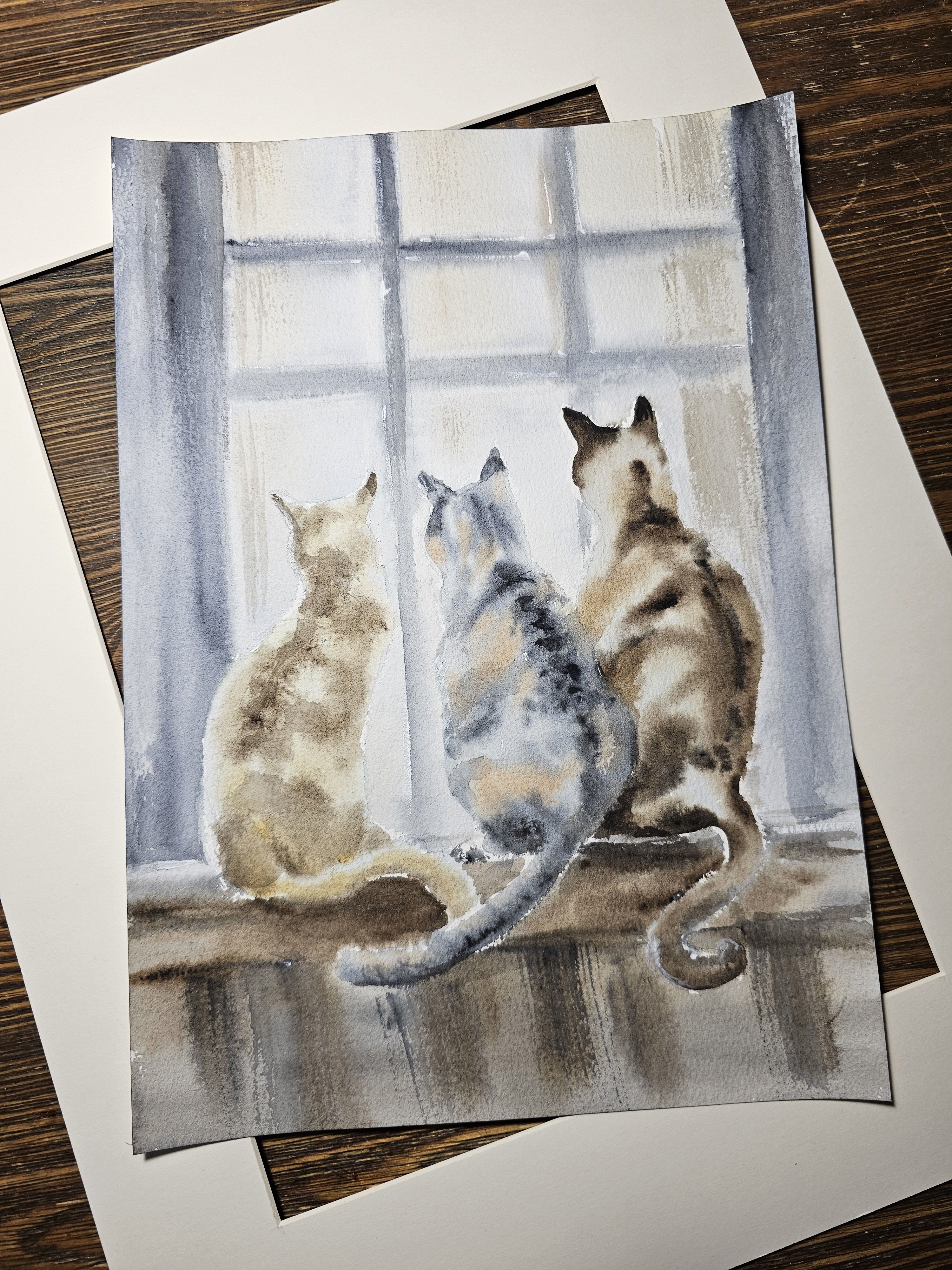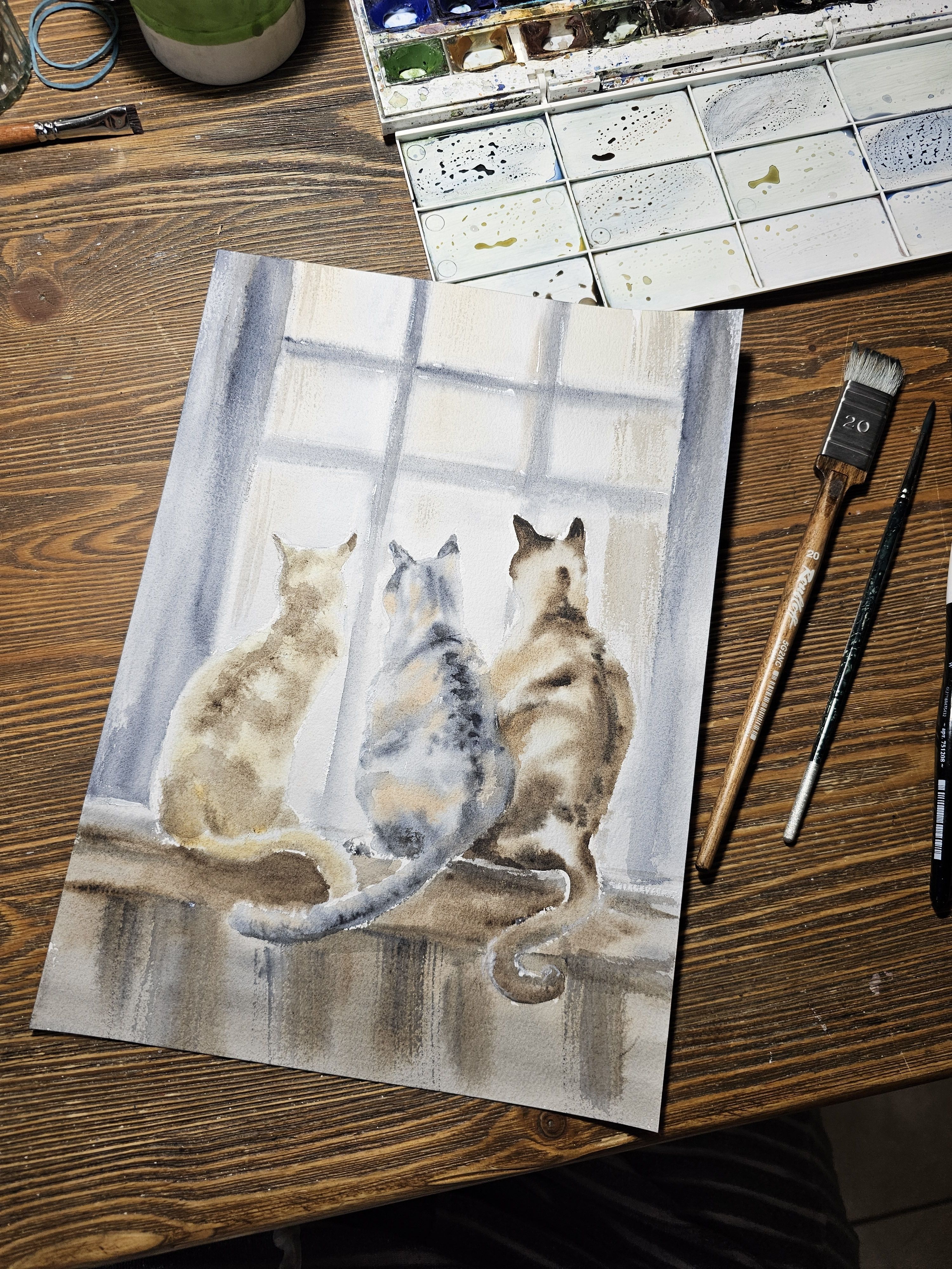 Нам представлена акварельная картина с кошками, сидящими на подоконнике перед окном. Кошки изображены со спины, они смотрят в окно. Окно изображено с разделёнными на квадраты стёклами, и за ним виден мягкий свет. Картина выполнена в светлых и пастельных тонах, создавая атмосферу уюта и спокойствия.