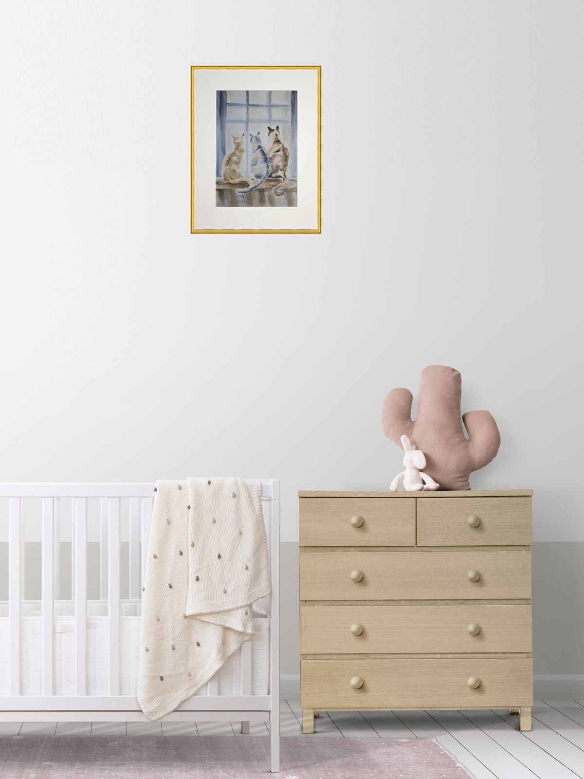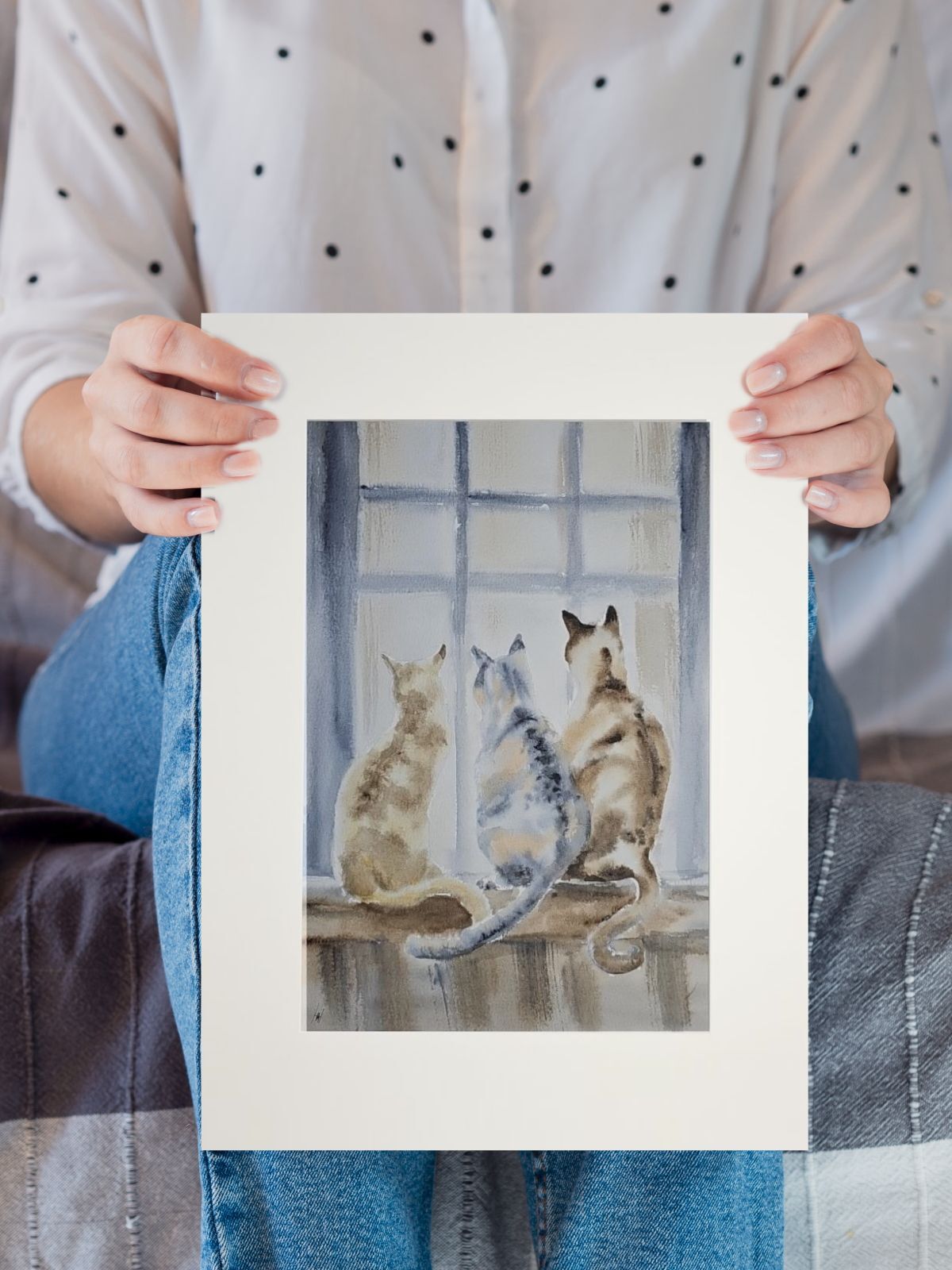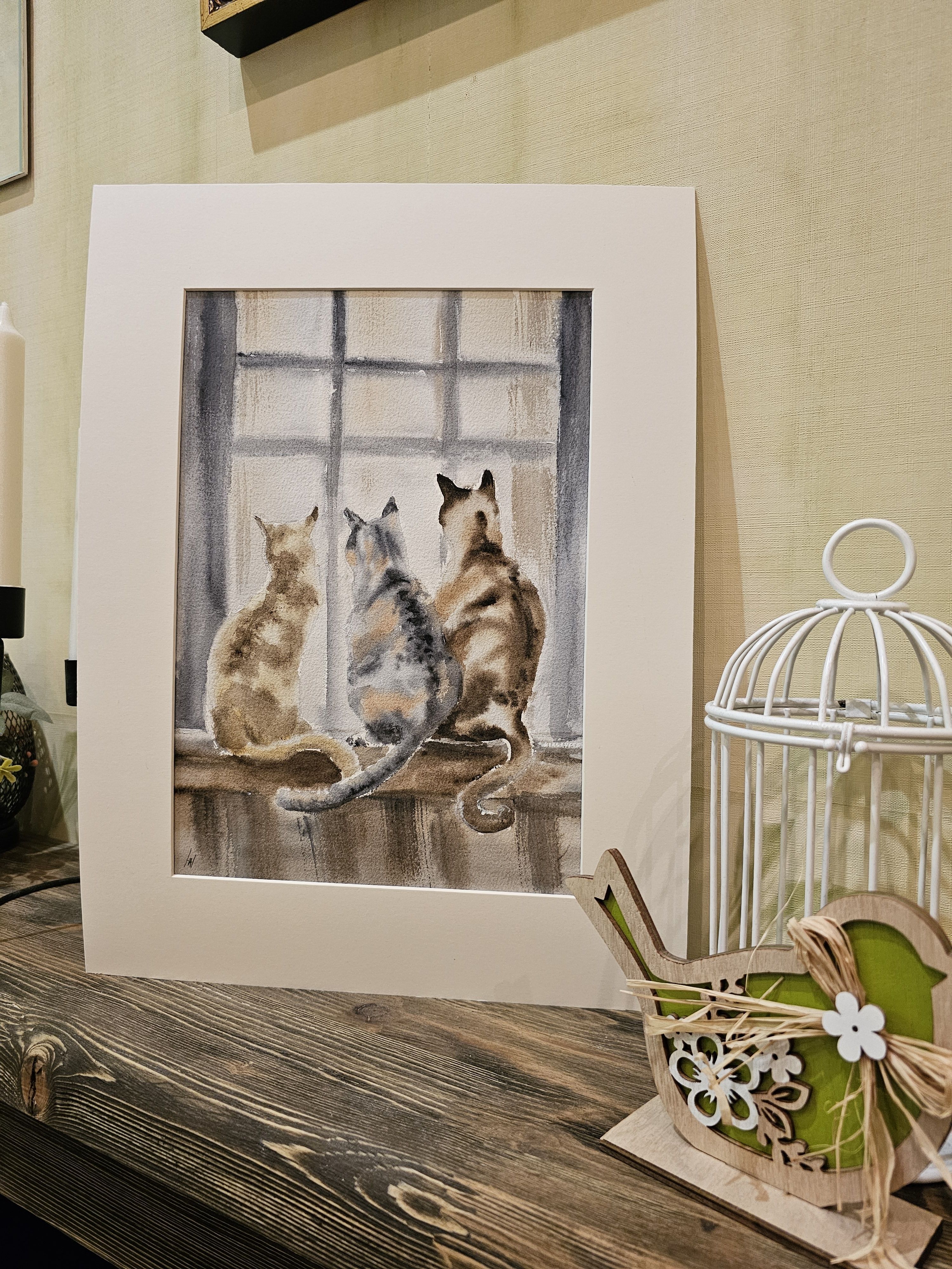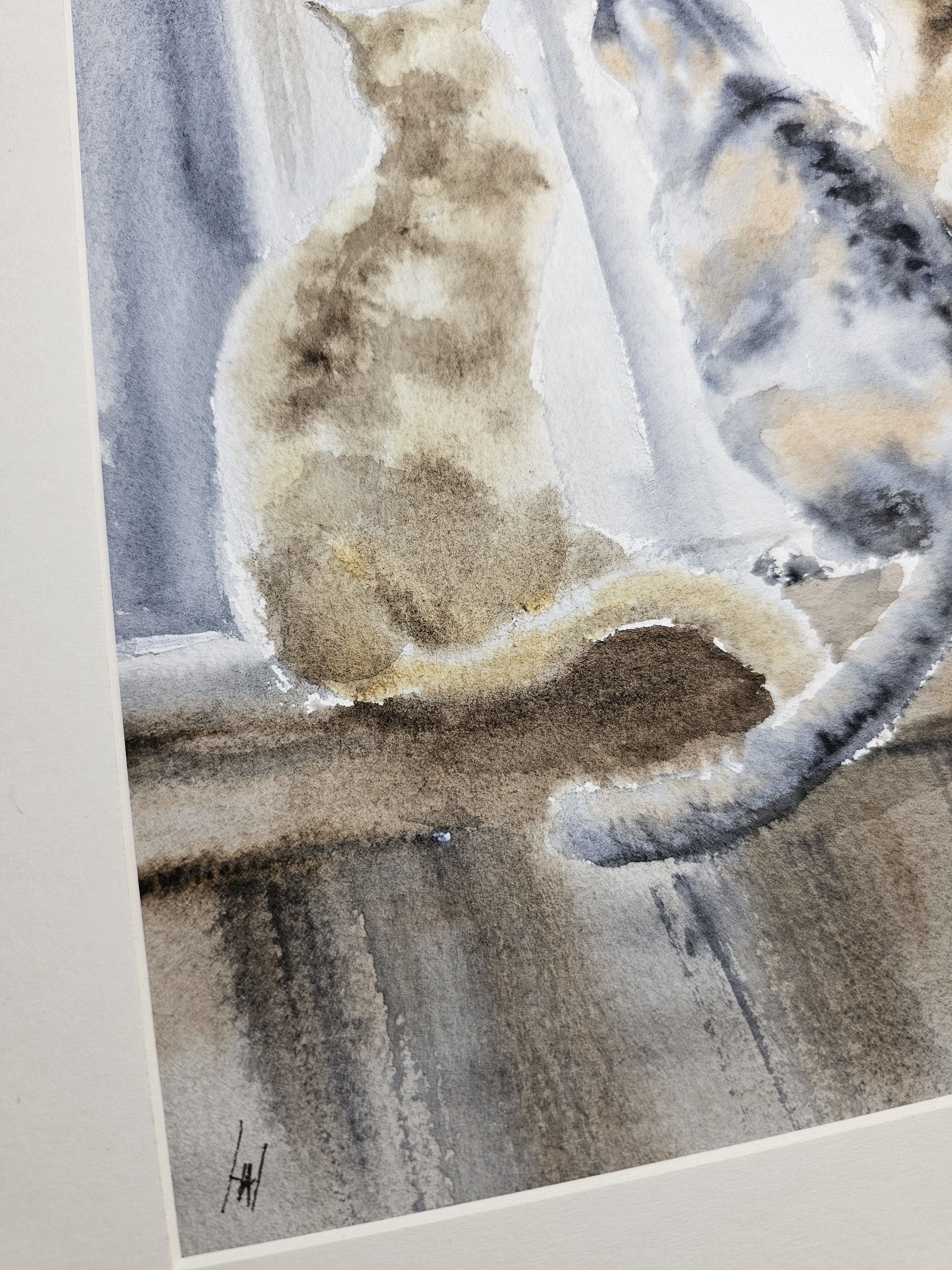 Нам представлена акварельная картина с кошками, сидящими на подоконнике перед окном. Кошки изображены со спины, они смотрят в окно. Окно изображено с разделёнными на квадраты стёклами, и за ним виден мягкий свет. Картина выполнена в светлых и пастельных тонах, создавая атмосферу уюта и спокойствия.