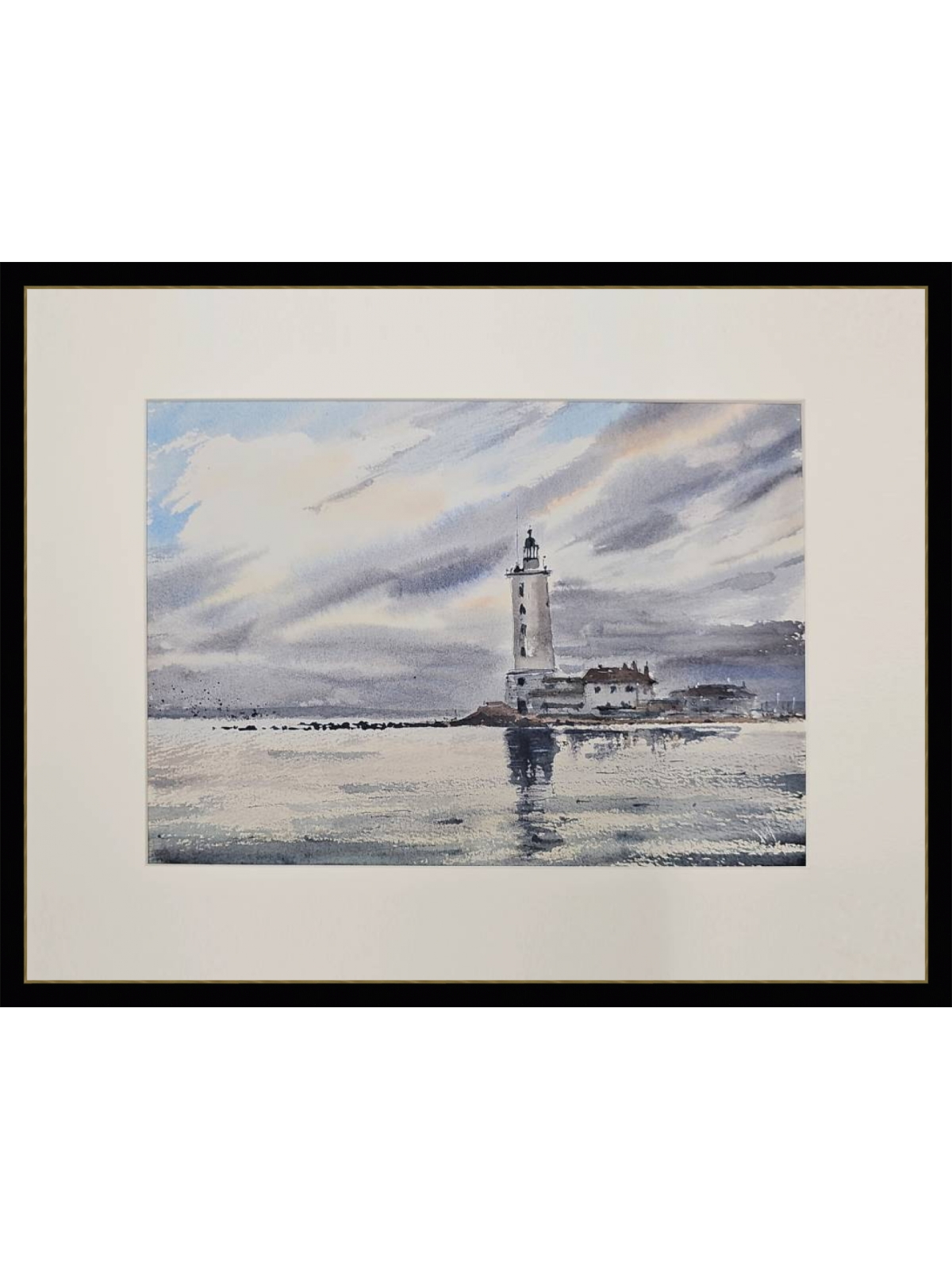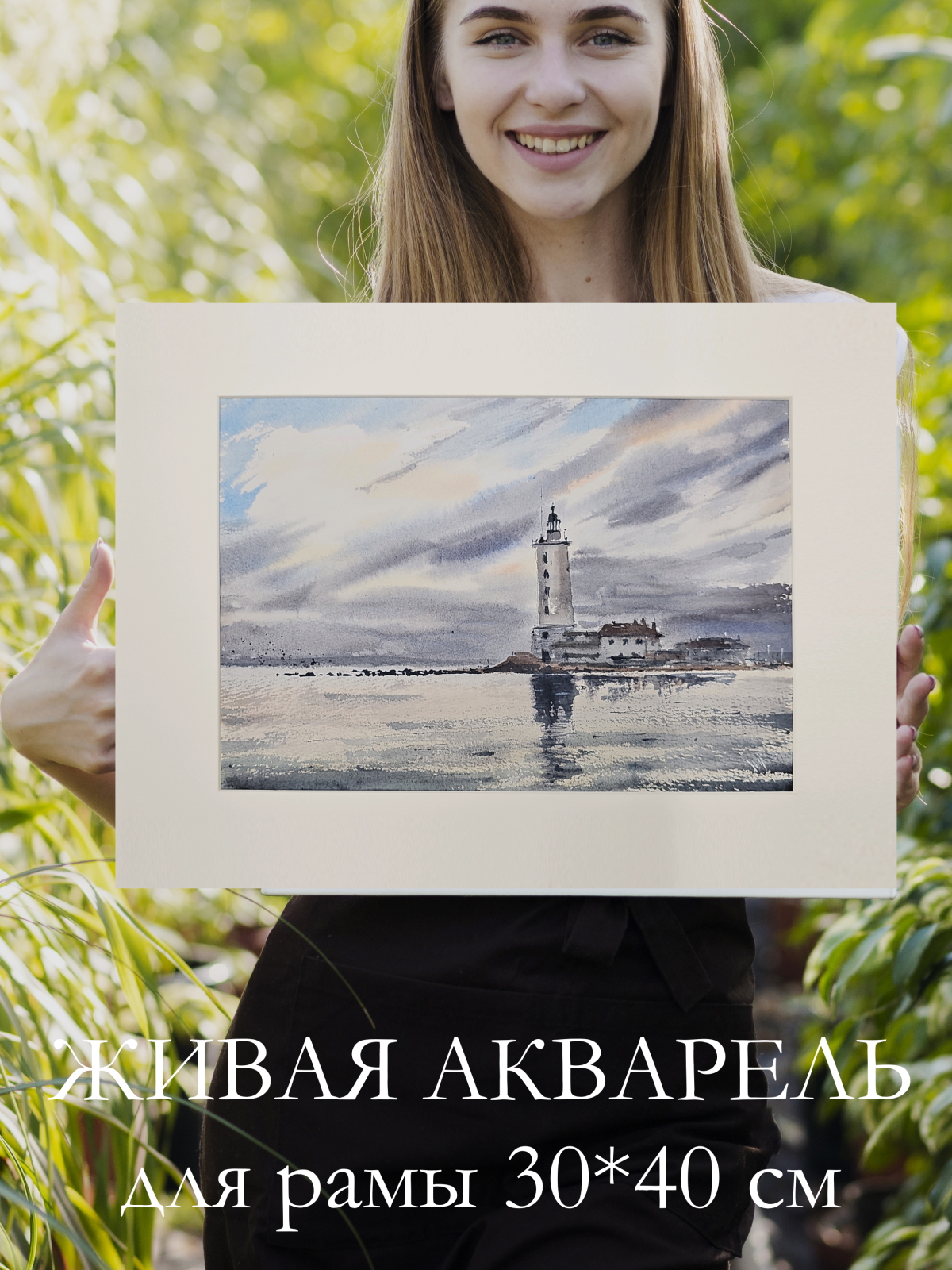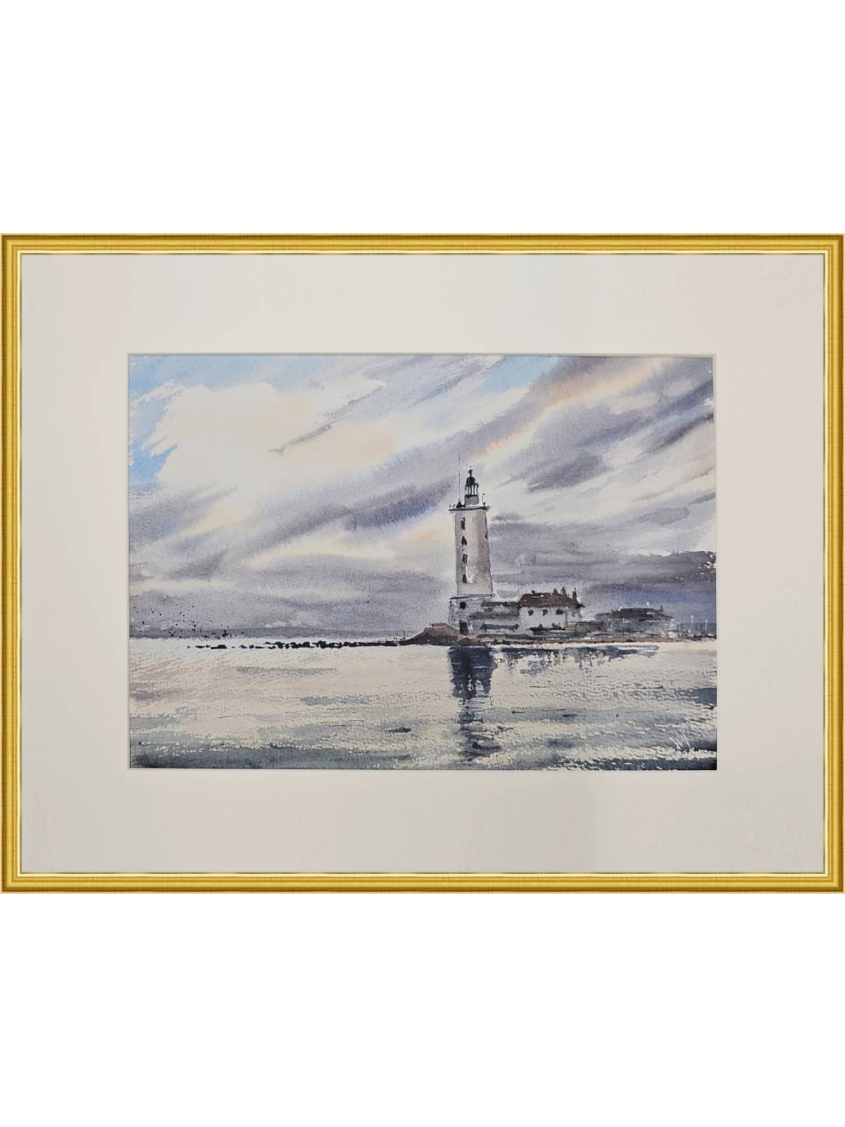 Нам представлена акварельная картина, на которой изображён маяк на берегу. Маяк расположен на небольшом острове или выступе суши, окружённом водой. На заднем плане видны облака, которые занимают большую часть неба, создавая драматичную атмосферу. Цветовая гамма картины преимущественно состоит из серых, голубых и белых оттенков, что придаёт сцене спокойствие и умиротворение. Вода отражает небо и маяк, создавая гармоничное и плавное изображение. Работа оформлена в светлое паспарту и готова к размещению в стандартной раме 30*40 см.