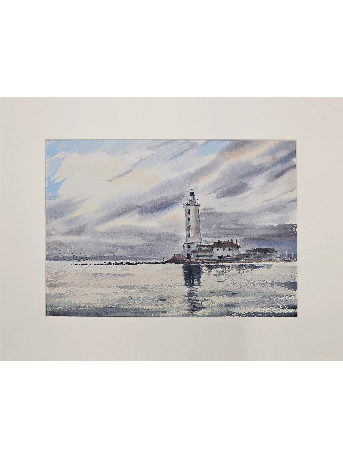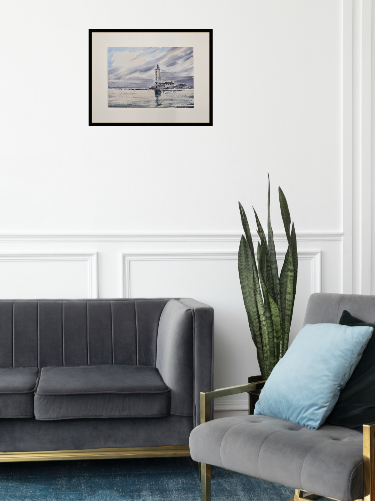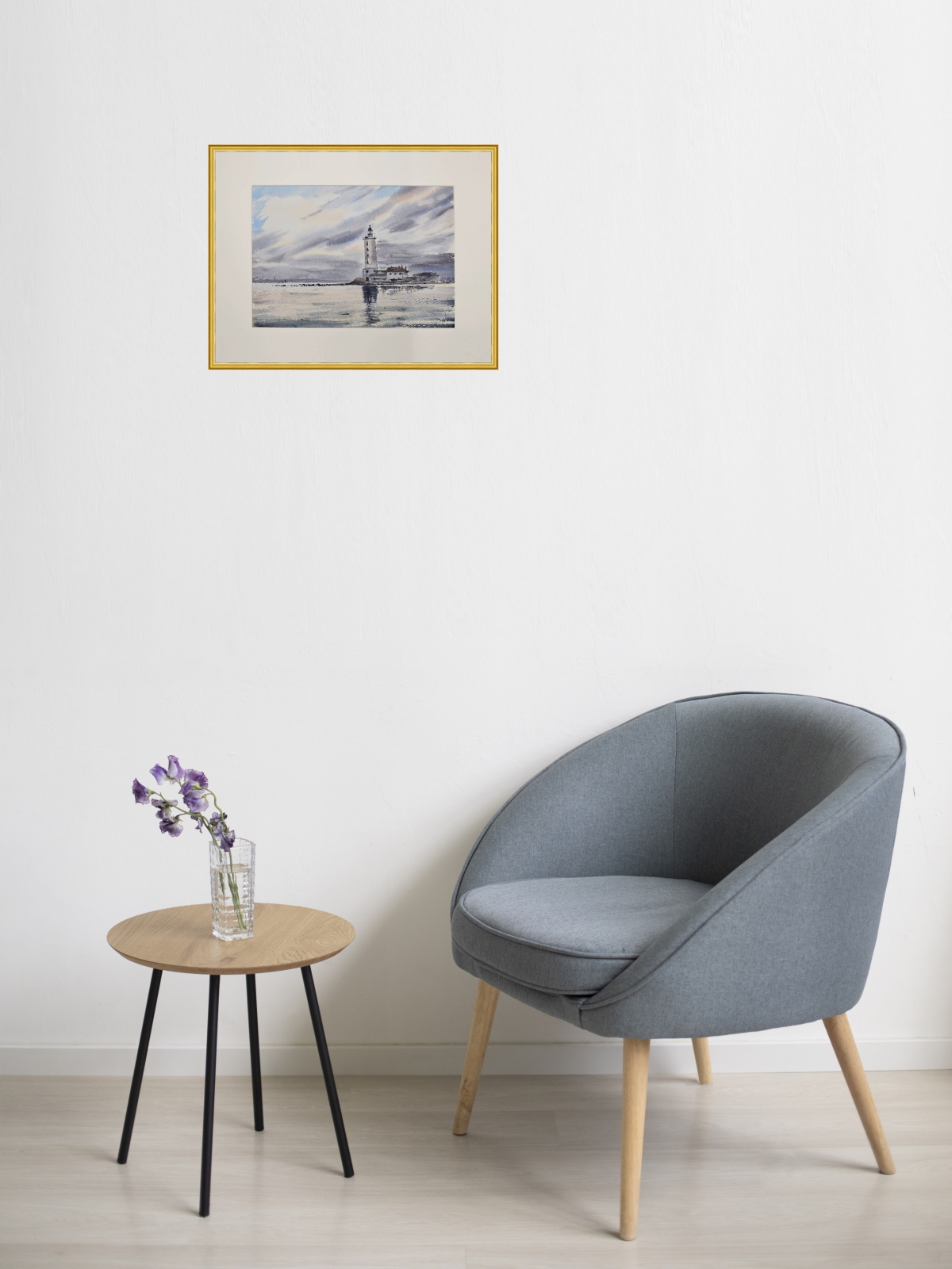 Нам представлена акварельная картина, на которой изображён маяк на берегу. Маяк расположен на небольшом острове или выступе суши, окружённом водой. На заднем плане видны облака, которые занимают большую часть неба, создавая драматичную атмосферу. Цветовая гамма картины преимущественно состоит из серых, голубых и белых оттенков, что придаёт сцене спокойствие и умиротворение. Вода отражает небо и маяк, создавая гармоничное и плавное изображение. Работа оформлена в светлое паспарту и готова к размещению в стандартной раме 30*40 см.