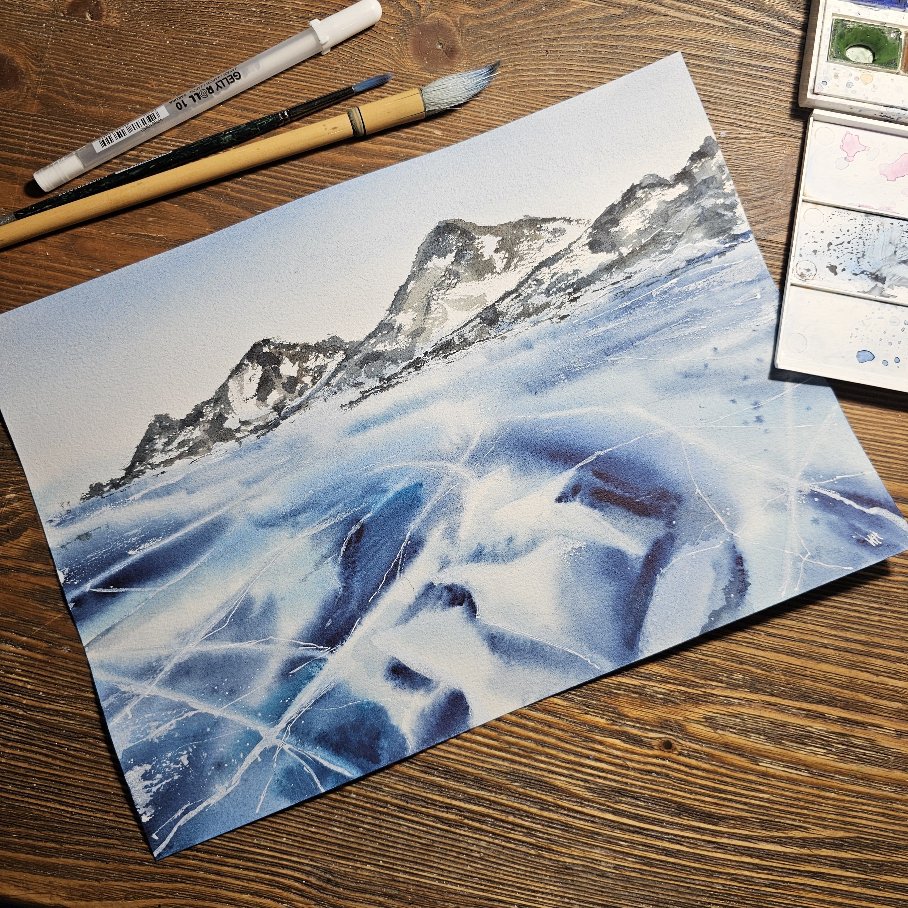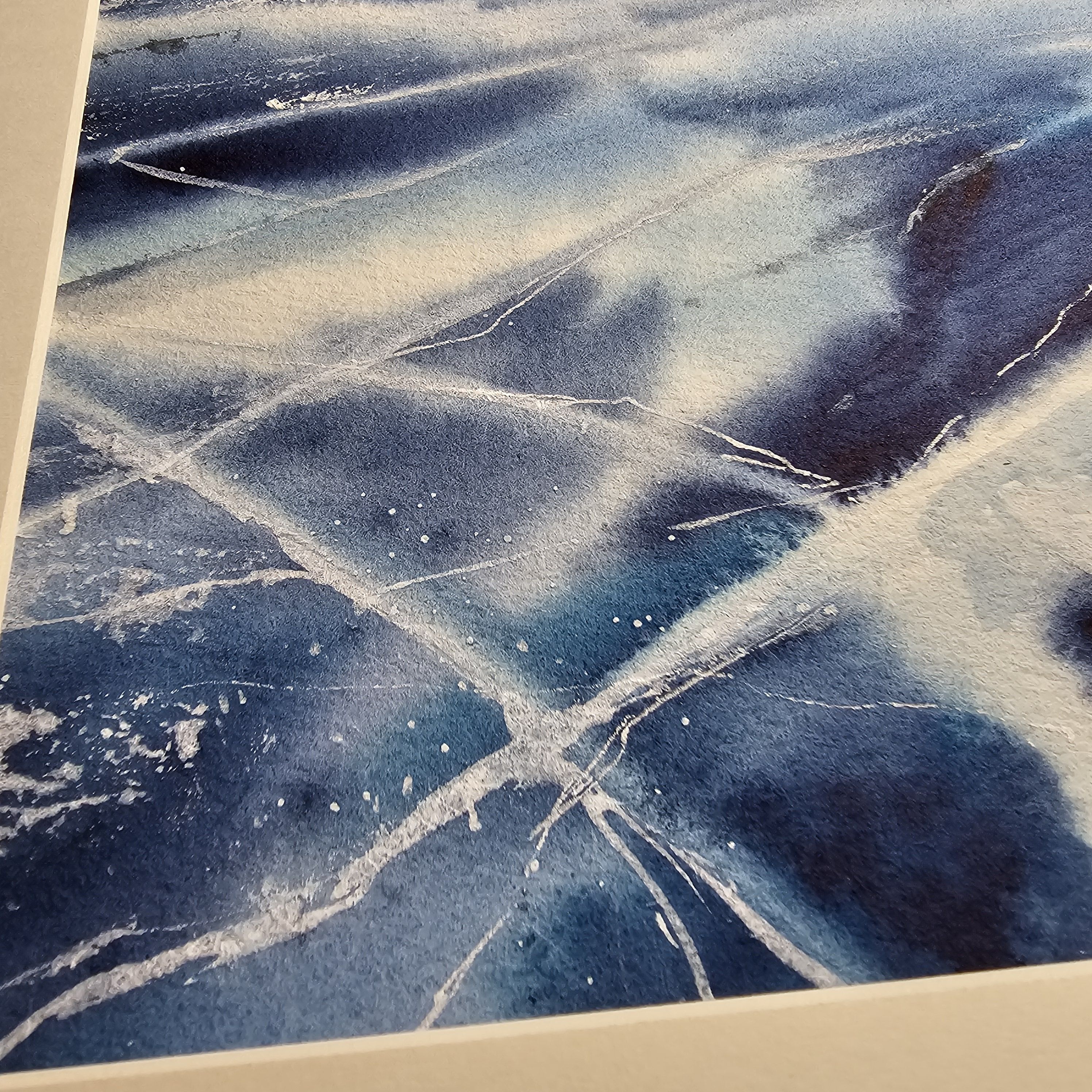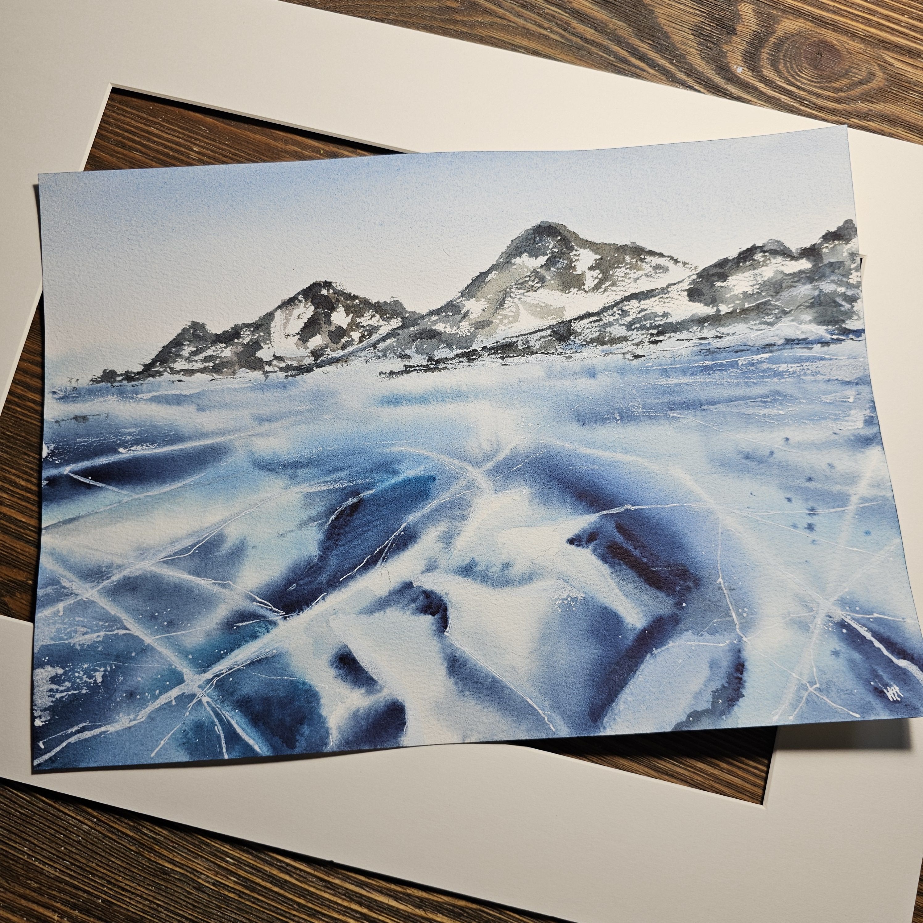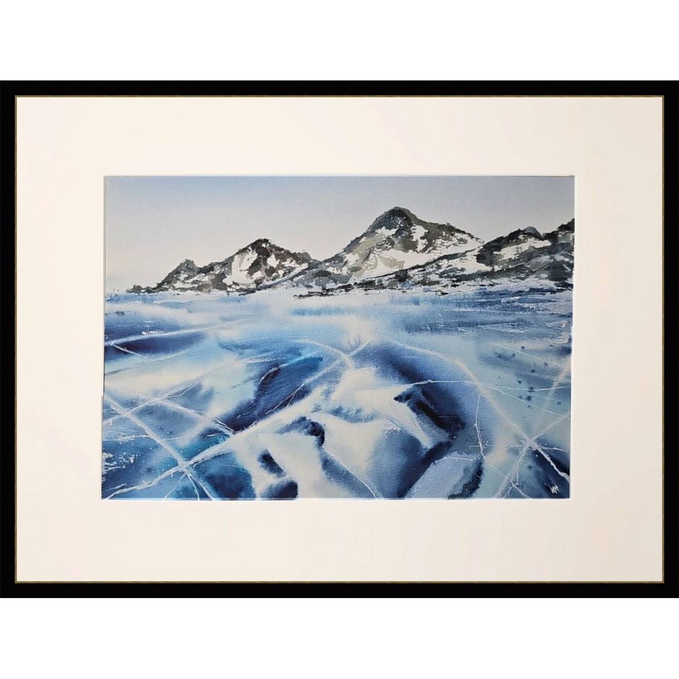 Нам представлен акварельный пейзаж на котором изображены заснеженные холмы на горизонте. Передний план картины занимает замёрзшее озеро с ледяной поверхностью, на которой видны многочисленные трещины и узоры. Это лед озера Байкал. Цветовая гамма преимущественно холодная с оттенками синего и белого, что создает ощущение сильного холода. Справа мы видим подпись автора. Пейзаж обрамлен в светлое паспарту и готов к размещению в раму стандартного размера 30*40 см.