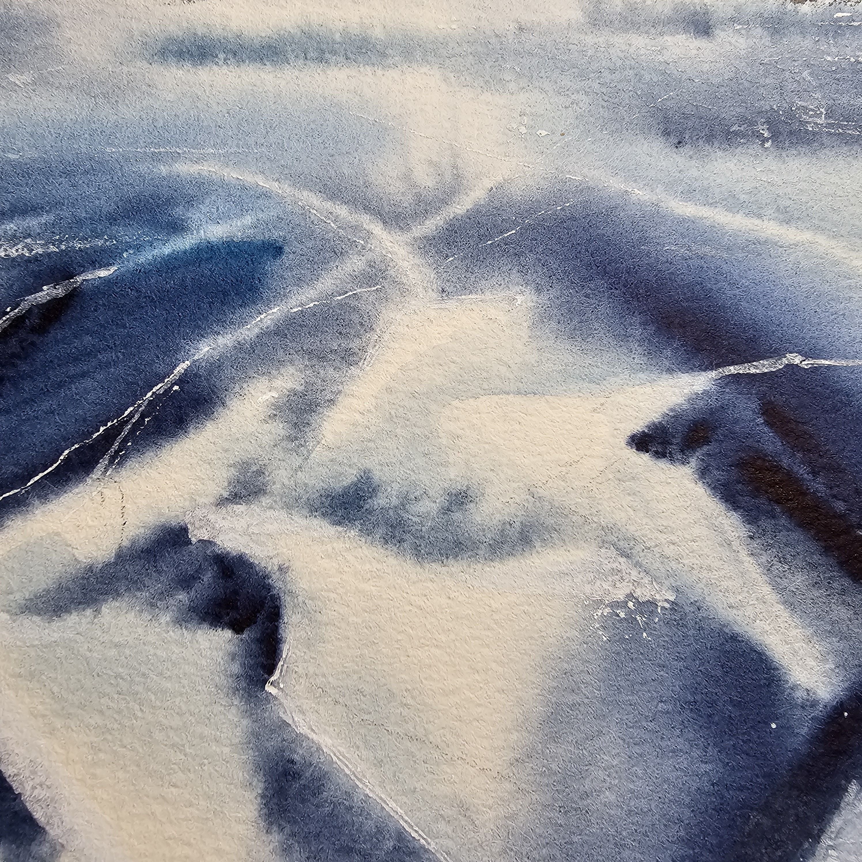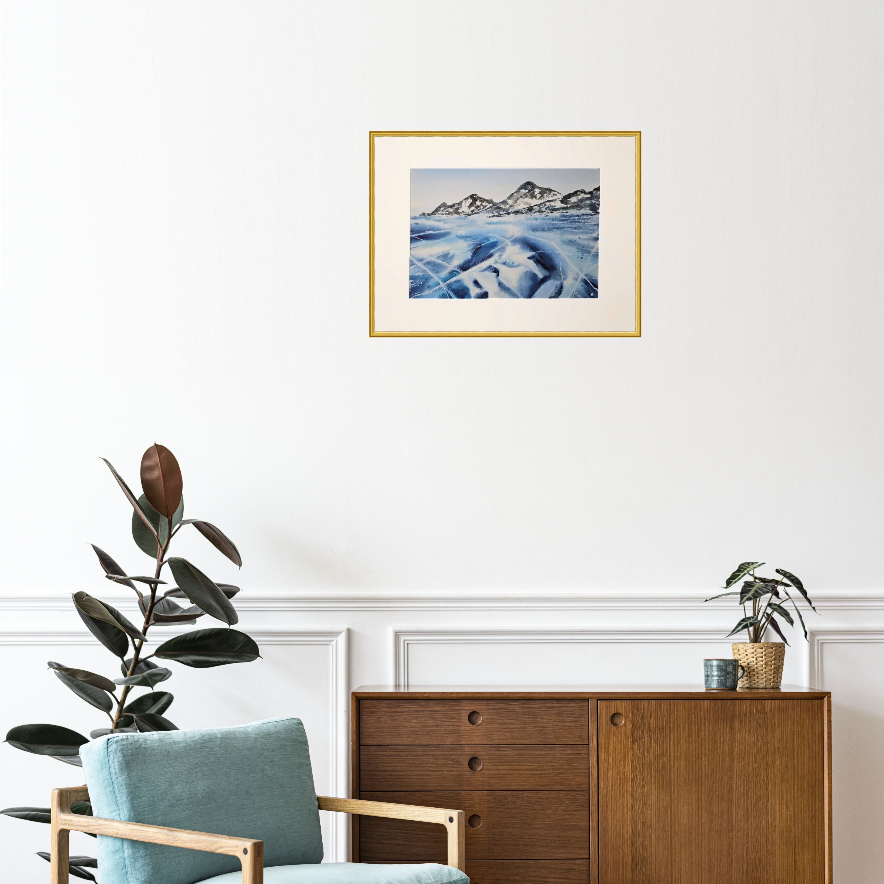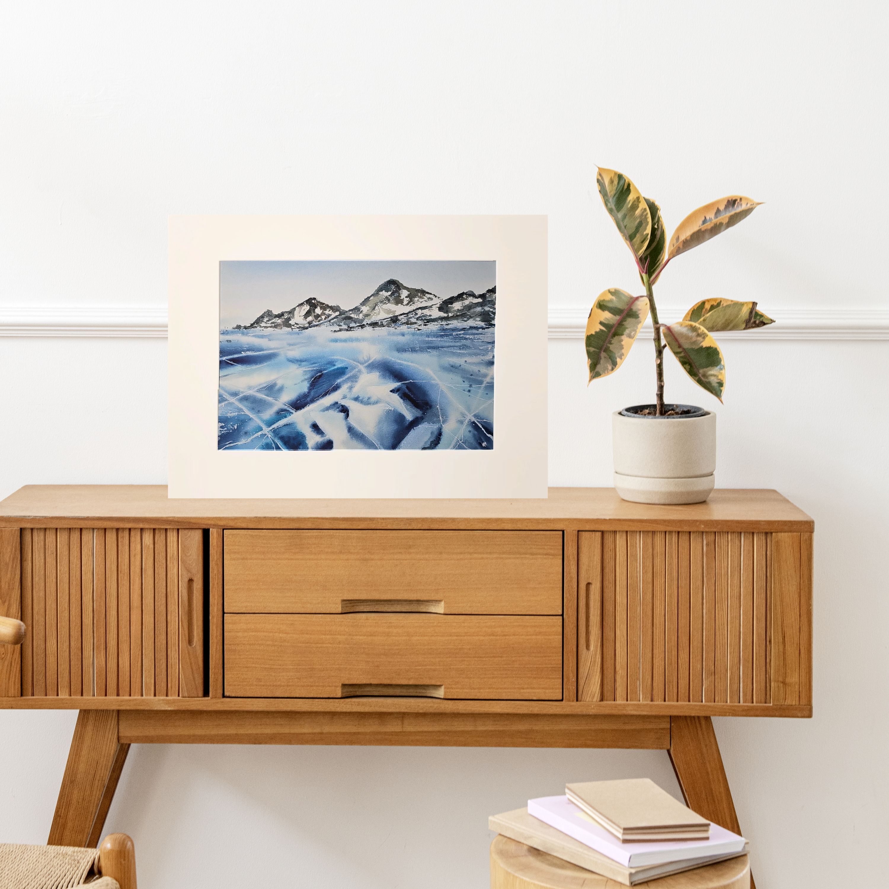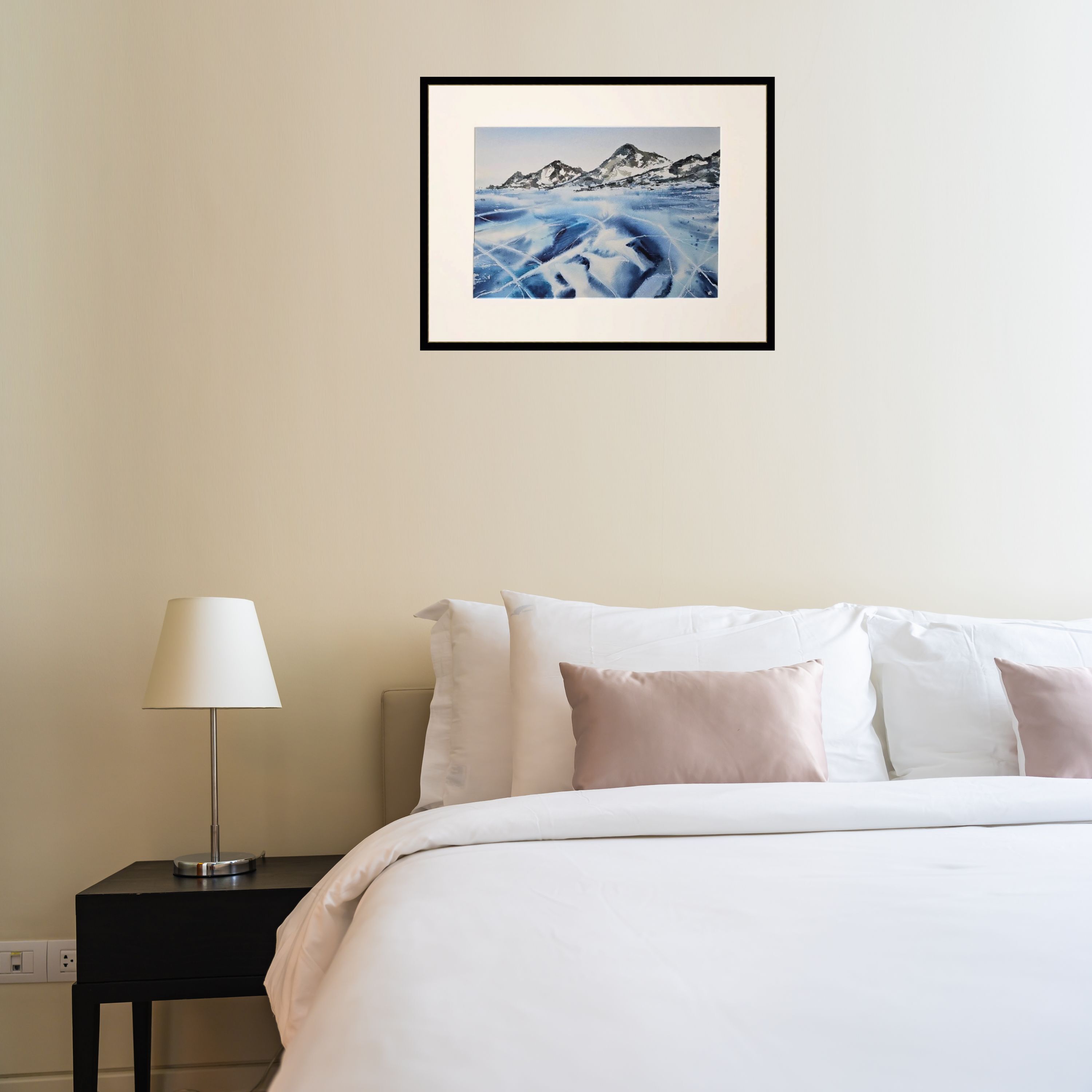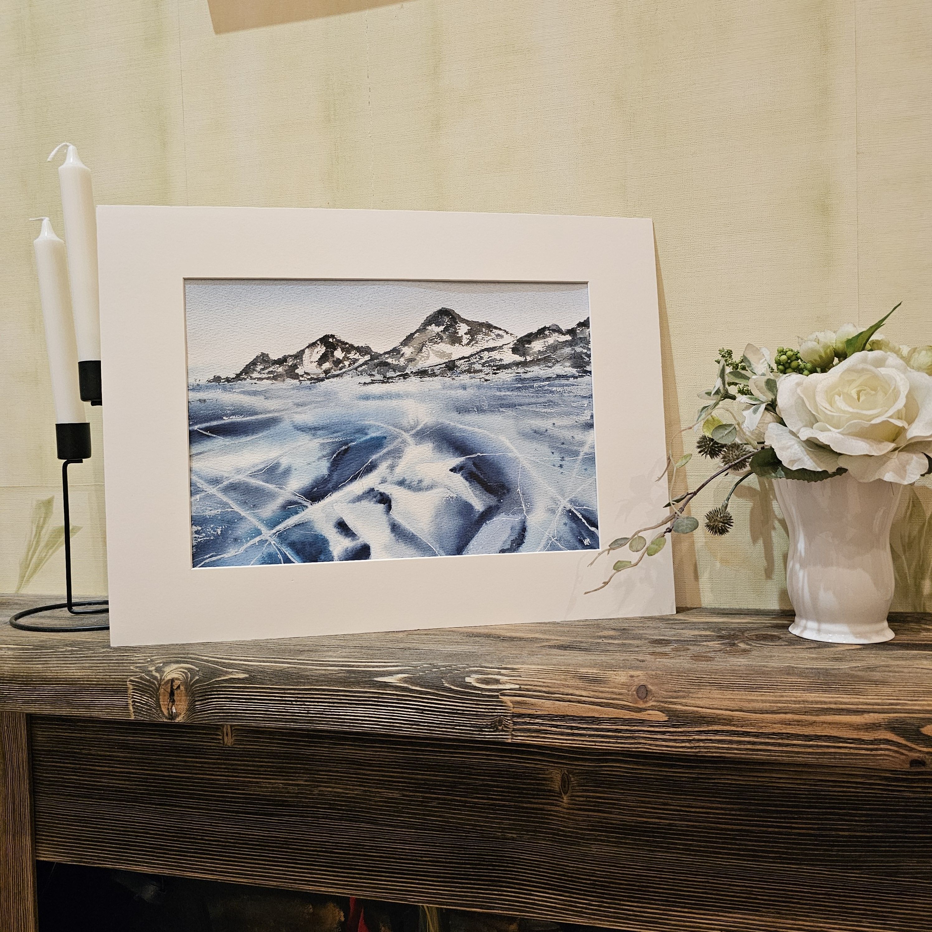 Нам представлен акварельный пейзаж на котором изображены заснеженные холмы на горизонте. Передний план картины занимает замёрзшее озеро с ледяной поверхностью, на которой видны многочисленные трещины и узоры. Это лед озера Байкал. Цветовая гамма преимущественно холодная с оттенками синего и белого, что создает ощущение сильного холода. Справа мы видим подпись автора. Пейзаж обрамлен в светлое паспарту и готов к размещению в раму стандартного размера 30*40 см.