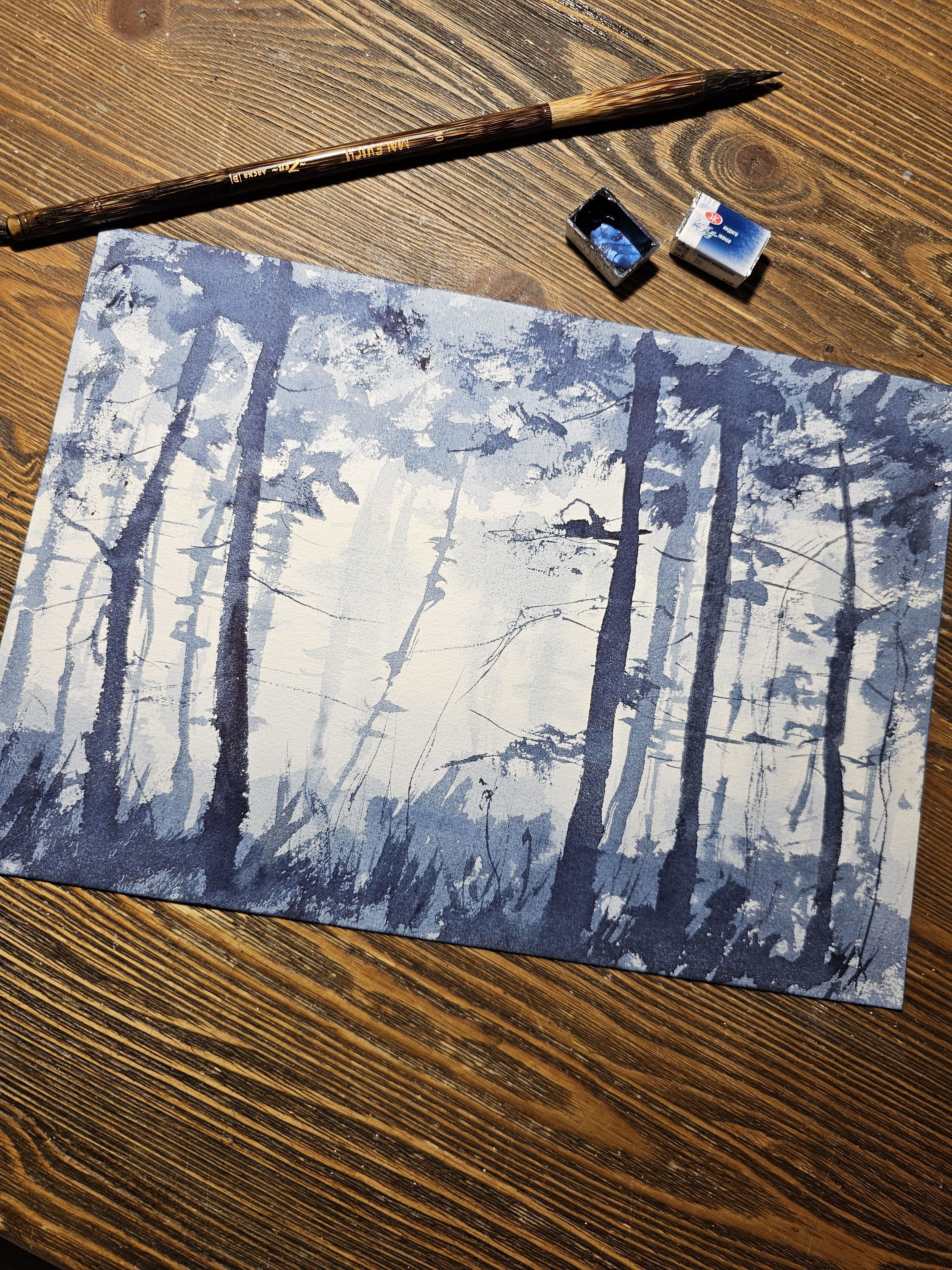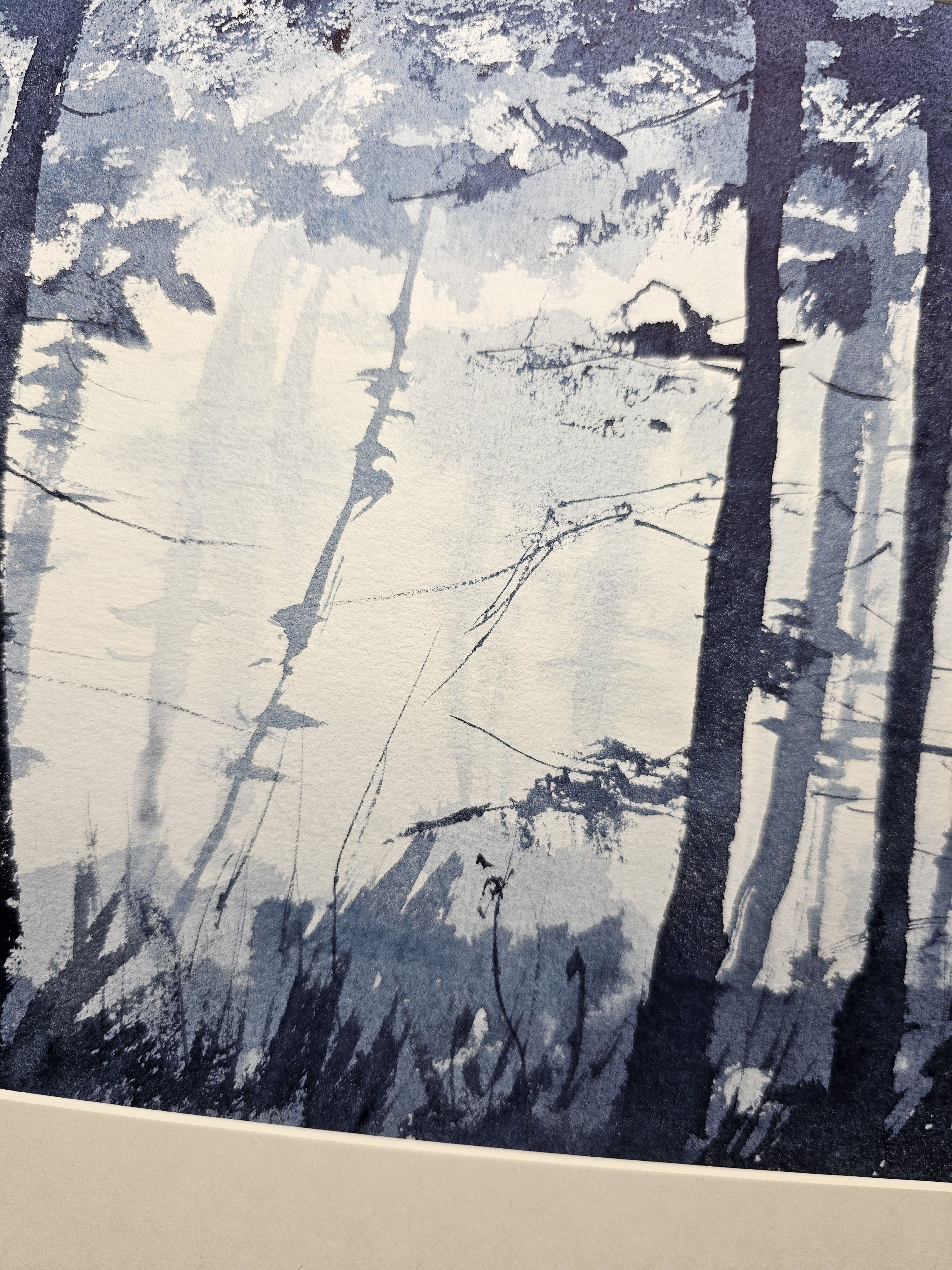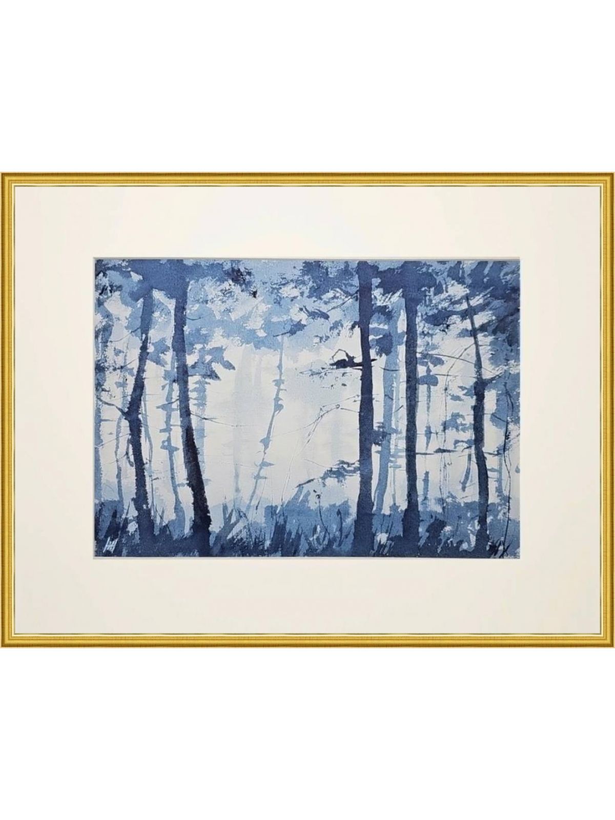 Нам представлен акварельный рисунок, выполненная в синих тонах, изображающая лесную сцену. Видны высокие деревья с тонкими стволами и листьями, которые создают чувство глубины и воздушности. Фон выглядит немного размытым, что придаёт картине туманную и загадочную атмосферу. Композиция сосредоточена на вертикальных линиях деревьев и изящных тенях, создающих ощущение леса в утреннем или вечернем свете. Работа оформлена в светлое паспарту и готово для размещения в раме стандартного размера.
