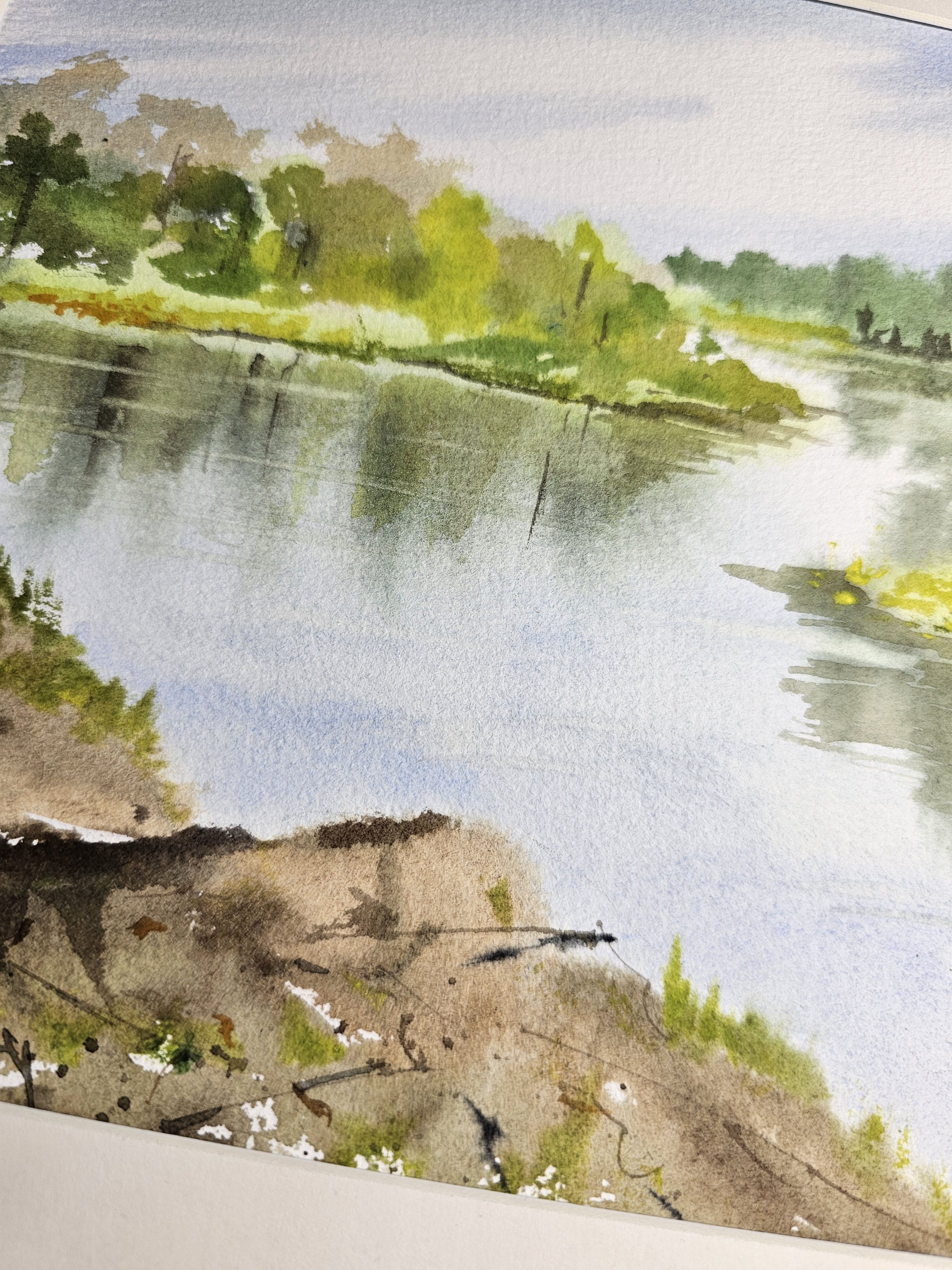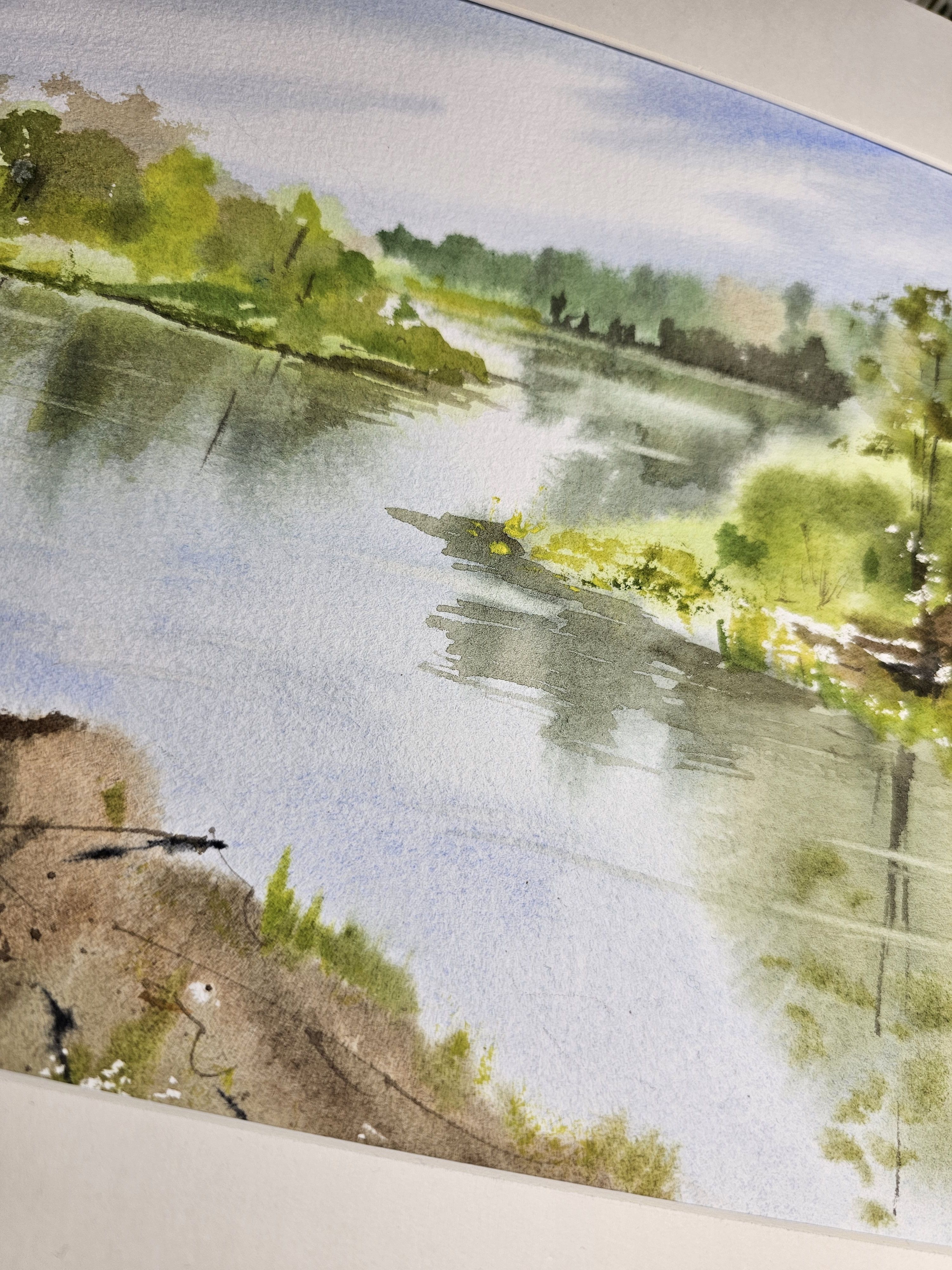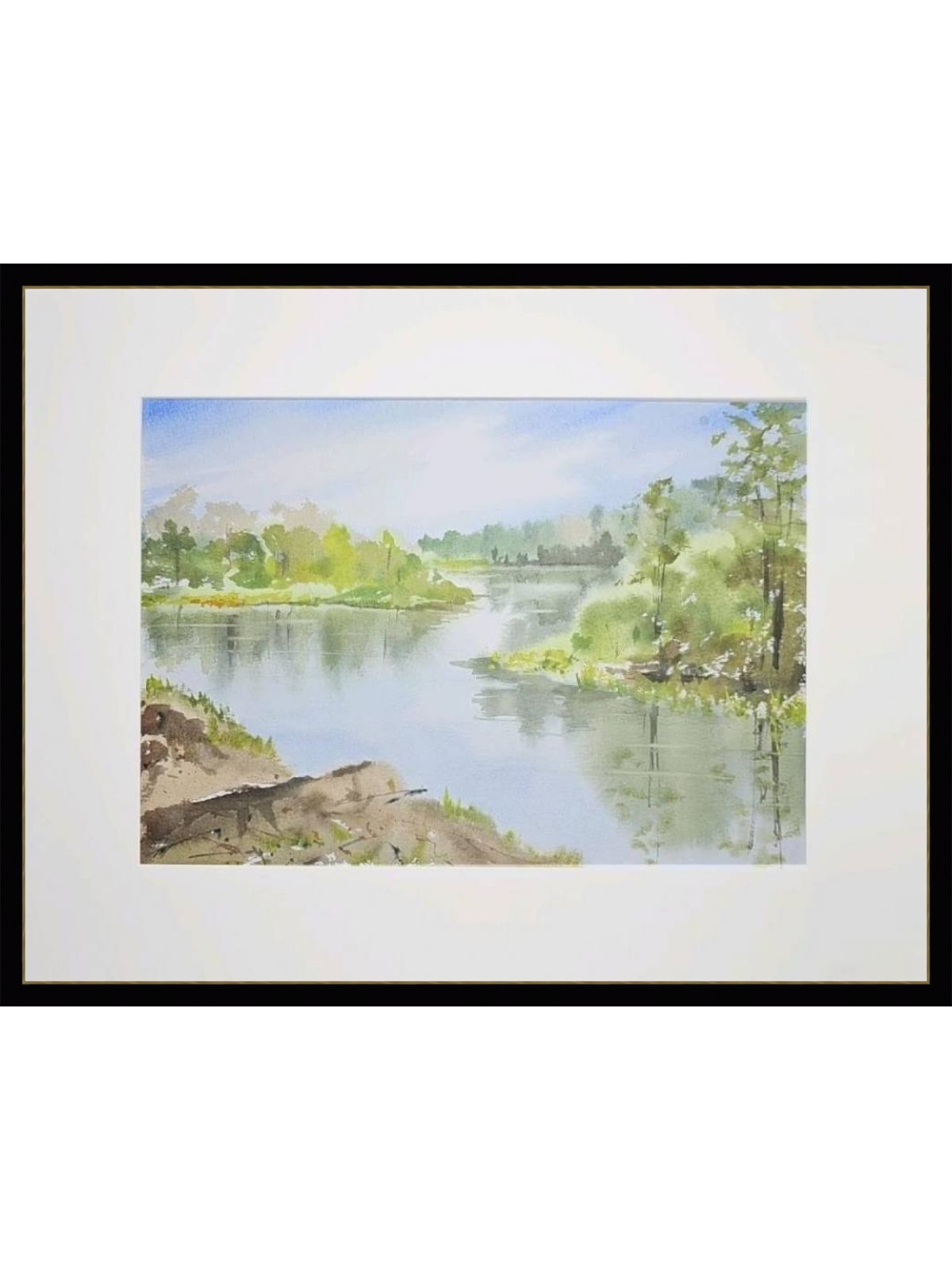 Нам представлен акварельный пейзаж. Картина изображает тихую реку, окруженную зеленью. Вода отражает окружающую растительность, создавая спокойное настроение. По берегам видны деревья и кустарники, которые частично закрывают горизонт. Небо ясное, с легкой голубизной, что добавляет ощущение свежести и умиротворения. Земля в нижней части изображения написана коричневыми оттенками, указывающими на естественный ландшафт берега.