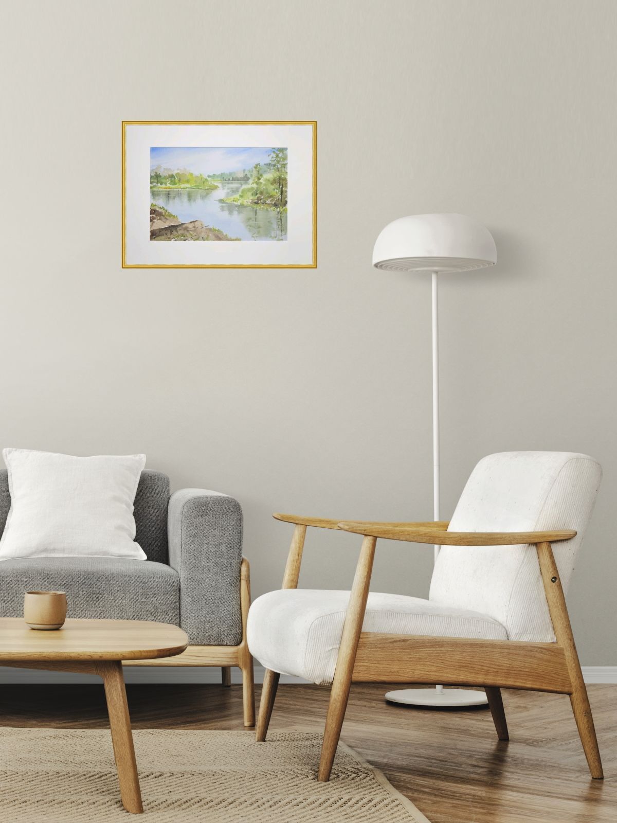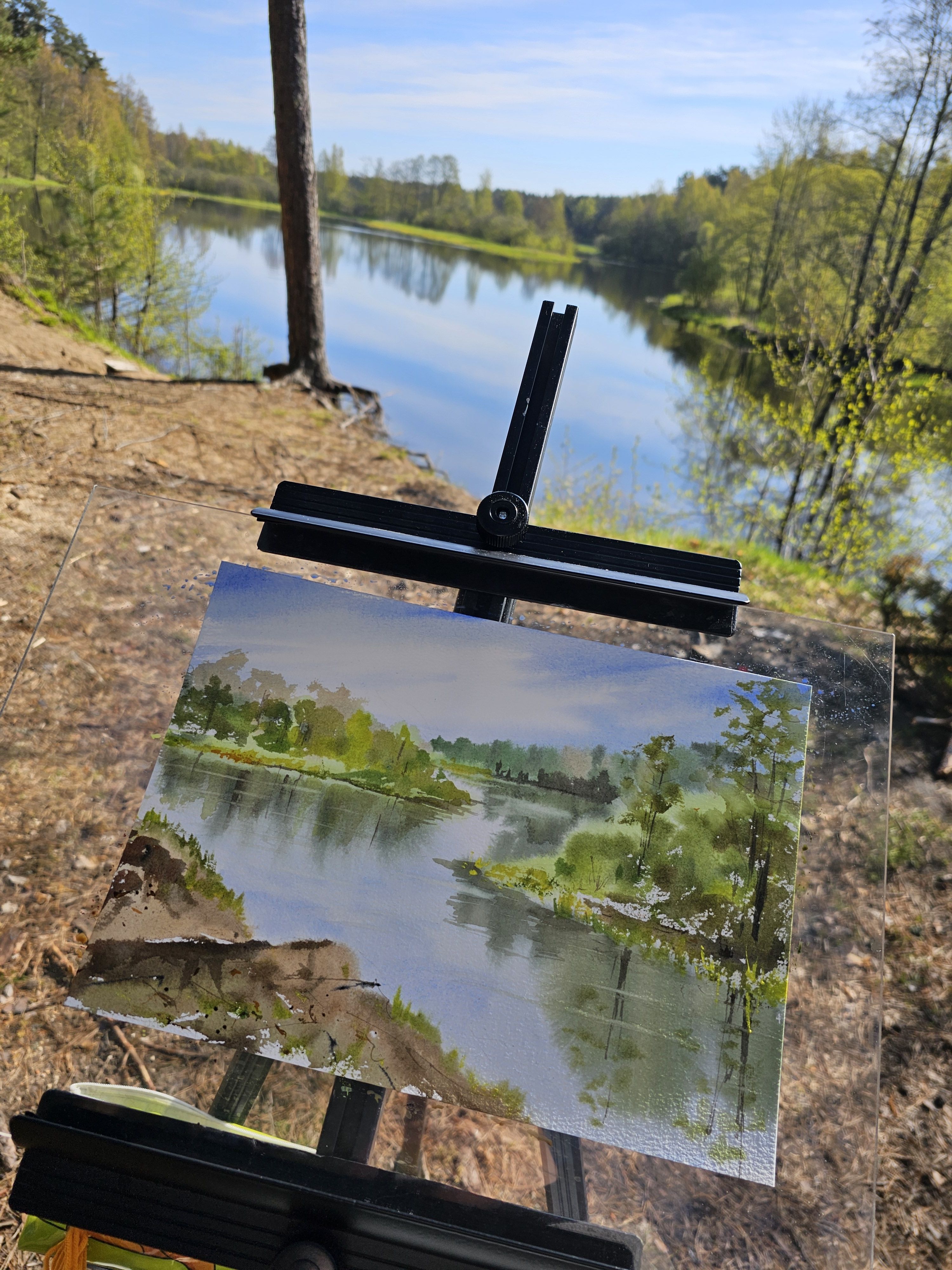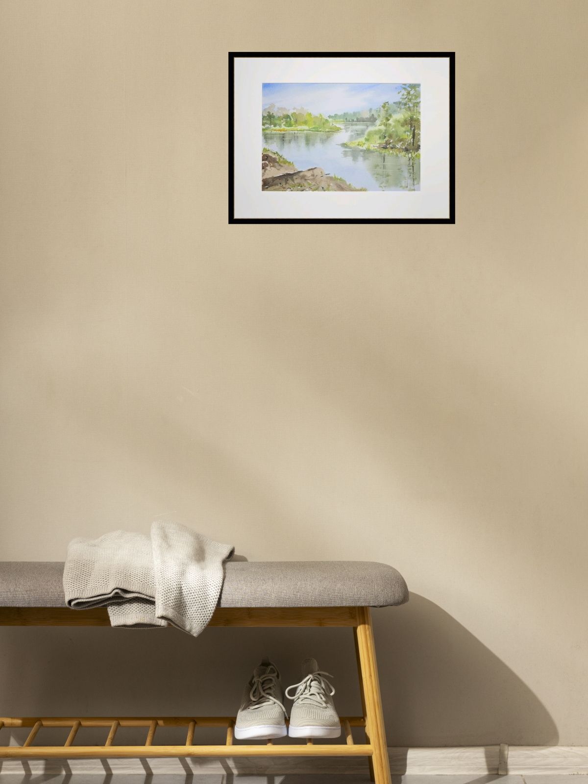 Нам представлен акварельный пейзаж. Картина изображает тихую реку, окруженную зеленью. Вода отражает окружающую растительность, создавая спокойное настроение. По берегам видны деревья и кустарники, которые частично закрывают горизонт. Небо ясное, с легкой голубизной, что добавляет ощущение свежести и умиротворения. Земля в нижней части изображения написана коричневыми оттенками, указывающими на естественный ландшафт берега.