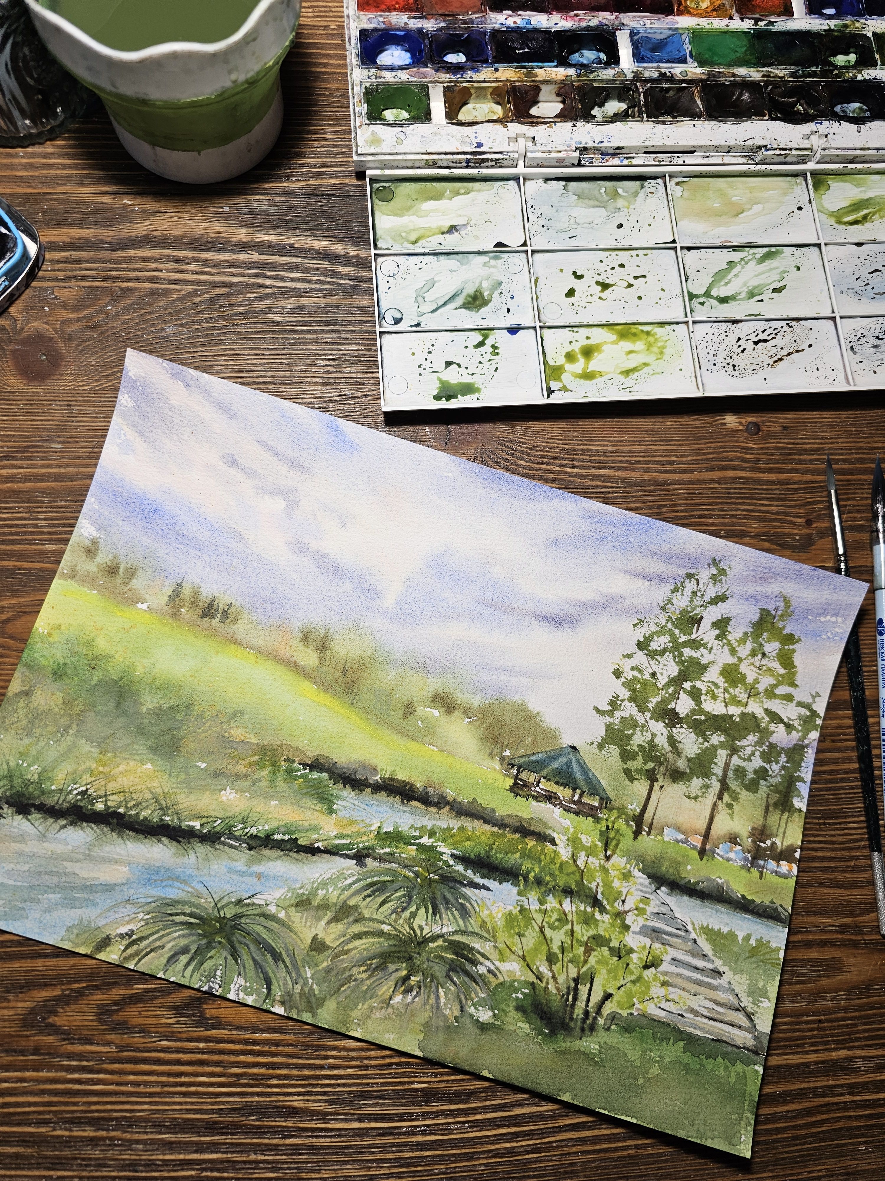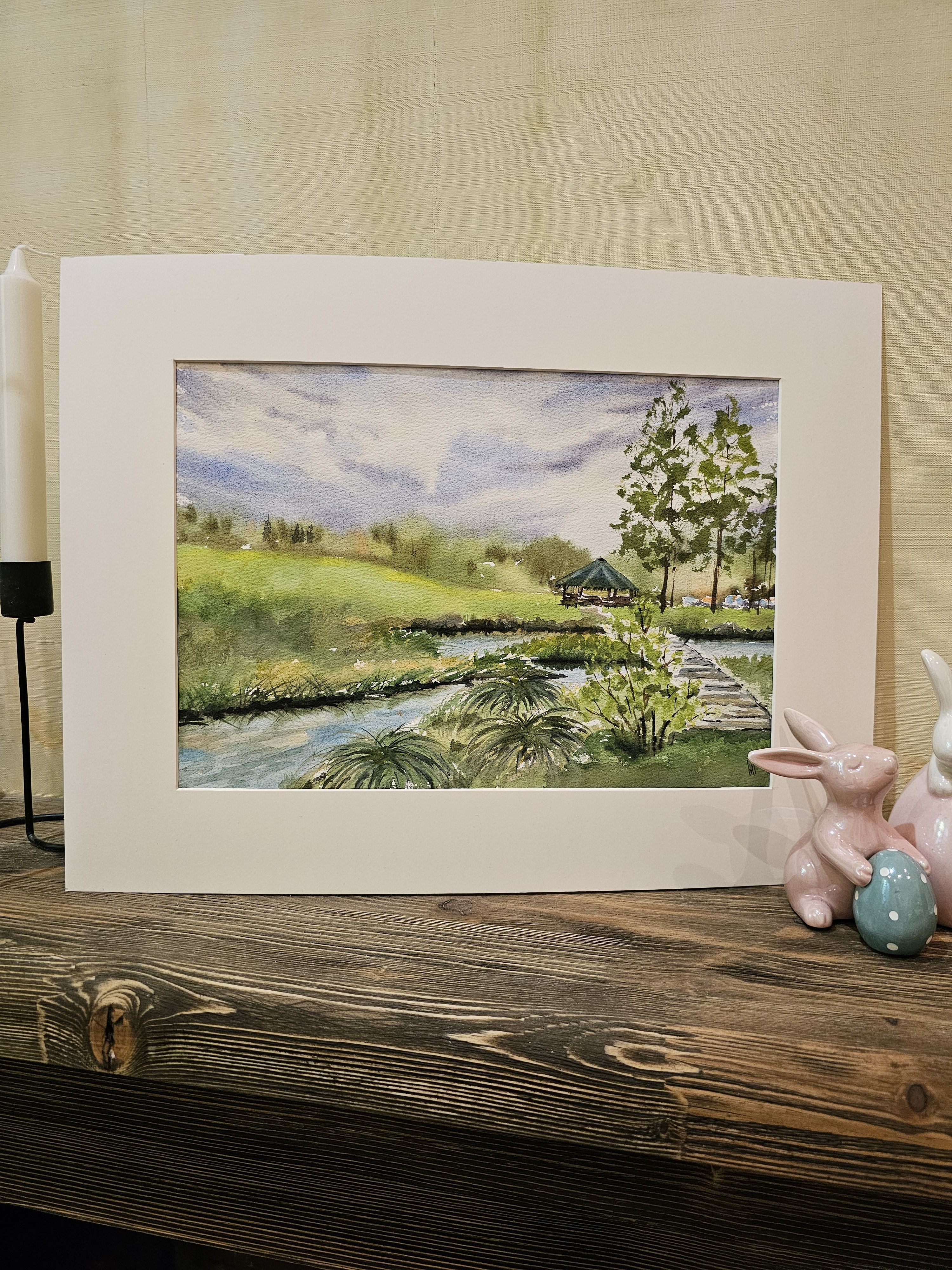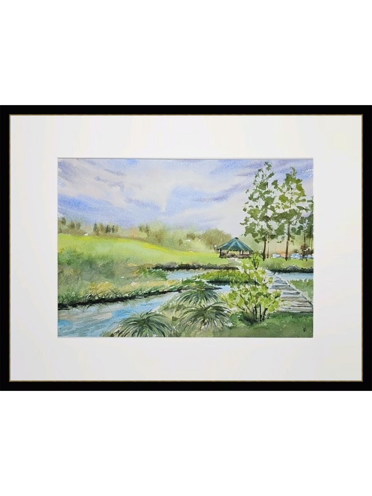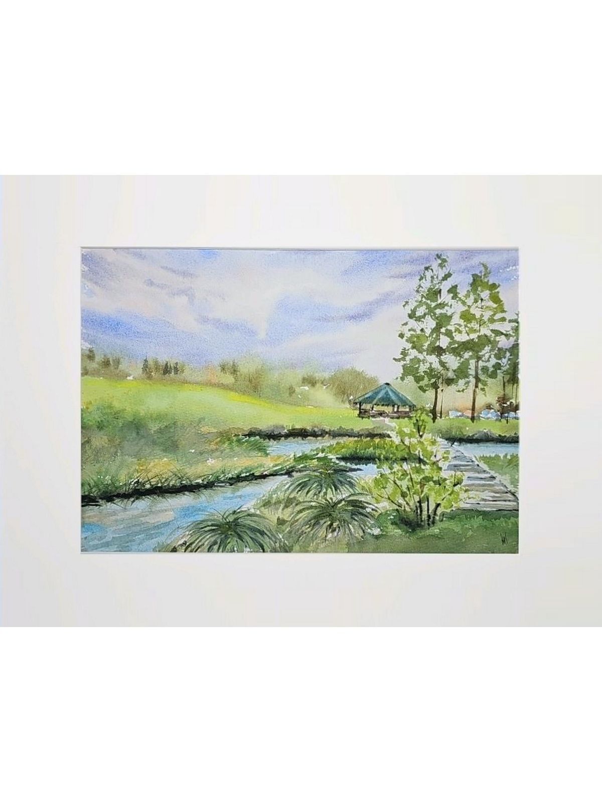 Нам представлена акварельная картина, изображающая пейзаж с зелёными полями и деревьями. В левой части картины находится извилистый поток воды реки Белка, который окружён растениями и кустарниками. В центре, на заднем плане, виден небольшой мостик, пересекающая пейзаж. Справа на картине находятся высокие деревья, а за ними угадывается небольшая постройка или беседка. Небо ясное, с небольшими облаками, создающее атмосферу спокойствия и умиротворения.