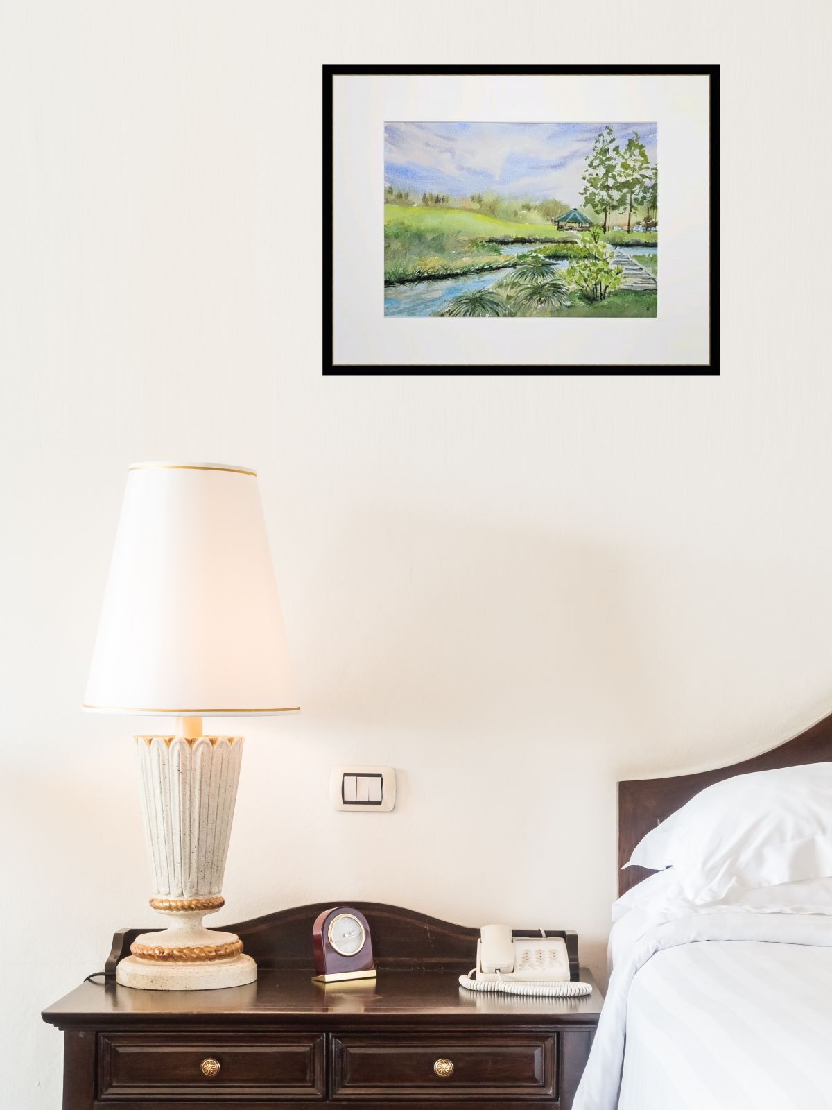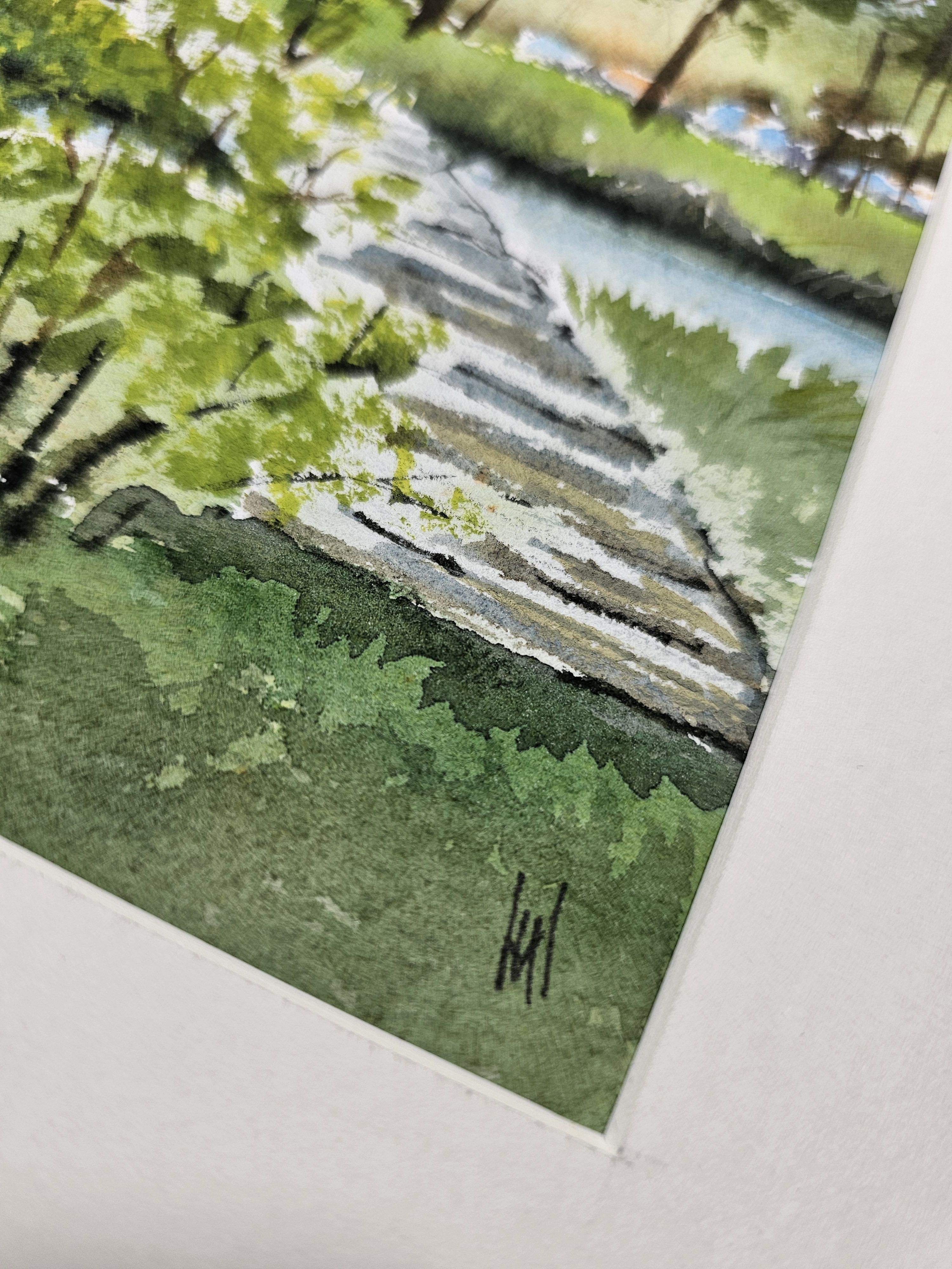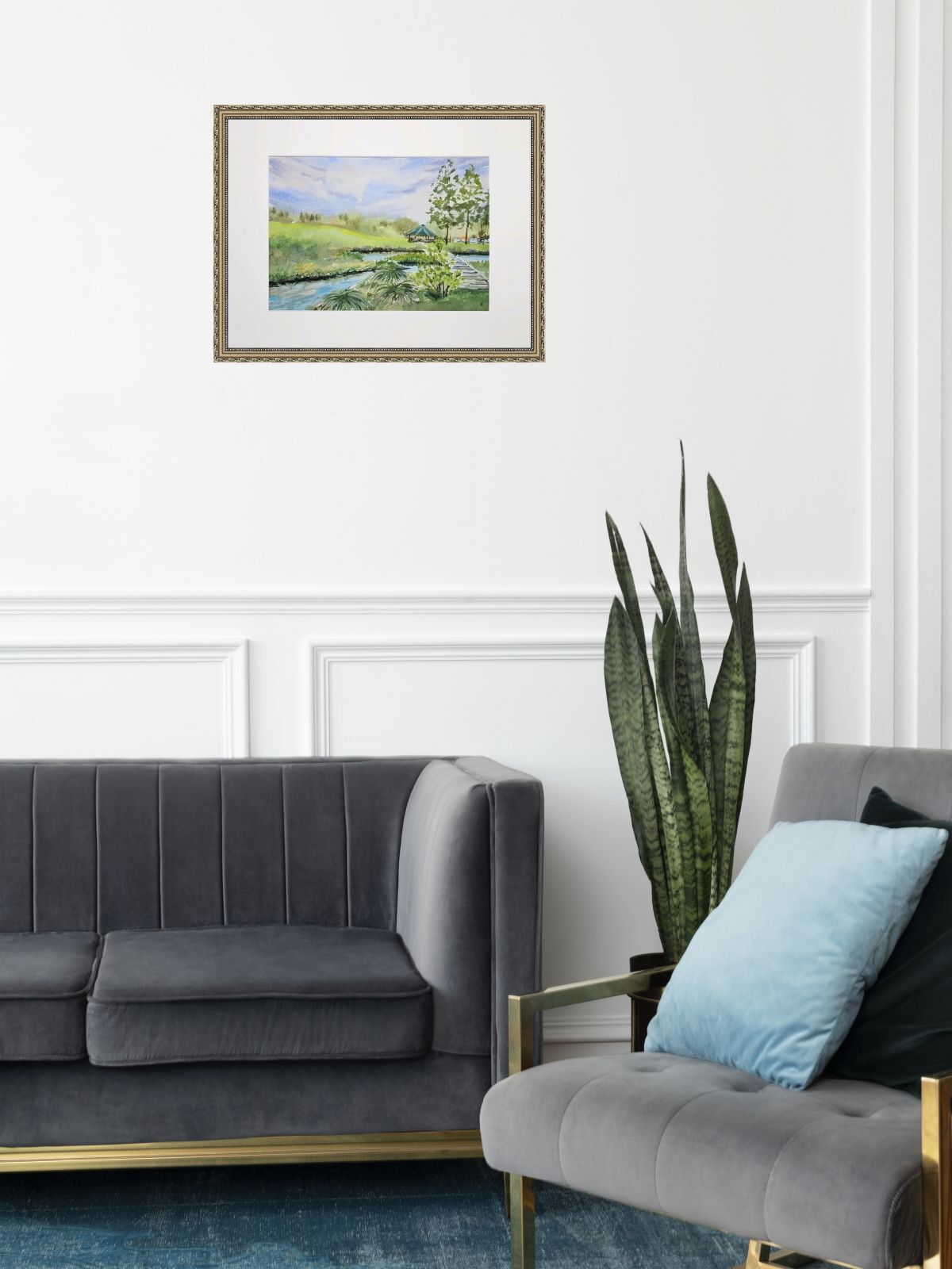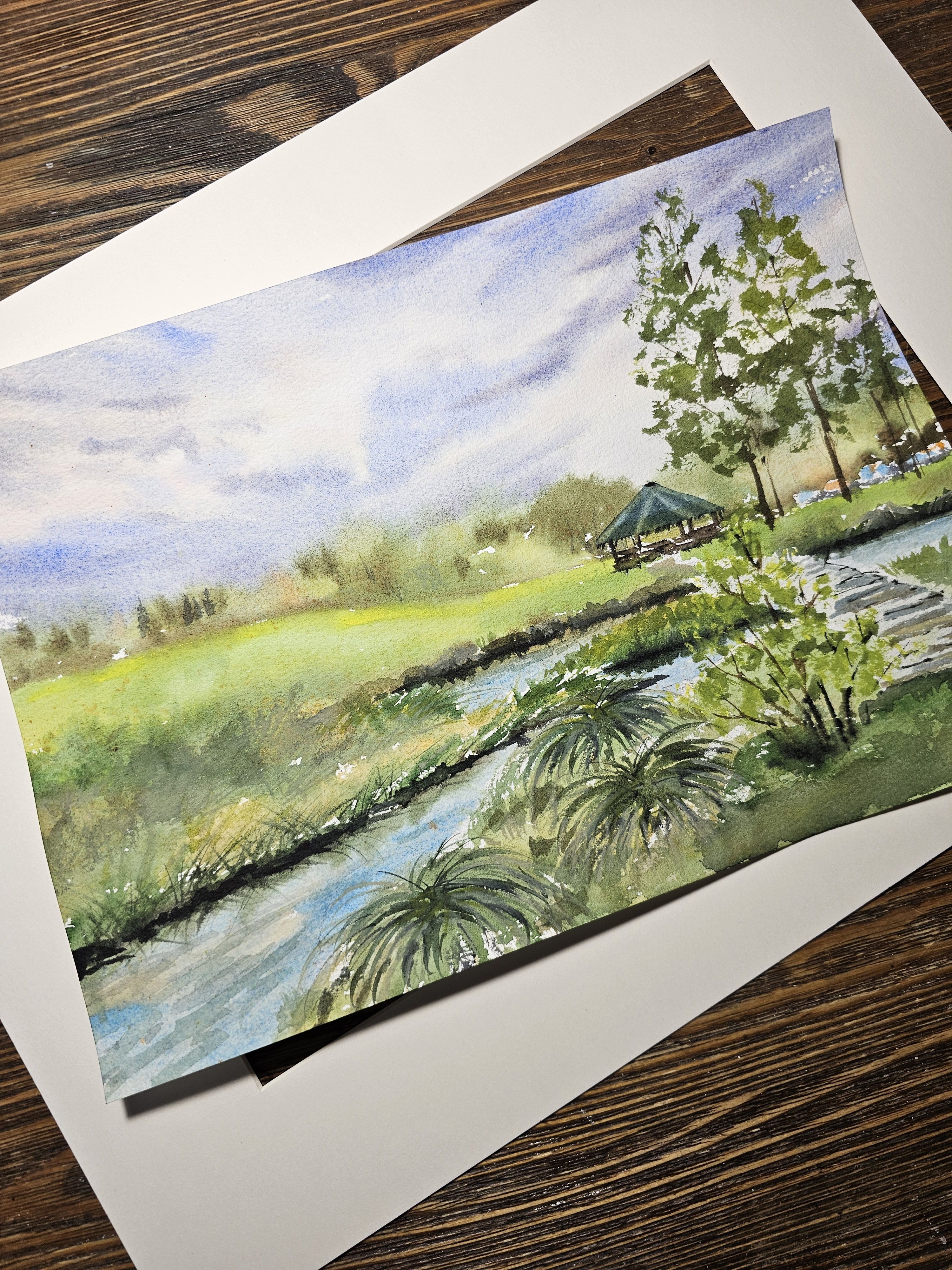 Нам представлена акварельная картина, изображающая пейзаж с зелёными полями и деревьями. В левой части картины находится извилистый поток воды реки Белка, который окружён растениями и кустарниками. В центре, на заднем плане, виден небольшой мостик, пересекающая пейзаж. Справа на картине находятся высокие деревья, а за ними угадывается небольшая постройка или беседка. Небо ясное, с небольшими облаками, создающее атмосферу спокойствия и умиротворения.