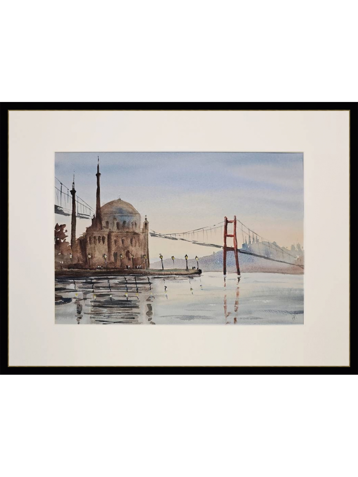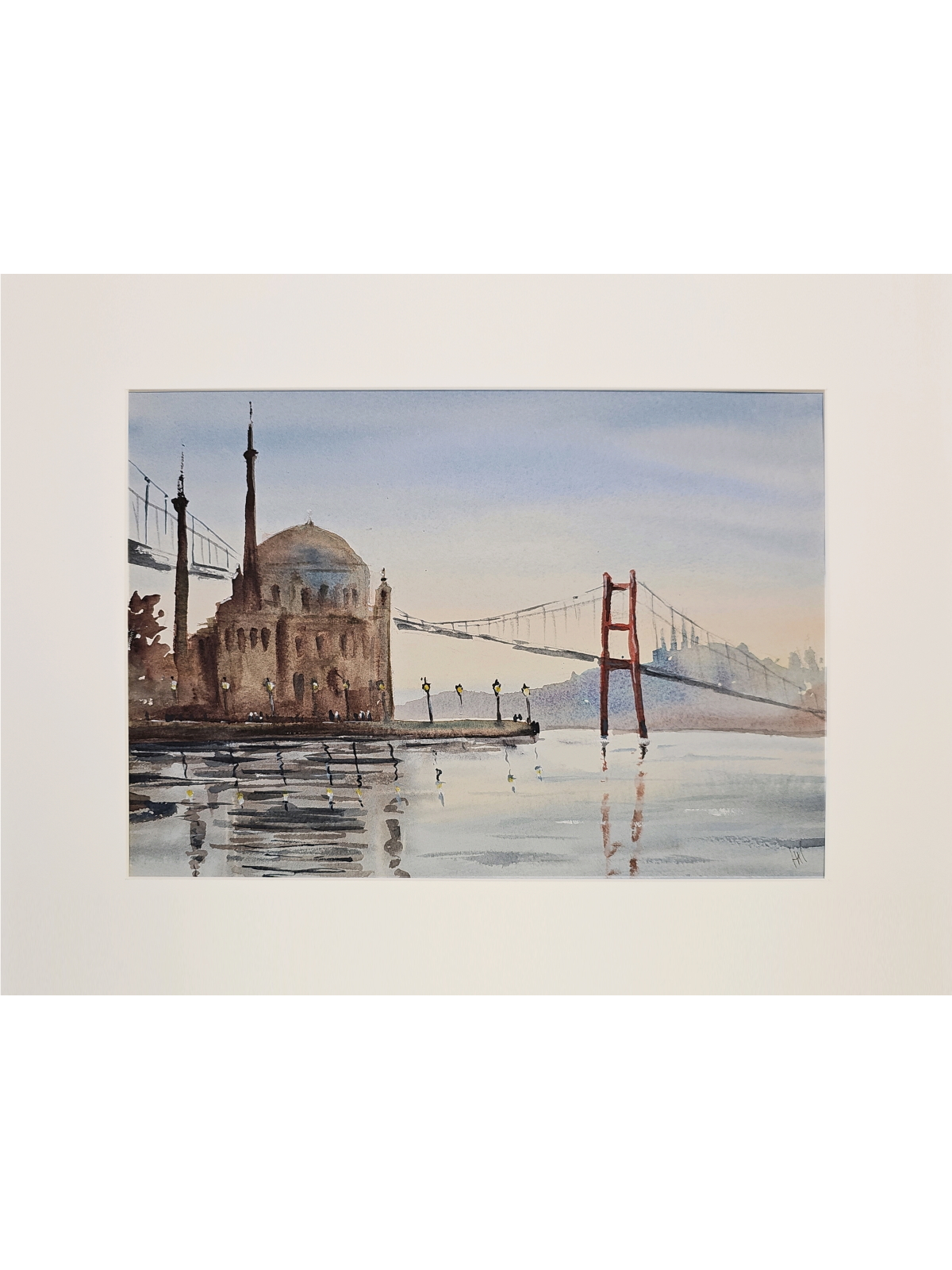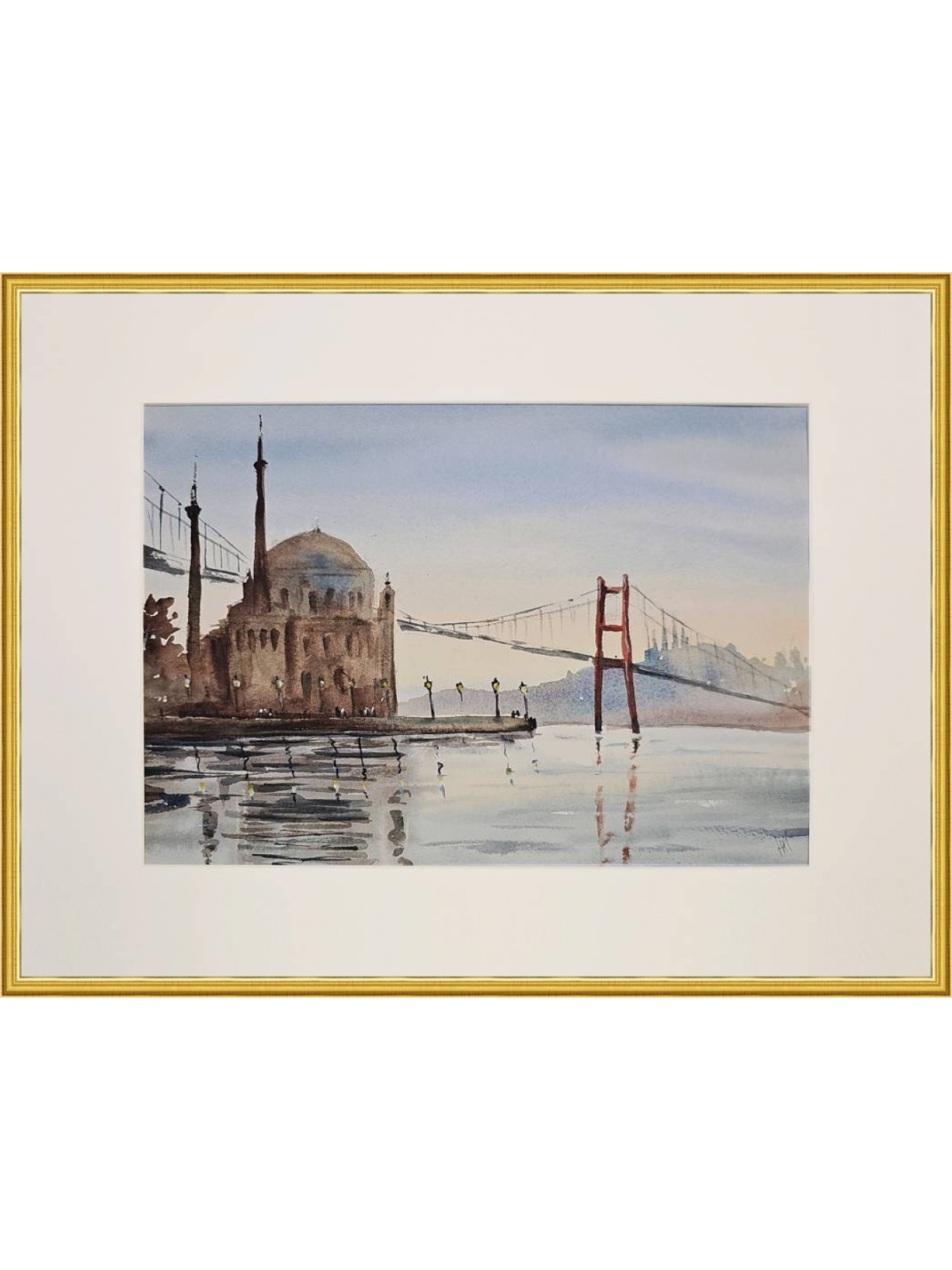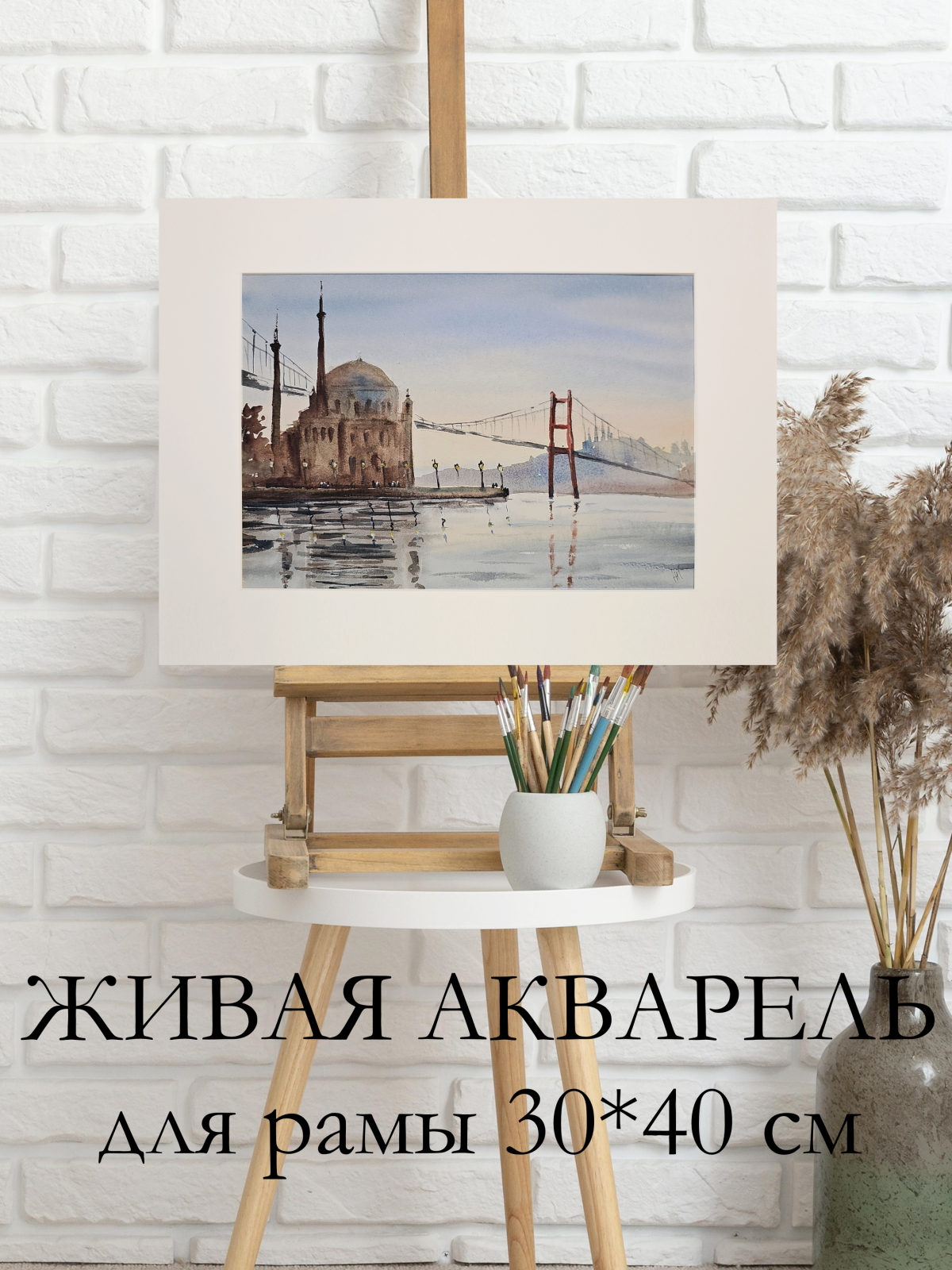 Нам представлена акварельная картина, изображающая архитектурный пейзаж. Слева находится здание с куполом и двумя минаретами, напоминающее мечеть. Справа виден подвесной мост, который пересекает водоем. На переднем плане изображена набережная с фонарями, а на заднем плане видны очертания города. Картина выполнена в мягких пастельных тонах, создавая атмосферу спокойствия и умиротворения. Работа оформлена в светлое паспарту и готова к размещению в стандартной раме 30*40 см.