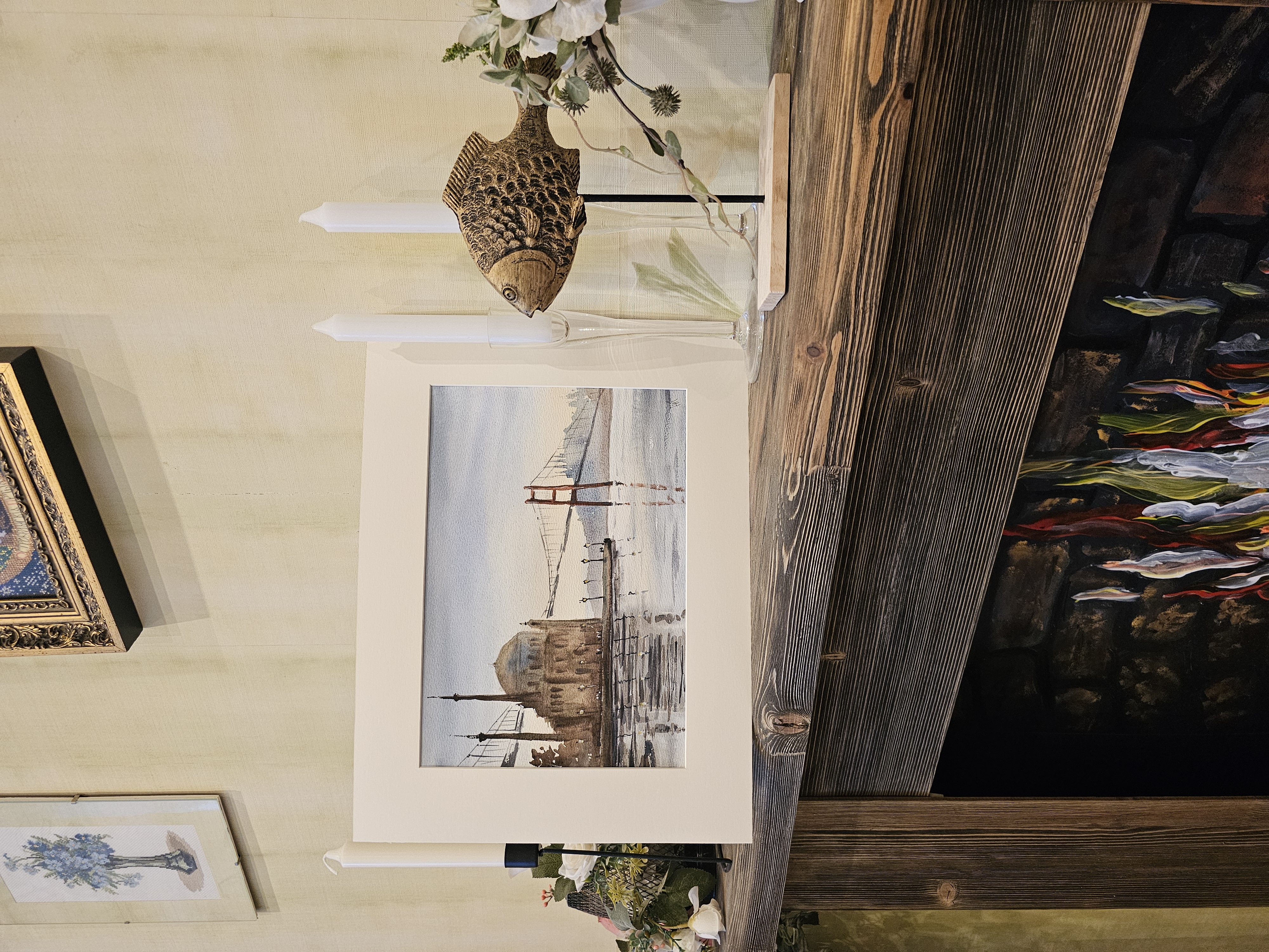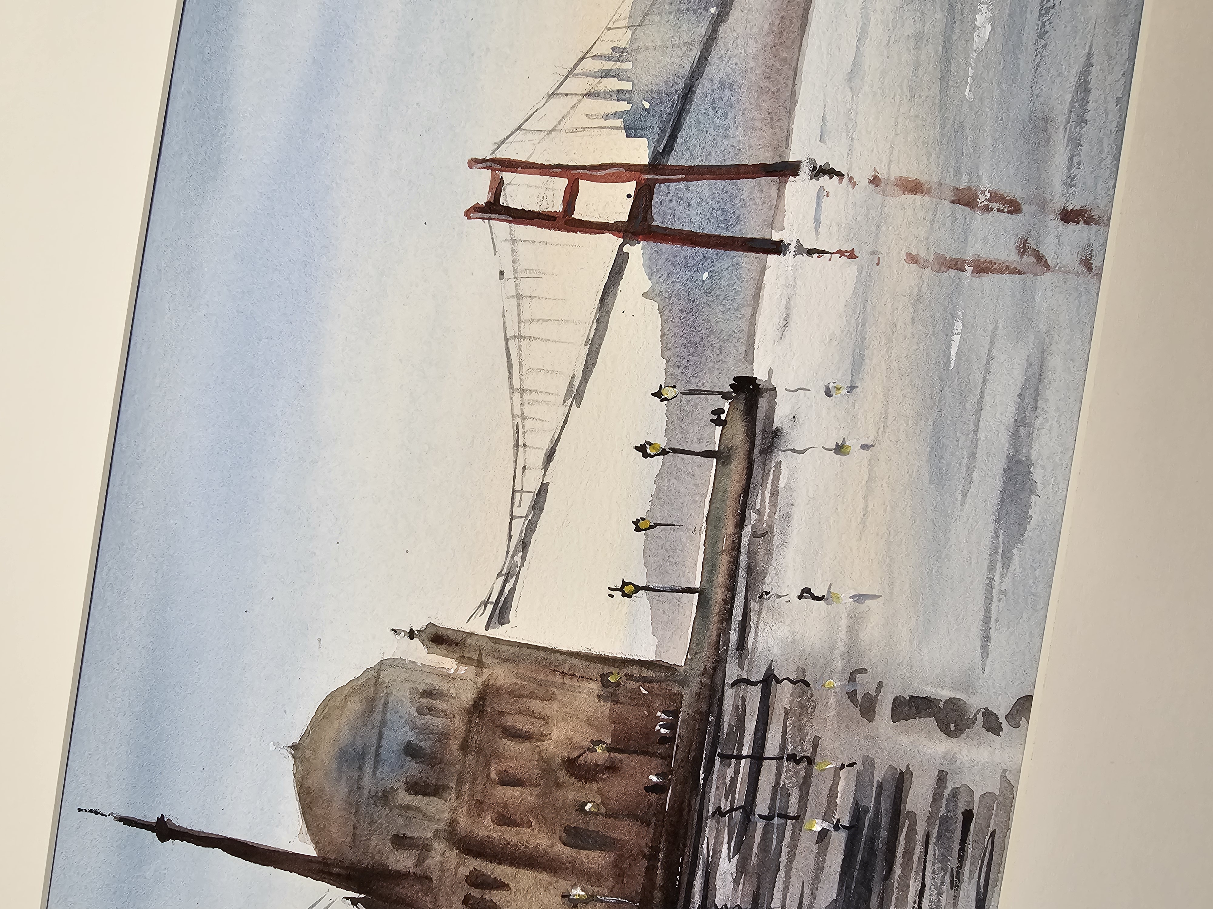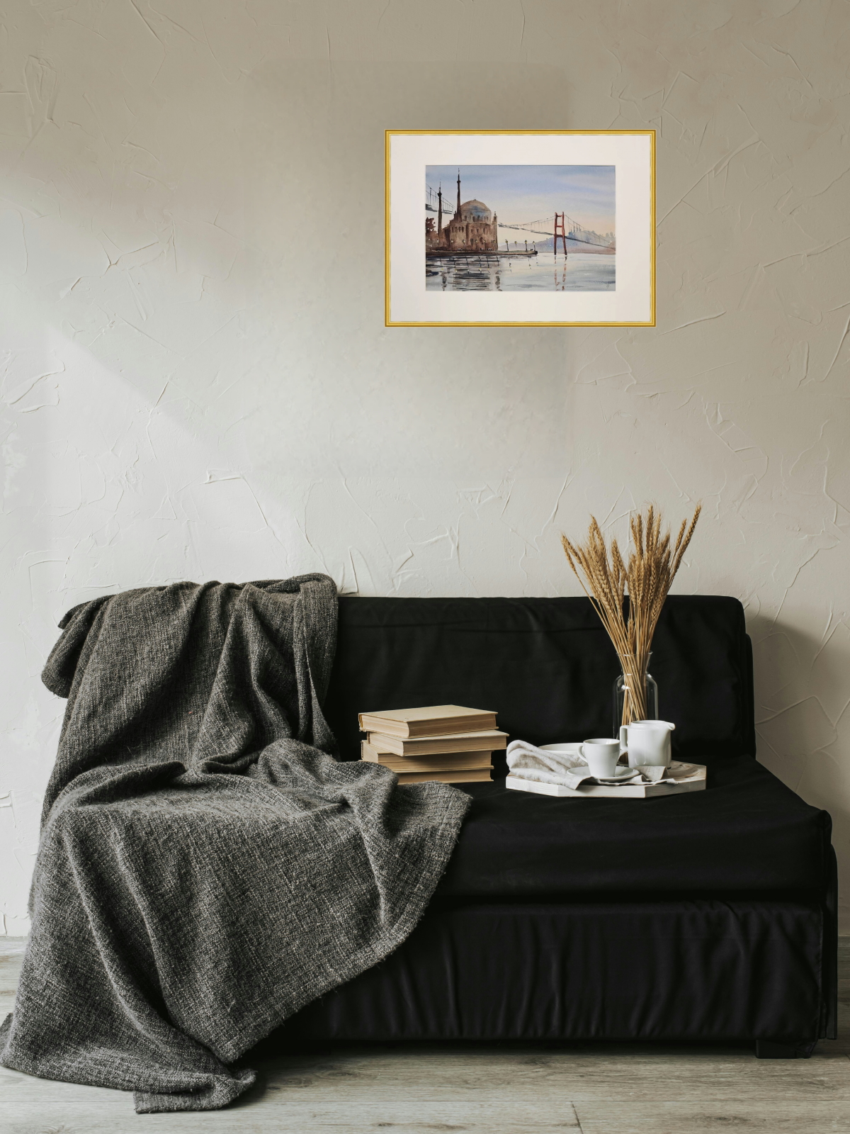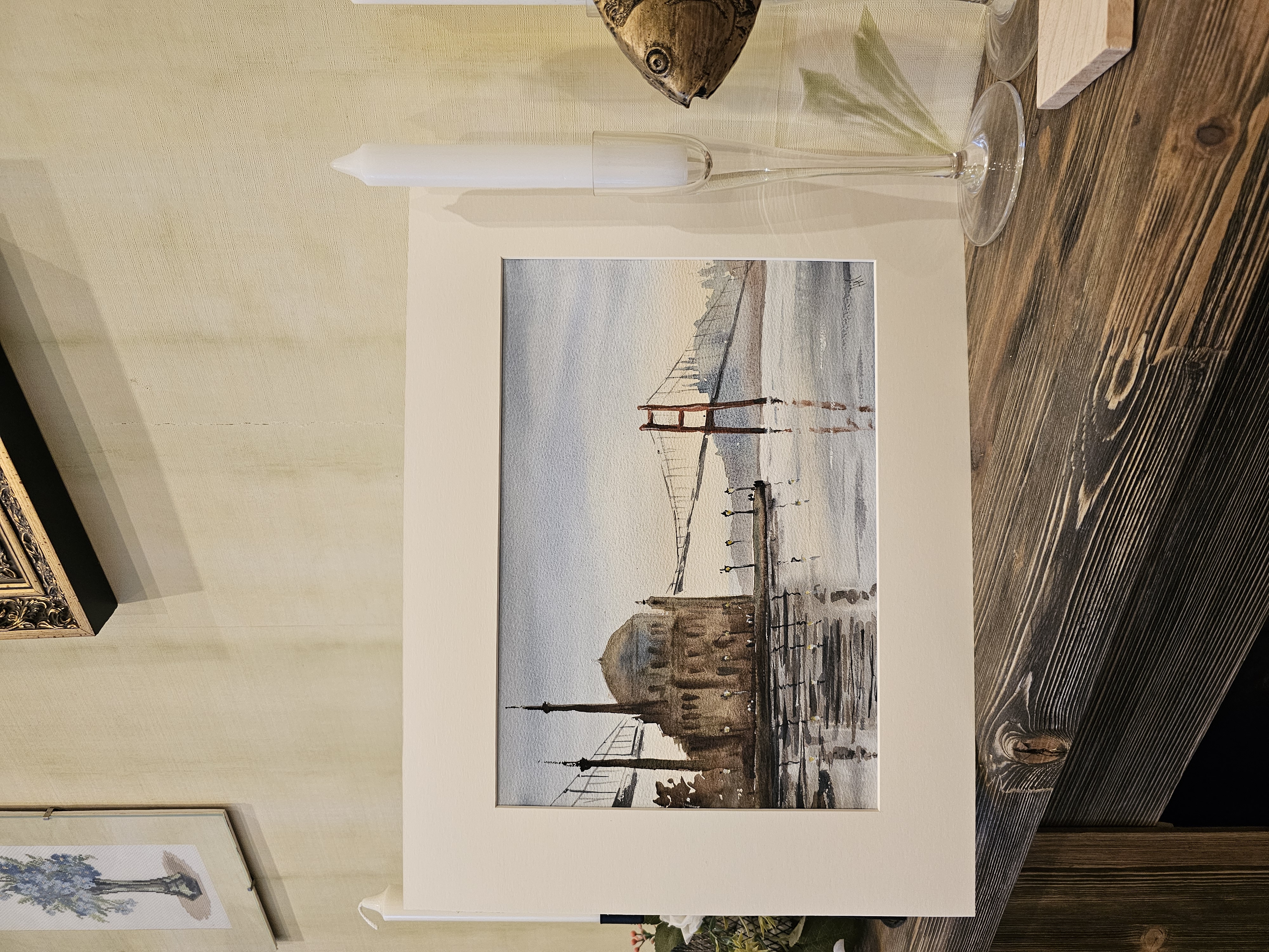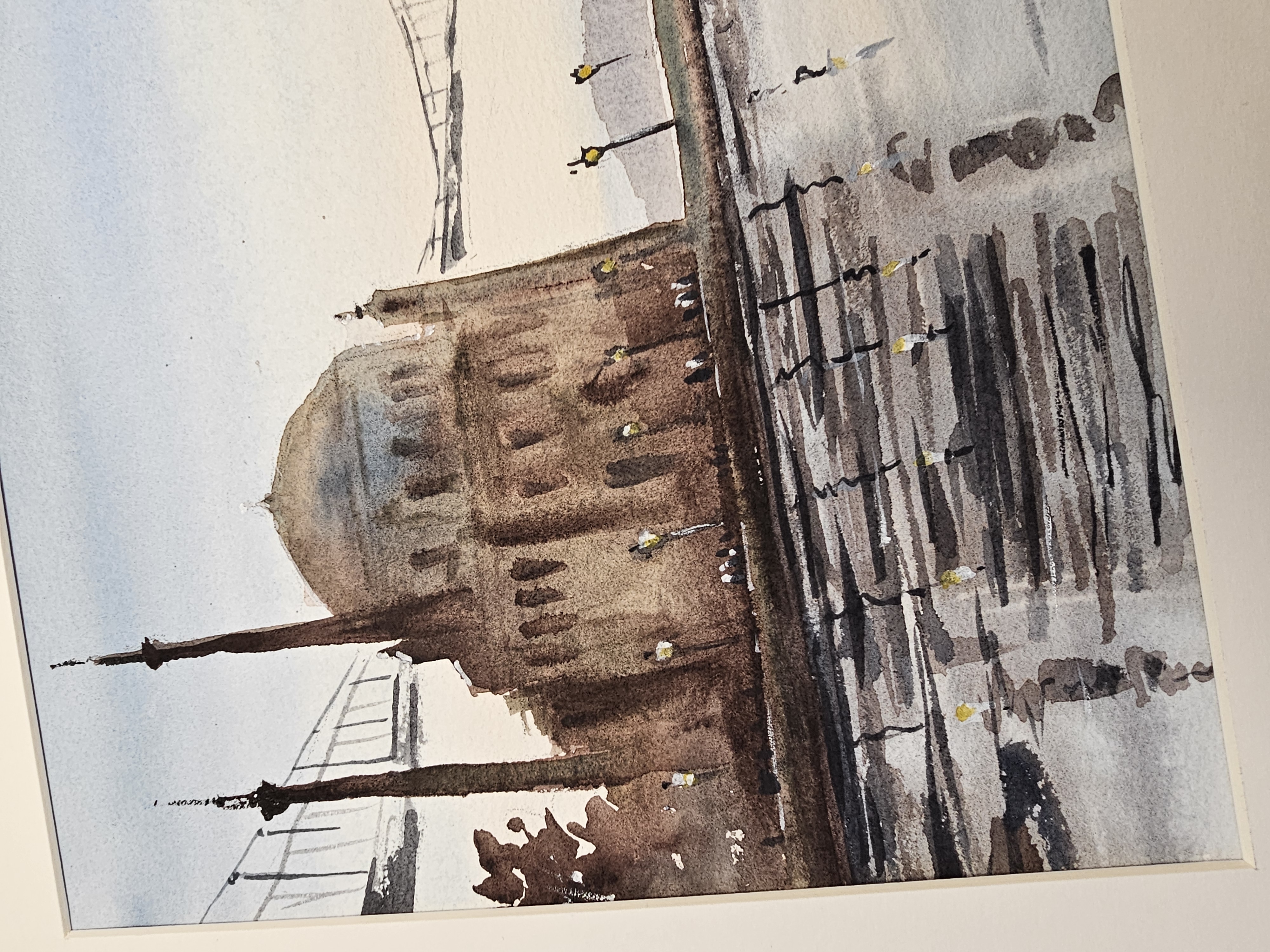 Нам представлена акварельная картина, изображающая архитектурный пейзаж. Слева находится здание с куполом и двумя минаретами, напоминающее мечеть. Справа виден подвесной мост, который пересекает водоем. На переднем плане изображена набережная с фонарями, а на заднем плане видны очертания города. Картина выполнена в мягких пастельных тонах, создавая атмосферу спокойствия и умиротворения. Работа оформлена в светлое паспарту и готова к размещению в стандартной раме 30*40 см.