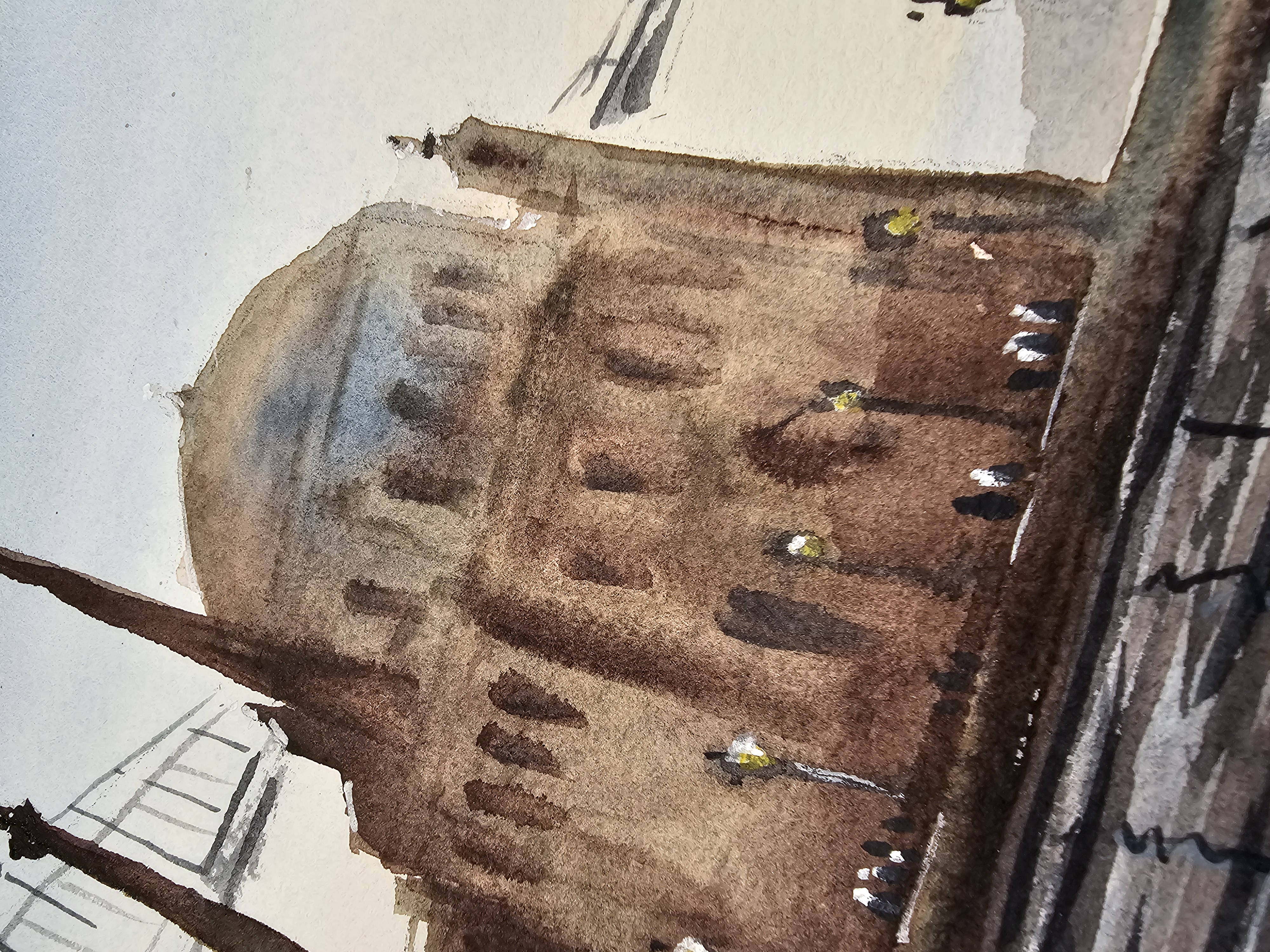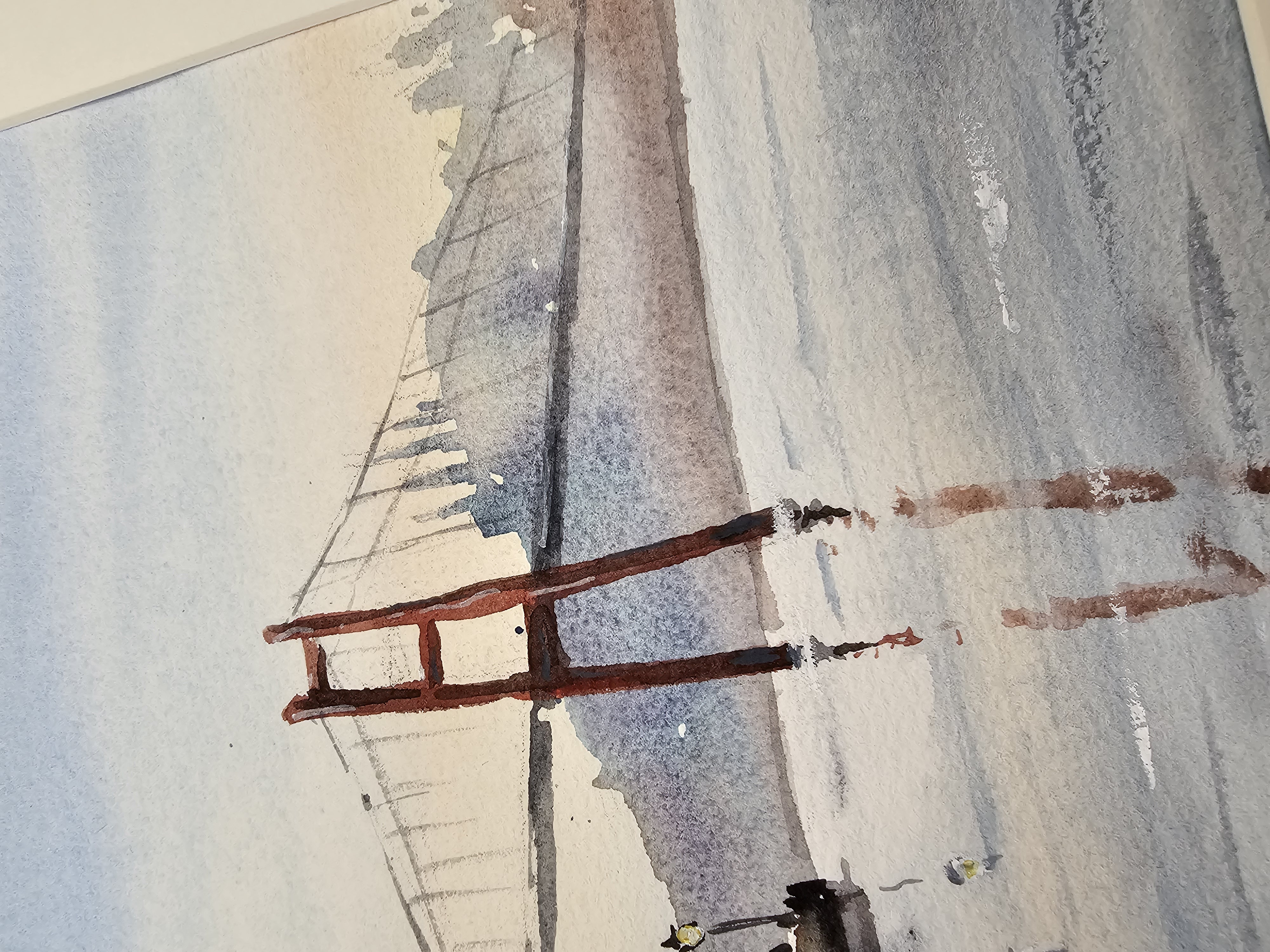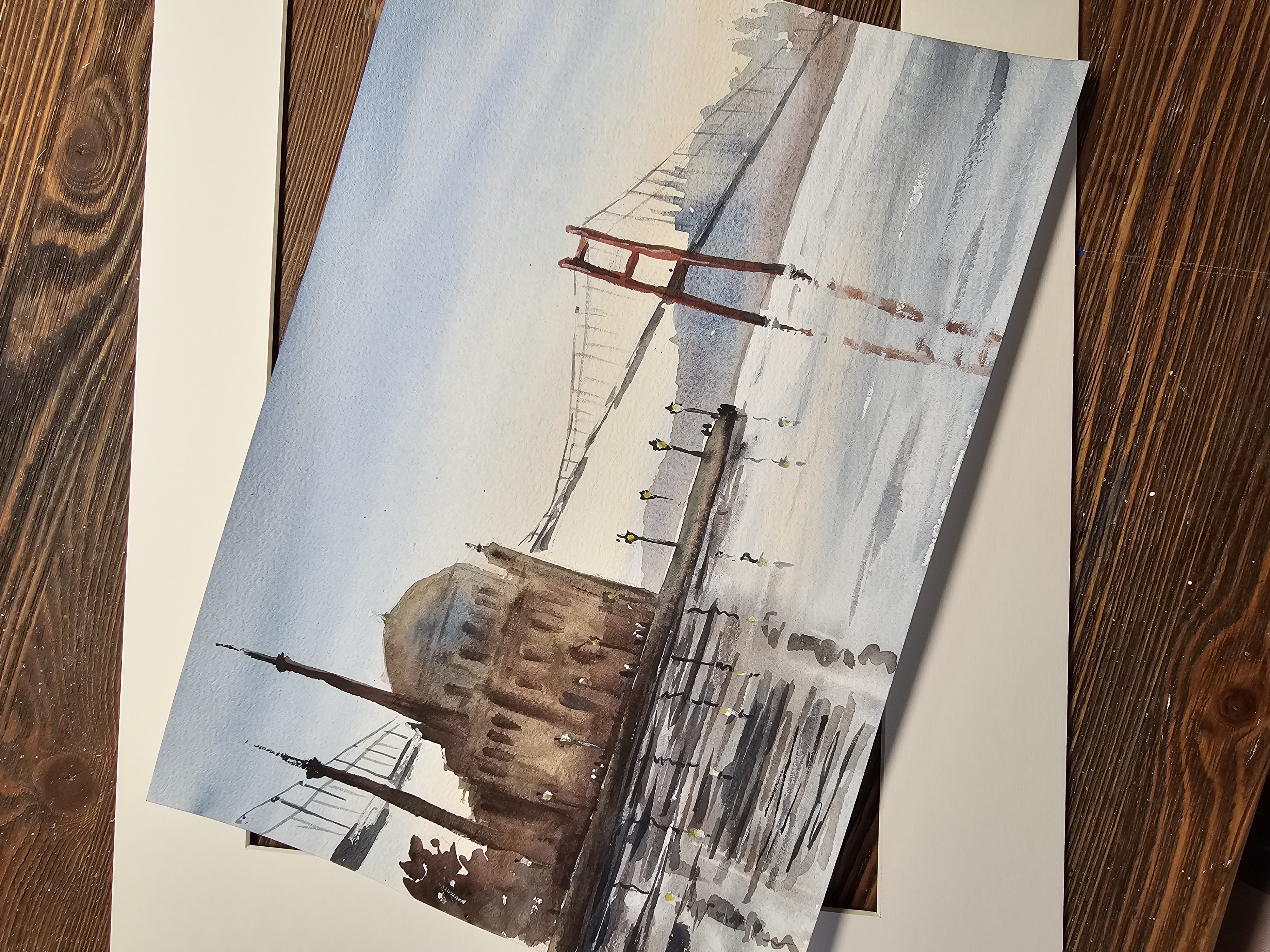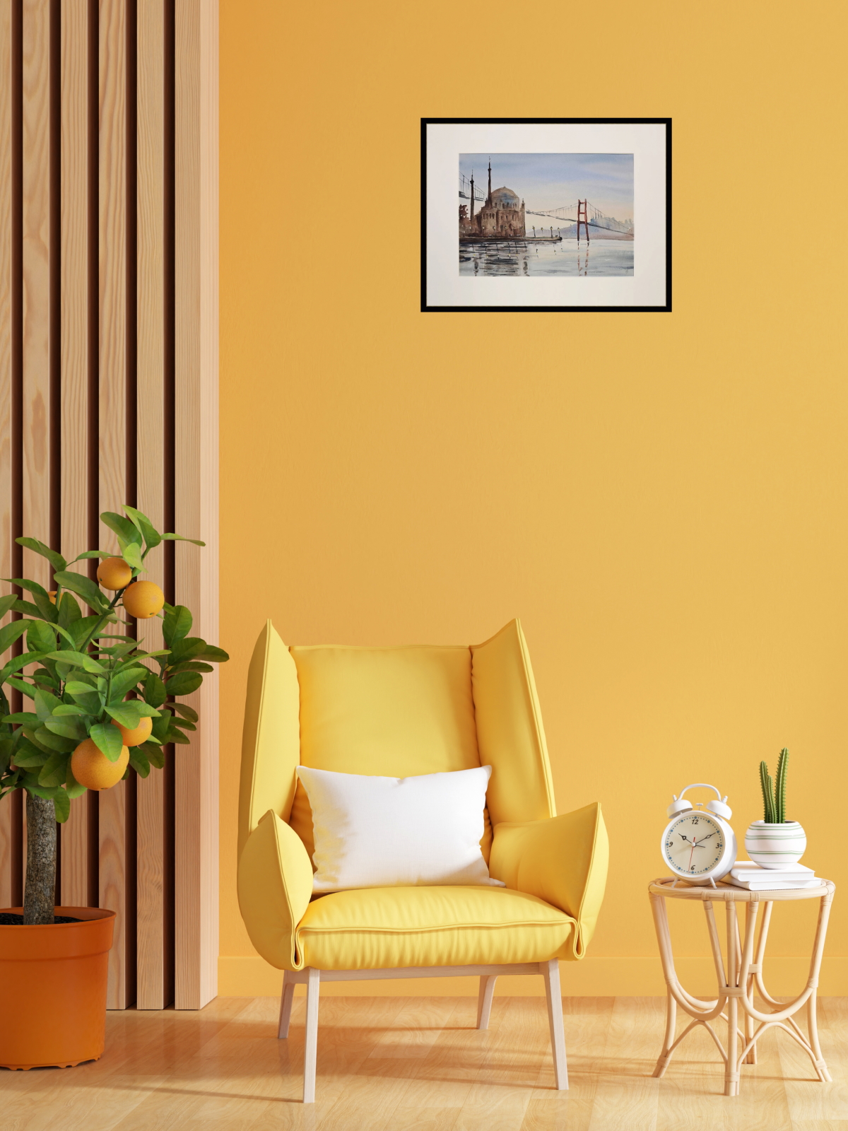 Нам представлена акварельная картина, изображающая архитектурный пейзаж. Слева находится здание с куполом и двумя минаретами, напоминающее мечеть. Справа виден подвесной мост, который пересекает водоем. На переднем плане изображена набережная с фонарями, а на заднем плане видны очертания города. Картина выполнена в мягких пастельных тонах, создавая атмосферу спокойствия и умиротворения. Работа оформлена в светлое паспарту и готова к размещению в стандартной раме 30*40 см.