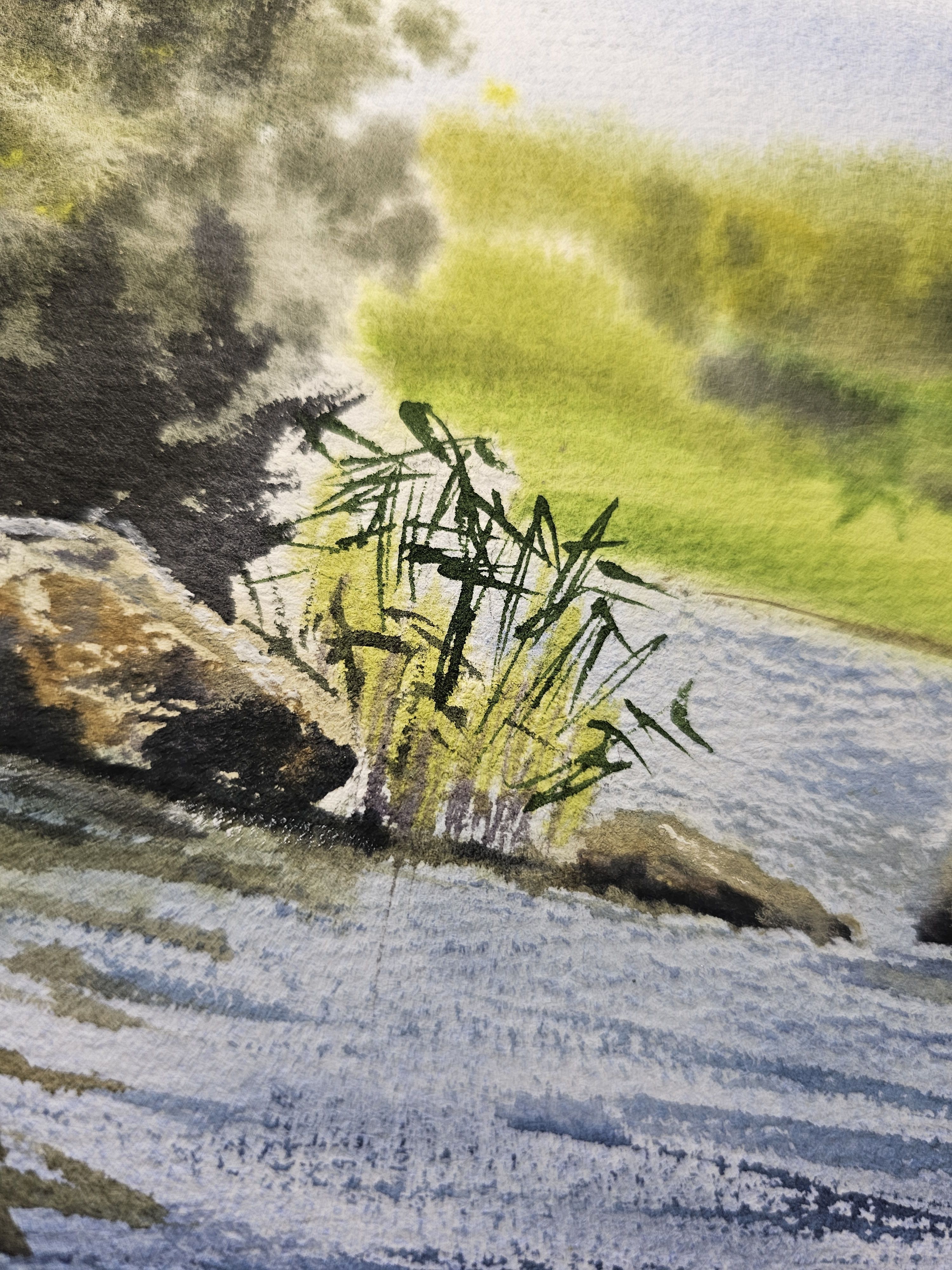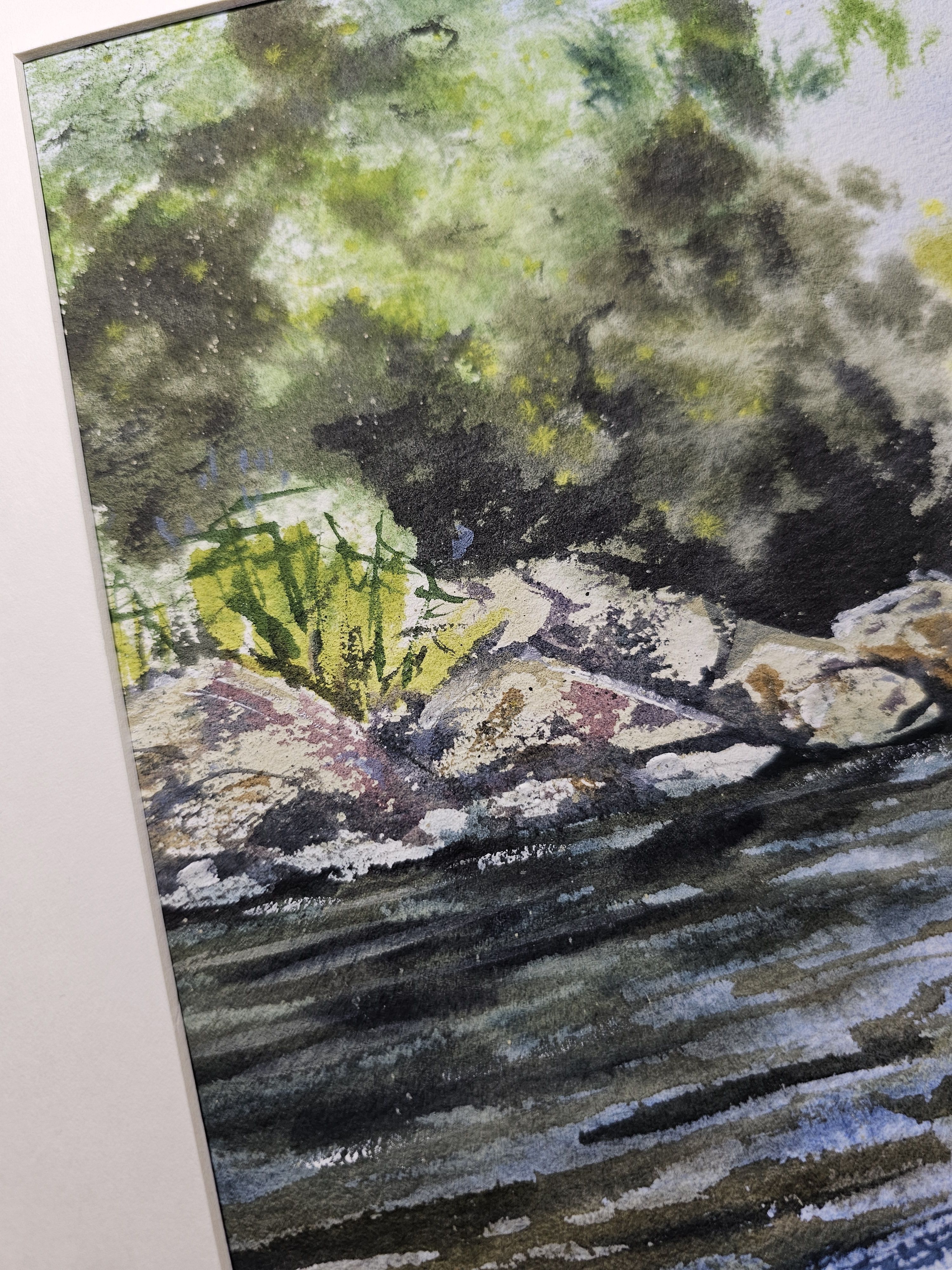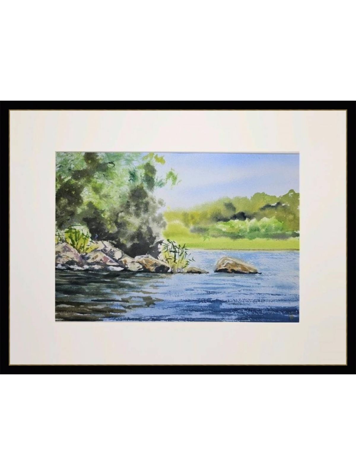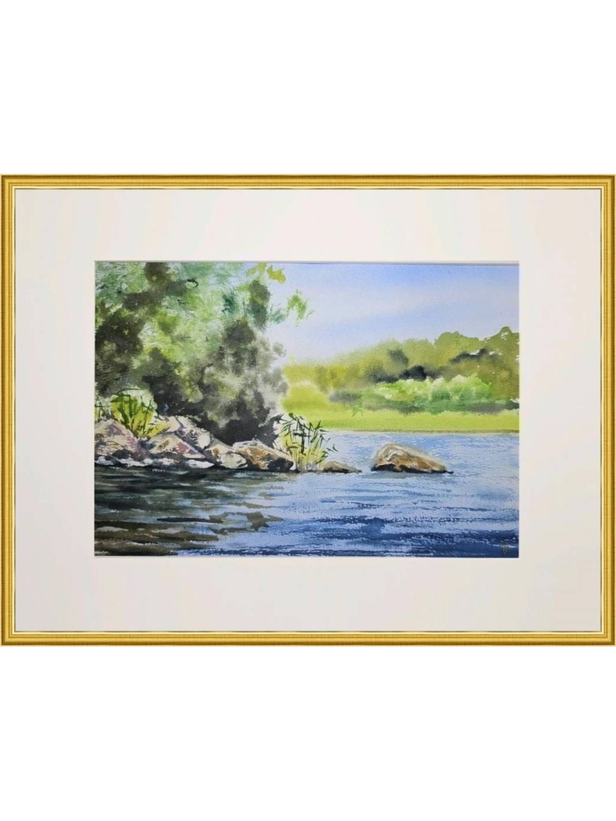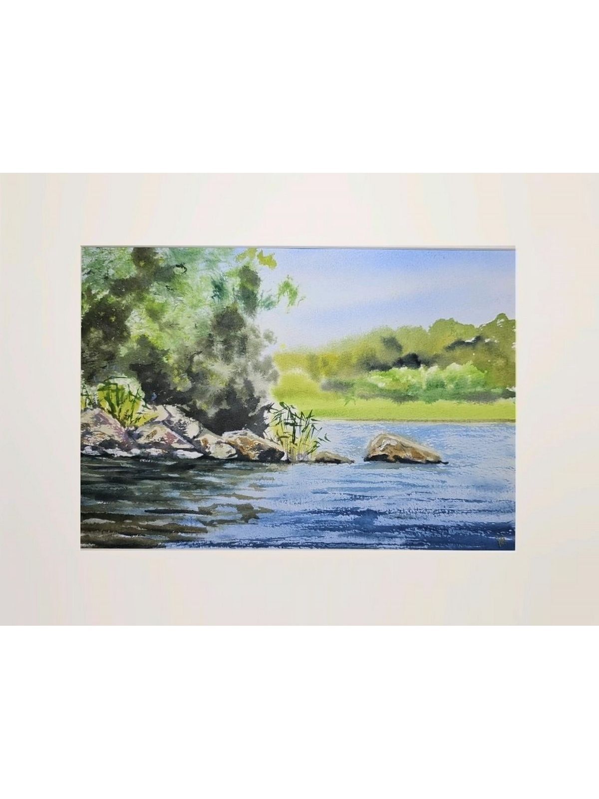 Нам представлена живописная сцена природы. Показана Ладога с голубой водой, отражающая небо. Берег украшен растительностью и камнями. На заднем плане виден густой зелёный лес. Картина передаёт ощущение спокойствия и уединённости, передавая красоту природного ландшафта. Работа оформлена в светлое паспарту и готово для размещения в раме стандартного размера.