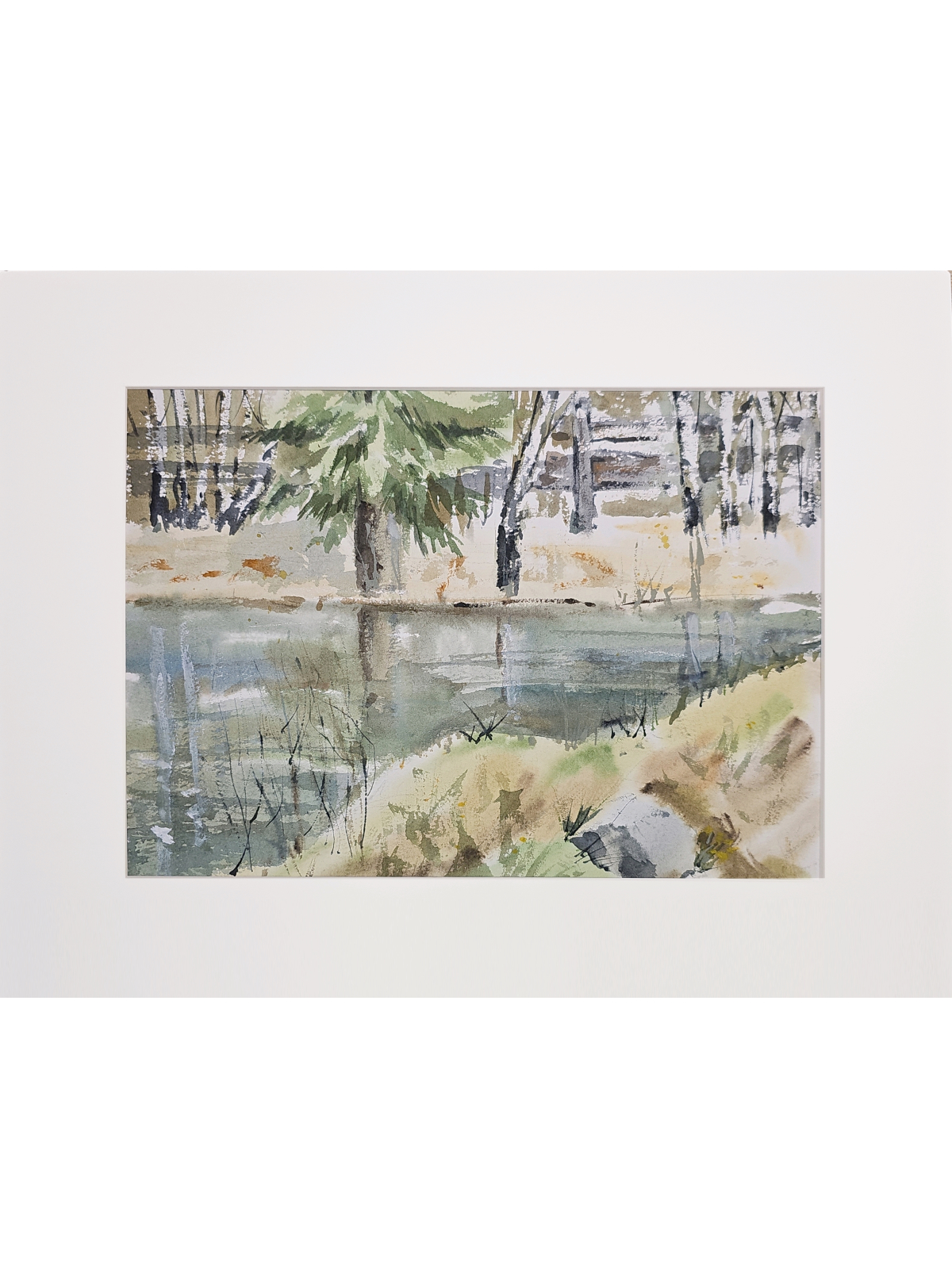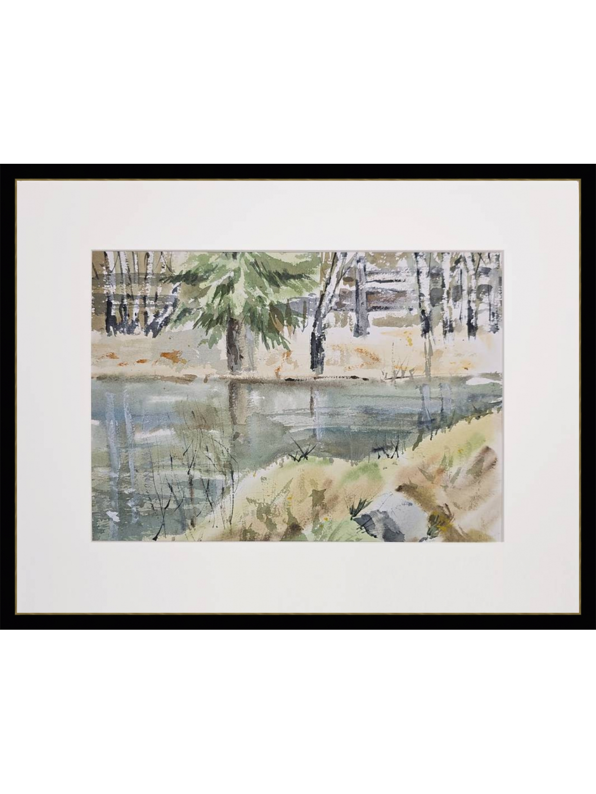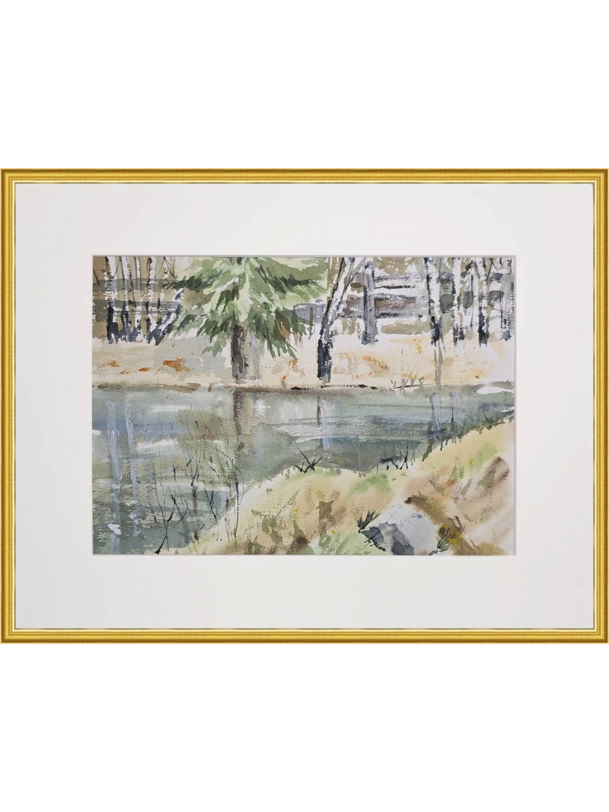 Нам представлена акварельная картина с пейзажем. В центре композиции находится водоём, отражающий окружающую природу. На переднем плане видна трава и кустарники, которые слегка наклонены к воде. На заднем плане изображены деревья, среди которых выделяется большое хвойное дерево. Фон выполнен в мягких и приглушённых тонах, создавая атмосферу спокойствия и умиротворения. Работа оформлена в светлое паспарту и готова к размещению в стандартной раме 30*40 см.