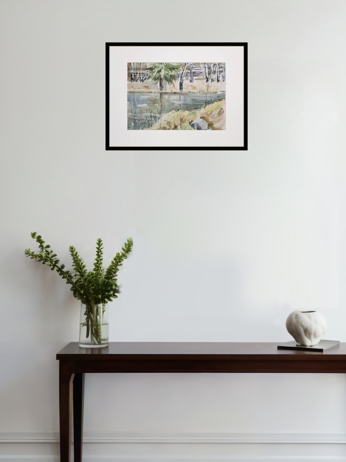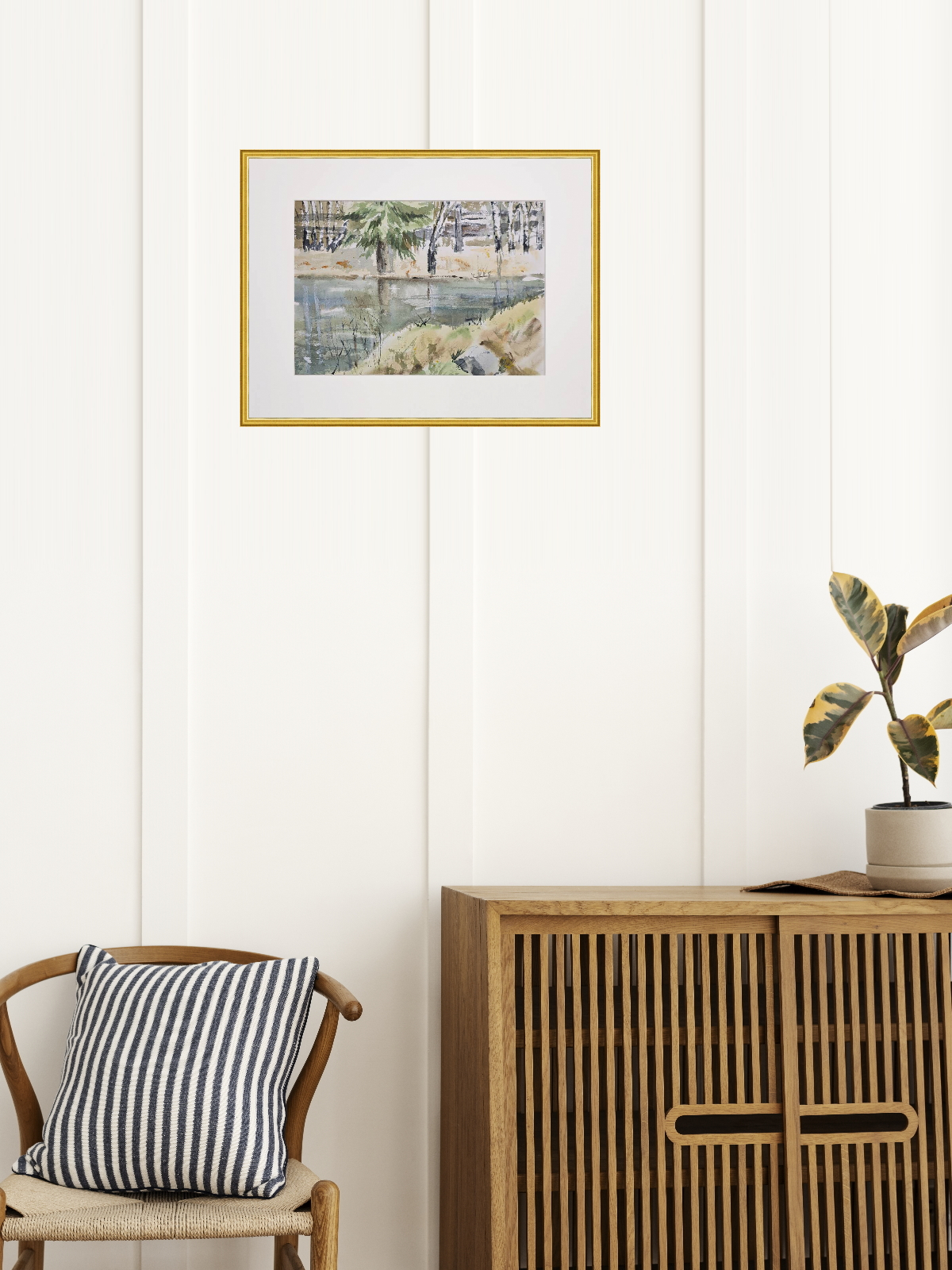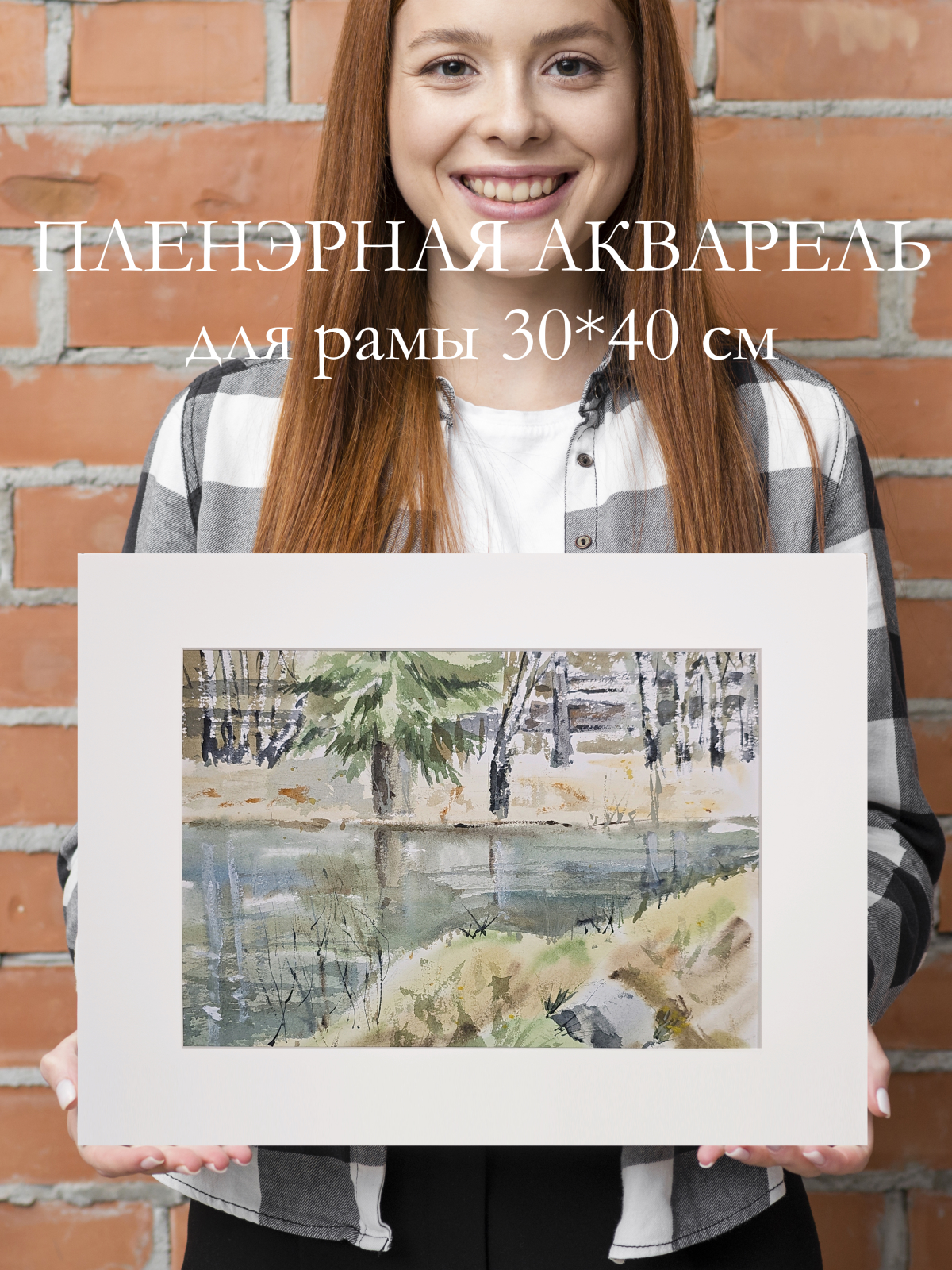 Нам представлена акварельная картина с пейзажем. В центре композиции находится водоём, отражающий окружающую природу. На переднем плане видна трава и кустарники, которые слегка наклонены к воде. На заднем плане изображены деревья, среди которых выделяется большое хвойное дерево. Фон выполнен в мягких и приглушённых тонах, создавая атмосферу спокойствия и умиротворения. Работа оформлена в светлое паспарту и готова к размещению в стандартной раме 30*40 см.