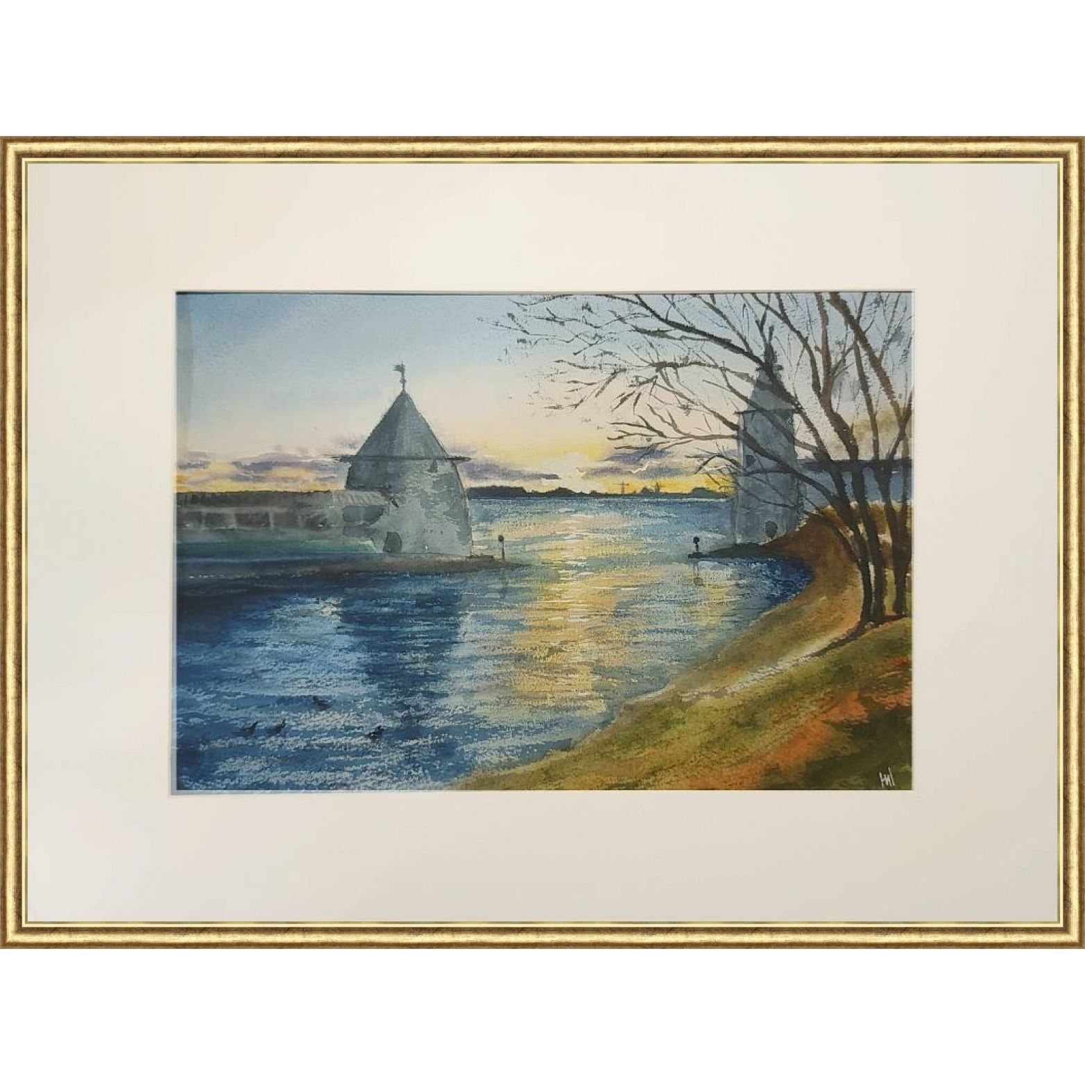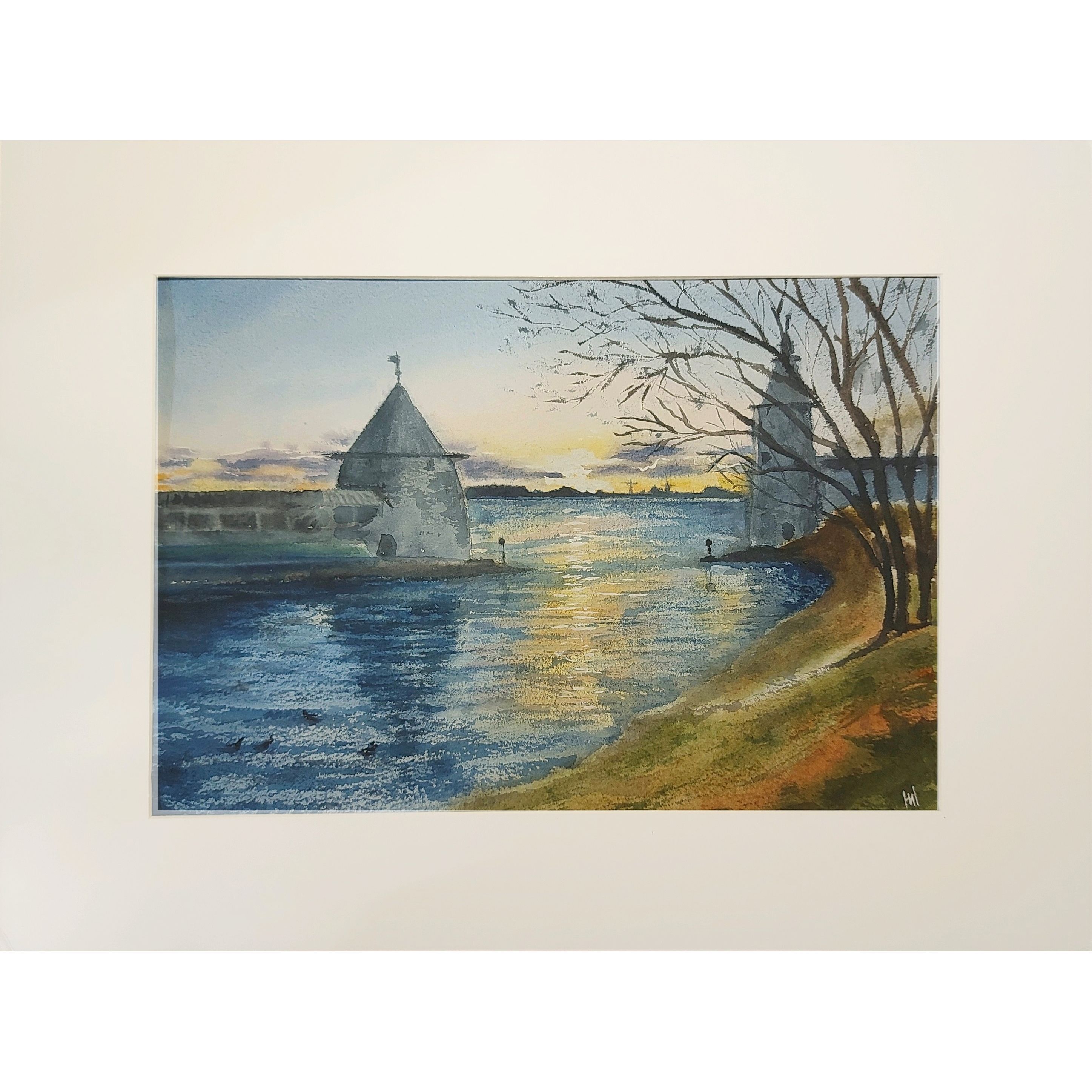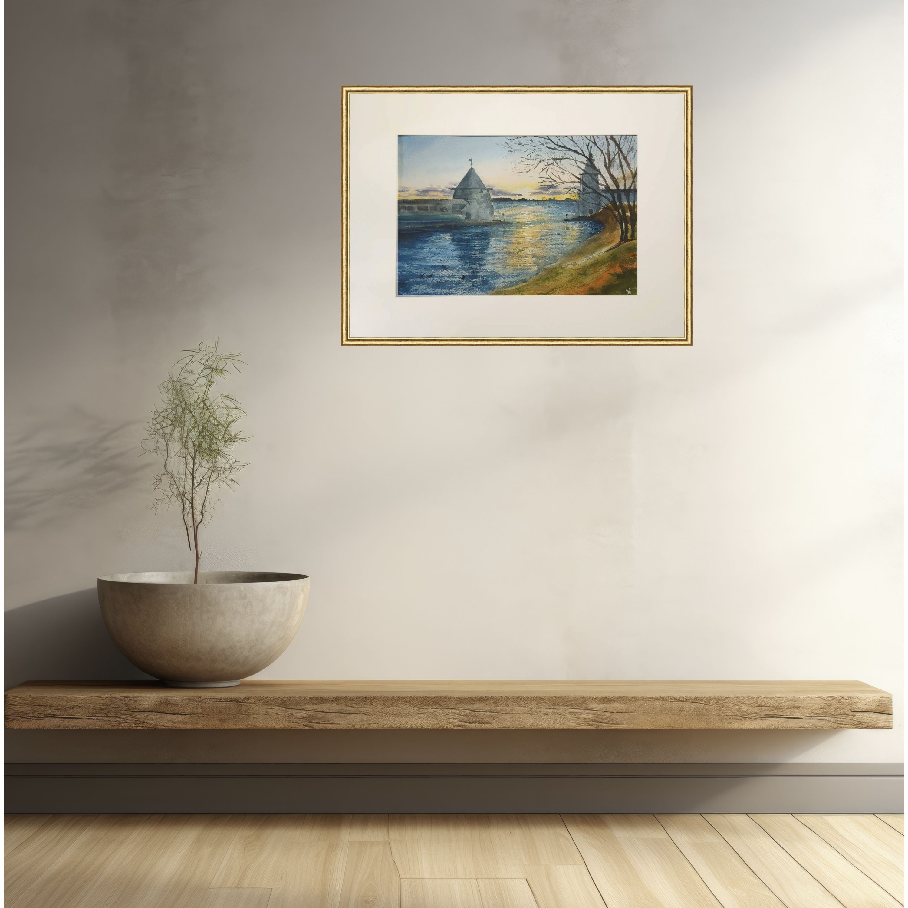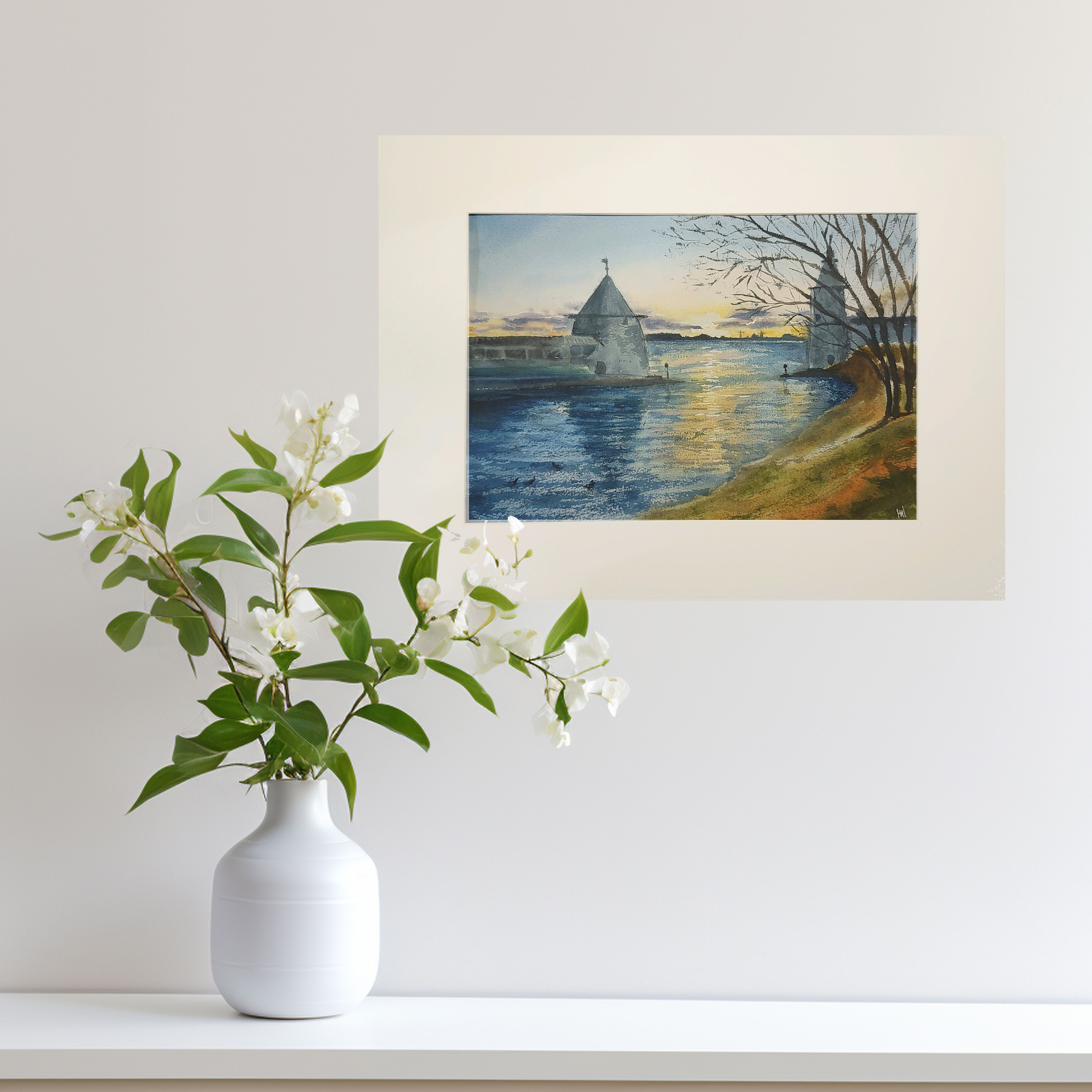 Перед нами художественная картина, изображающая пейзаж на закате. На переднем плане - две башни с конусообразными крышами, расположенные по обе стороны водоема. Вода отражает закатное небо, создавая золотистые блики на поверхности. На правой стороне картины виден берег с деревьями без листьев, что может указывать на осеннее время года. Картина выполнена в спокойных, приглушенных тонах, придавая сцене умиротворяющую атмосферу.