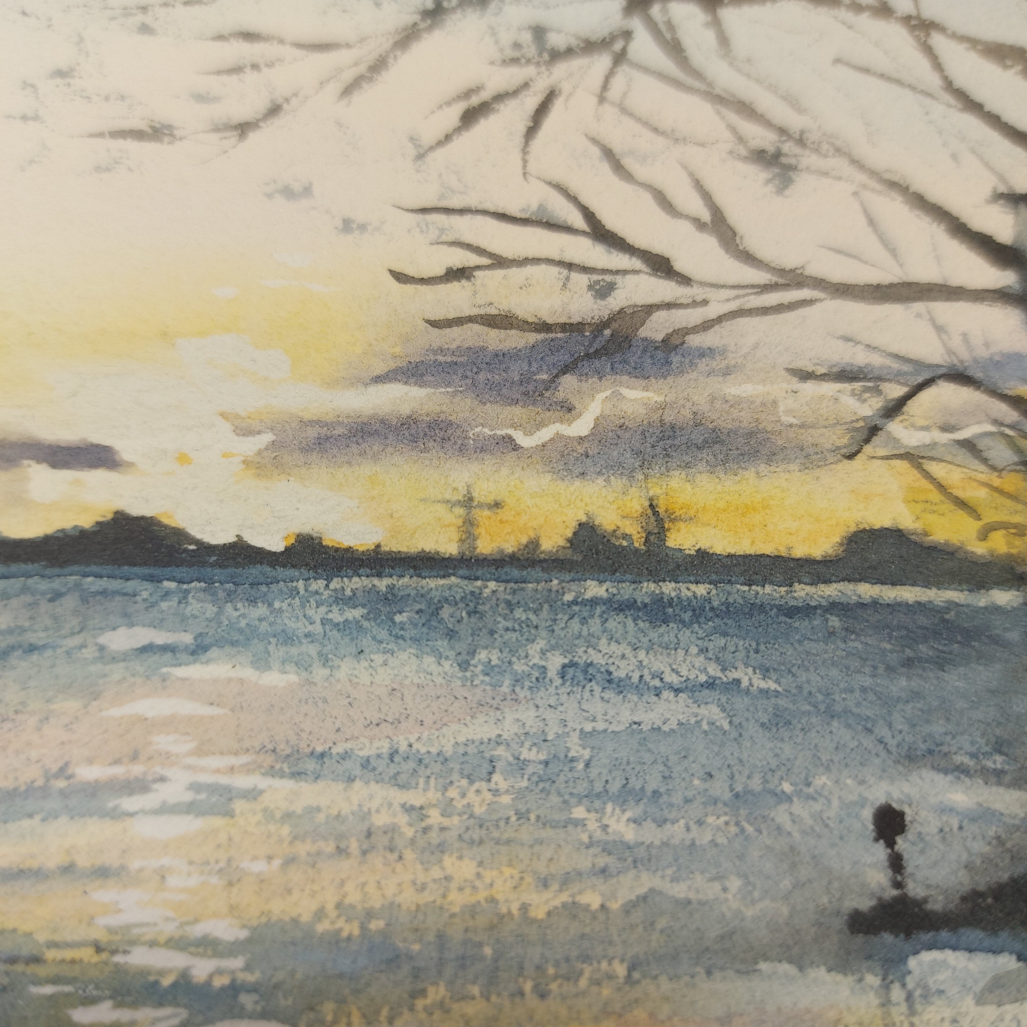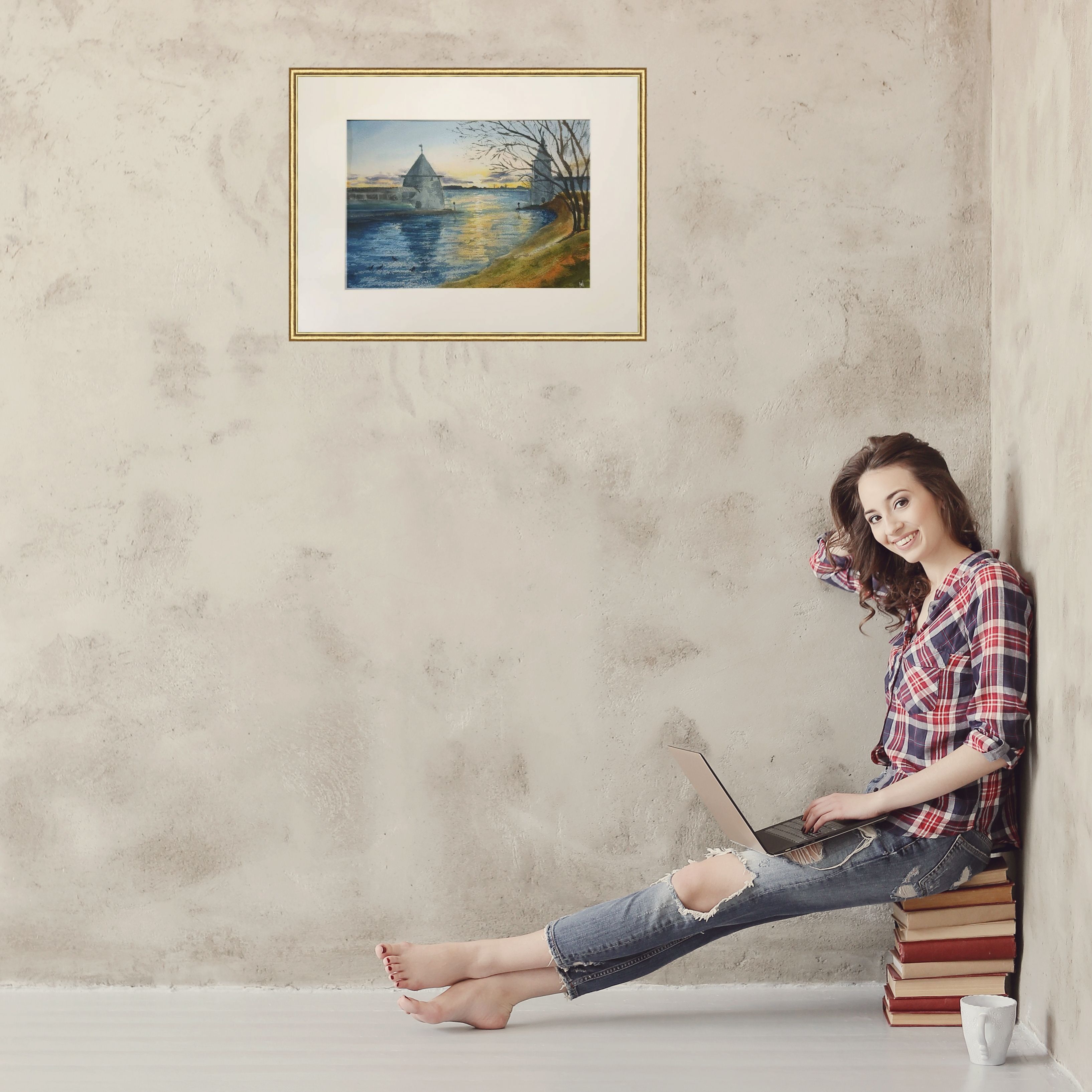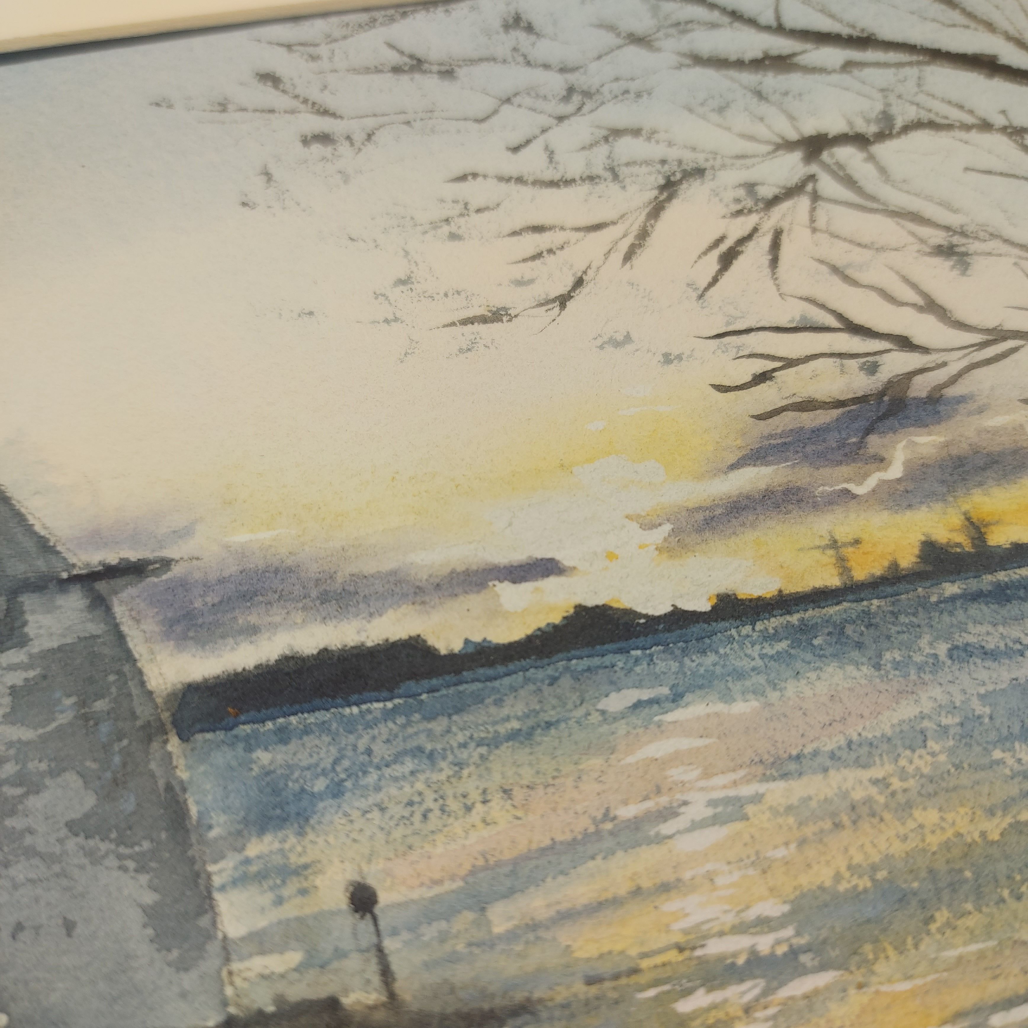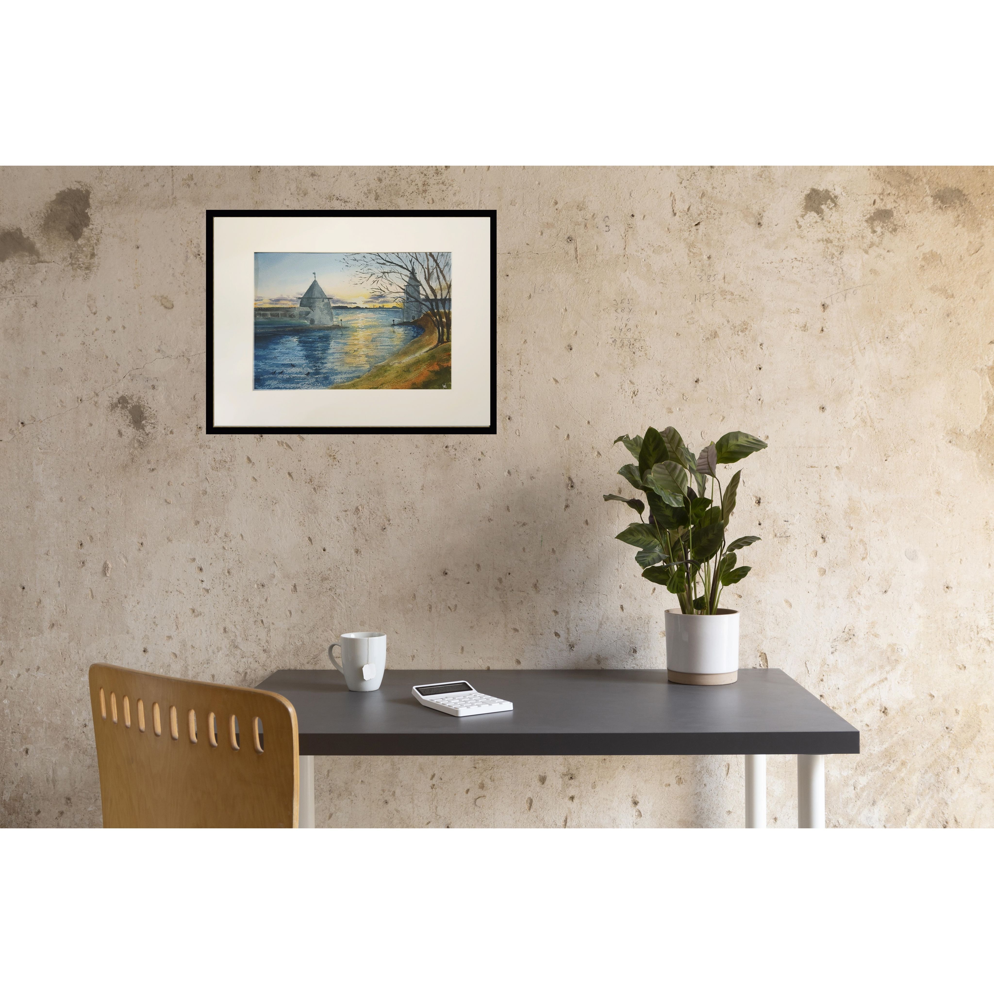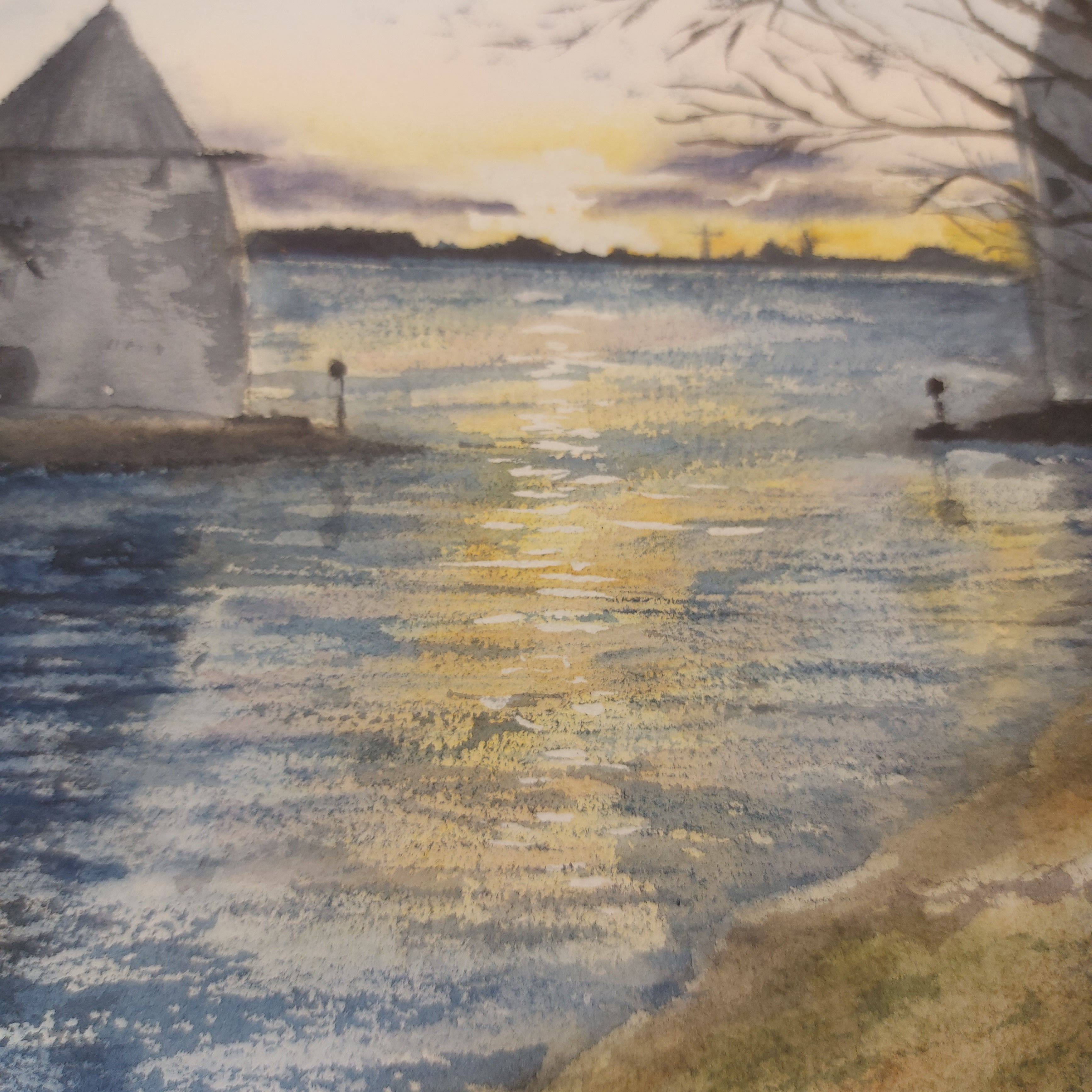 Перед нами художественная картина, изображающая пейзаж на закате. На переднем плане - две башни с конусообразными крышами, расположенные по обе стороны водоема. Вода отражает закатное небо, создавая золотистые блики на поверхности. На правой стороне картины виден берег с деревьями без листьев, что может указывать на осеннее время года. Картина выполнена в спокойных, приглушенных тонах, придавая сцене умиротворяющую атмосферу.