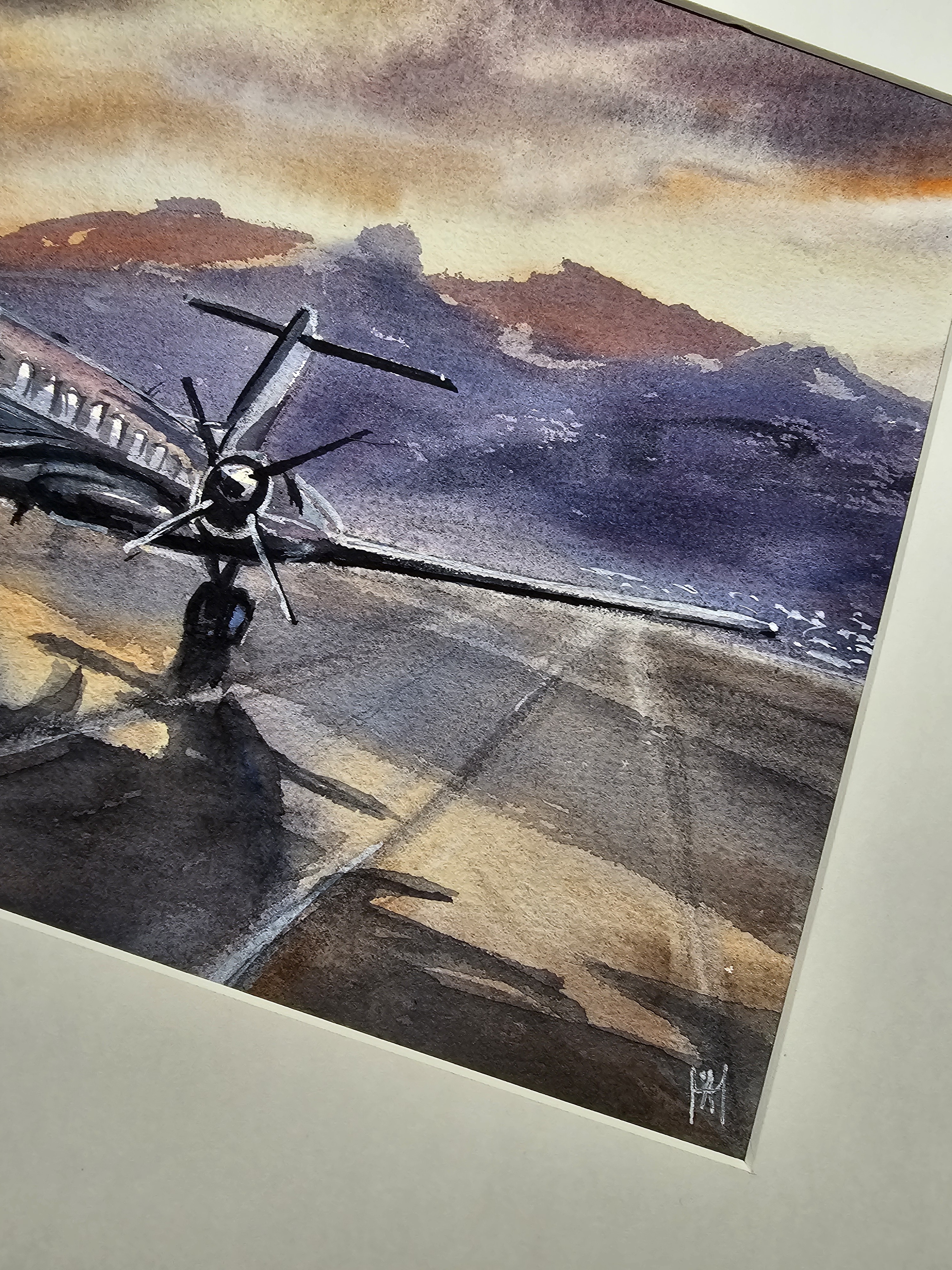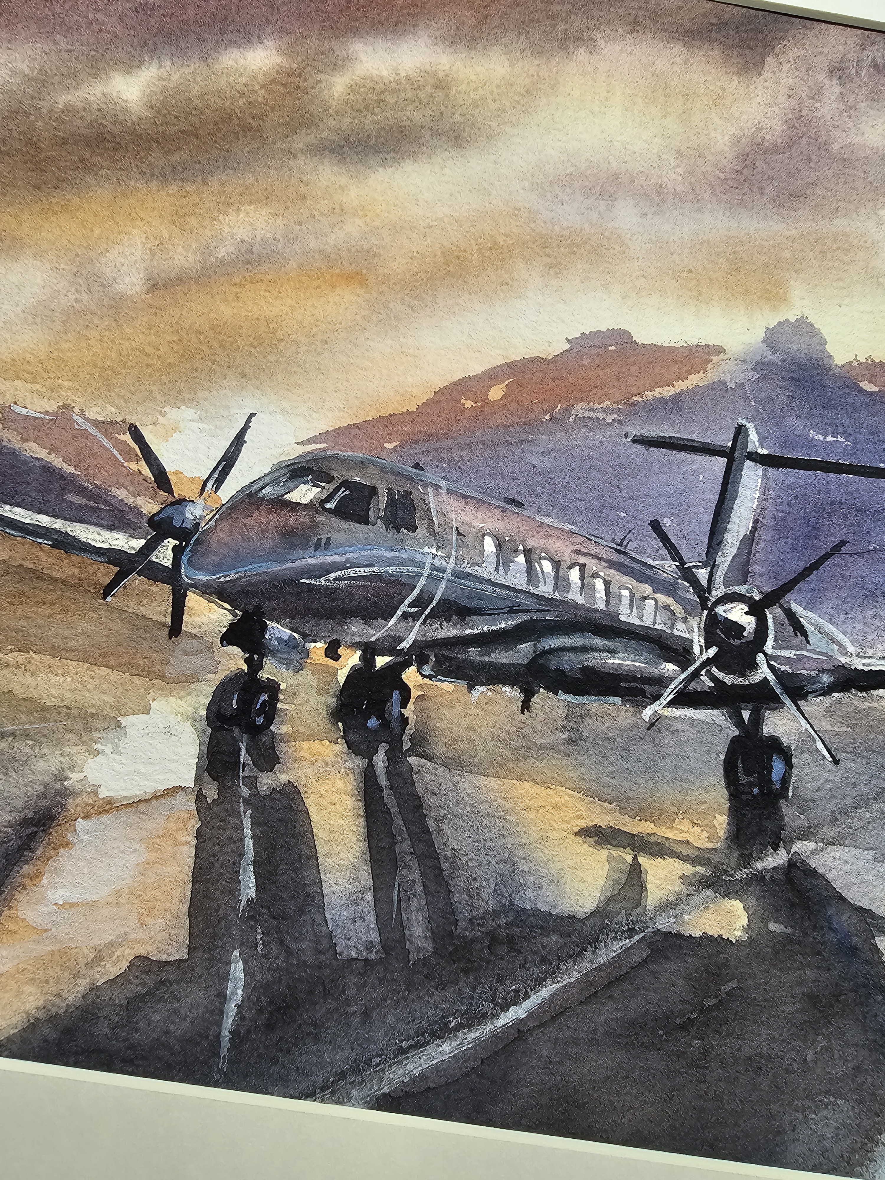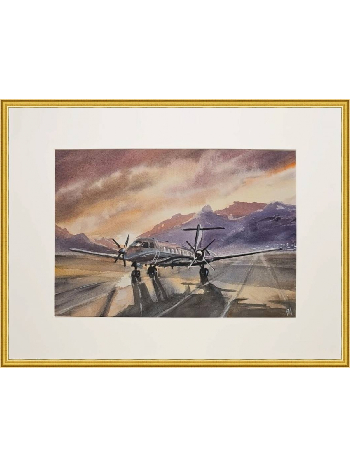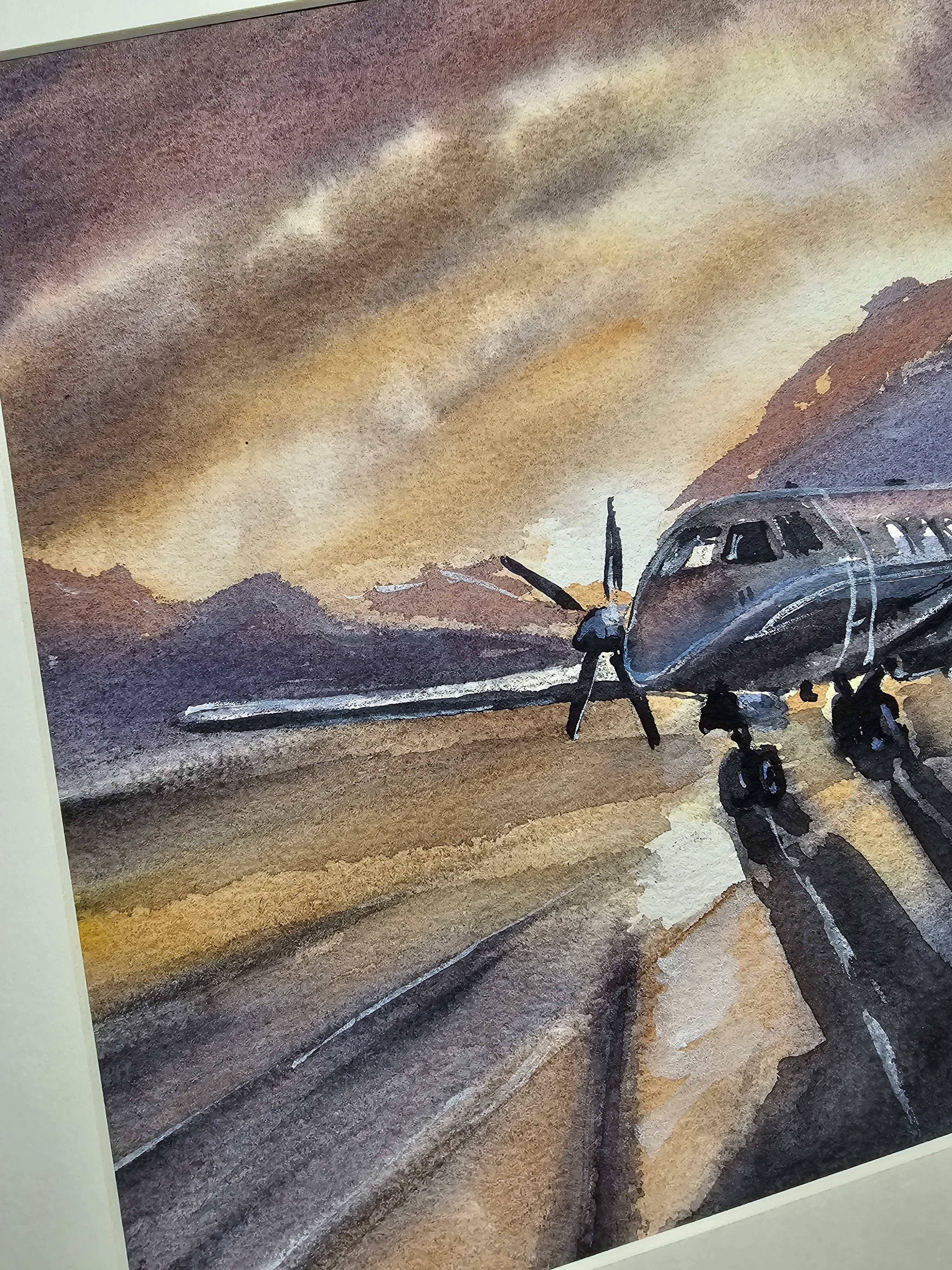 Нам представлена акварельная картина, на которой изображён небольшой самолёт с двумя винтовыми двигателями, стоящий на взлётно-посадочной полосе. На заднем плане видны горы, а небо окрашено в тёплые оттенки заката, создавая атмосферу спокойствия и величия природы. Свет и тени на картине переданы с высокой детализацией, что придаёт изображению глубину и реалистичность.