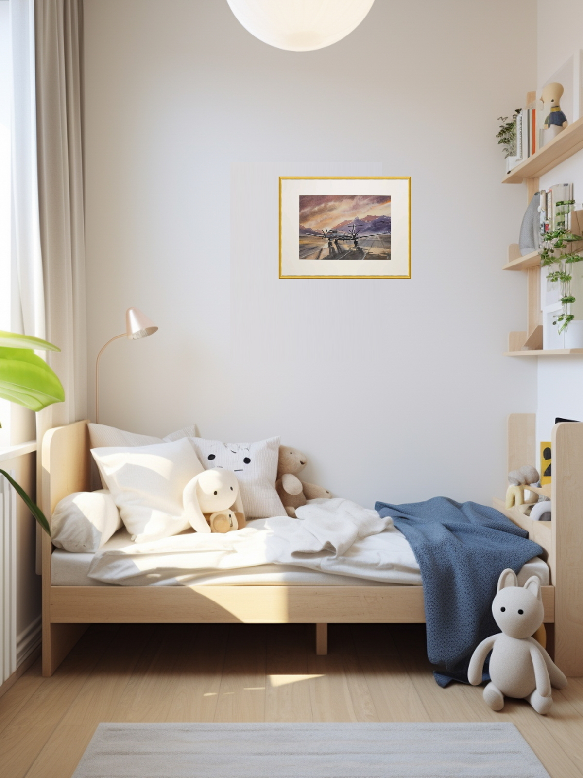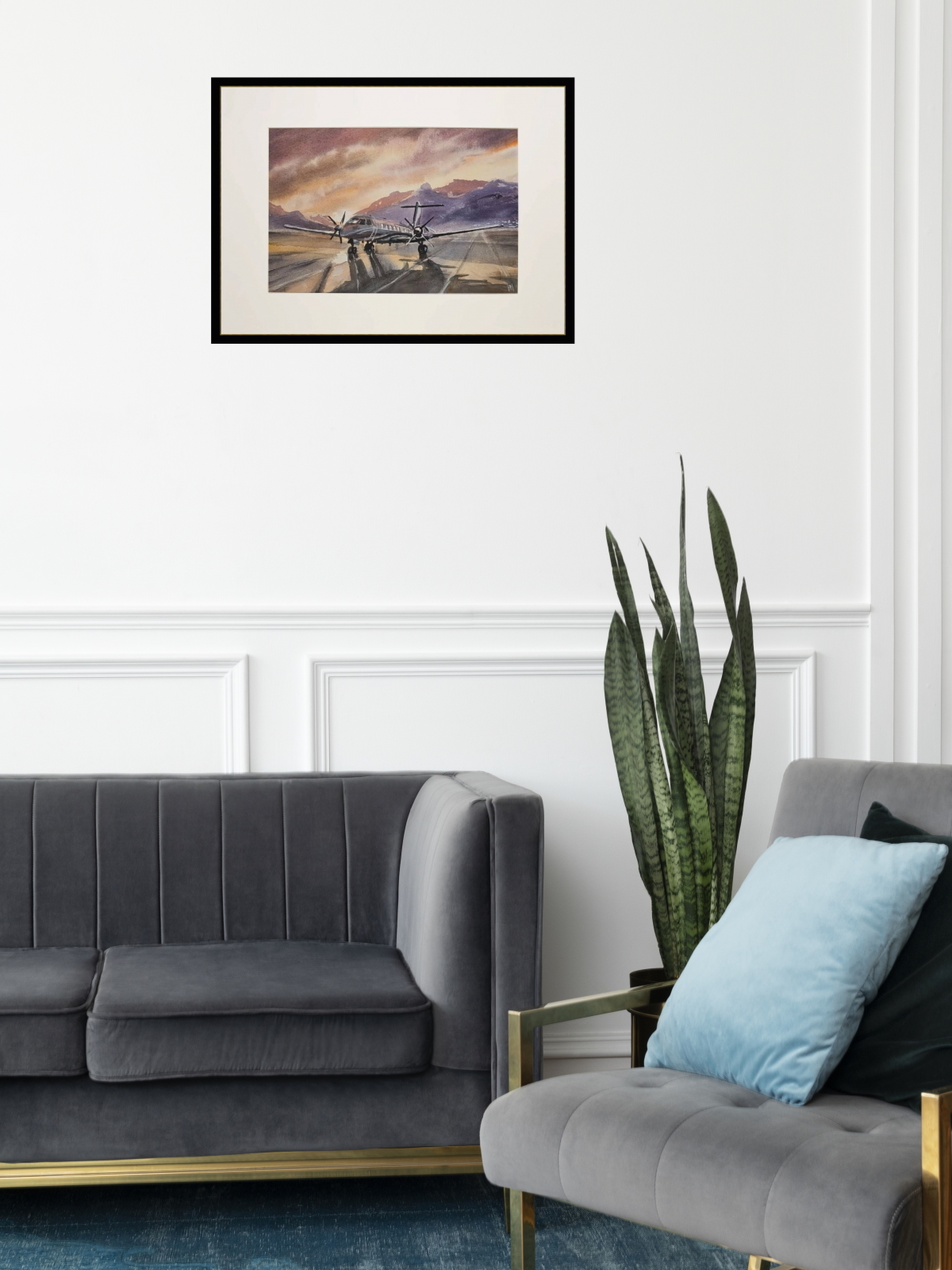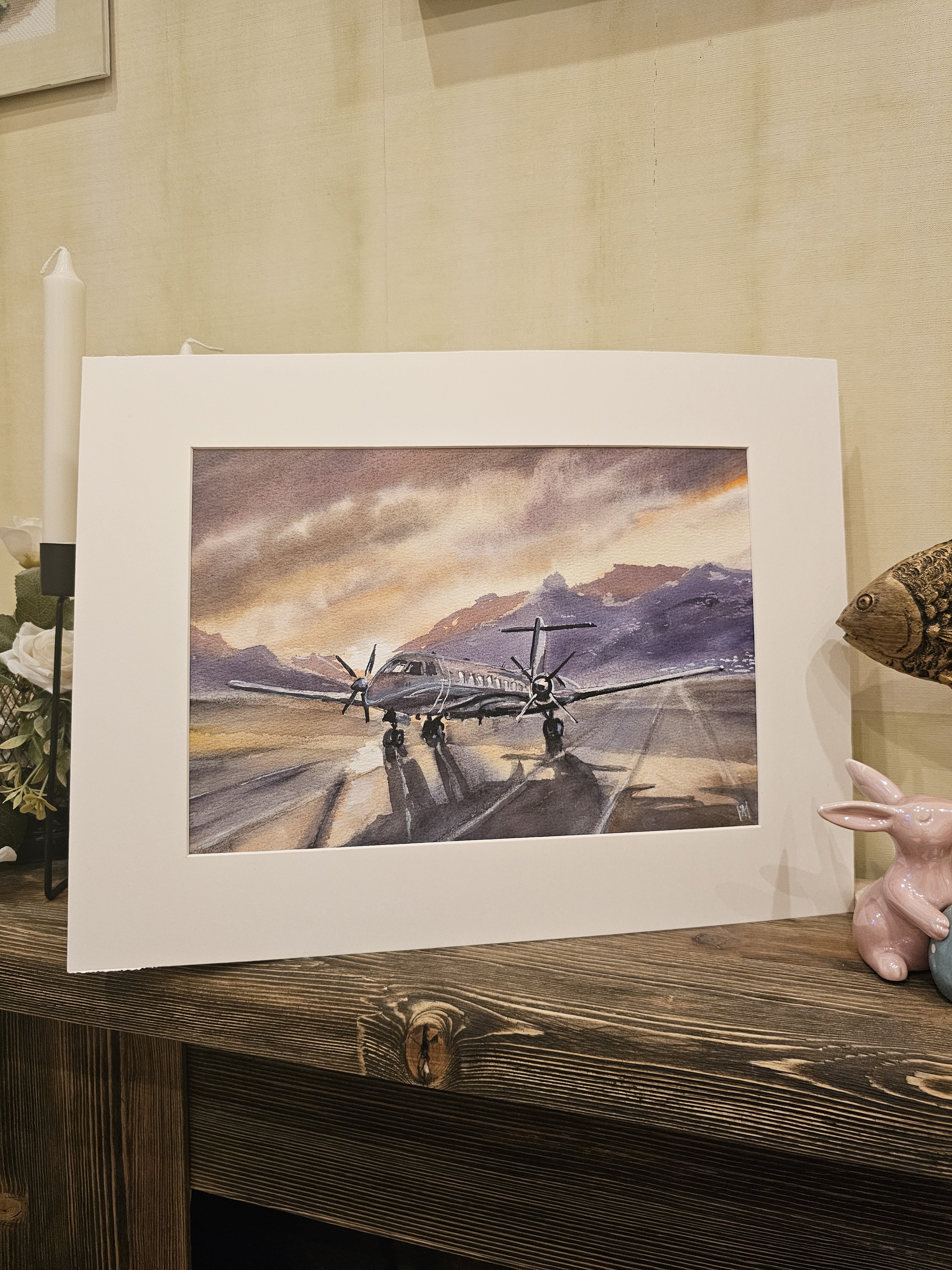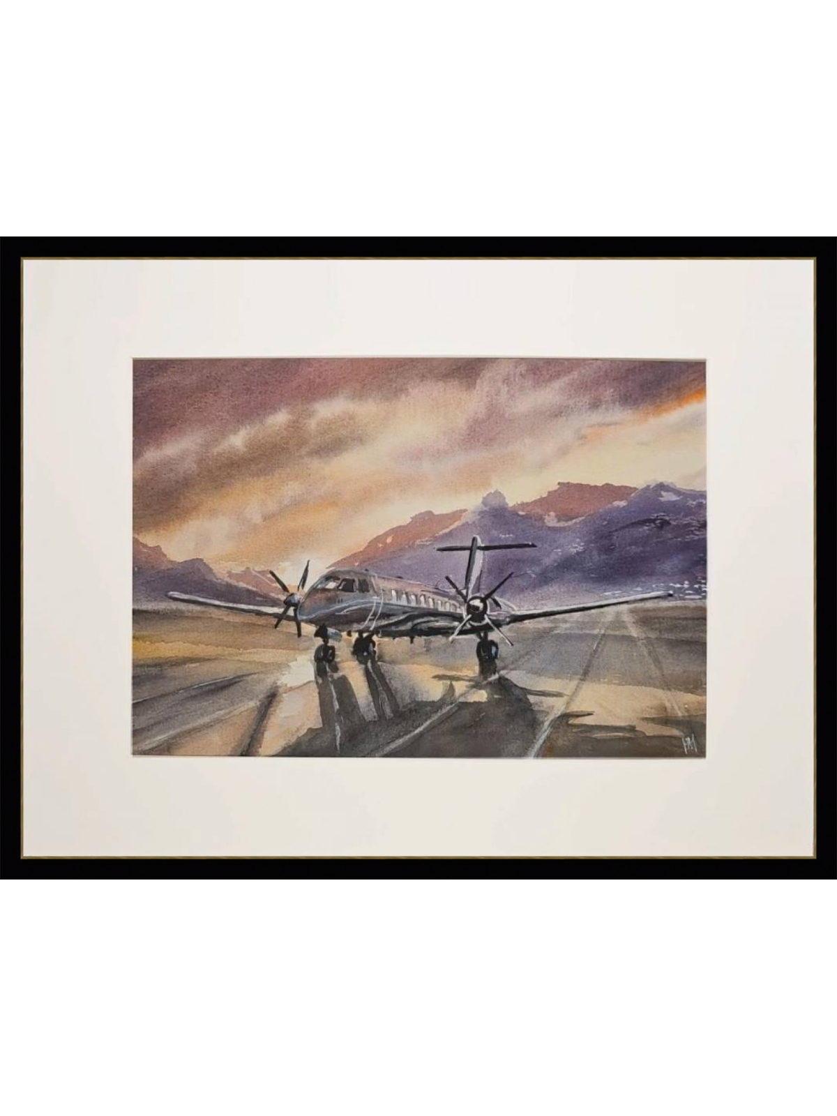 Нам представлена акварельная картина, на которой изображён небольшой самолёт с двумя винтовыми двигателями, стоящий на взлётно-посадочной полосе. На заднем плане видны горы, а небо окрашено в тёплые оттенки заката, создавая атмосферу спокойствия и величия природы. Свет и тени на картине переданы с высокой детализацией, что придаёт изображению глубину и реалистичность.