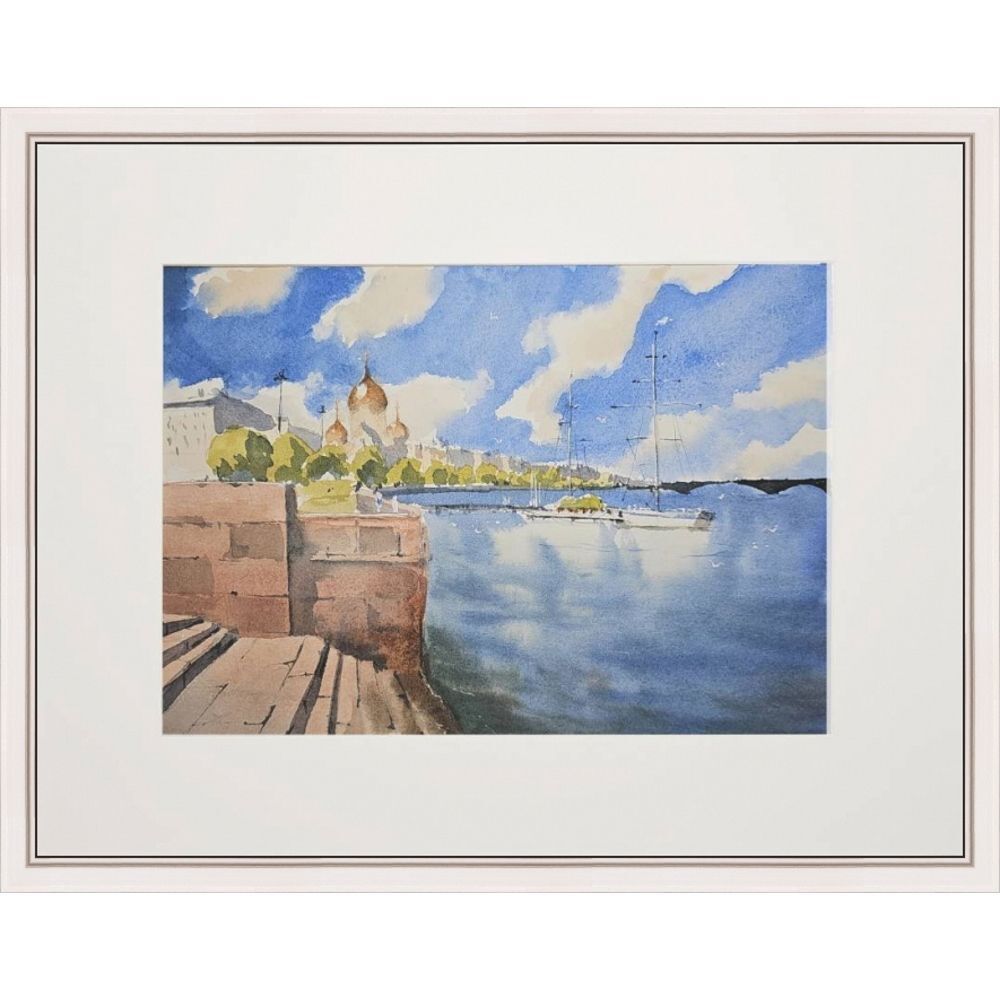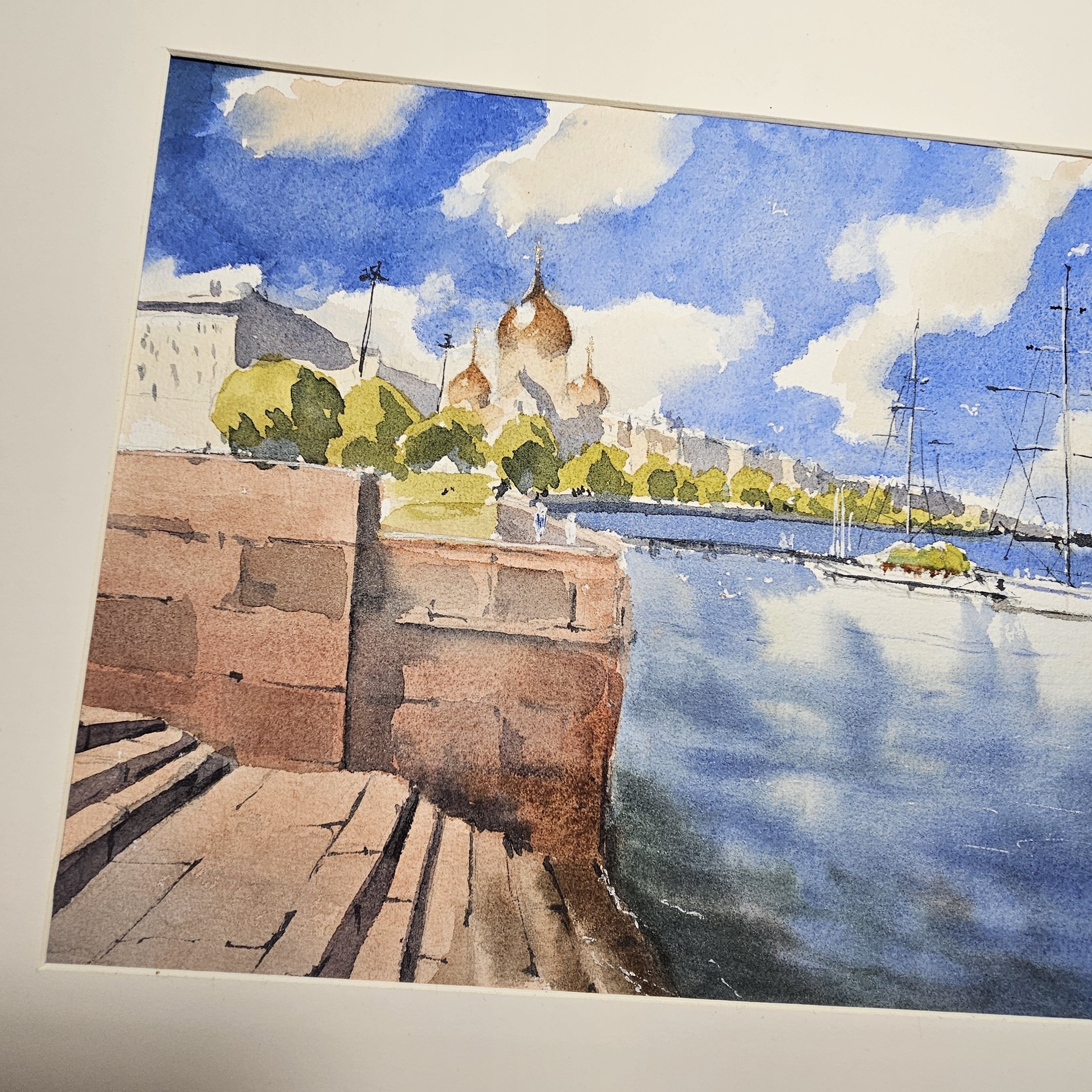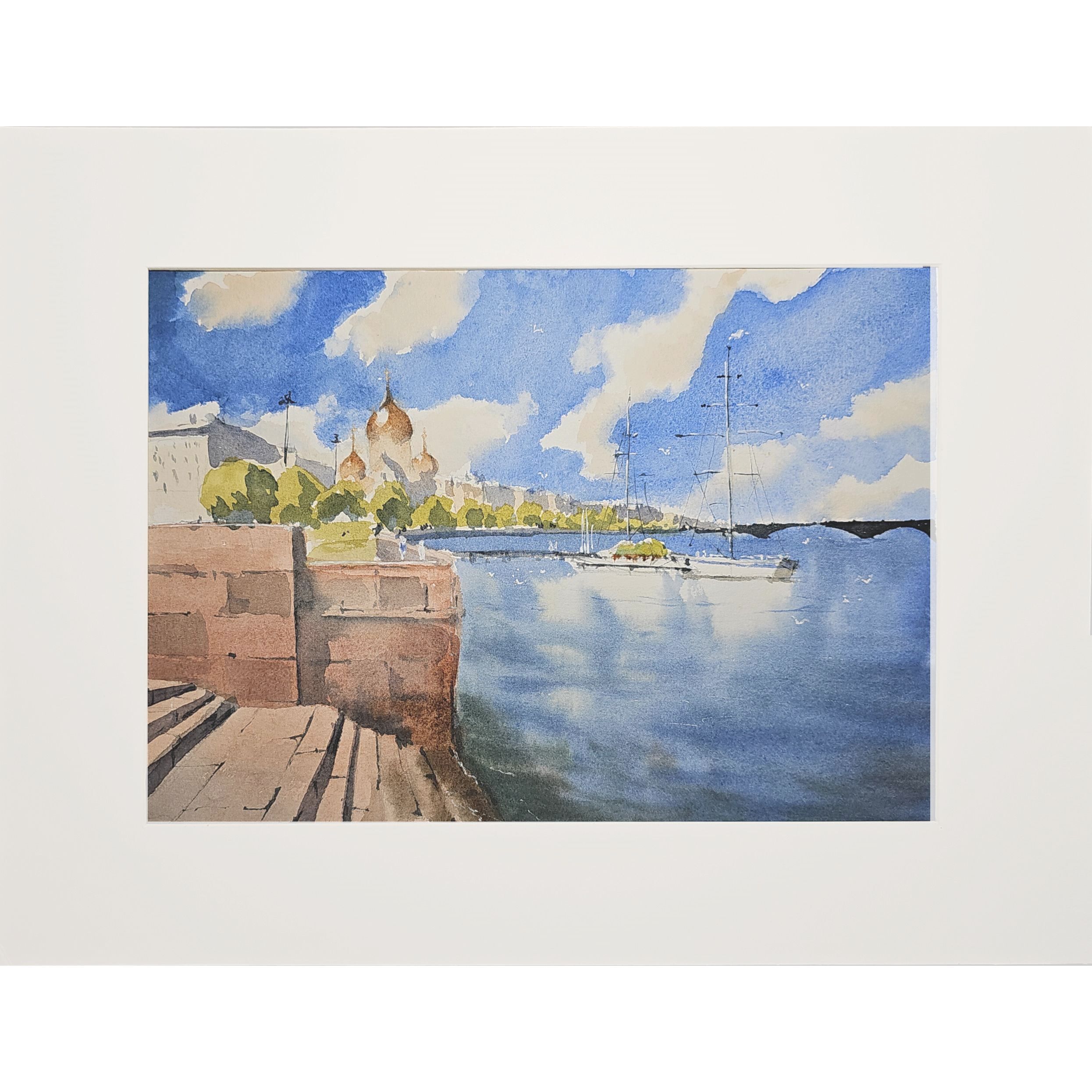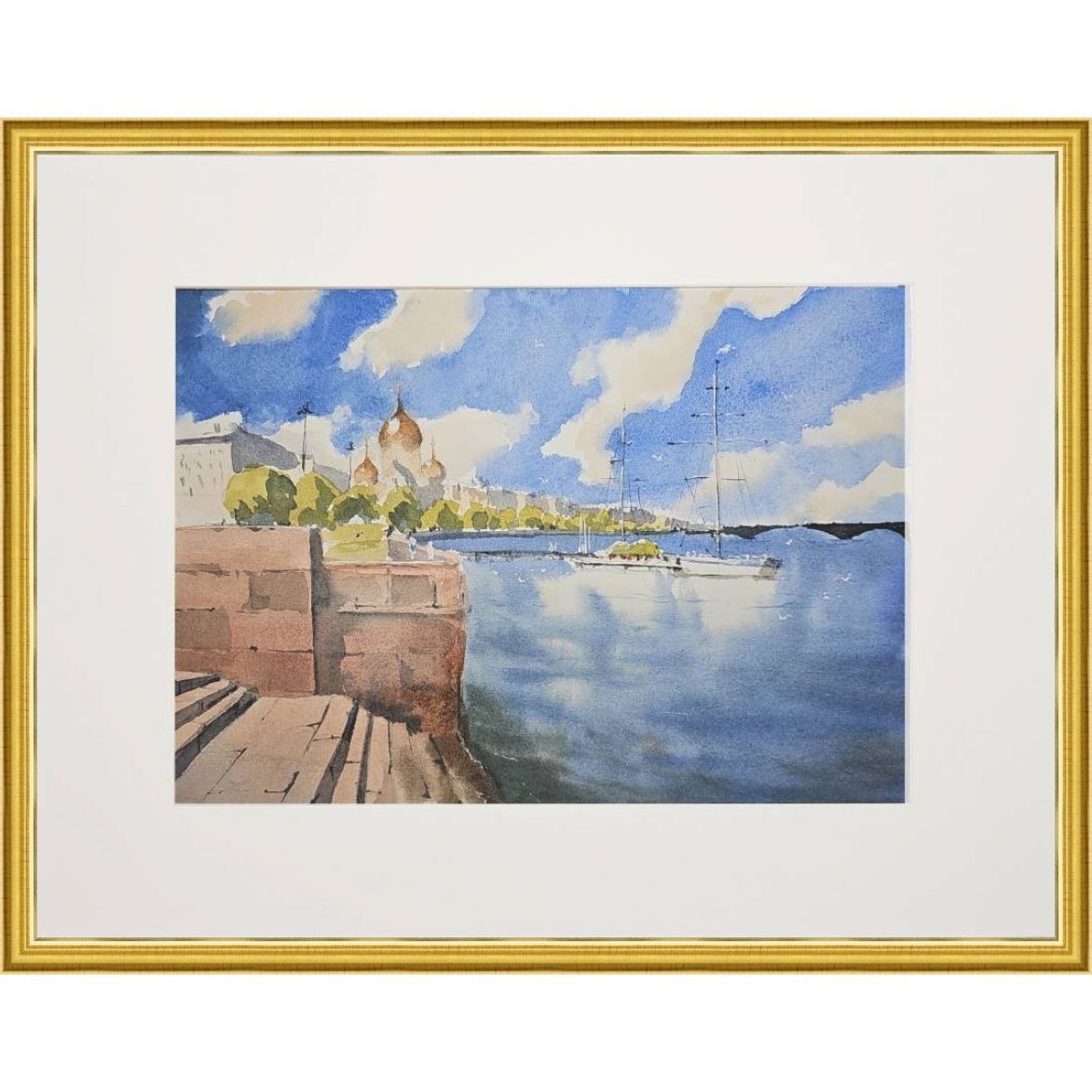 Эта акварельная картина, изображает городской пейзаж у воды. В левой части картины видна кирпичная набережная со ступеньками. На заднем плане, немного левее центра, находится здание с золотыми куполами, вероятно это собор. На фоне синего неба с облаками растут деревья, создавая зелёный контраст. В воде, ближе к правому краю картины, пришвартованы несколько парусных яхт. Вода в реке отражает небо и часть лодок. Композиция передаёт спокойствие и гармонию.