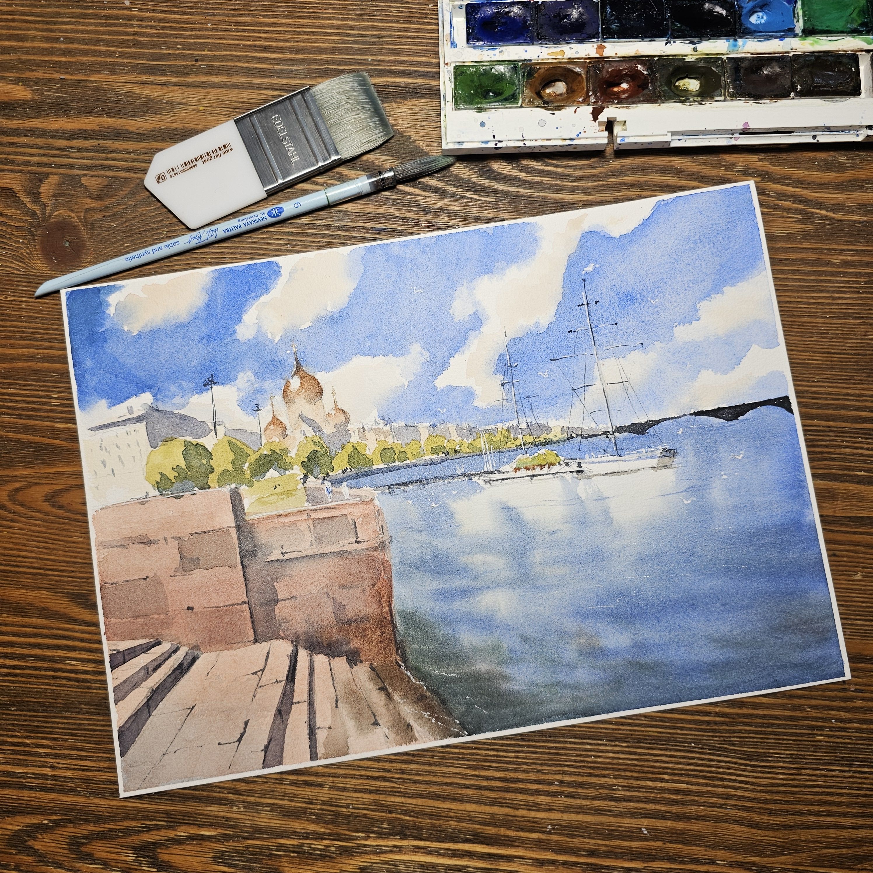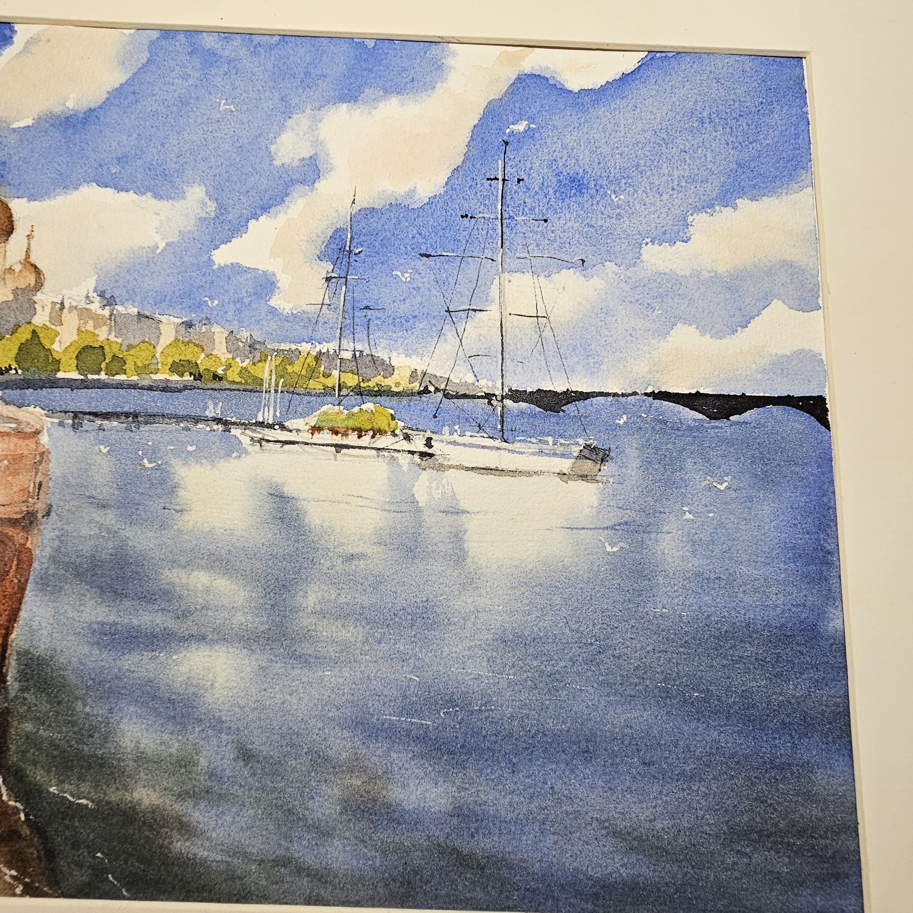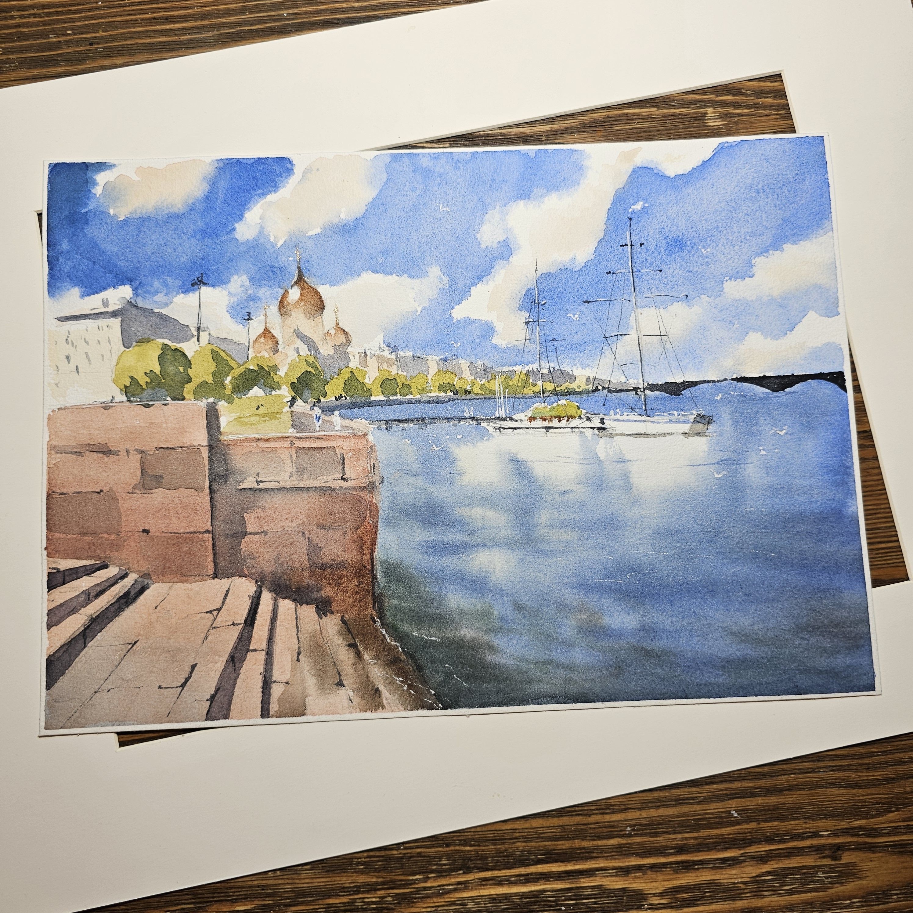 Эта акварельная картина, изображает городской пейзаж у воды. В левой части картины видна кирпичная набережная со ступеньками. На заднем плане, немного левее центра, находится здание с золотыми куполами, вероятно это собор. На фоне синего неба с облаками растут деревья, создавая зелёный контраст. В воде, ближе к правому краю картины, пришвартованы несколько парусных яхт. Вода в реке отражает небо и часть лодок. Композиция передаёт спокойствие и гармонию.