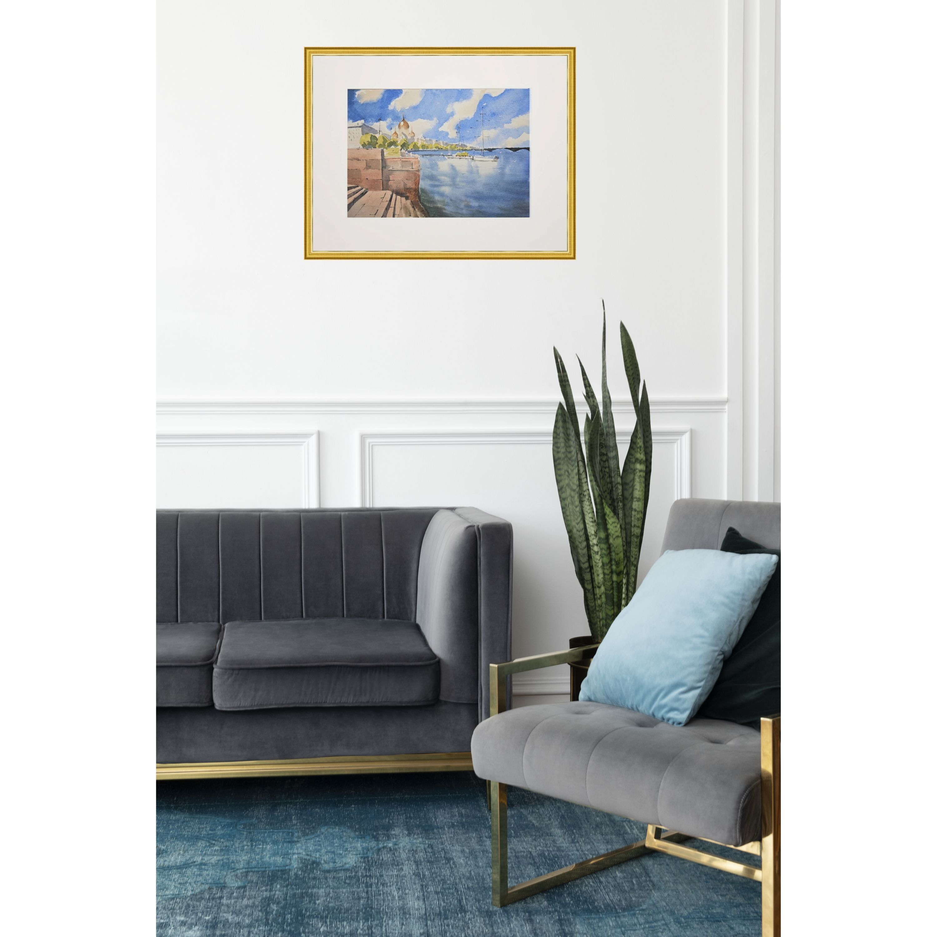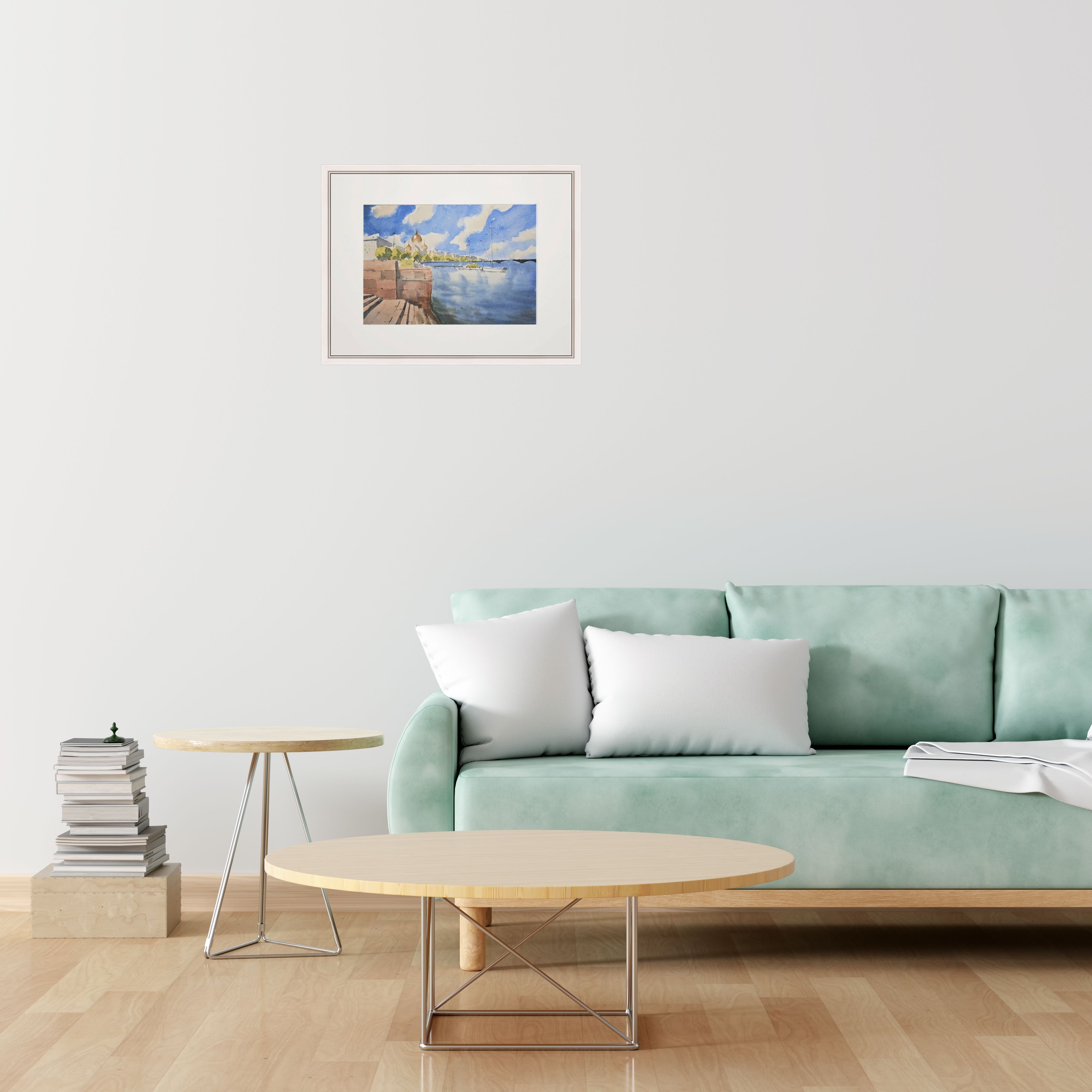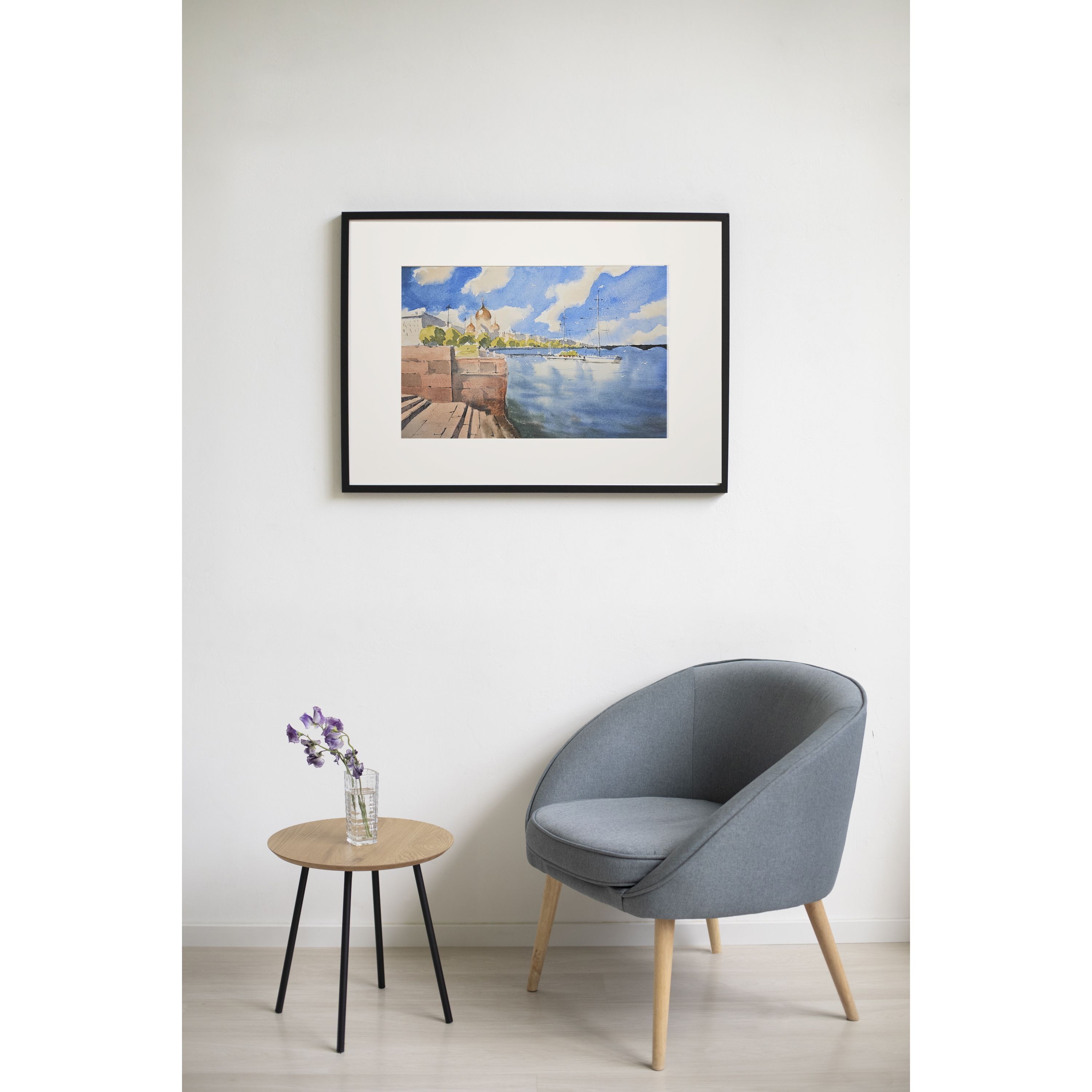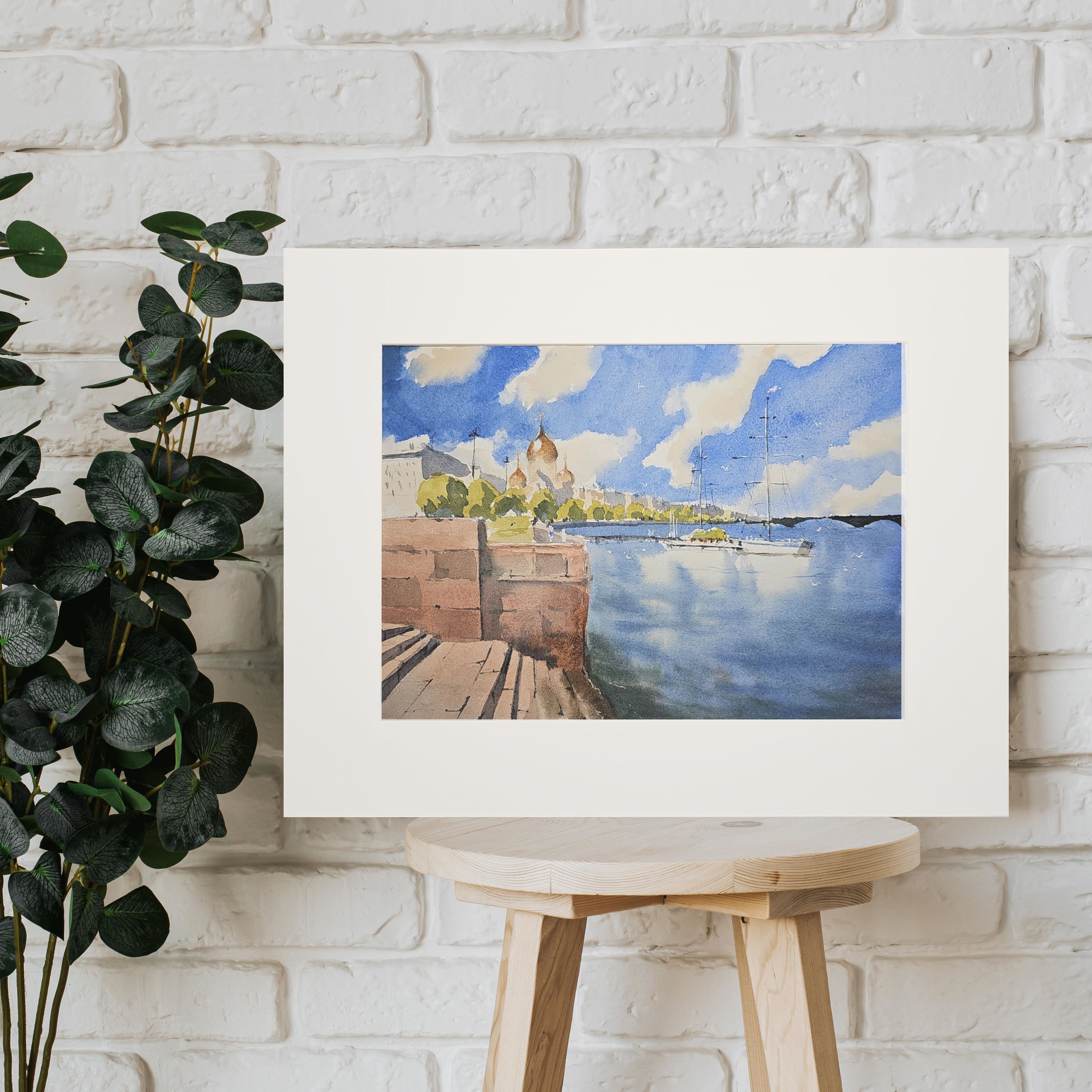 Эта акварельная картина, изображает городской пейзаж у воды. В левой части картины видна кирпичная набережная со ступеньками. На заднем плане, немного левее центра, находится здание с золотыми куполами, вероятно это собор. На фоне синего неба с облаками растут деревья, создавая зелёный контраст. В воде, ближе к правому краю картины, пришвартованы несколько парусных яхт. Вода в реке отражает небо и часть лодок. Композиция передаёт спокойствие и гармонию.