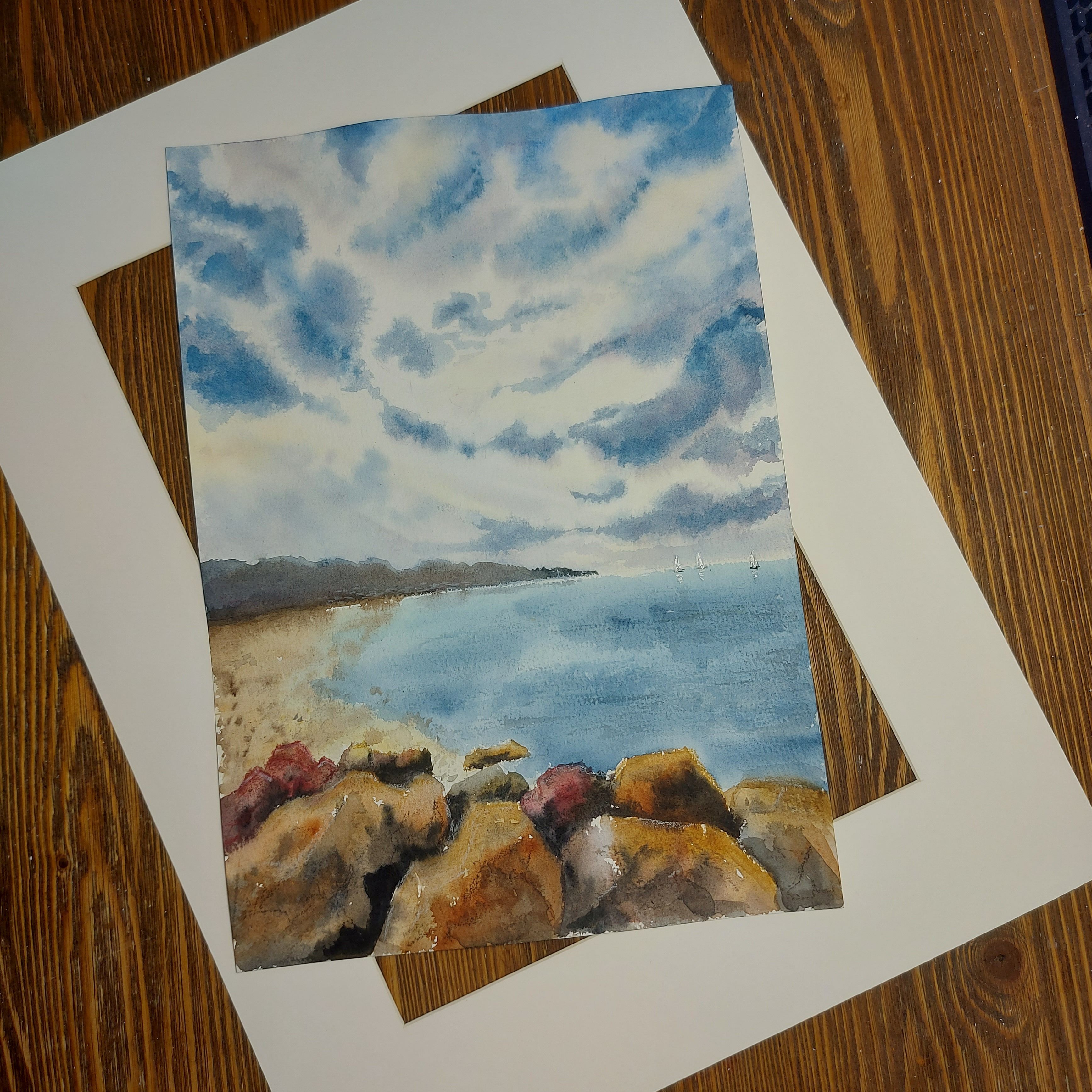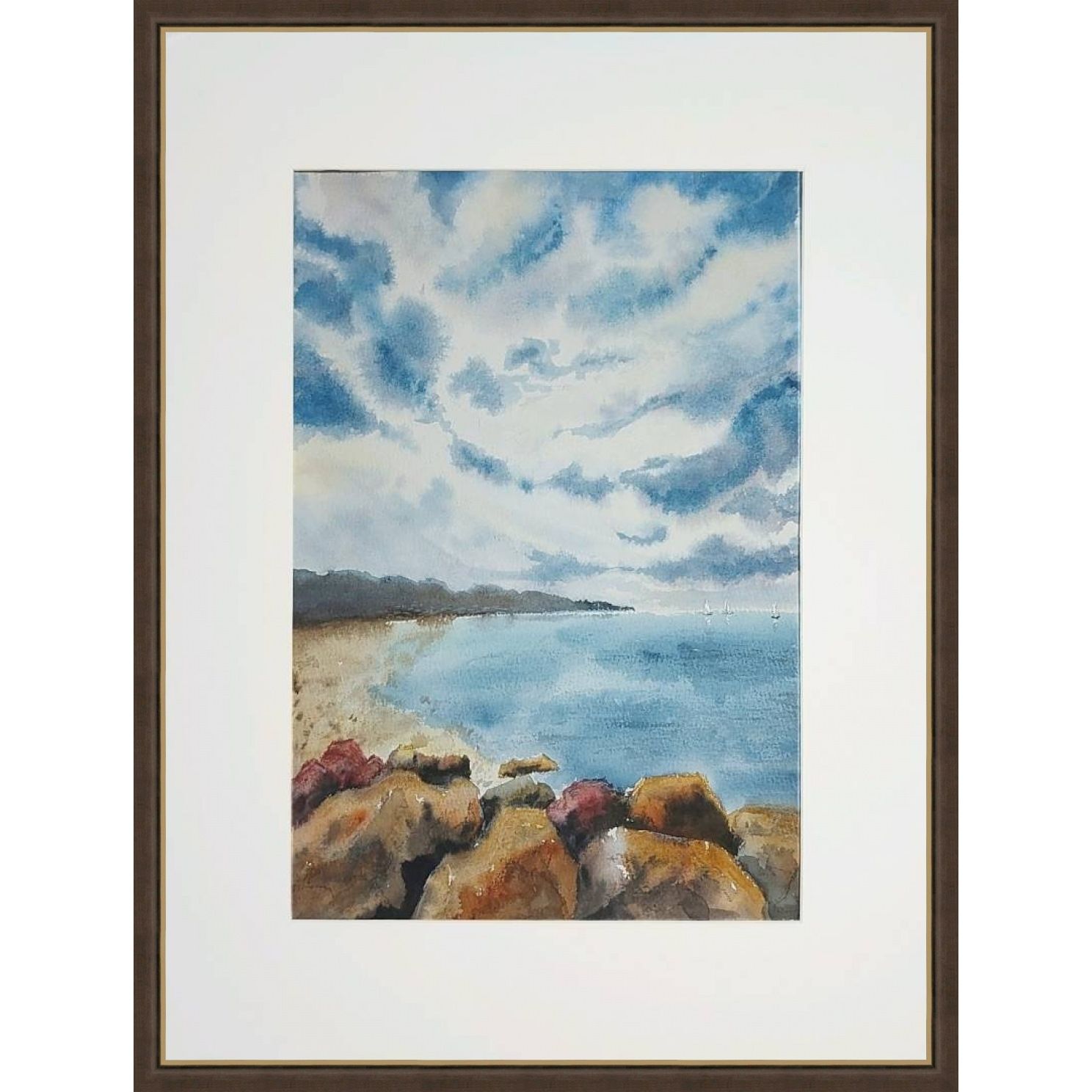 В композиции преобладают мягкие, пастельные оттенки, что характерно для акварельной техники. Общее впечатление от изображения – это спокойствие и умиротворение, вызванное тихим морским пейзажем.