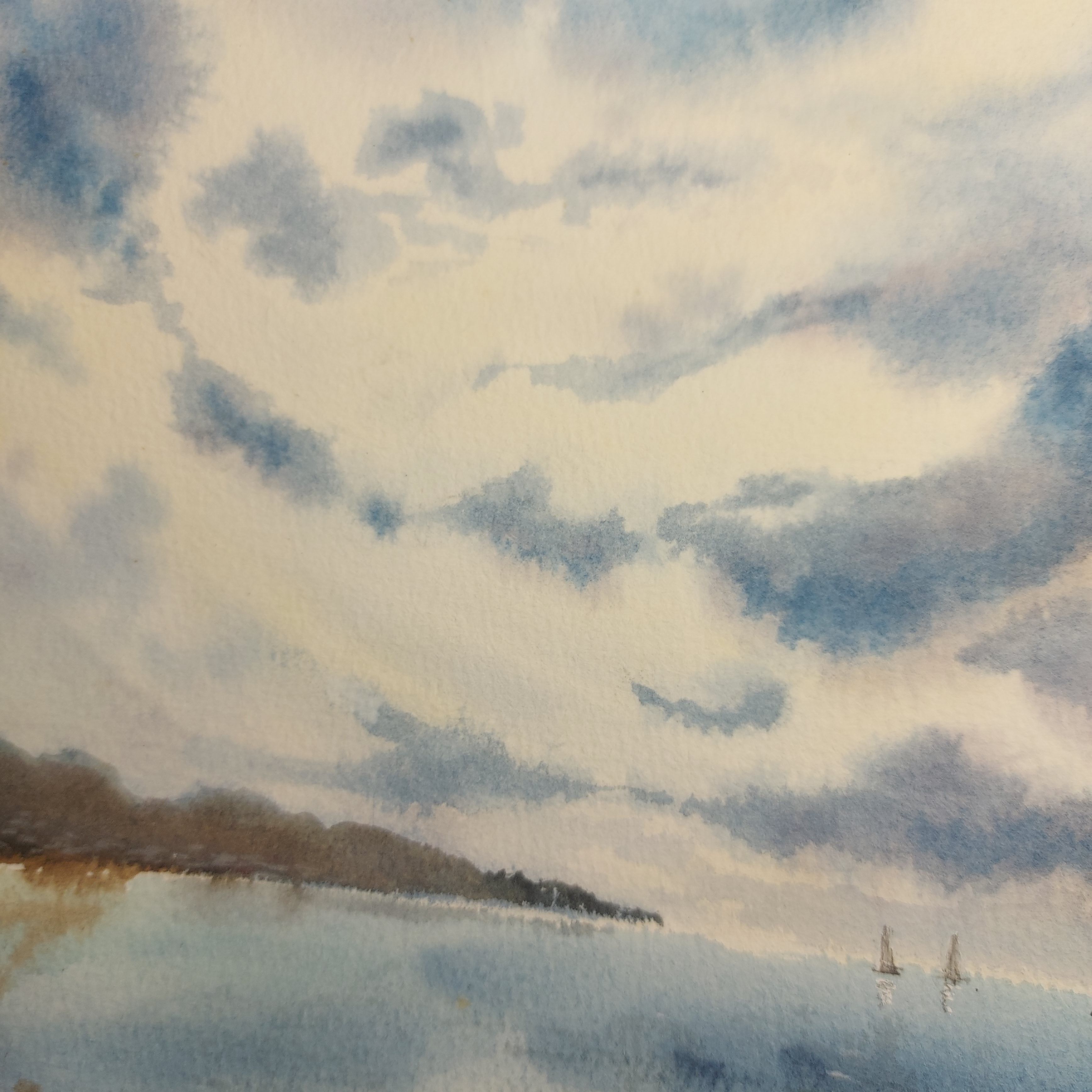 На картине вы видите акварельный пейзаж. Небо занято большой частью композиции - оно наполнено различными оттенками синего и серого, образуя реалистичные формы облаков, которые создают ощущение глубины и объема. Под небом на горизонте виднеется участок суши с контурами холмов или невысоких гор.