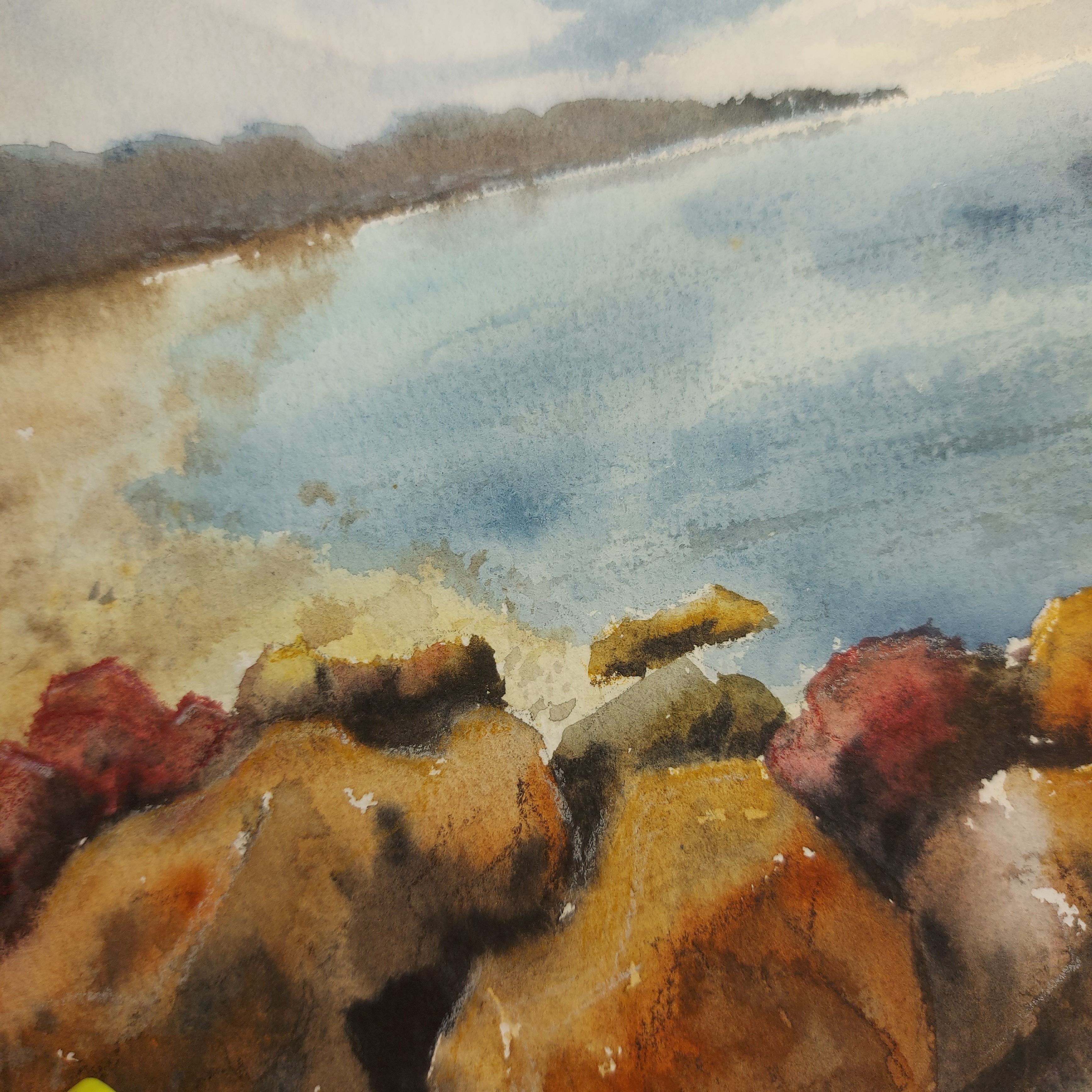 В нижней части картины изображен берег, окаймленный камнями различного размера. Камни выполнены в коричневых и серых тонах с некоторыми пятнами красного и оранжевого, что придает им реалистичный вид и текстуру. Передняя часть изображения показывает песчаный берег, который тянется к правой стороне композиции.
