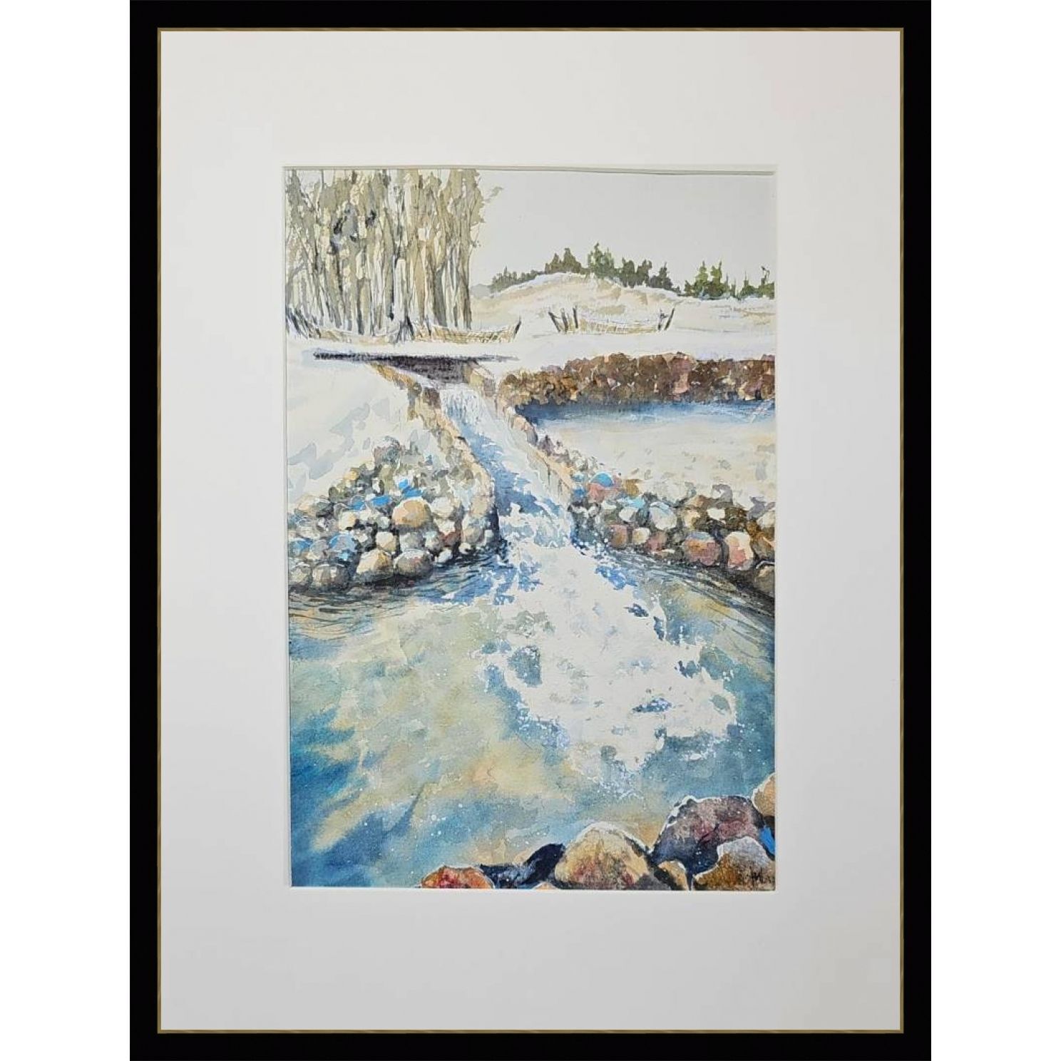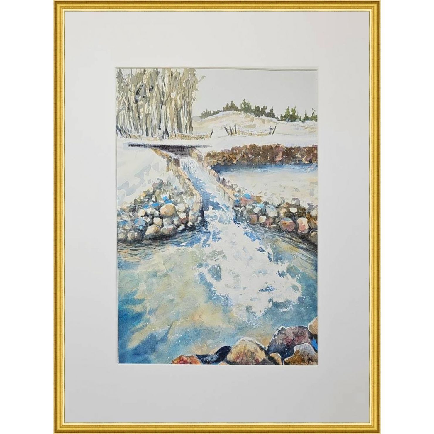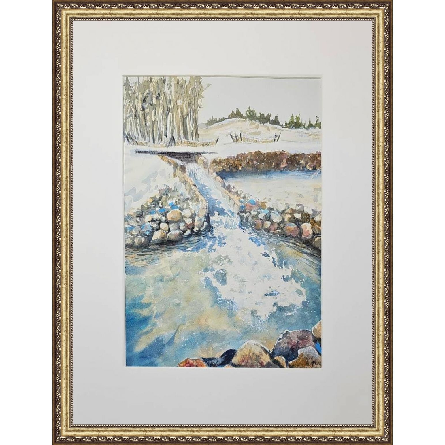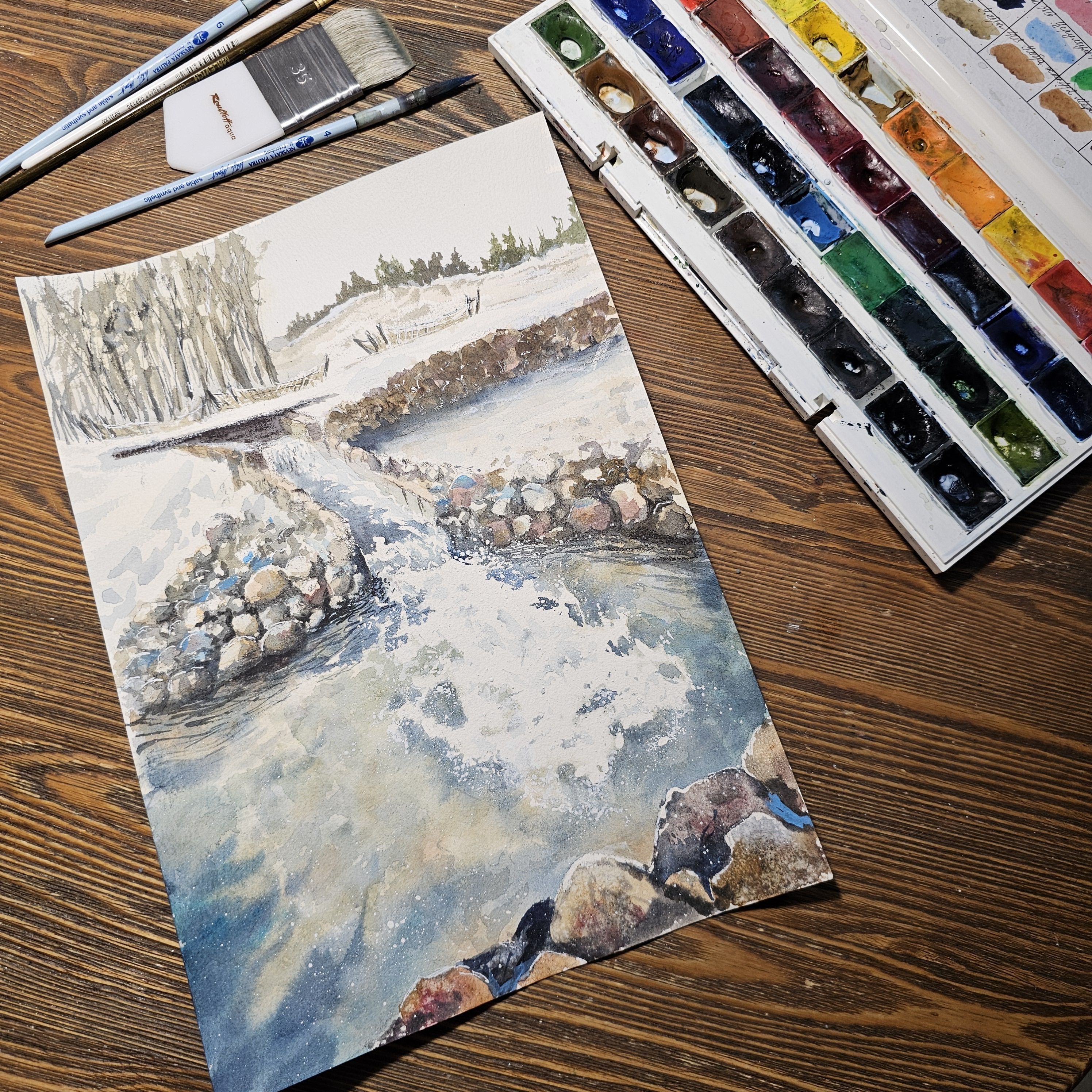 Перед нами акварельная картина, изображающая зимний пейзаж. На переднем плане небольшой водопад и запруда окруженная камнями. Вода течет плавно, отражая свет и создавая красивый узор с небольшими брызгами. В верхней части картины ряд деревьев, лишенных листвы, а справа виднеется небольшой холм, покрытый снегом. Картина выполнена в светлых, холодных тонах, что подчеркивает зимнюю атмосферу.